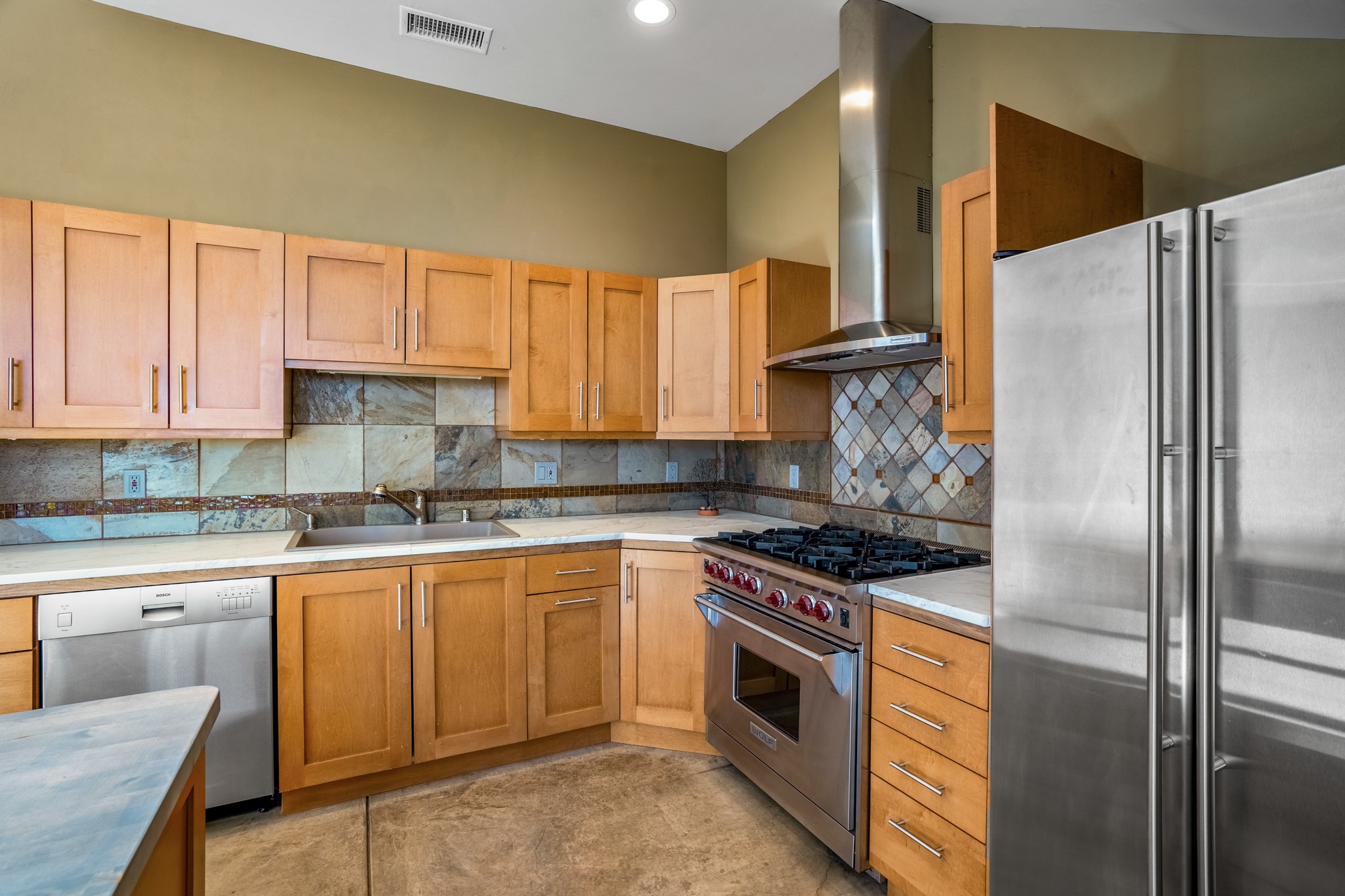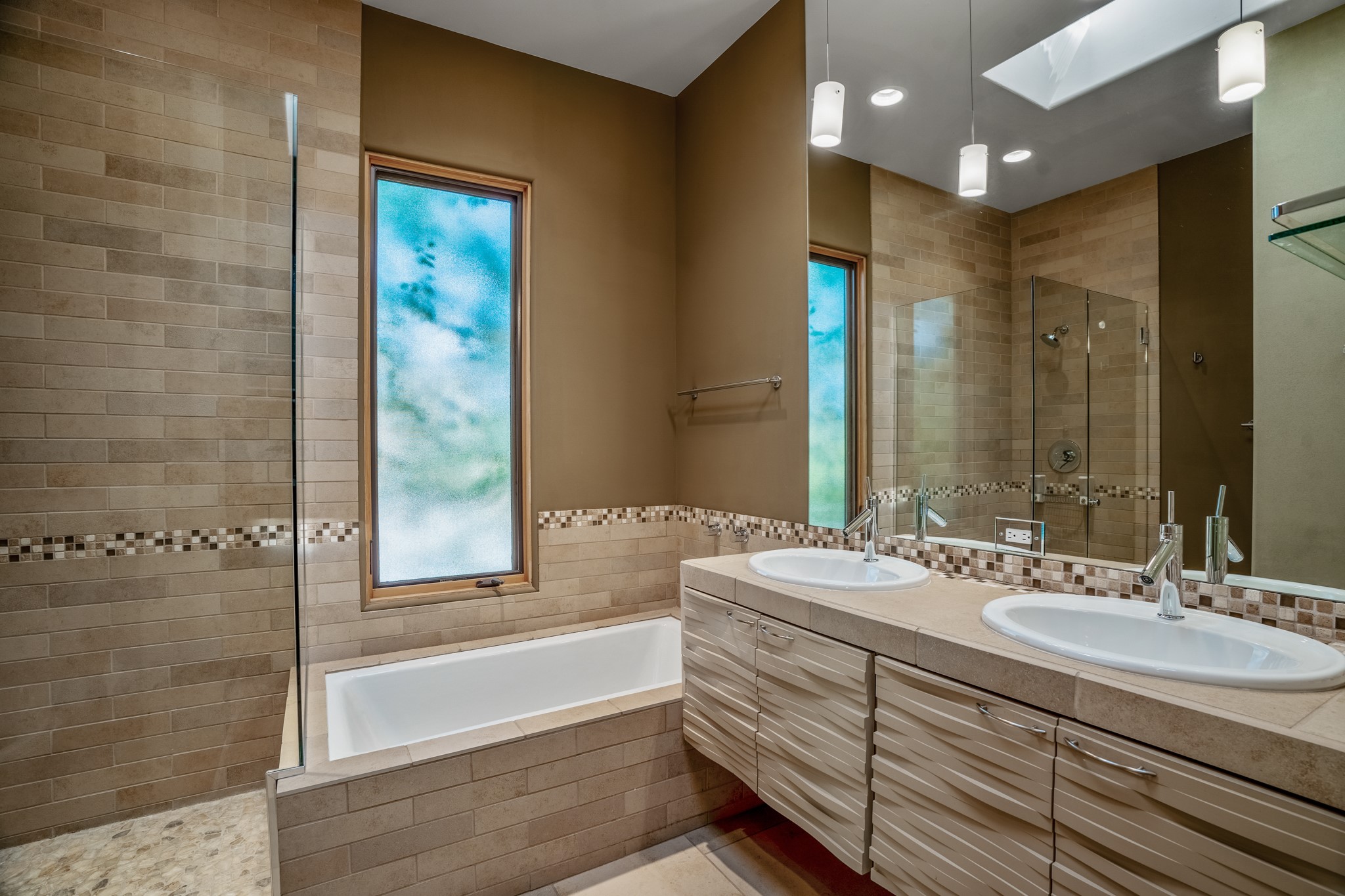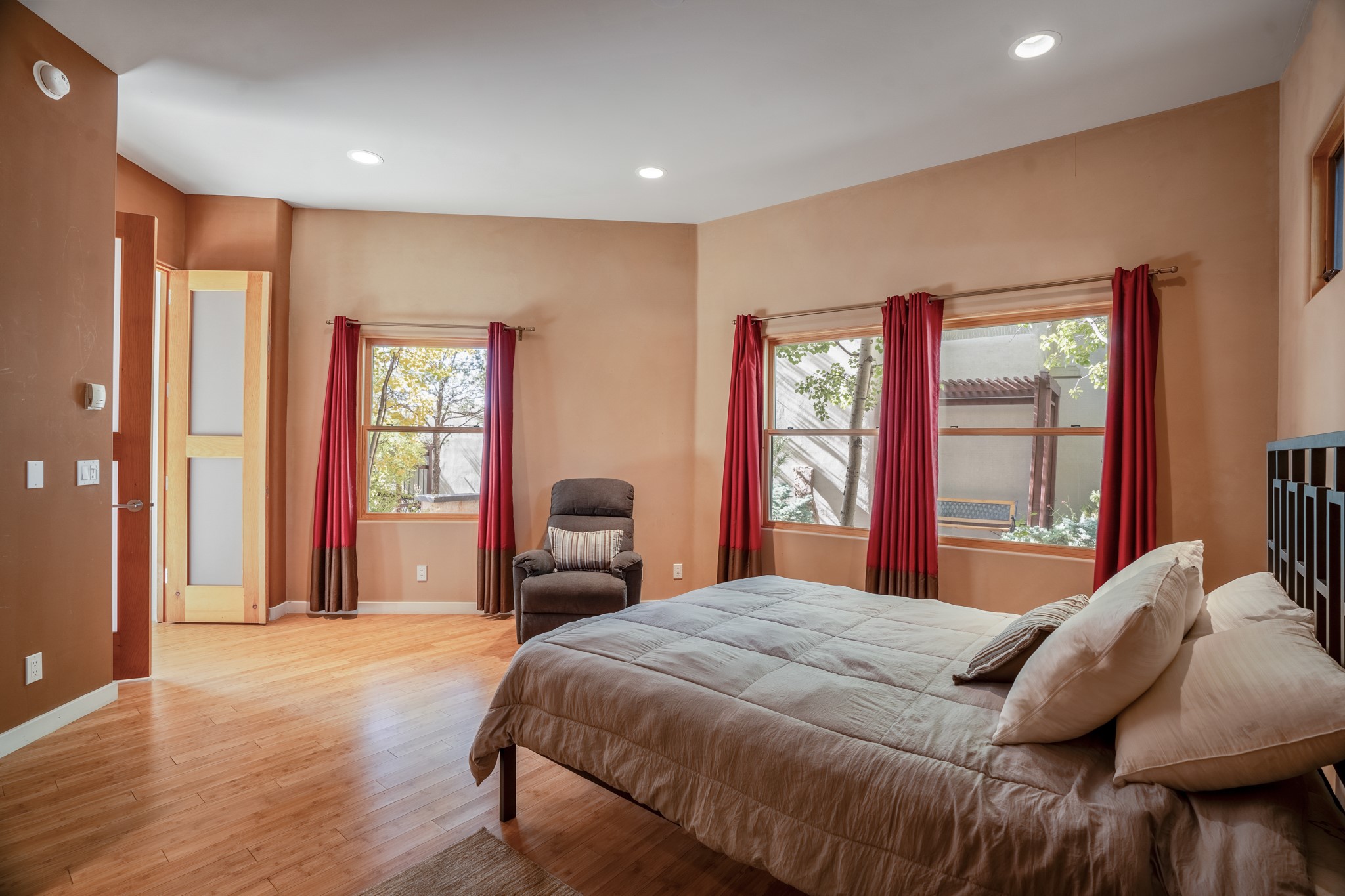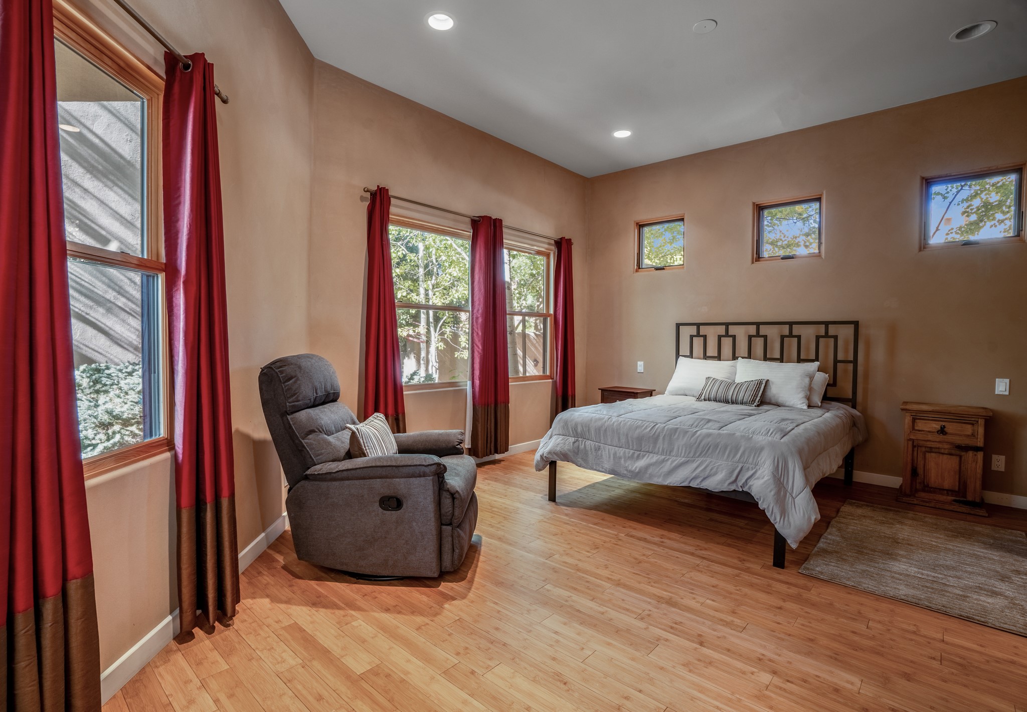 Located within the serene and picturesque community of Aldea De Santa Fe. This captivating residence offers unobstructed sunset views. The open-concept living space boasts soaring 20-foot ceilings, captivating the very best of a contemporary design. Earthy yet modern finishes throughout. Including, stone, bamboo and concrete floors and a gas burning fireplace. There are custom wood cabinets in the bathrooms that resemble a basket weave and floor to ceiling tile in the showers. The abundance of windows that allows for the New Mexico sun to pour in, creating a warm and inviting atmosphere. The living area is adjacent dining area and perfectly sized kitchen with Wolf range provide the perfect setting for culinary adventures. There is a Primary bedroom suite on the main floor with bamboo floors and a tasteful en-suite bathroom. The upstairs bedroom is generously sized with an en-suite bathroom and a loft area for relaxing and taking in Santa Fe's amazing desert views. In addition to the stylish interior, the home also offers outdoor spaces that are equally inviting. Enter from the street onto a private enclosed courtyard and you can enjoy entertaining on the deck off of the living room with those in your face views. The 2-car garage offers convenience and storage space, while the radiant heating and central air conditioning ensure year-round comfort. Aldea De Santa Fe offers a community center, parks, 13 miles of walking trails, and a strong sense of community. Enjoy the best of both worlds, with easy access to Santa Fe's vibrant cultural scene, shopping, dining, and outdoor recreation. Experience the harmony of modern living in a Southwestern setting. Don't miss the opportunity to make 87 Avenida Frijoles your new Santa Fe retreat.