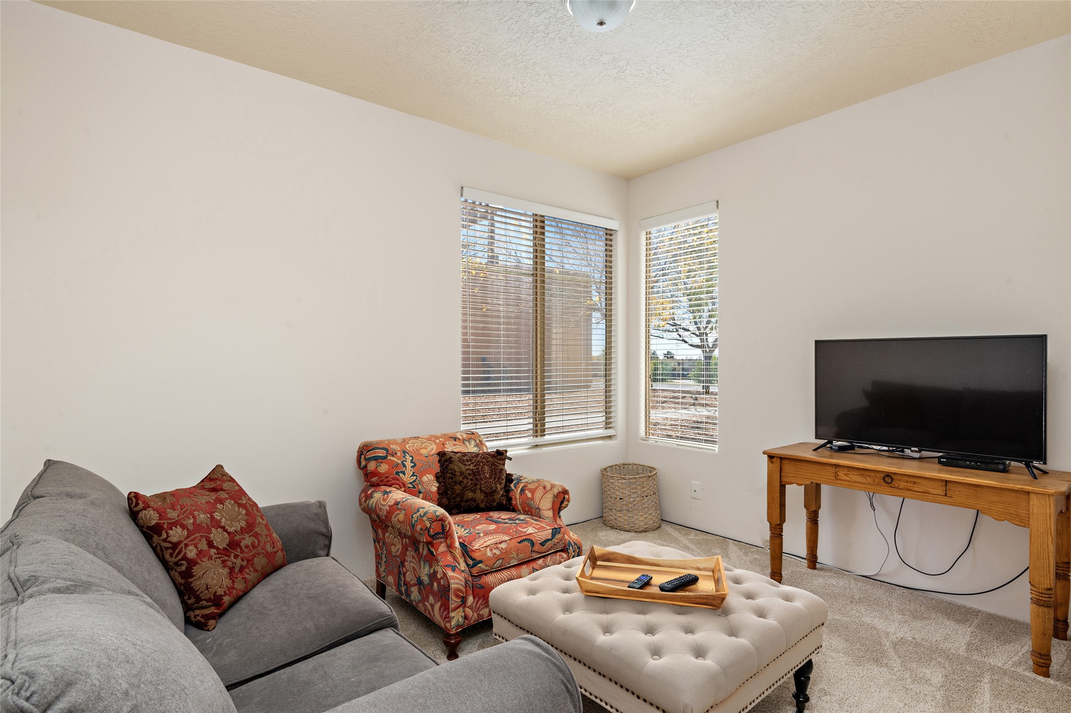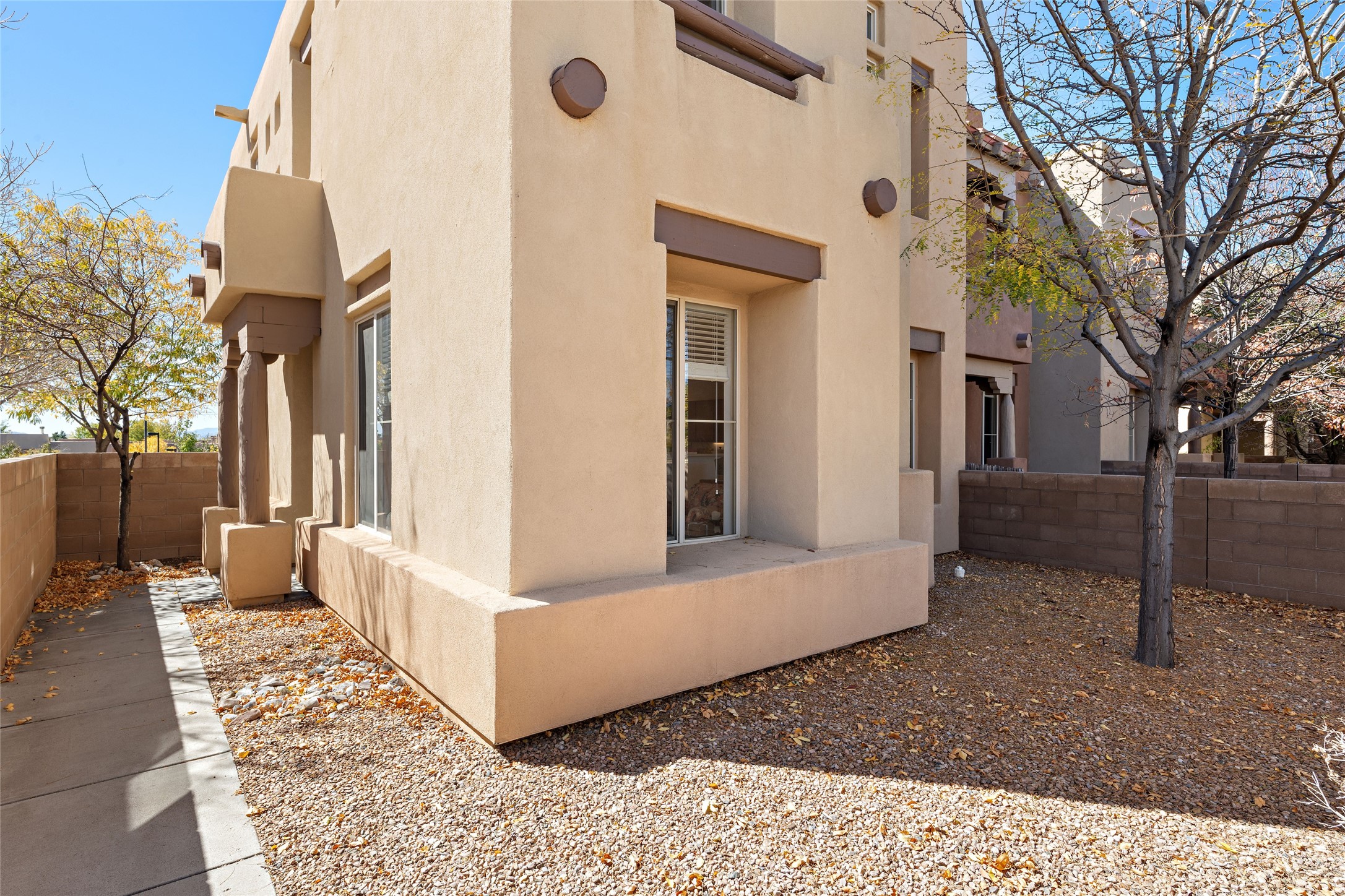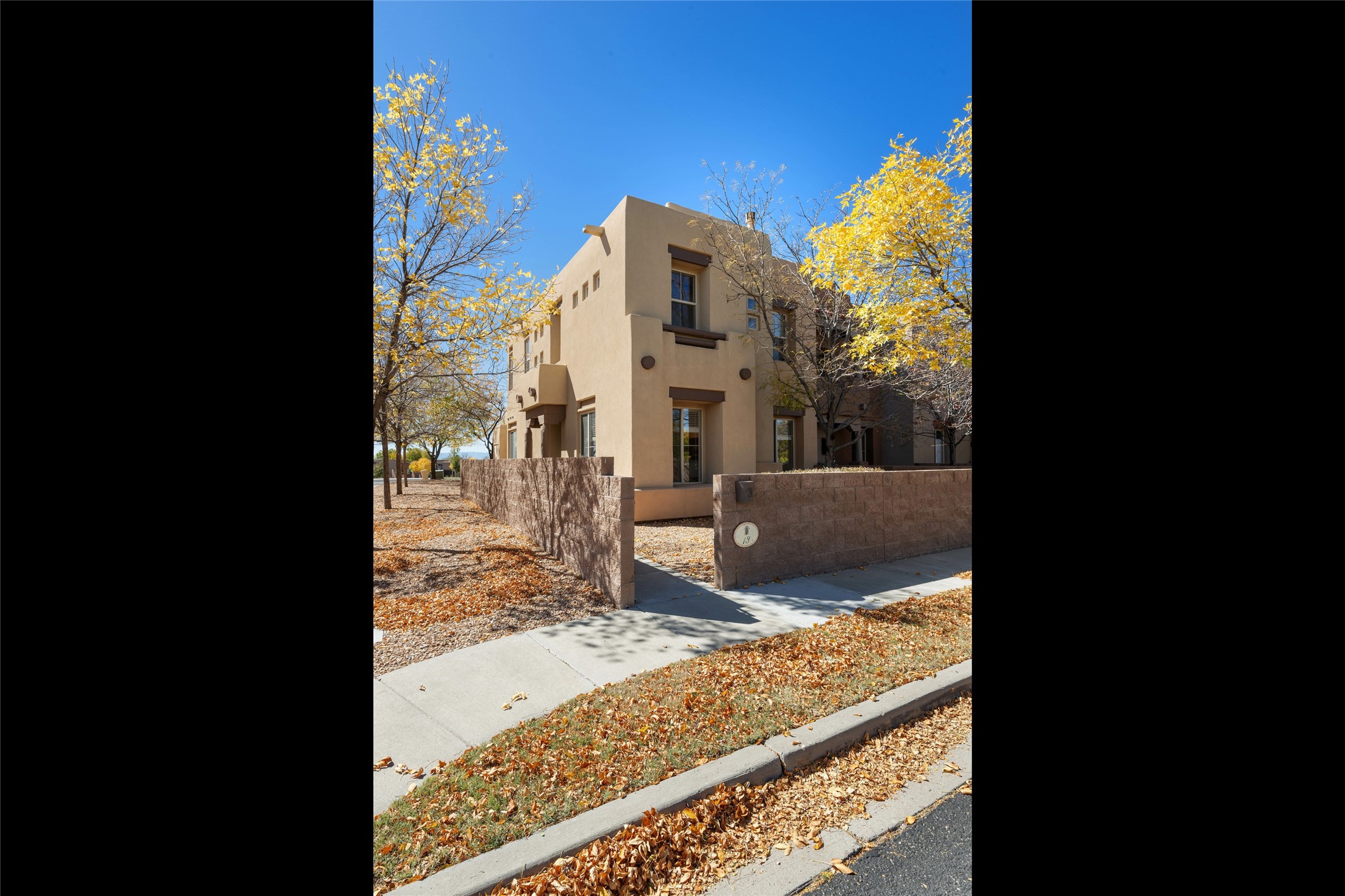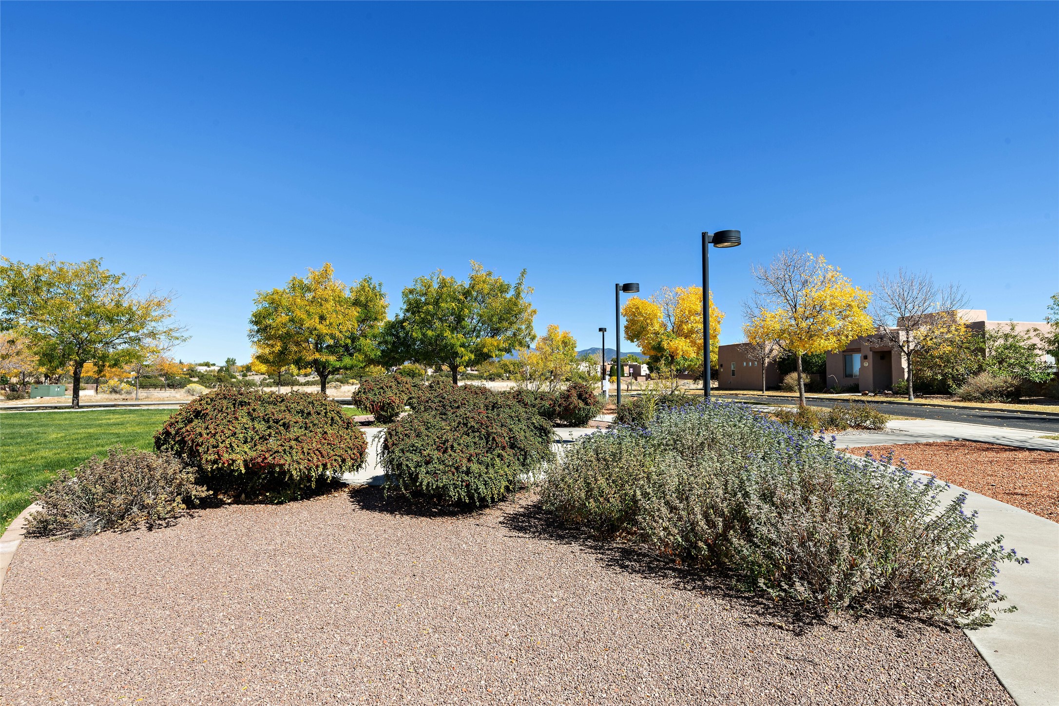 This desirable end unit located on a lovely park in Rancho Viejo, has two bedrooms, 2 and 1/2 baths and a flexroom that can serve as a den or office space. It was built with many upgrades and has tile floors in the downstairs, nice cabinets, T&G ceilings with vigas, a gas kiva fireplace and much more. The primary suite has a private deck with wonderful views. The current owners put in new washer/dryer and kitchen appliances in 2019 (with exception of dishwasher). The courtyard exterior space is low maintenance and has great possibilities and views of the park.