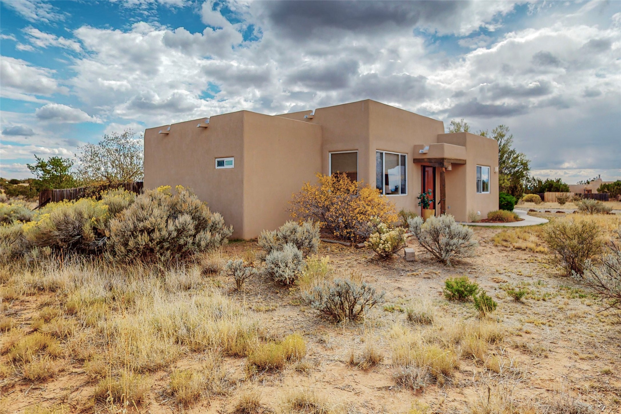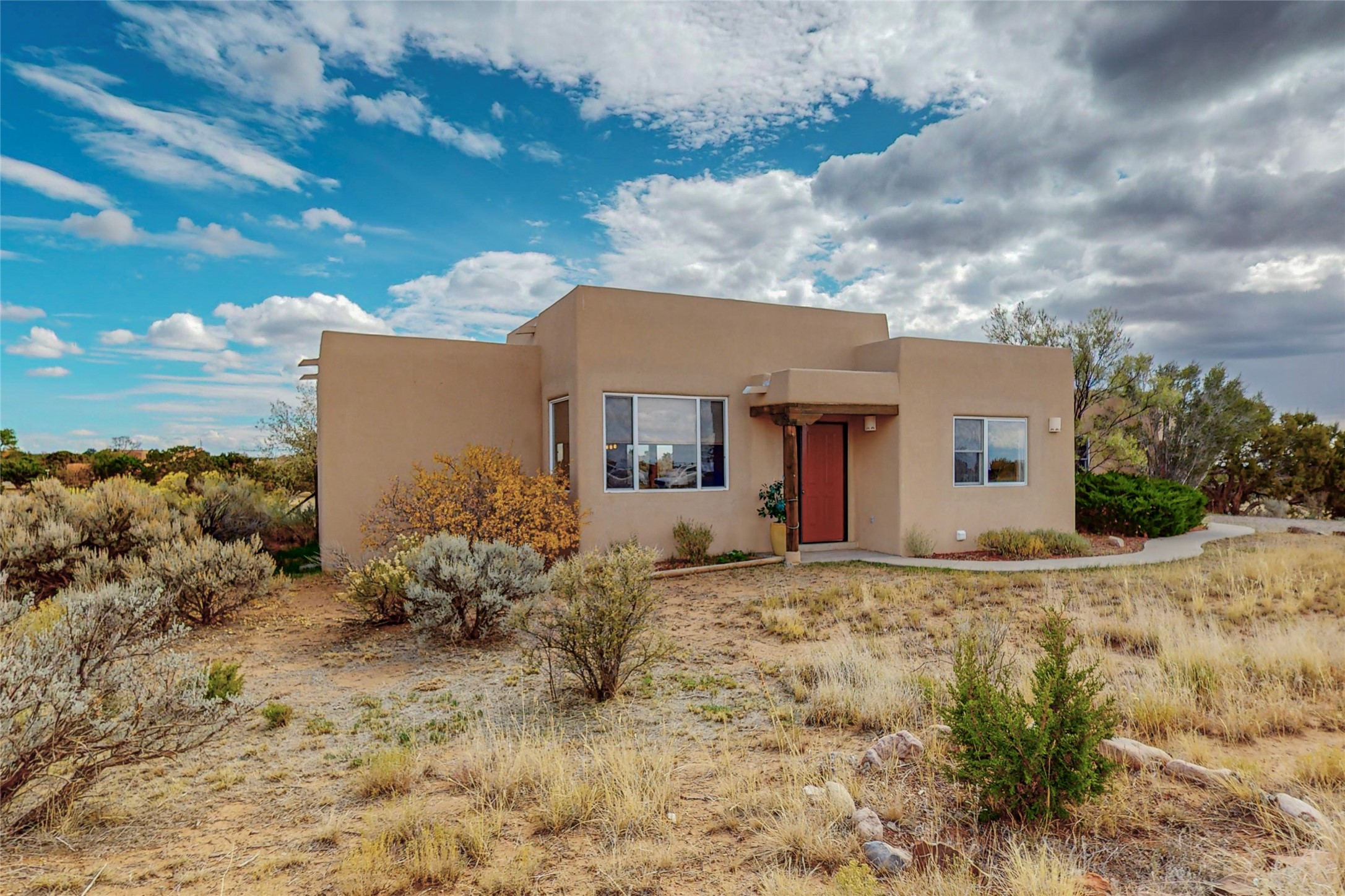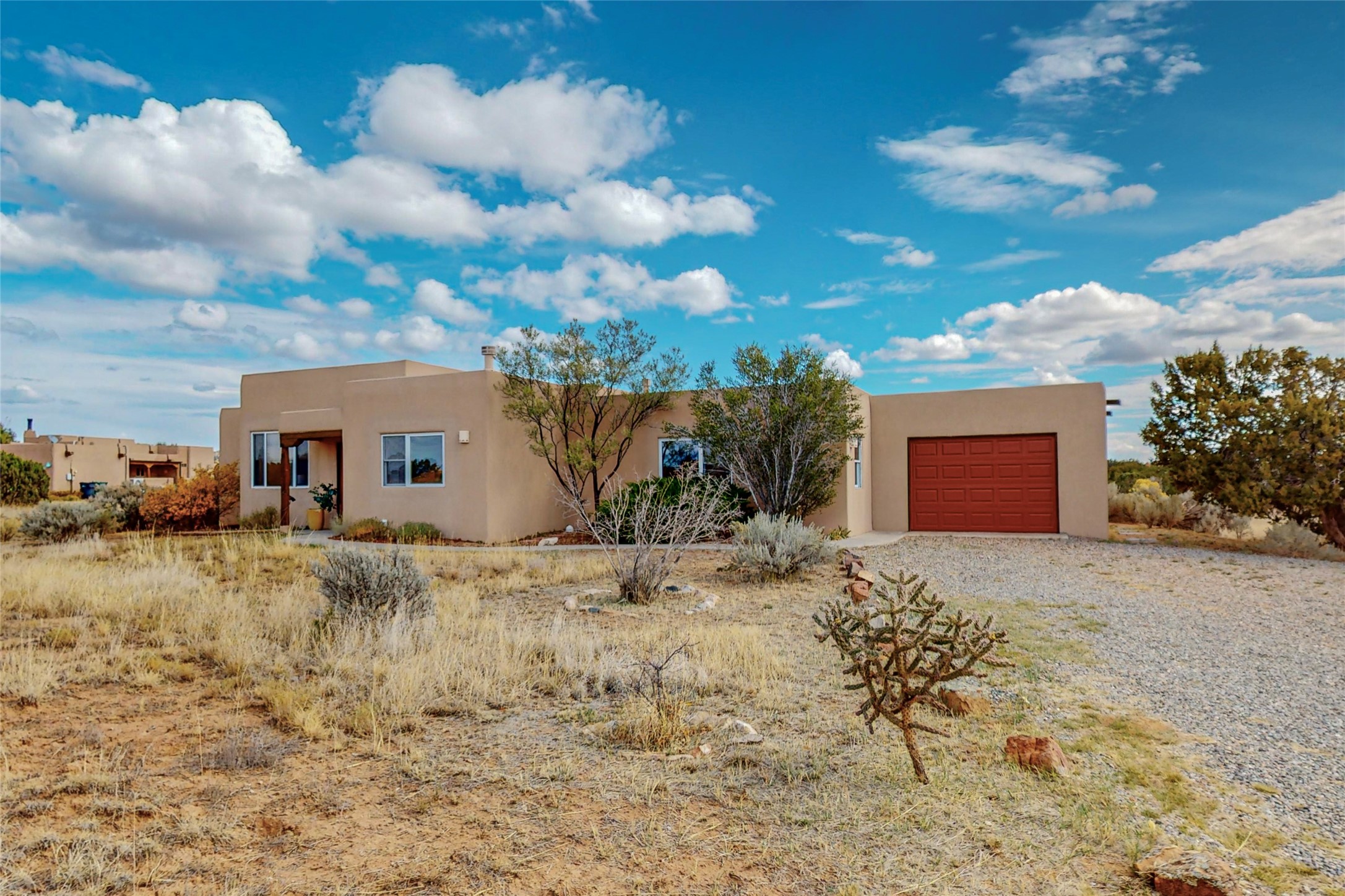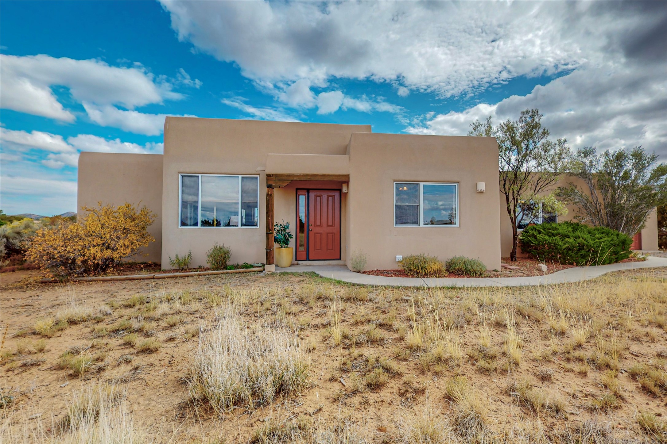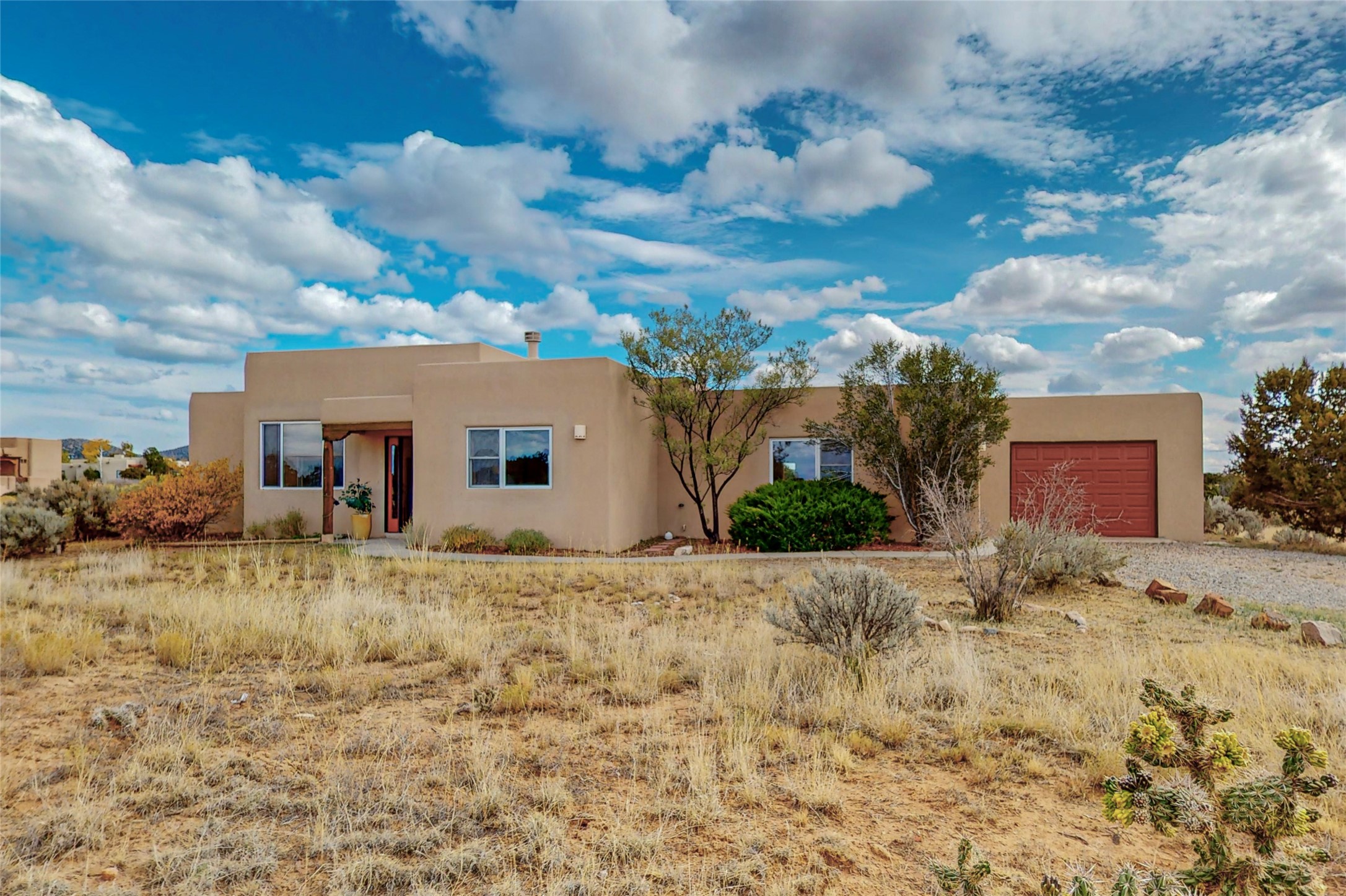Located in the community of Eldorado, this Santa Fe-style single-story home includes an open floor plan, 3 bedrooms, 2 bathrooms, 1 car garage. The living room is graced with lofty ceilings and enhanced with vigas. A gas burning fireplace and the adjoining kitchen and dining area offers a practical space for both cooking and hosting gatherings. The primary suite includes dual closets, a roomy bathroom with dual sinks, a walk-in shower, and a soaking tub. The flexible floor plan offers versatility, with the option to use the second bedroom as an office, and the third bedroom as a media room or exercise room. With the back portal used for relaxing and entertaining, this serene location provides awe-inspiring 360 panoramic views, including stunning sunsets over the Jemez mountains to the west, views of the Sangre de Cristo Mountains to the east, and boundless vistas to the south, all the way to the Sandia Mountains in Albuquerque. The property boasts several enhancements: recently installed septic system, 3 mini splits for efficient heating and cooling, an upgraded boiler for radiant heat, a fresh-water tank, and a new refrigerator. This charming Eldorado property offers a lifestyle that seamlessly combines modern comforts with the natural beauty and tranquility of the community. With versatile living spaces, stunning views, and thoughtful amenities, it's a place to call home.