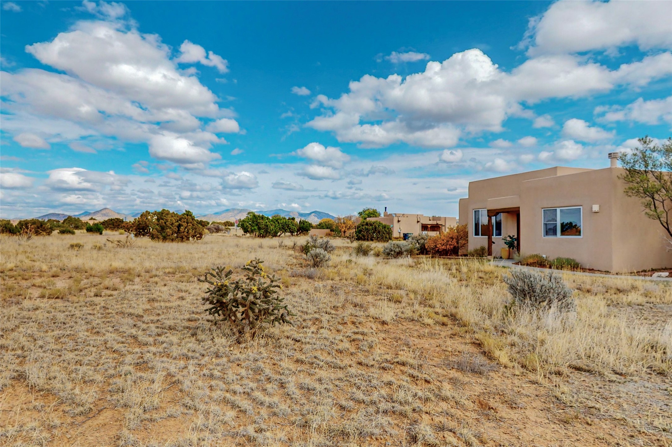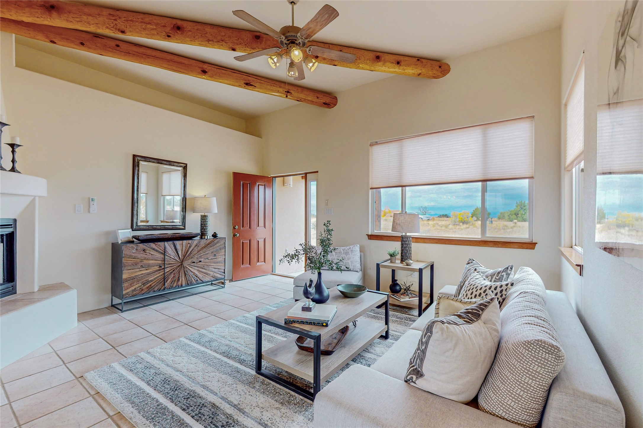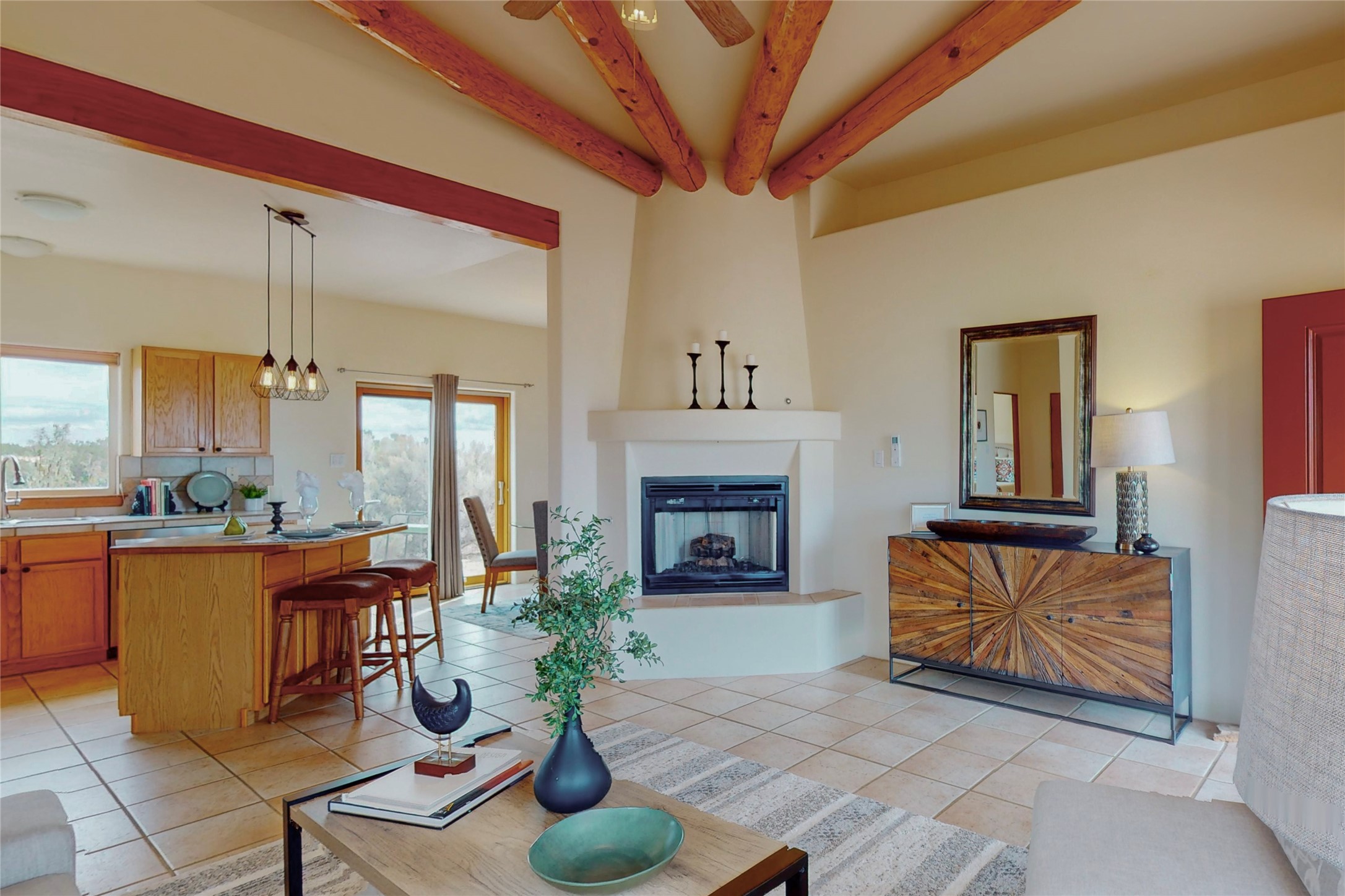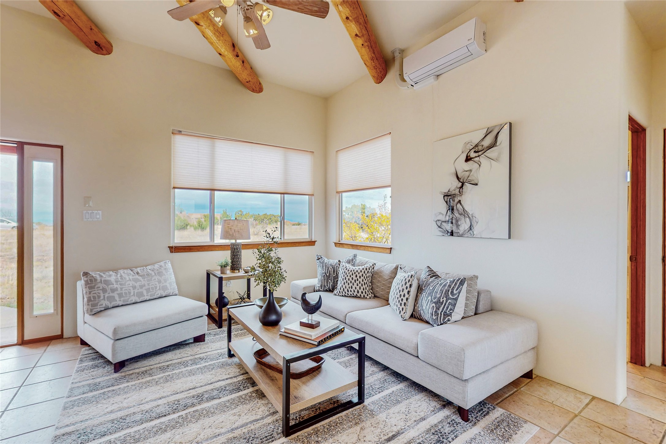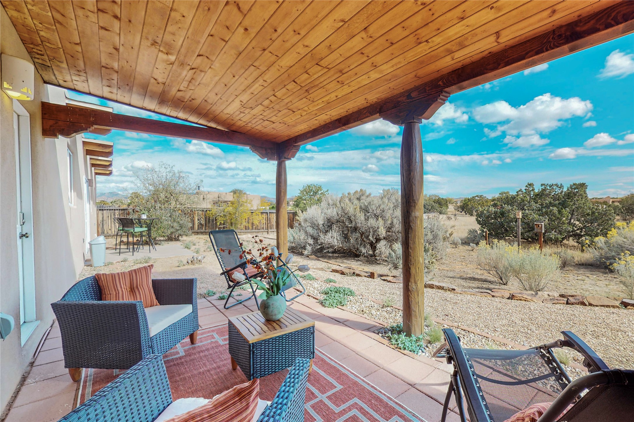 Located in the community of Eldorado, this Santa Fe-style single-story home includes an open floor plan, 3 bedrooms, 2 bathrooms, 1 car garage. The living room is graced with lofty ceilings and enhanced with vigas. A gas burning fireplace and the adjoining kitchen and dining area offers a practical space for both cooking and hosting gatherings. The primary suite includes dual closets, a roomy bathroom with dual sinks, a walk-in shower, and a soaking tub. The flexible floor plan offers versatility, with the option to use the second bedroom as an office, and the third bedroom as a media room or exercise room. With the back portal used for relaxing and entertaining, this serene location provides awe-inspiring 360 panoramic views, including stunning sunsets over the Jemez mountains to the west, views of the Sangre de Cristo Mountains to the east, and boundless vistas to the south, all the way to the Sandia Mountains in Albuquerque. The property boasts several enhancements: recently installed septic system, 3 mini splits for efficient heating and cooling, an upgraded boiler for radiant heat, a fresh-water tank, and a new refrigerator. This charming Eldorado property offers a lifestyle that seamlessly combines modern comforts with the natural beauty and tranquility of the community. With versatile living spaces, stunning views, and thoughtful amenities, it's a place to call home.