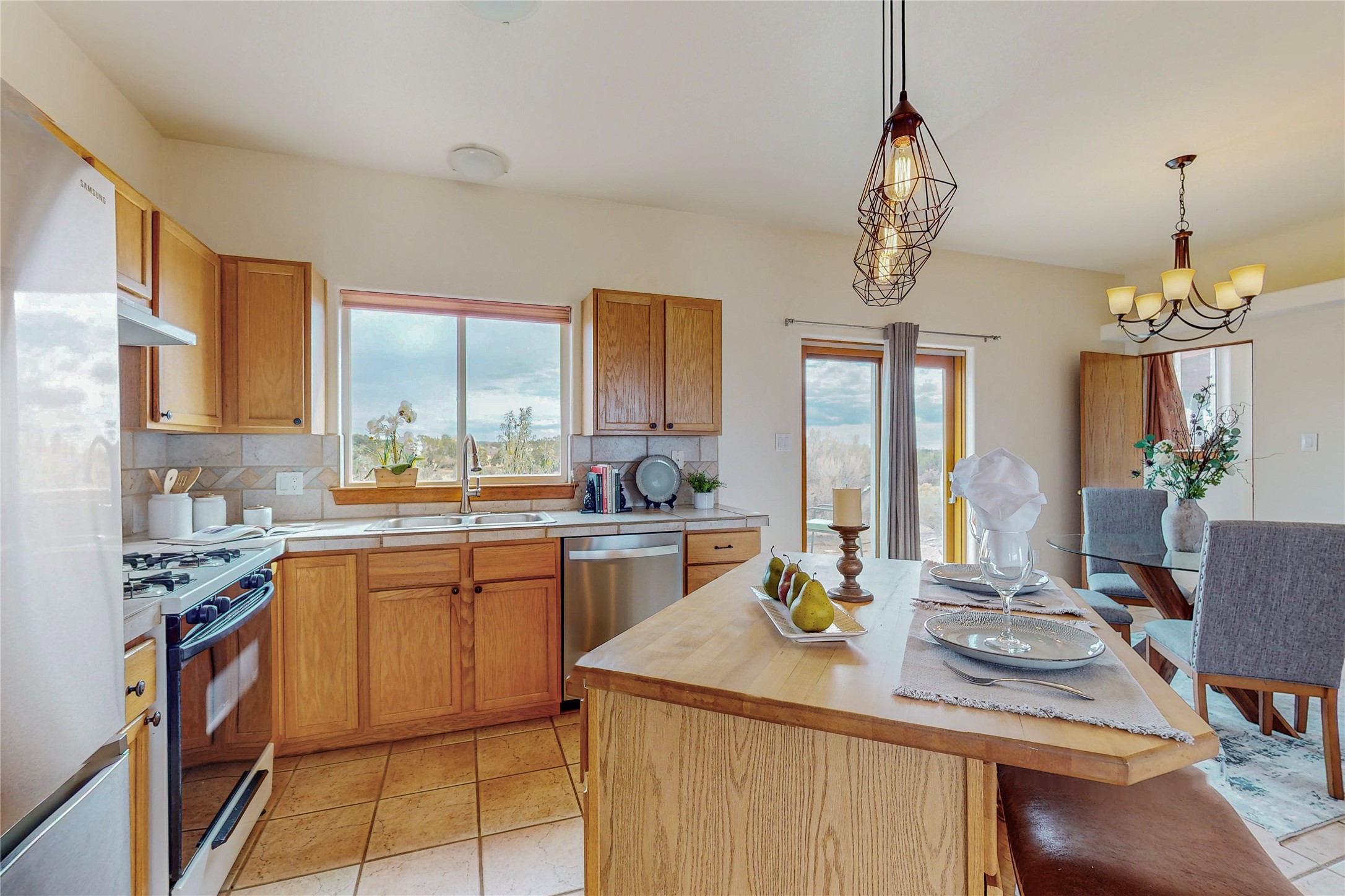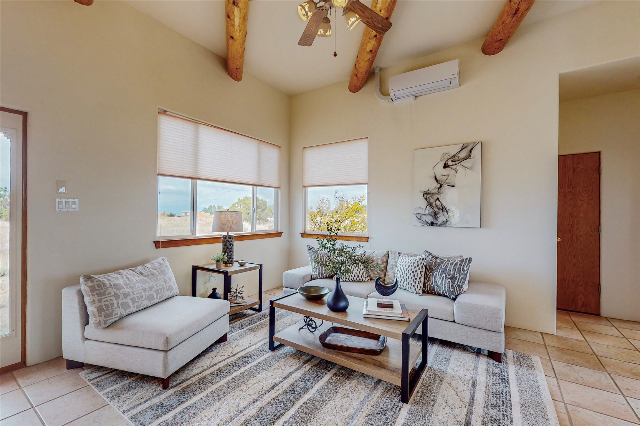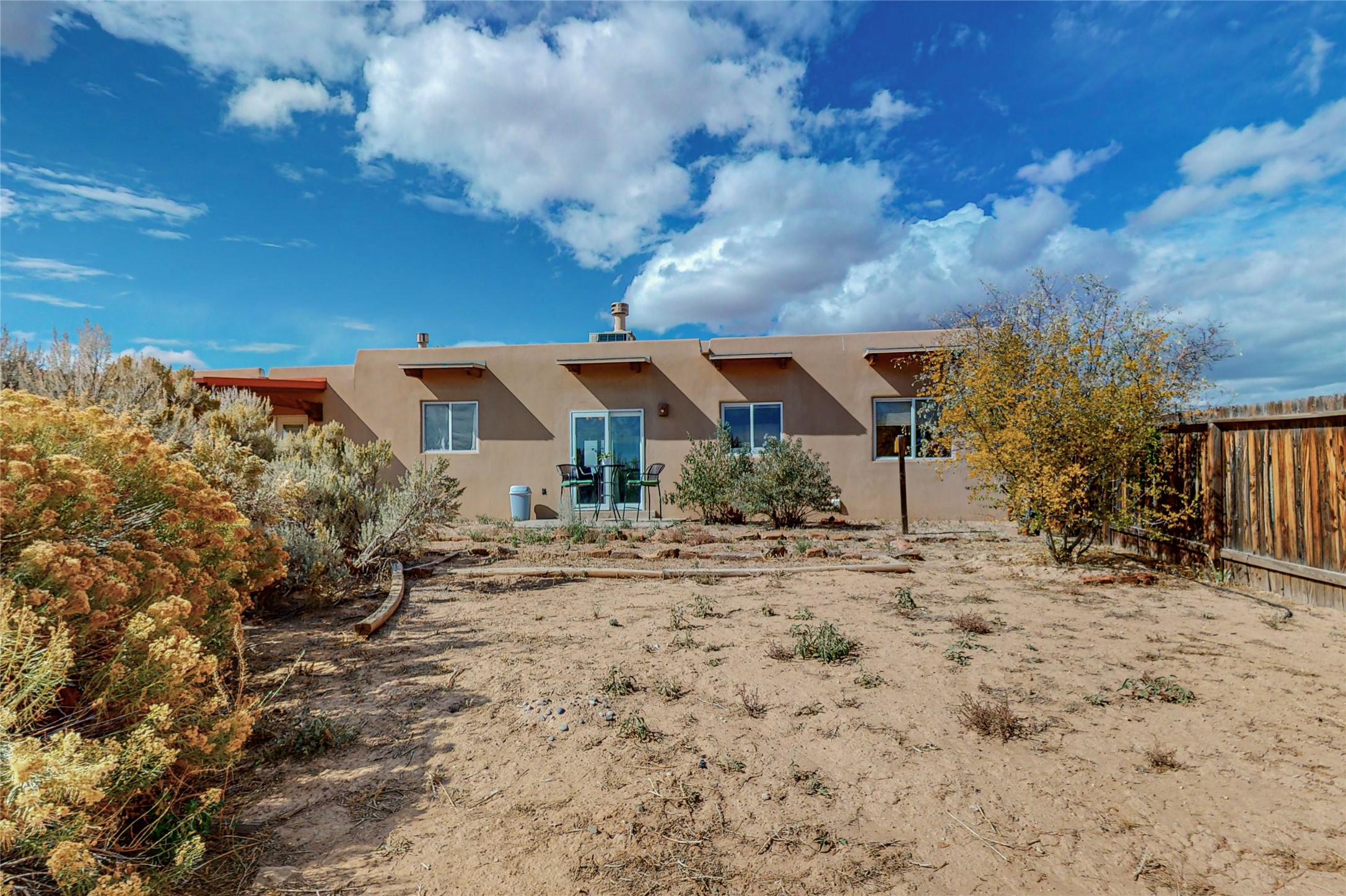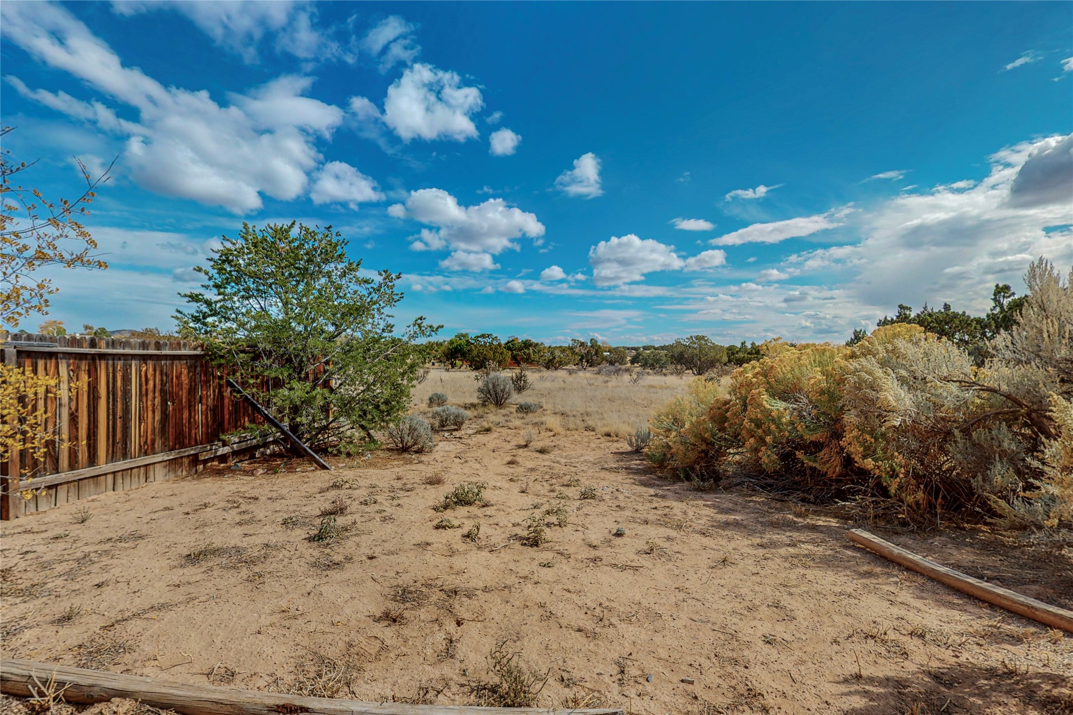 Located in the community of Eldorado, this Santa Fe-style single-story home includes an open floor plan, 3 bedrooms, 2 bathrooms, 1 car garage. The living room is graced with lofty ceilings and enhanced with vigas. A gas burning fireplace and the adjoining kitchen and dining area offers a practical space for both cooking and hosting gatherings. The primary suite includes dual closets, a roomy bathroom with dual sinks, a walk-in shower, and a soaking tub. The flexible floor plan offers versatility, with the option to use the second bedroom as an office, and the third bedroom as a media room or exercise room. With the back portal used for relaxing and entertaining, this serene location provides awe-inspiring 360 panoramic views, including stunning sunsets over the Jemez mountains to the west, views of the Sangre de Cristo Mountains to the east, and boundless vistas to the south, all the way to the Sandia Mountains in Albuquerque. The property boasts several enhancements: recently installed septic system, 3 mini splits for efficient heating and cooling, an upgraded boiler for radiant heat, a fresh-water tank, and a new refrigerator. This charming Eldorado property offers a lifestyle that seamlessly combines modern comforts with the natural beauty and tranquility of the community. With versatile living spaces, stunning views, and thoughtful amenities, it's a place to call home.