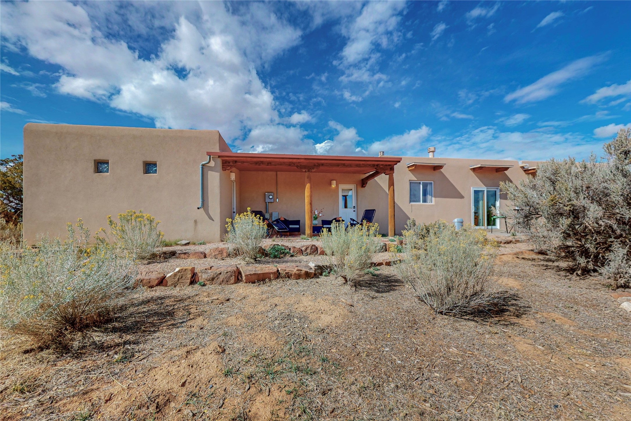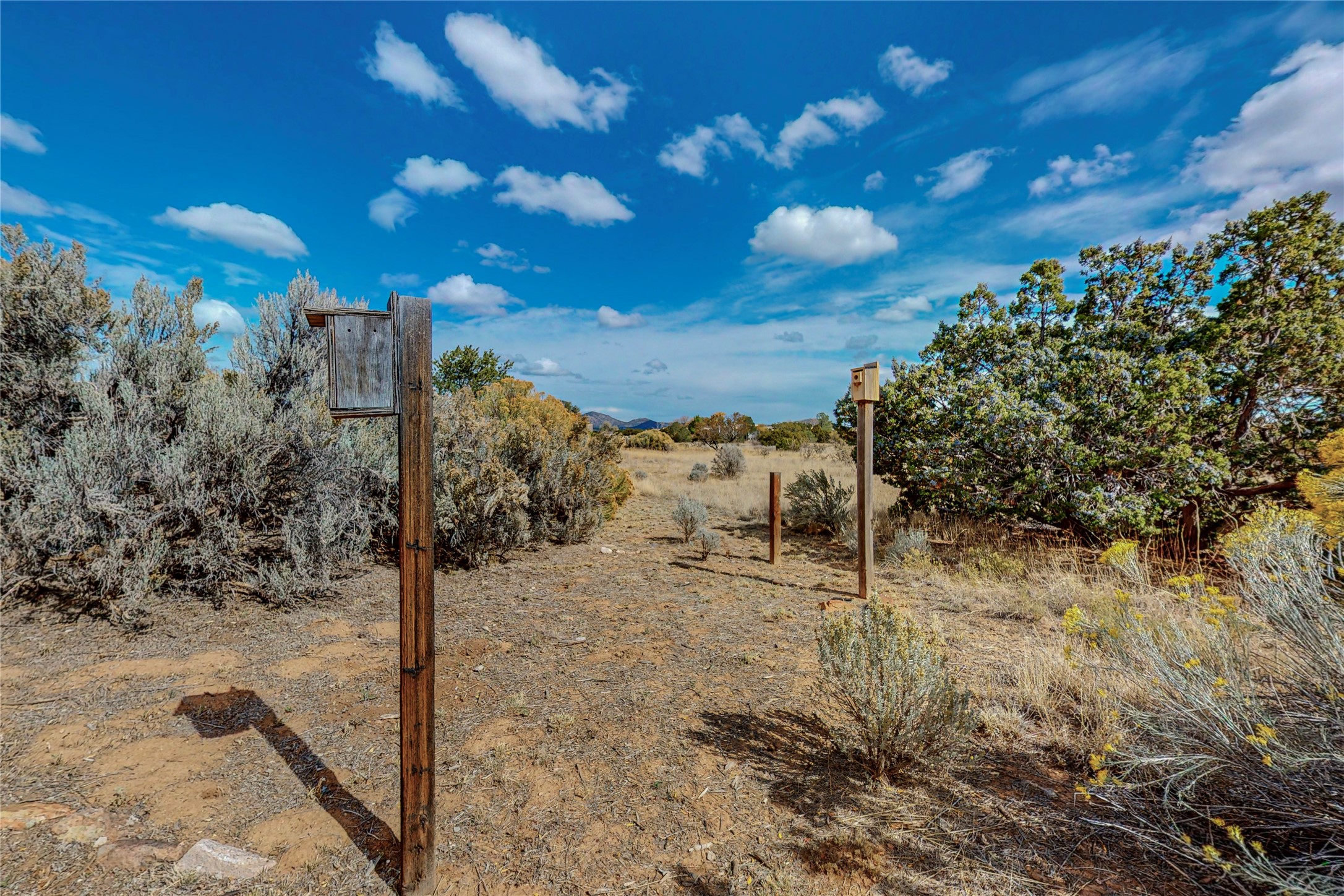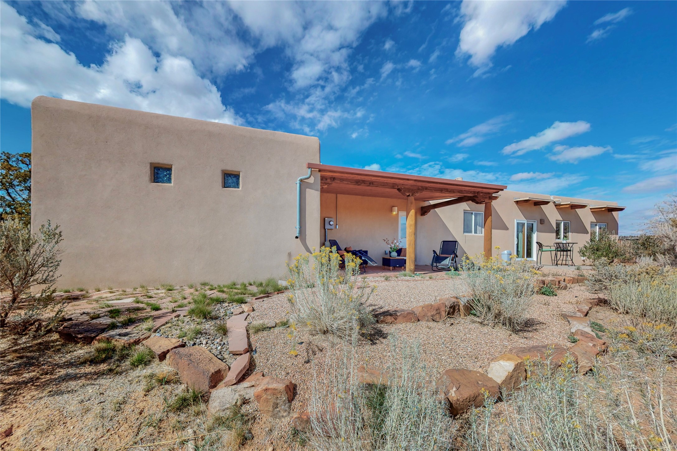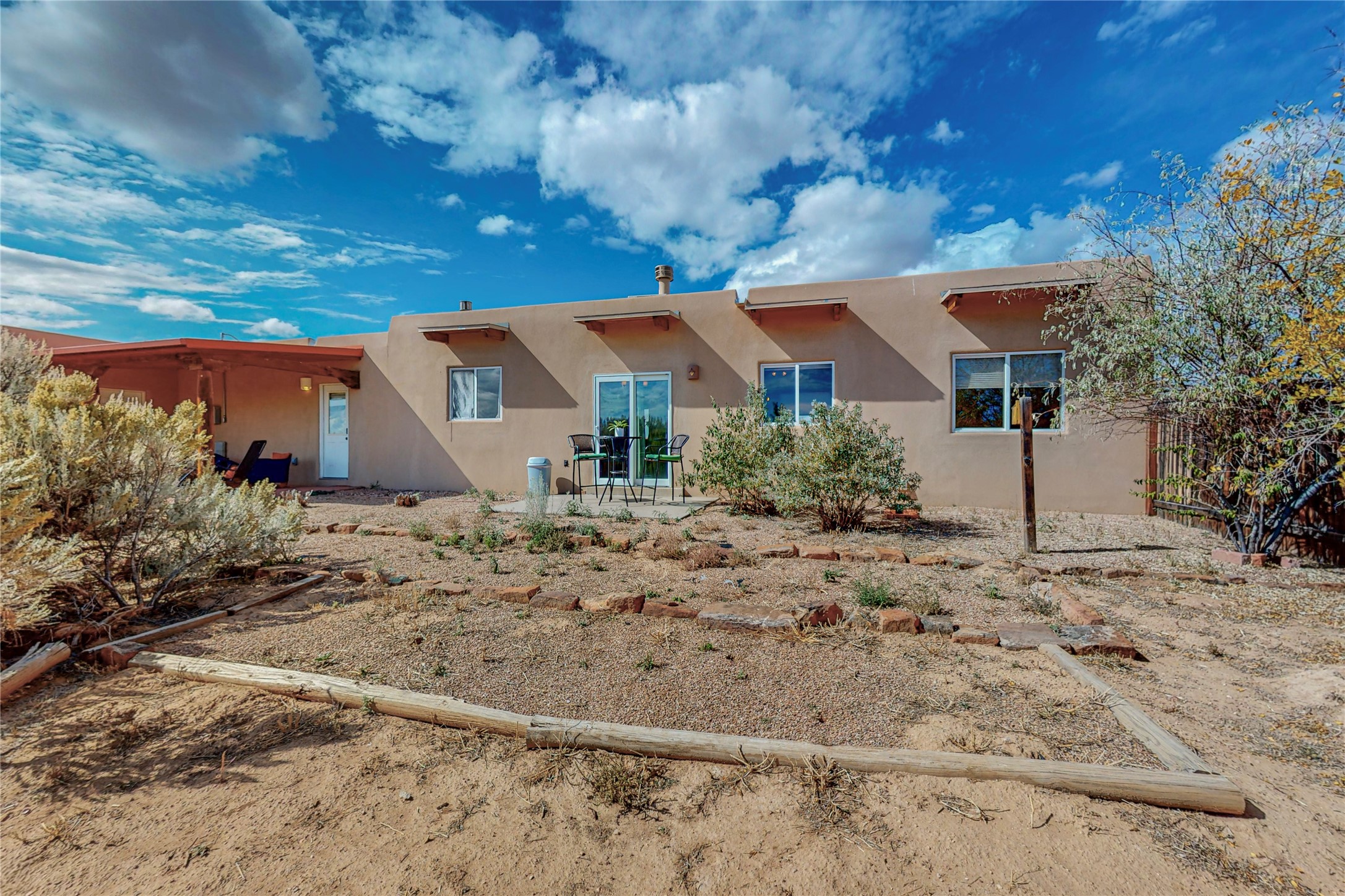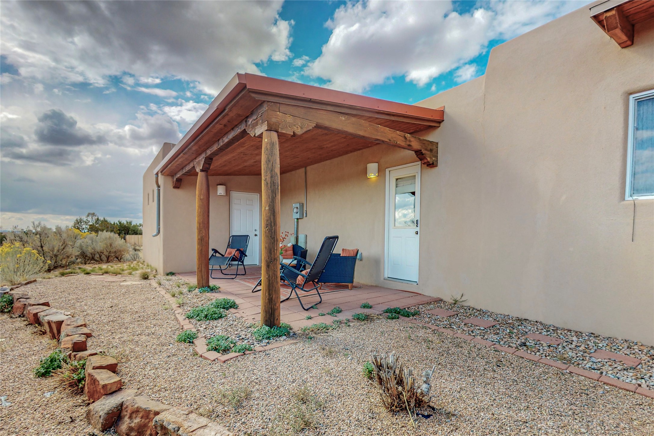 Located in the community of Eldorado, this Santa Fe-style single-story home includes an open floor plan, 3 bedrooms, 2 bathrooms, 1 car garage. The living room is graced with lofty ceilings and enhanced with vigas. A gas burning fireplace and the adjoining kitchen and dining area offers a practical space for both cooking and hosting gatherings. The primary suite includes dual closets, a roomy bathroom with dual sinks, a walk-in shower, and a soaking tub. The flexible floor plan offers versatility, with the option to use the second bedroom as an office, and the third bedroom as a media room or exercise room. With the back portal used for relaxing and entertaining, this serene location provides awe-inspiring 360 panoramic views, including stunning sunsets over the Jemez mountains to the west, views of the Sangre de Cristo Mountains to the east, and boundless vistas to the south, all the way to the Sandia Mountains in Albuquerque. The property boasts several enhancements: recently installed septic system, 3 mini splits for efficient heating and cooling, an upgraded boiler for radiant heat, a fresh-water tank, and a new refrigerator. This charming Eldorado property offers a lifestyle that seamlessly combines modern comforts with the natural beauty and tranquility of the community. With versatile living spaces, stunning views, and thoughtful amenities, it's a place to call home.