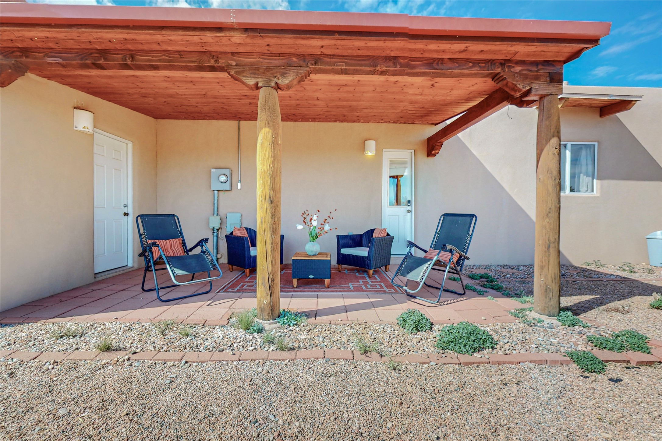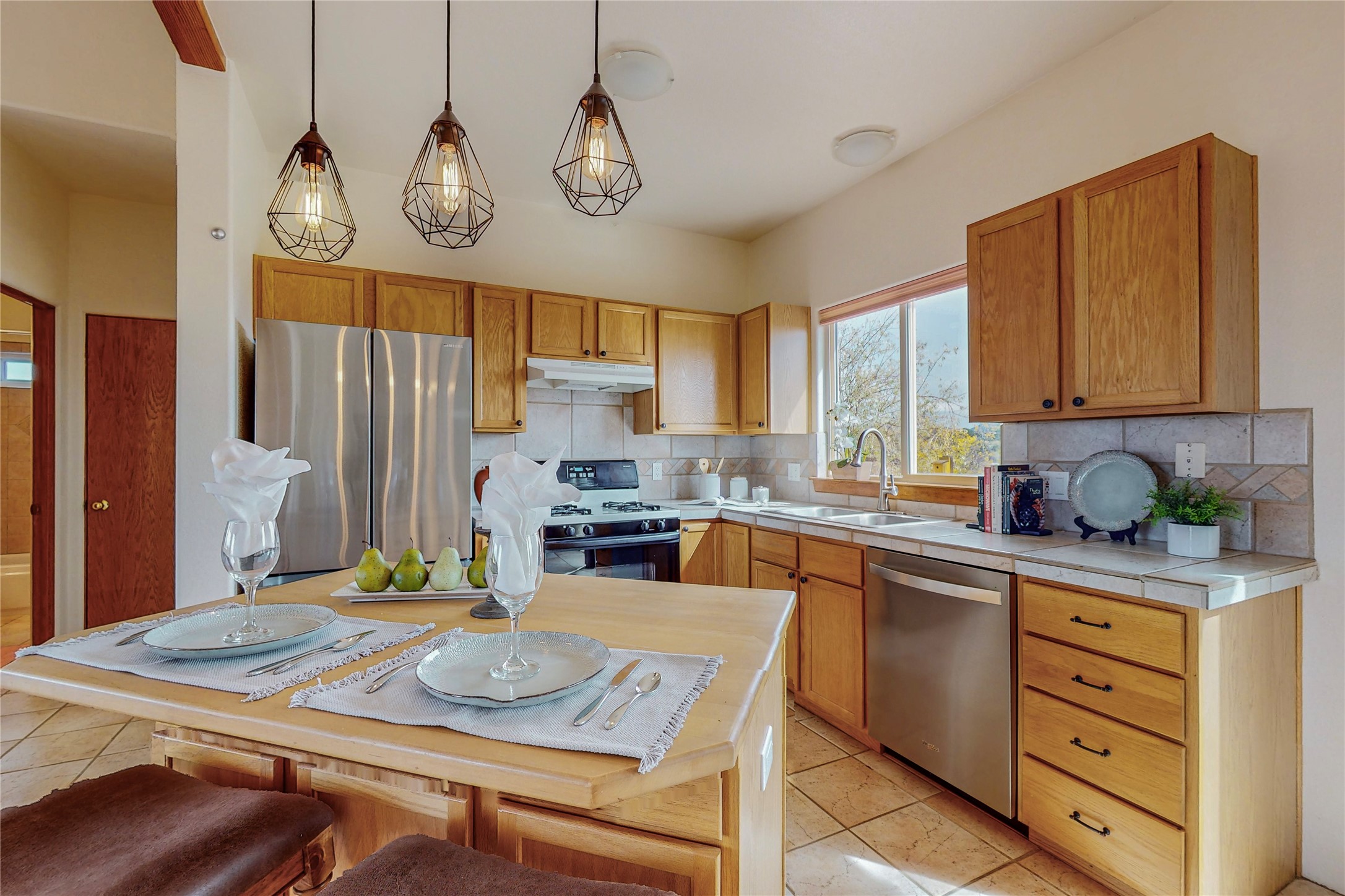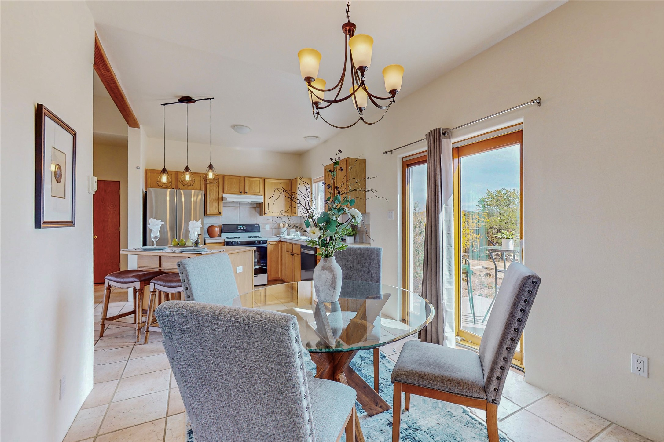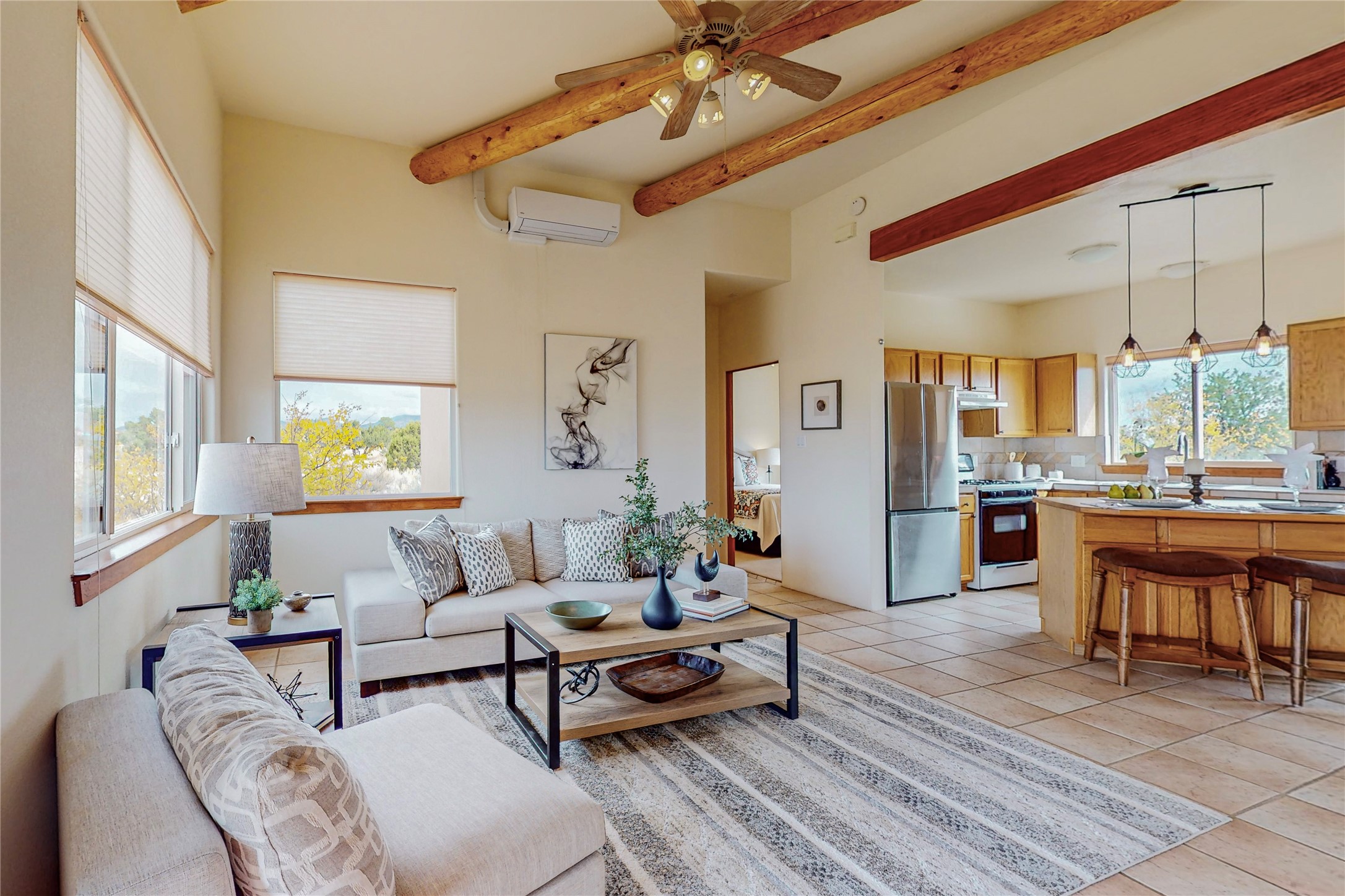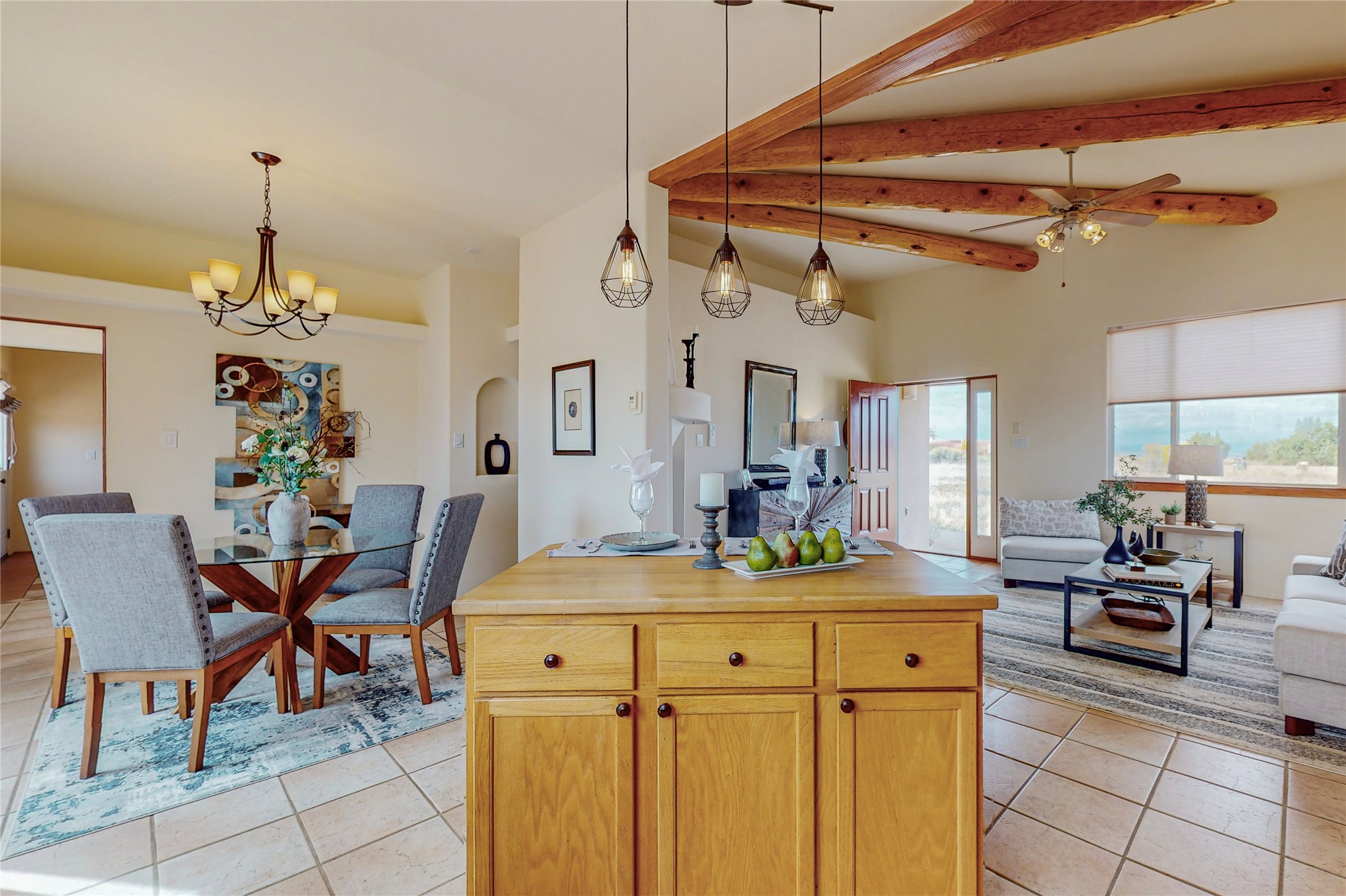 Located in the community of Eldorado, this Santa Fe-style single-story home includes an open floor plan, 3 bedrooms, 2 bathrooms, 1 car garage. The living room is graced with lofty ceilings and enhanced with vigas. A gas burning fireplace and the adjoining kitchen and dining area offers a practical space for both cooking and hosting gatherings. The primary suite includes dual closets, a roomy bathroom with dual sinks, a walk-in shower, and a soaking tub. The flexible floor plan offers versatility, with the option to use the second bedroom as an office, and the third bedroom as a media room or exercise room. With the back portal used for relaxing and entertaining, this serene location provides awe-inspiring 360 panoramic views, including stunning sunsets over the Jemez mountains to the west, views of the Sangre de Cristo Mountains to the east, and boundless vistas to the south, all the way to the Sandia Mountains in Albuquerque. The property boasts several enhancements: recently installed septic system, 3 mini splits for efficient heating and cooling, an upgraded boiler for radiant heat, a fresh-water tank, and a new refrigerator. This charming Eldorado property offers a lifestyle that seamlessly combines modern comforts with the natural beauty and tranquility of the community. With versatile living spaces, stunning views, and thoughtful amenities, it's a place to call home.