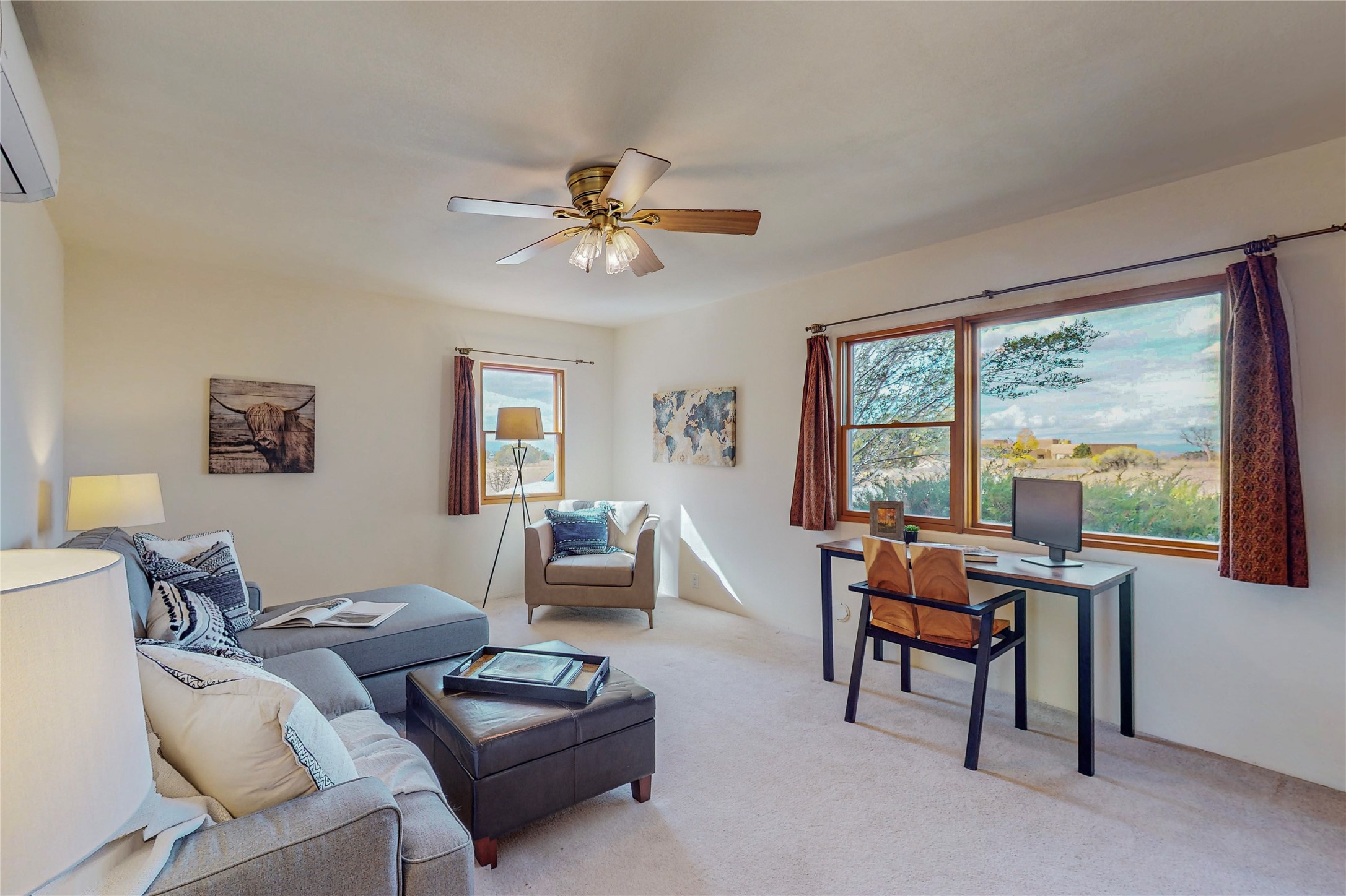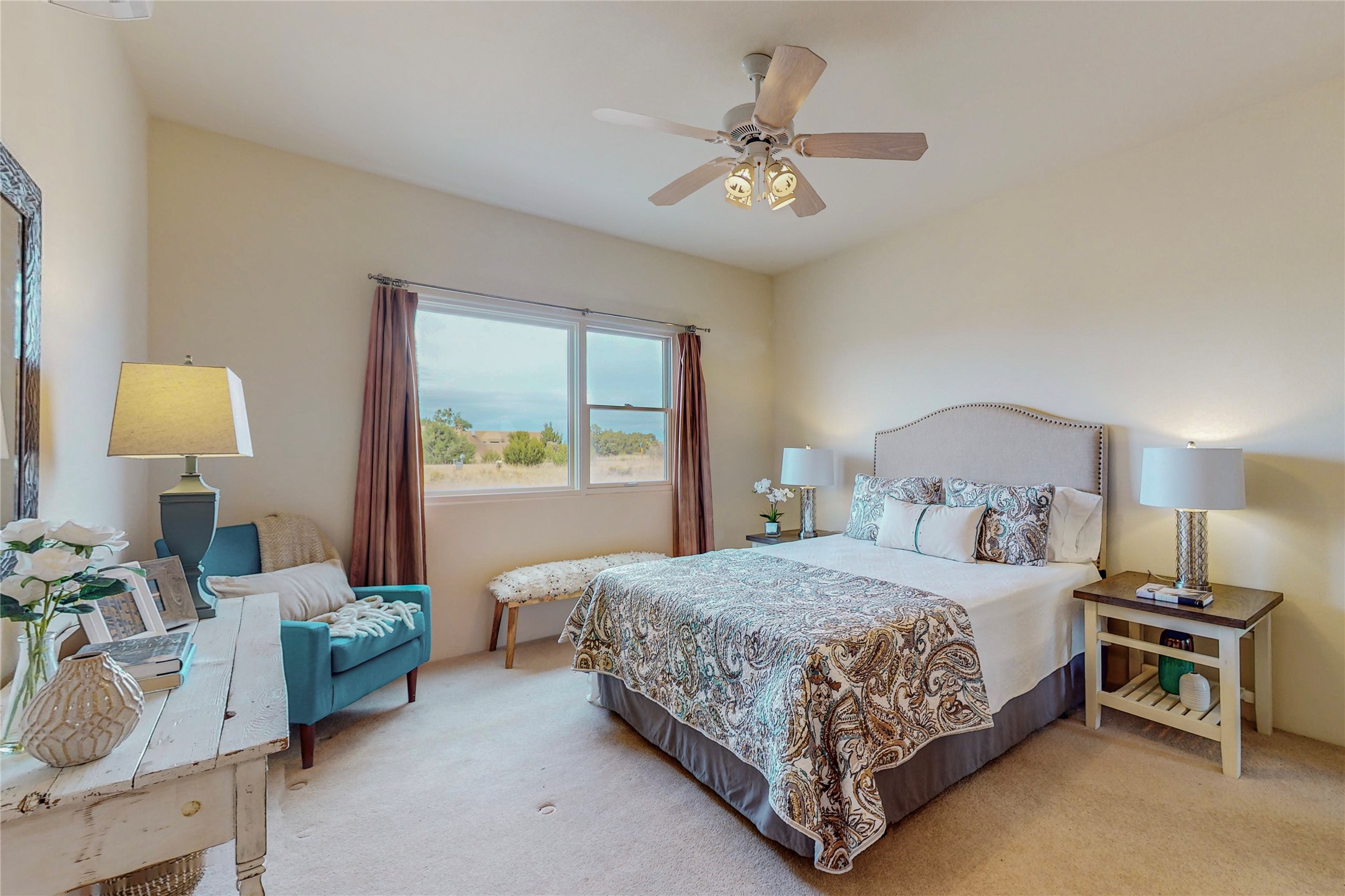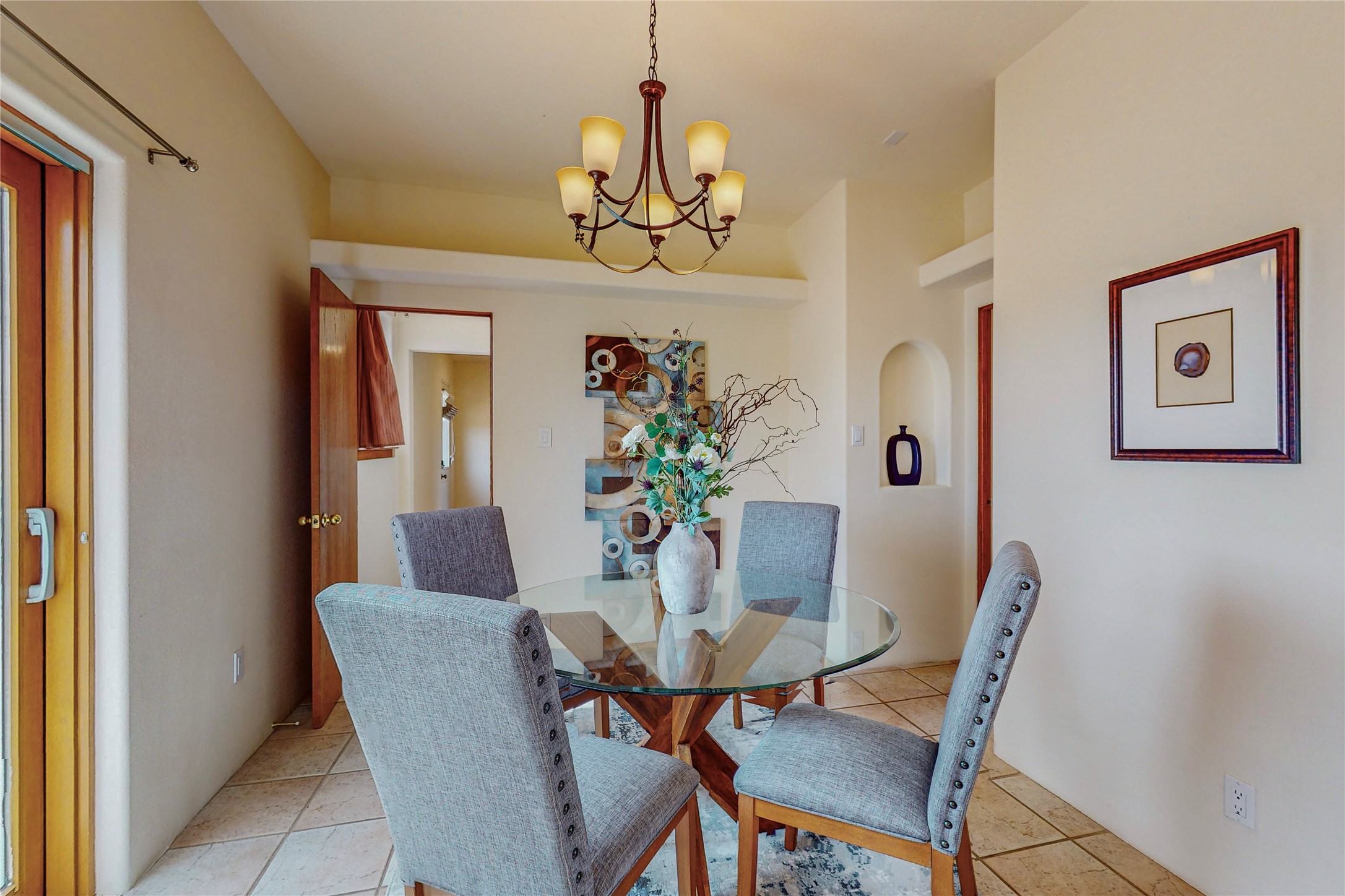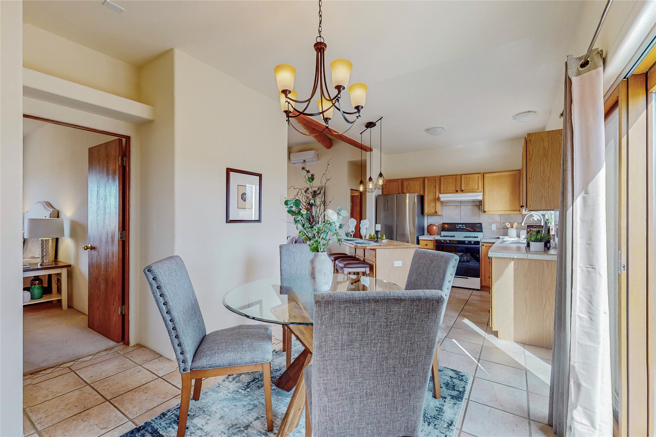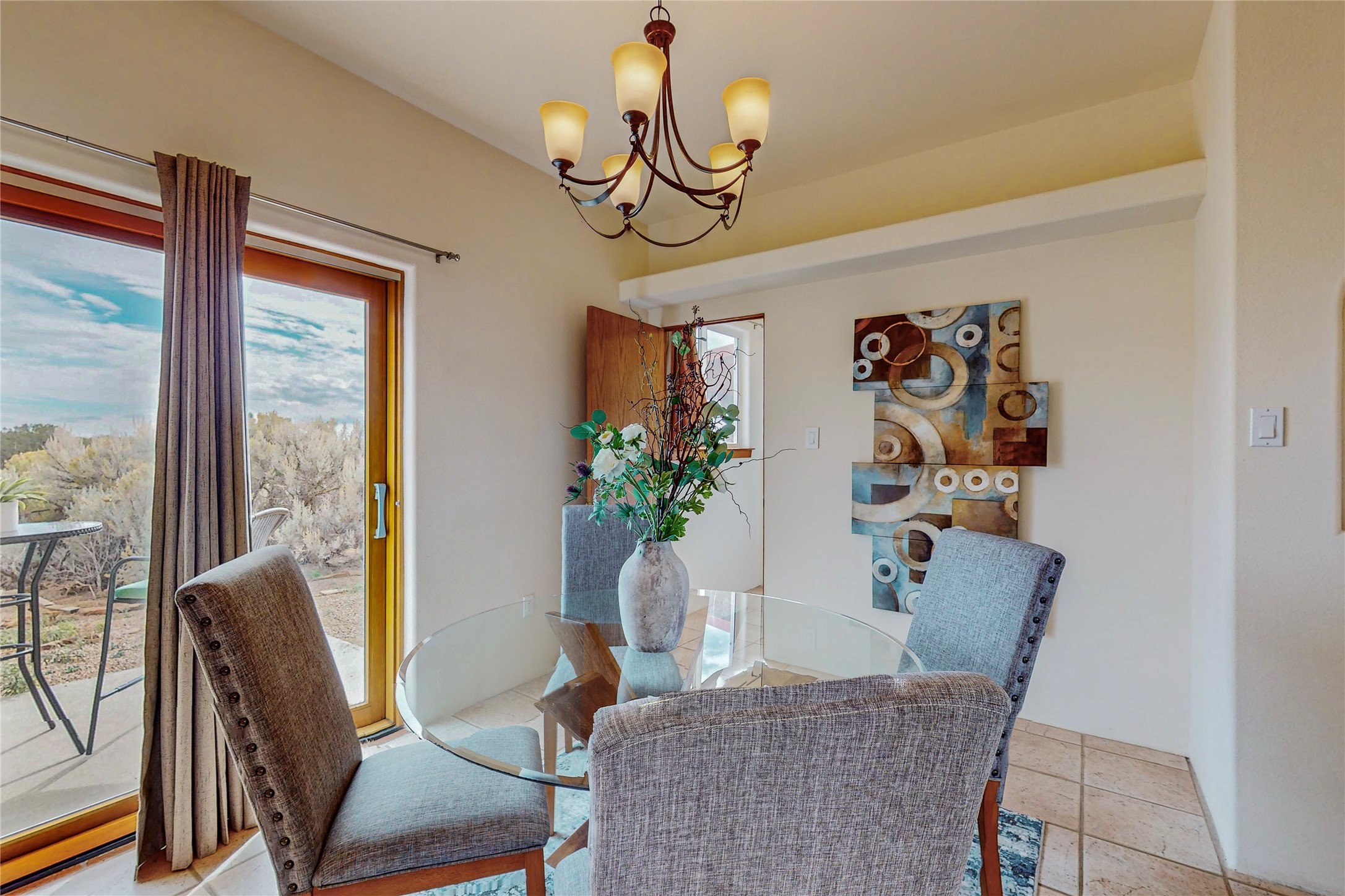 Located in the community of Eldorado, this Santa Fe-style single-story home includes an open floor plan, 3 bedrooms, 2 bathrooms, 1 car garage. The living room is graced with lofty ceilings and enhanced with vigas. A gas burning fireplace and the adjoining kitchen and dining area offers a practical space for both cooking and hosting gatherings. The primary suite includes dual closets, a roomy bathroom with dual sinks, a walk-in shower, and a soaking tub. The flexible floor plan offers versatility, with the option to use the second bedroom as an office, and the third bedroom as a media room or exercise room. With the back portal used for relaxing and entertaining, this serene location provides awe-inspiring 360 panoramic views, including stunning sunsets over the Jemez mountains to the west, views of the Sangre de Cristo Mountains to the east, and boundless vistas to the south, all the way to the Sandia Mountains in Albuquerque. The property boasts several enhancements: recently installed septic system, 3 mini splits for efficient heating and cooling, an upgraded boiler for radiant heat, a fresh-water tank, and a new refrigerator. This charming Eldorado property offers a lifestyle that seamlessly combines modern comforts with the natural beauty and tranquility of the community. With versatile living spaces, stunning views, and thoughtful amenities, it's a place to call home.