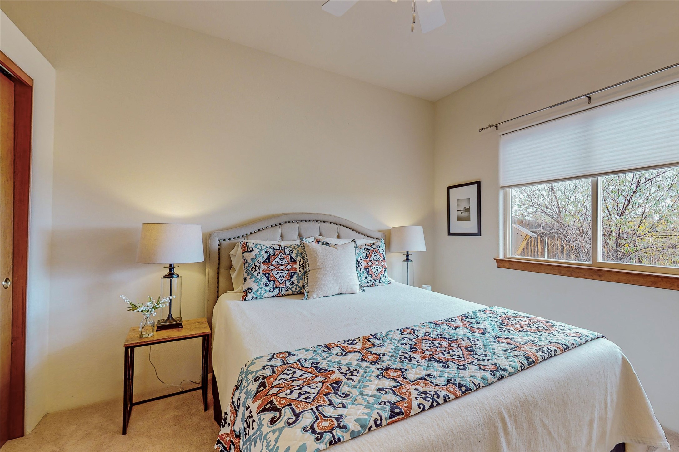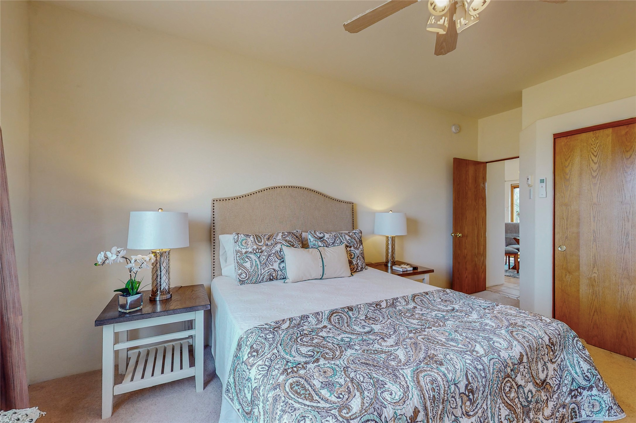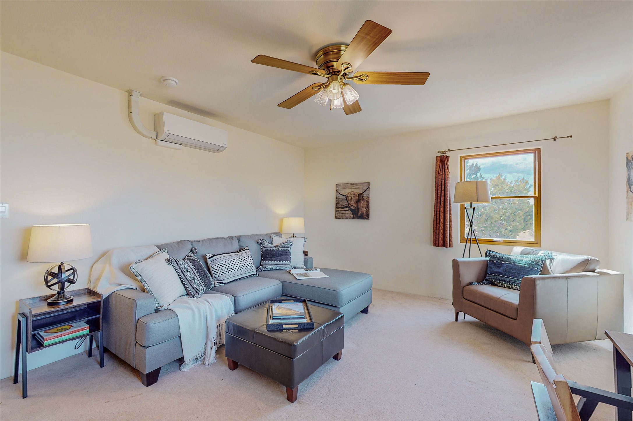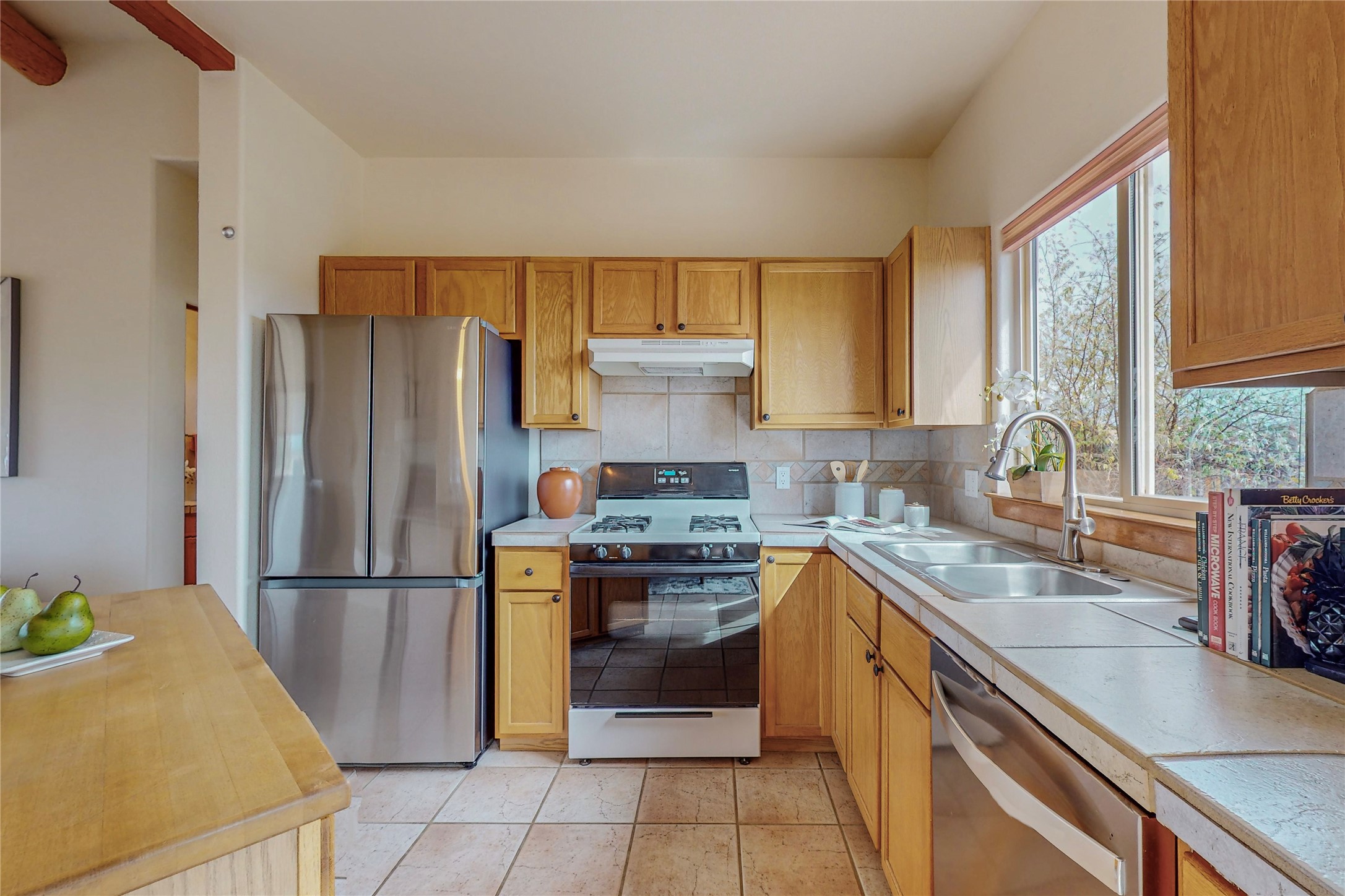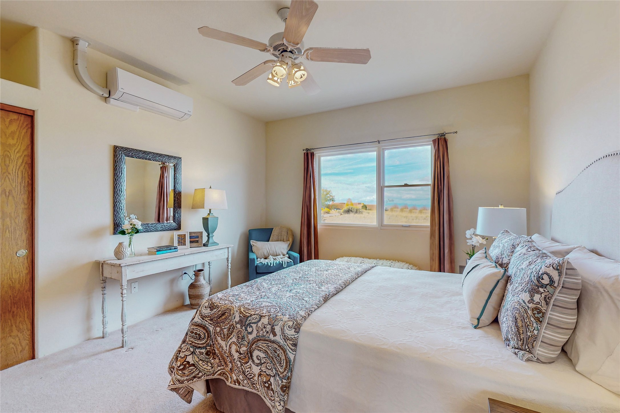 Located in the community of Eldorado, this Santa Fe-style single-story home includes an open floor plan, 3 bedrooms, 2 bathrooms, 1 car garage. The living room is graced with lofty ceilings and enhanced with vigas. A gas burning fireplace and the adjoining kitchen and dining area offers a practical space for both cooking and hosting gatherings. The primary suite includes dual closets, a roomy bathroom with dual sinks, a walk-in shower, and a soaking tub. The flexible floor plan offers versatility, with the option to use the second bedroom as an office, and the third bedroom as a media room or exercise room. With the back portal used for relaxing and entertaining, this serene location provides awe-inspiring 360 panoramic views, including stunning sunsets over the Jemez mountains to the west, views of the Sangre de Cristo Mountains to the east, and boundless vistas to the south, all the way to the Sandia Mountains in Albuquerque. The property boasts several enhancements: recently installed septic system, 3 mini splits for efficient heating and cooling, an upgraded boiler for radiant heat, a fresh-water tank, and a new refrigerator. This charming Eldorado property offers a lifestyle that seamlessly combines modern comforts with the natural beauty and tranquility of the community. With versatile living spaces, stunning views, and thoughtful amenities, it's a place to call home.