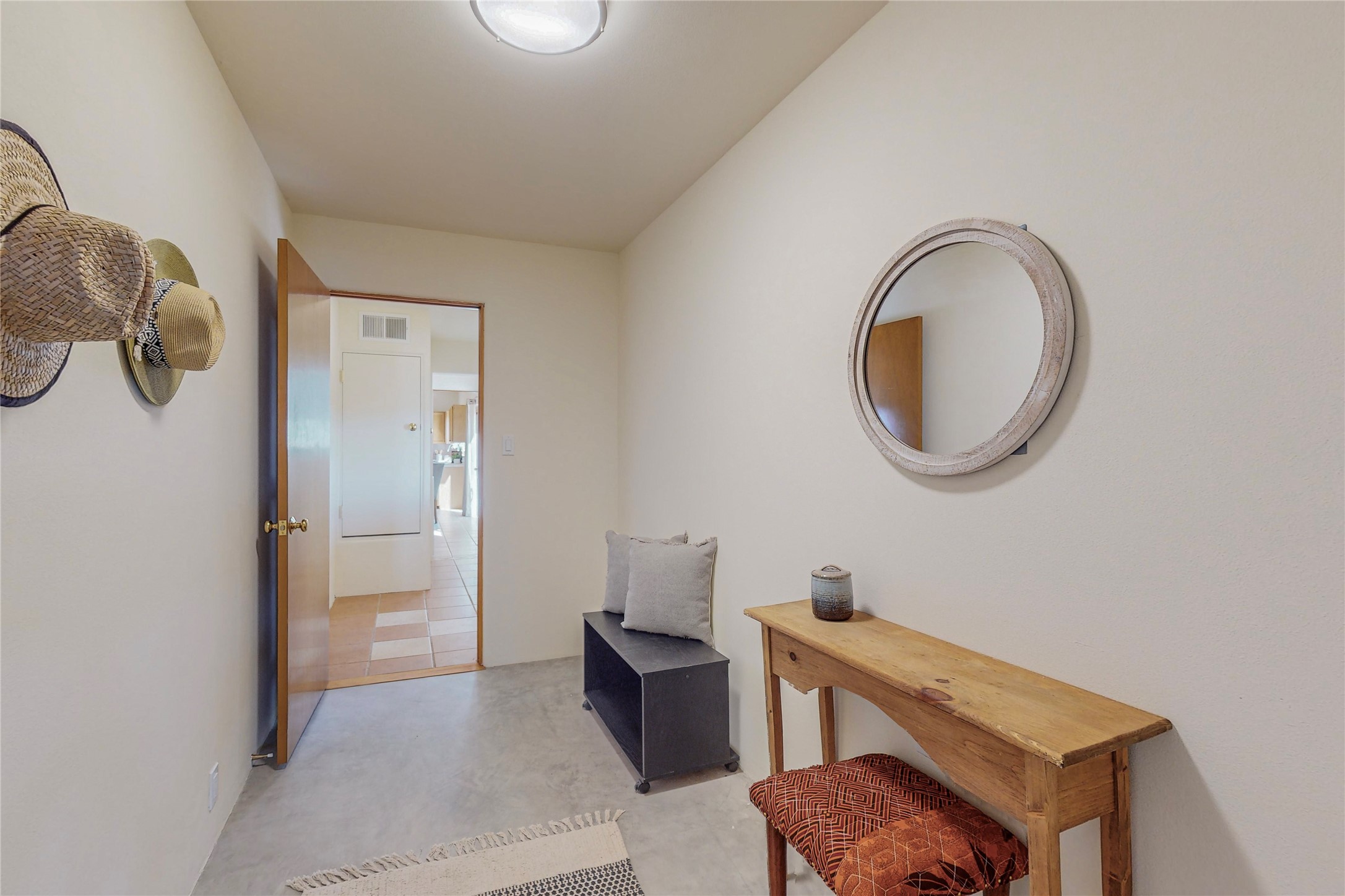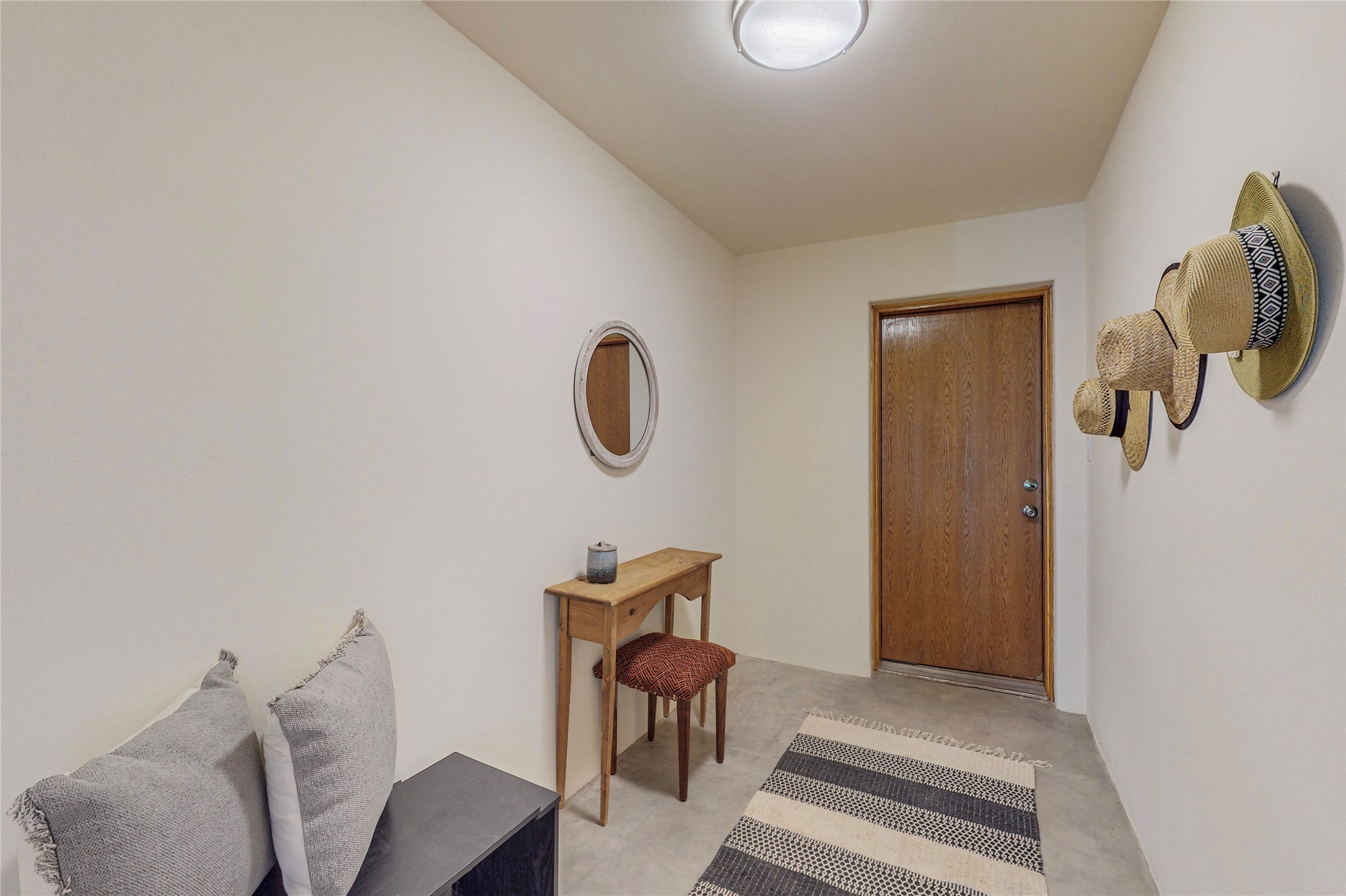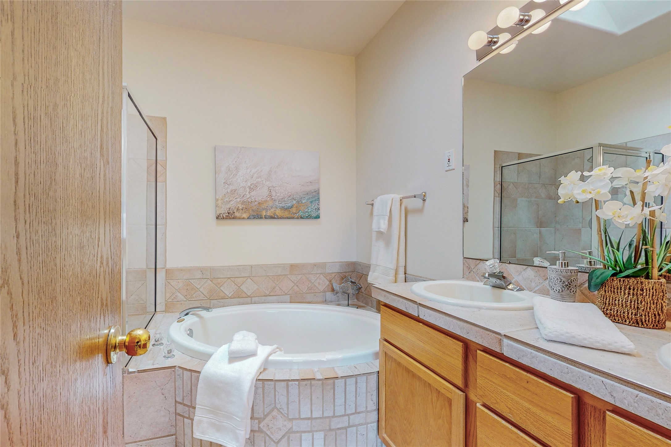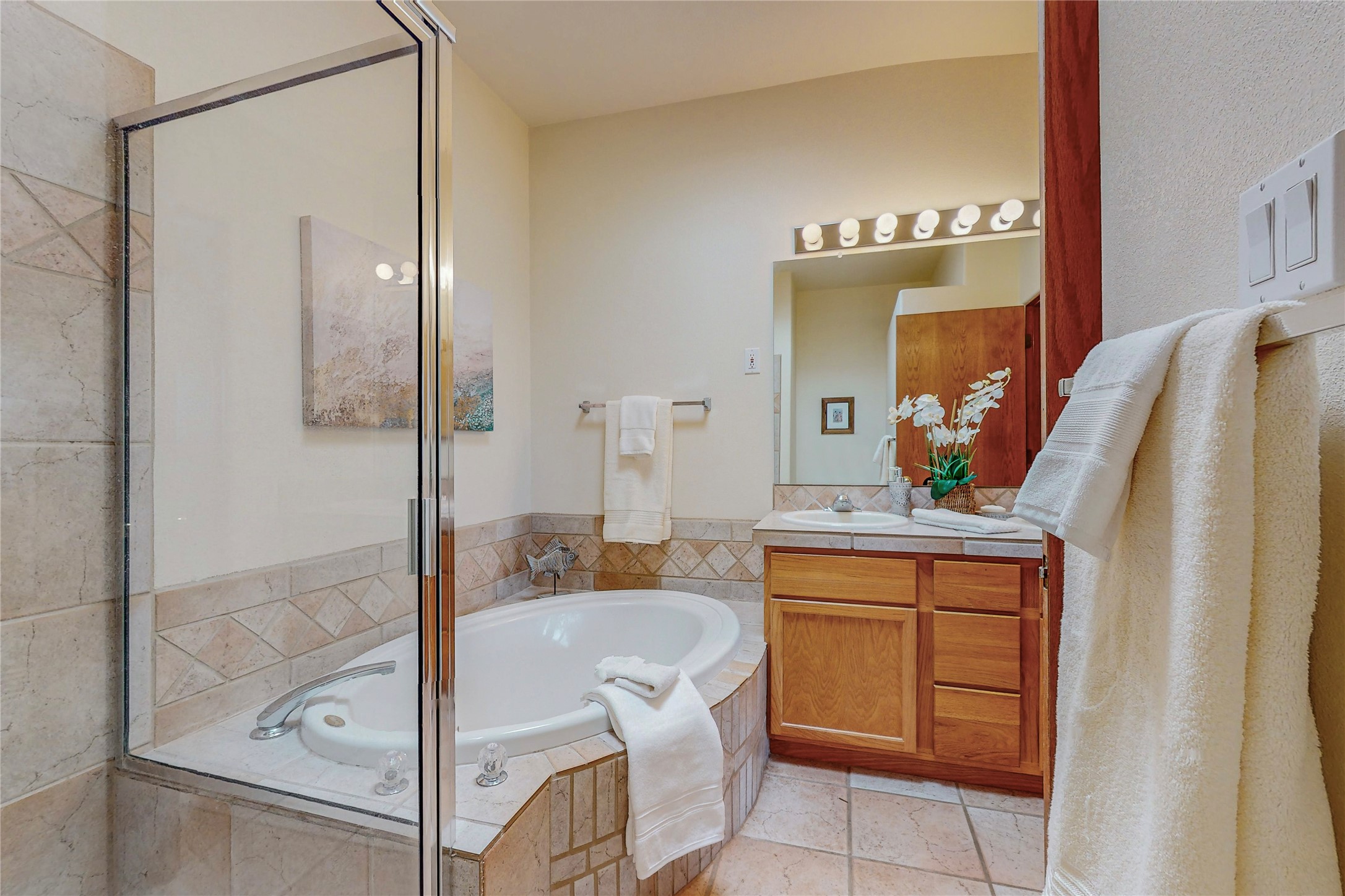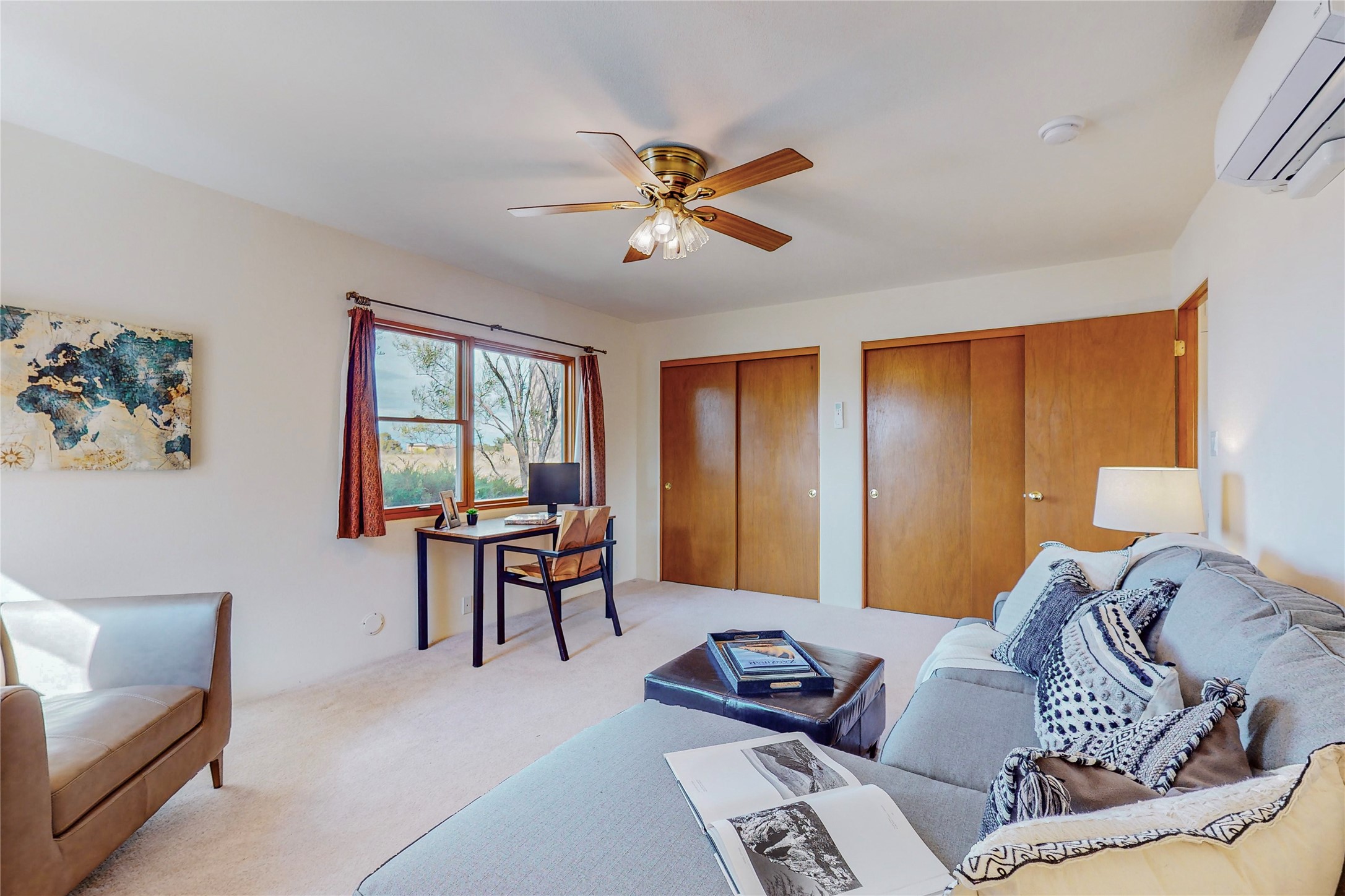 Located in the community of Eldorado, this Santa Fe-style single-story home includes an open floor plan, 3 bedrooms, 2 bathrooms, 1 car garage. The living room is graced with lofty ceilings and enhanced with vigas. A gas burning fireplace and the adjoining kitchen and dining area offers a practical space for both cooking and hosting gatherings. The primary suite includes dual closets, a roomy bathroom with dual sinks, a walk-in shower, and a soaking tub. The flexible floor plan offers versatility, with the option to use the second bedroom as an office, and the third bedroom as a media room or exercise room. With the back portal used for relaxing and entertaining, this serene location provides awe-inspiring 360 panoramic views, including stunning sunsets over the Jemez mountains to the west, views of the Sangre de Cristo Mountains to the east, and boundless vistas to the south, all the way to the Sandia Mountains in Albuquerque. The property boasts several enhancements: recently installed septic system, 3 mini splits for efficient heating and cooling, an upgraded boiler for radiant heat, a fresh-water tank, and a new refrigerator. This charming Eldorado property offers a lifestyle that seamlessly combines modern comforts with the natural beauty and tranquility of the community. With versatile living spaces, stunning views, and thoughtful amenities, it's a place to call home.