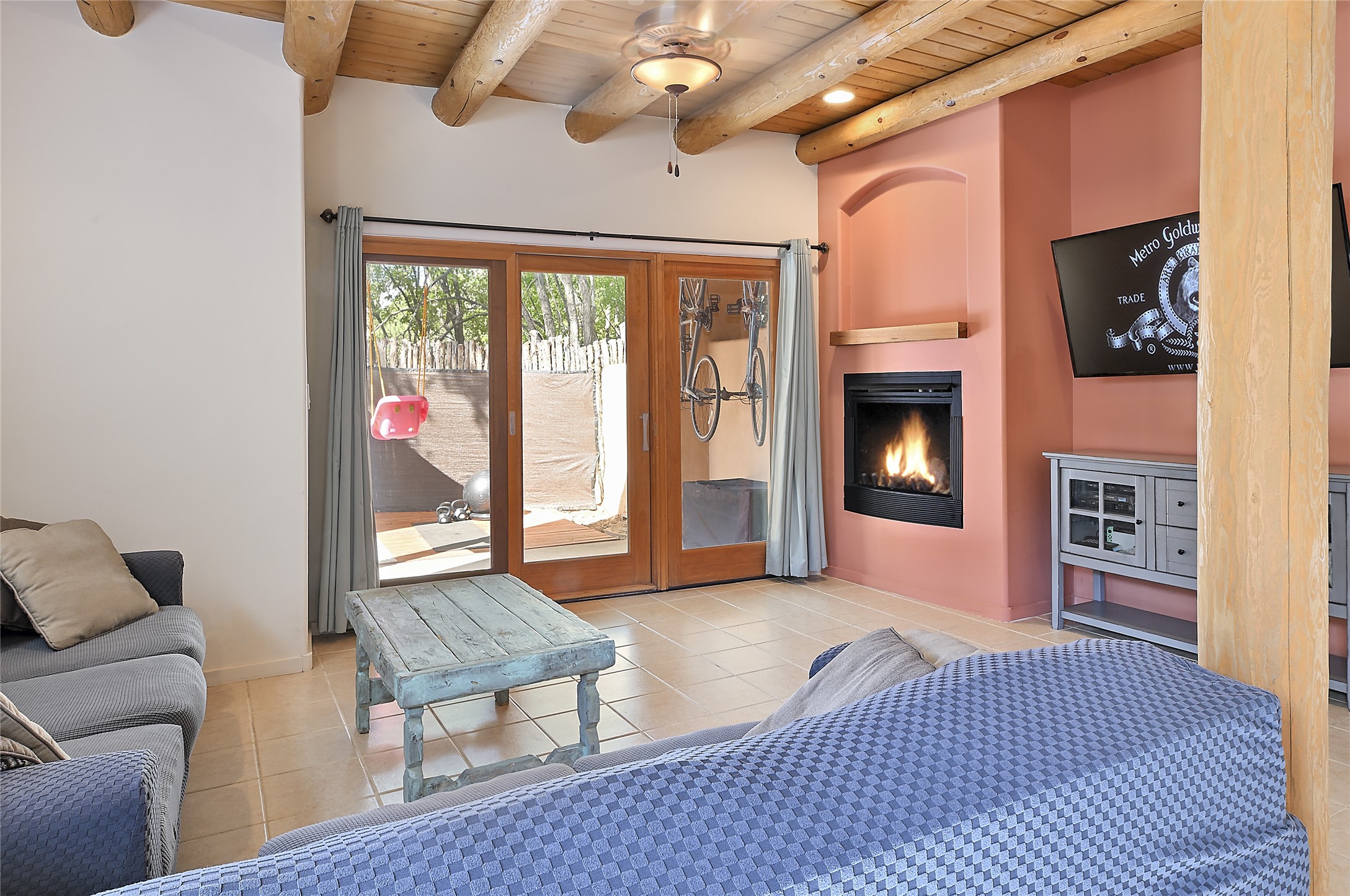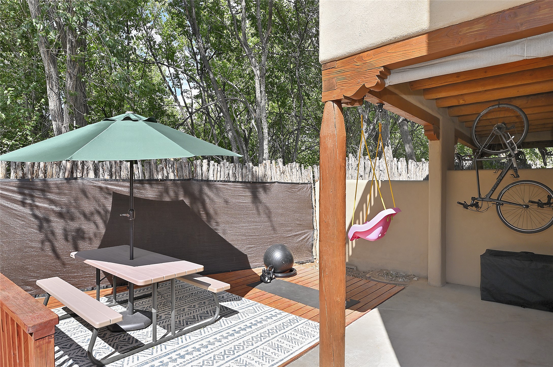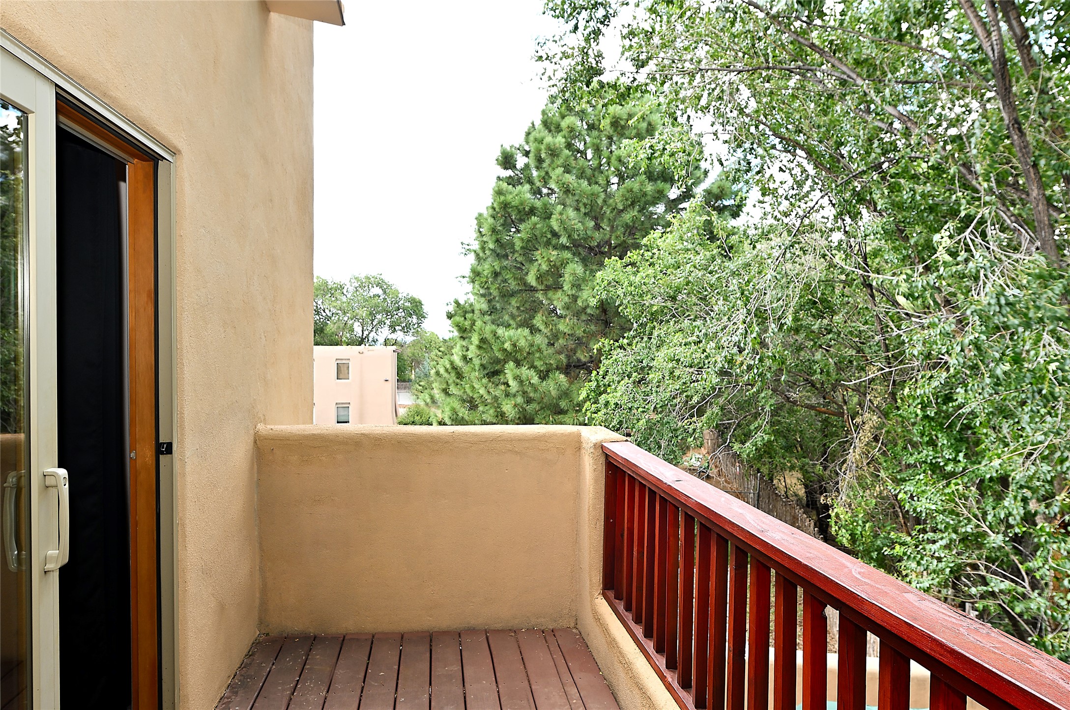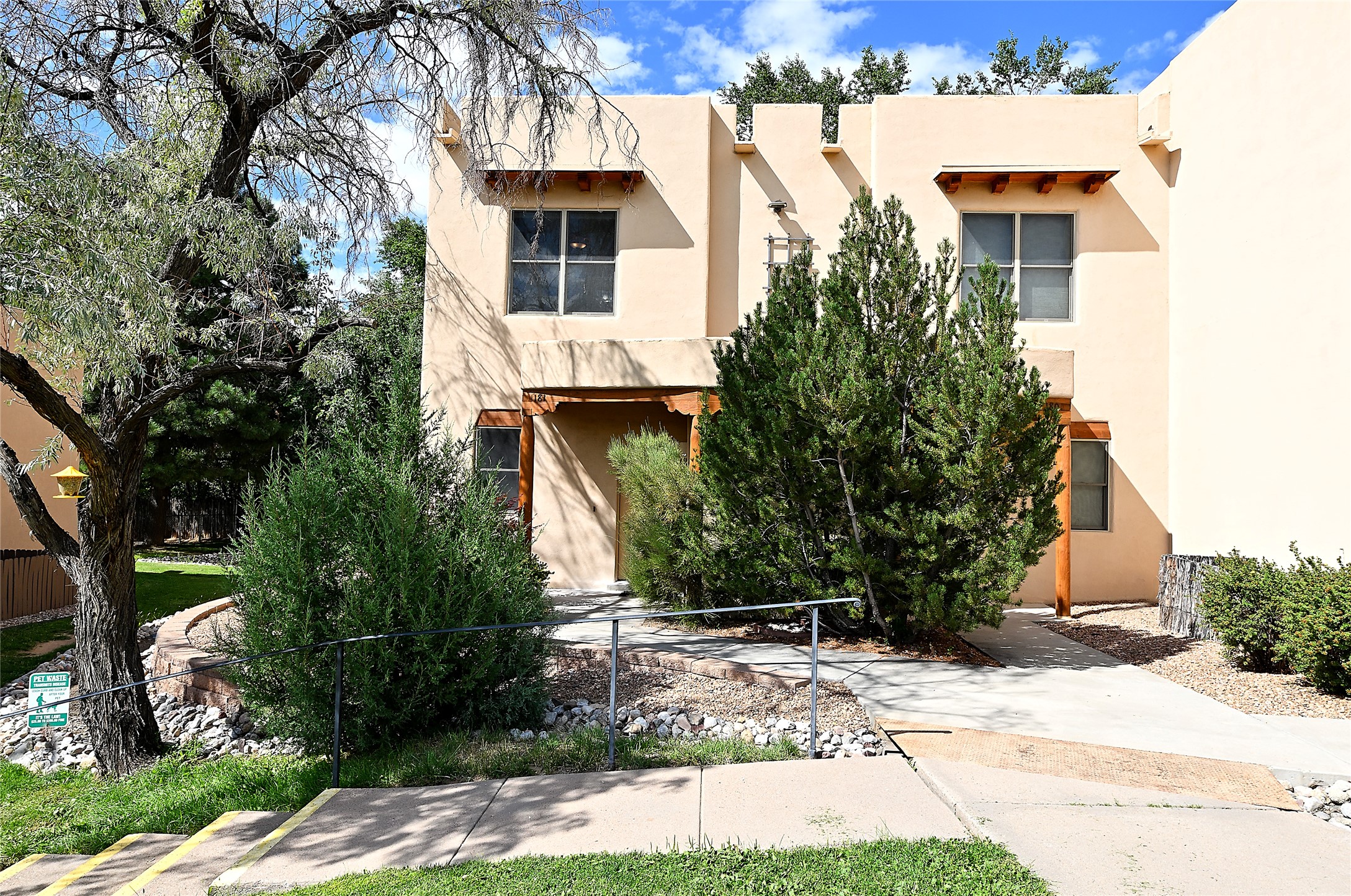 2 bedroom 2.5 bath end unit, 2-story condo with grassy areas in front and back and a shady side yard. Open concept living and dining with fireplace, vigas and beams, and access to an outdoor patio. Kitchen is appointed with granite countertops, Bosch/Whirlpool appliances, and double sink. Primary suite features a deck with Sangre de Cristo views and an ensuite bath with jetted tub. Second bedroom with ensuite bath offers flex space as a studio/office. Central air and heat. Designated parking space. The San Mateo Condo Community has a gated entrance and 11 acres of landscaped property with mature trees. Community facilities include a clubhouse, gym, and pool. Centrally located in the heart of Santa Fe close to shopping, dining, transportation, and many cultural amenities.