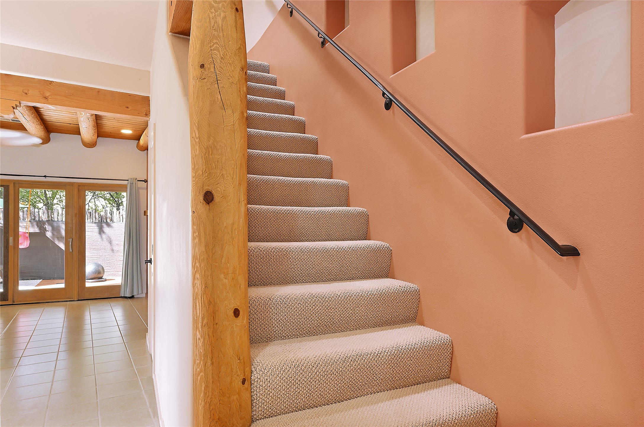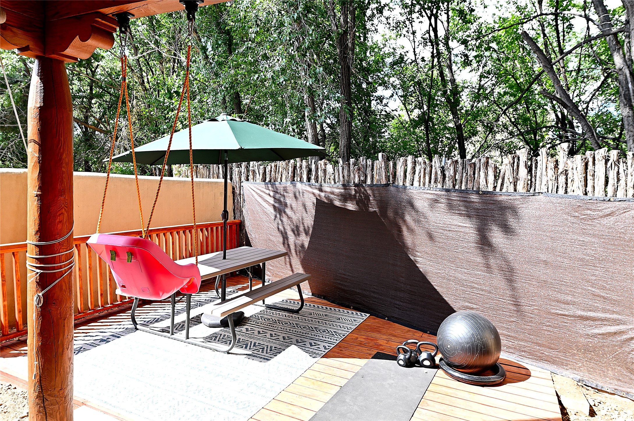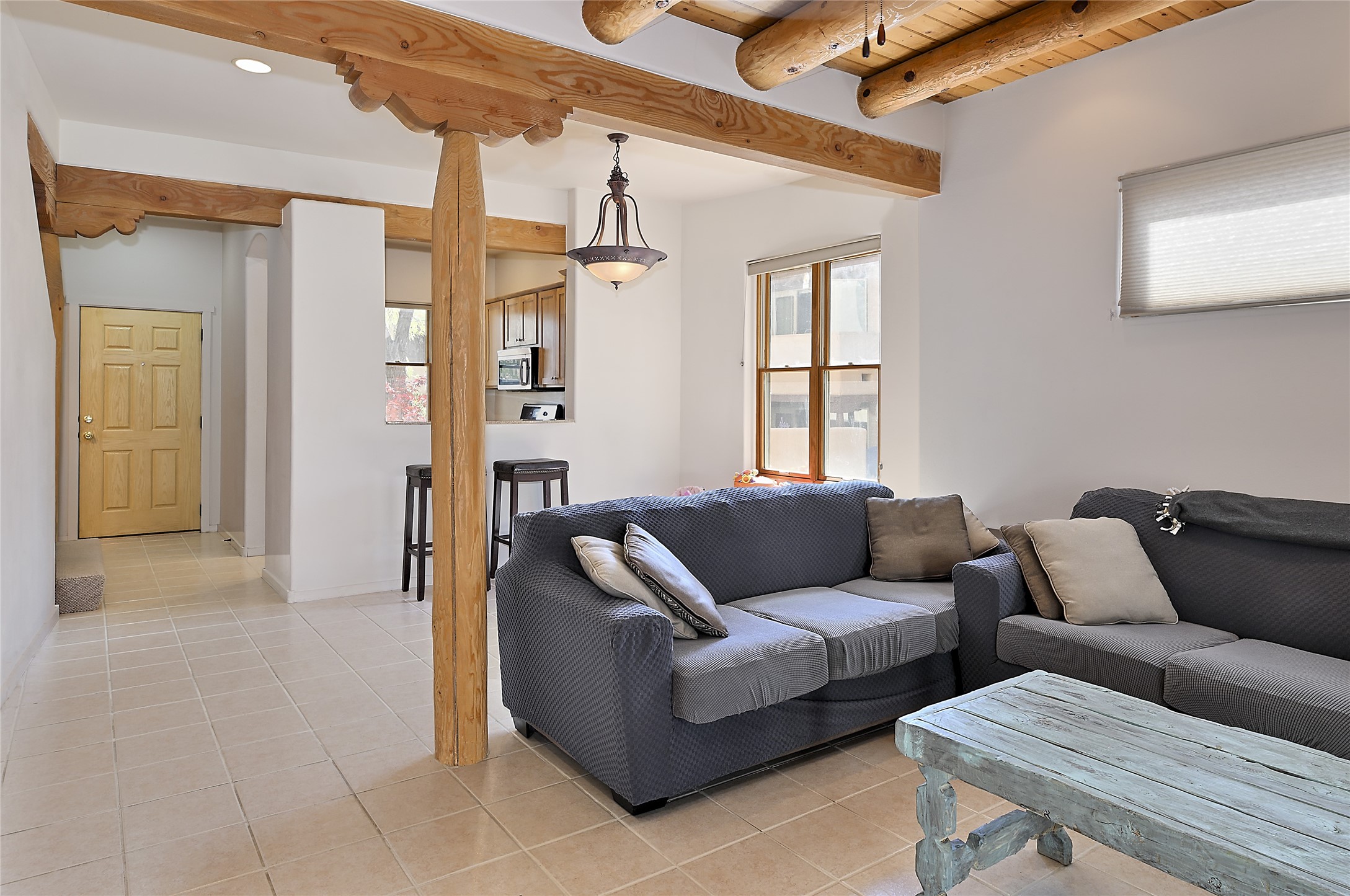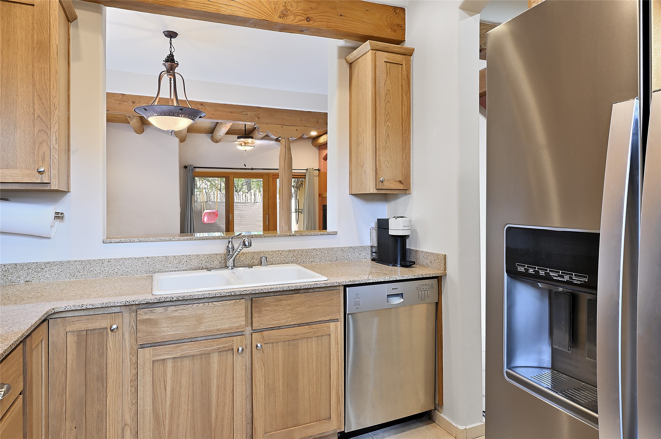 2 bedroom 2.5 bath end unit, 2-story condo with grassy areas in front and back and a shady side yard. Open concept living and dining with fireplace, vigas and beams, and access to an outdoor patio. Kitchen is appointed with granite countertops, Bosch/Whirlpool appliances, and double sink. Primary suite features a deck with Sangre de Cristo views and an ensuite bath with jetted tub. Second bedroom with ensuite bath offers flex space as a studio/office. Central air and heat. Designated parking space. The San Mateo Condo Community has a gated entrance and 11 acres of landscaped property with mature trees. Community facilities include a clubhouse, gym, and pool. Centrally located in the heart of Santa Fe close to shopping, dining, transportation, and many cultural amenities.