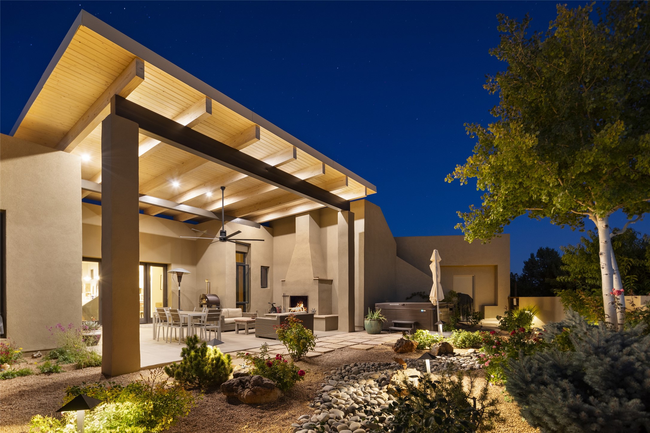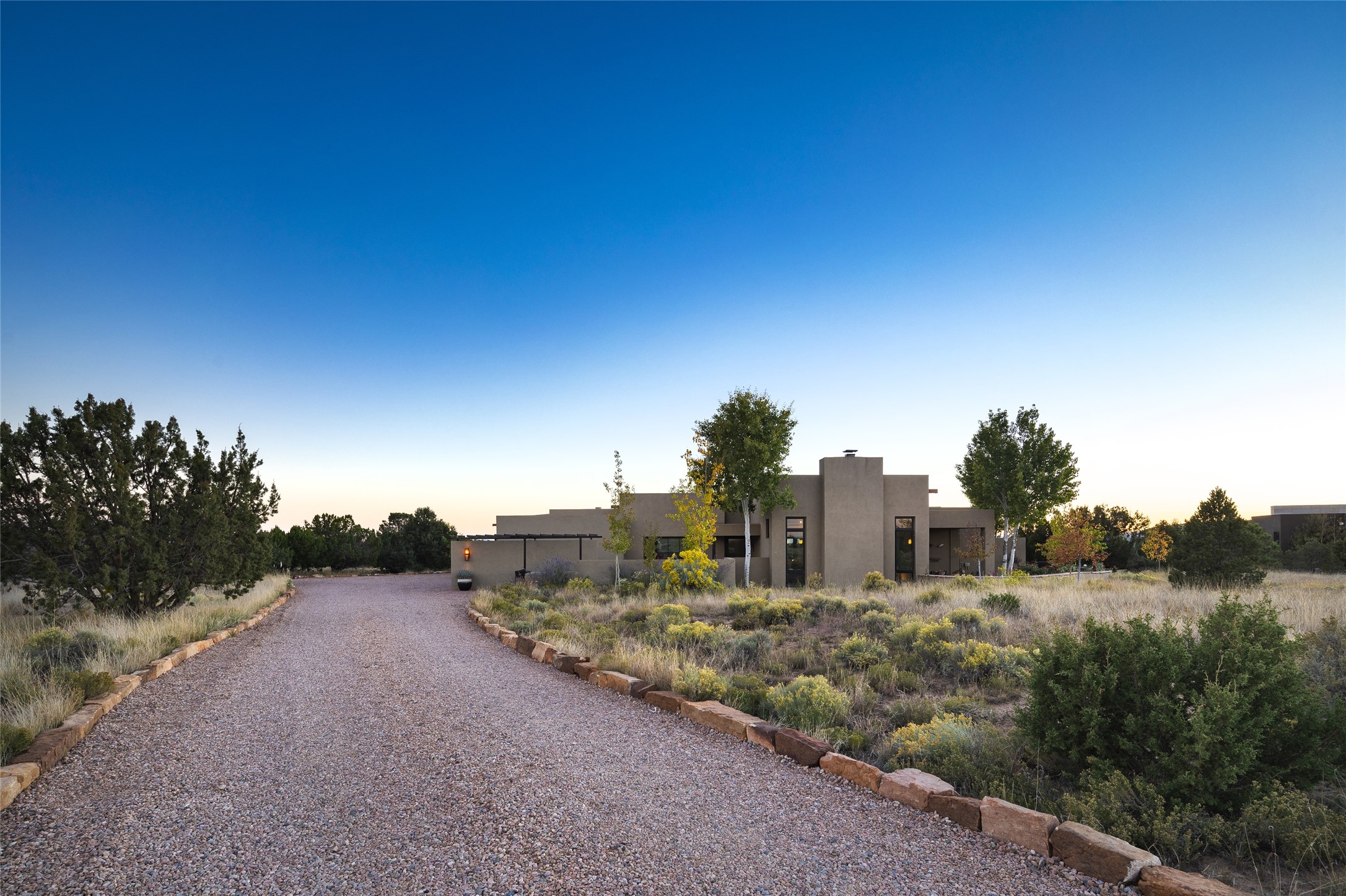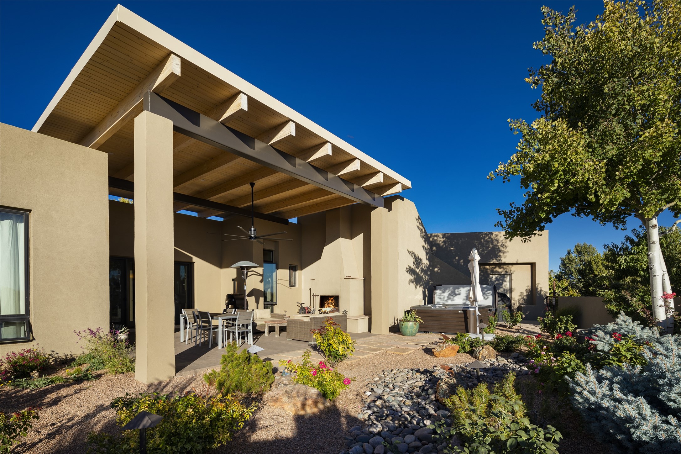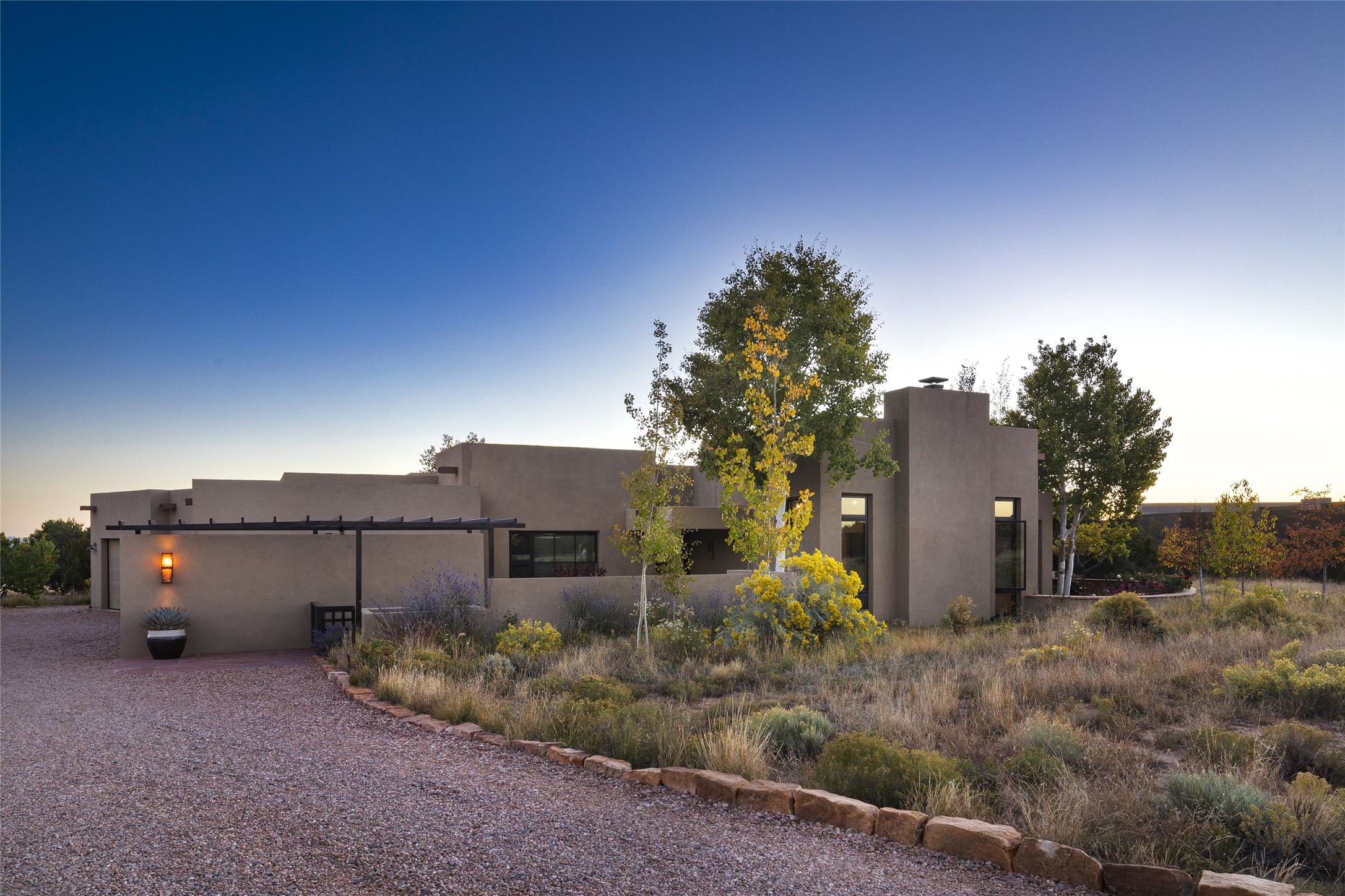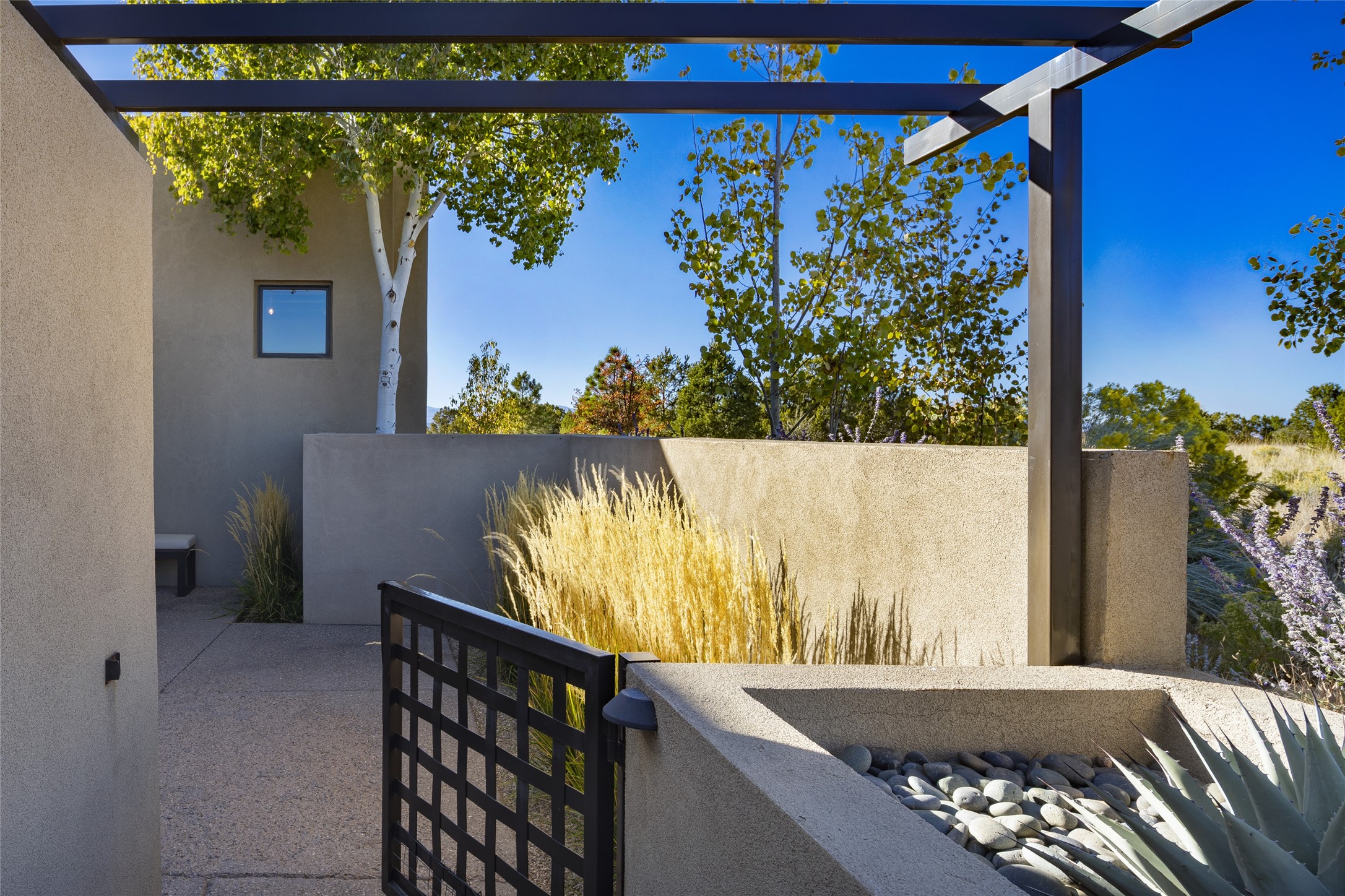 Sophisticated contemporary architecture, by renowned builder, Seth Anderson blended with luxury finishes, a resort-like backyard, and spectacular Mountain views are celebrated at this exciting Las Campanas residence. Designed to enjoy the ultimate Santa Fe lifestyle, this one of a kind residence, located within the master planned community Las Campanas, impresses with exceptional design which seamlessly incorporates the ultimate indoor and outdoor living experience with a newly added elevated portal and fireplace, a modern above ground spa, a substantial roof deck with 360-degree views, vibrant surround landscape, and three separate covered entertainment areas. This exquisite home offers excellent separation of space, with a private owner's suite complete portal access, a spa-like bath with a Victoria Albert soaking tub, a steam shower with glass accents which frame the aspen tree views, custom cabinets, and a spacious wrap around walk-in closet. Flexible design features include two additional bedrooms which share a full bath, plus a newly added modern office or ideal art studio with front courtyard access. The state-of-the-art chef's kitchen delights with Subzero and Wolf appliances, a large island with expansive seating, and a walk-in pantry. Located directly off the kitchen is the ultimate great room for entertaining, which was designed to integrate the surrounding natural landscape and mountain views, complete with a grand gas fireplace, Jemez and Sangre de Cristo Mountain views, and a formal dining area. The outdoor living experience is enhanced by deep portals with mountain views, surround aspen trees, rose gardens, and newly installed photovoltaic landscape lighting. Exceptional features include a spacious heated 3-car garage, a tranquil gated front entrance courtyard, exceptional natural light throughout, radiant in-floor heating with an updated boiler, and custom steel accents which add the highest level of contemporary design.
