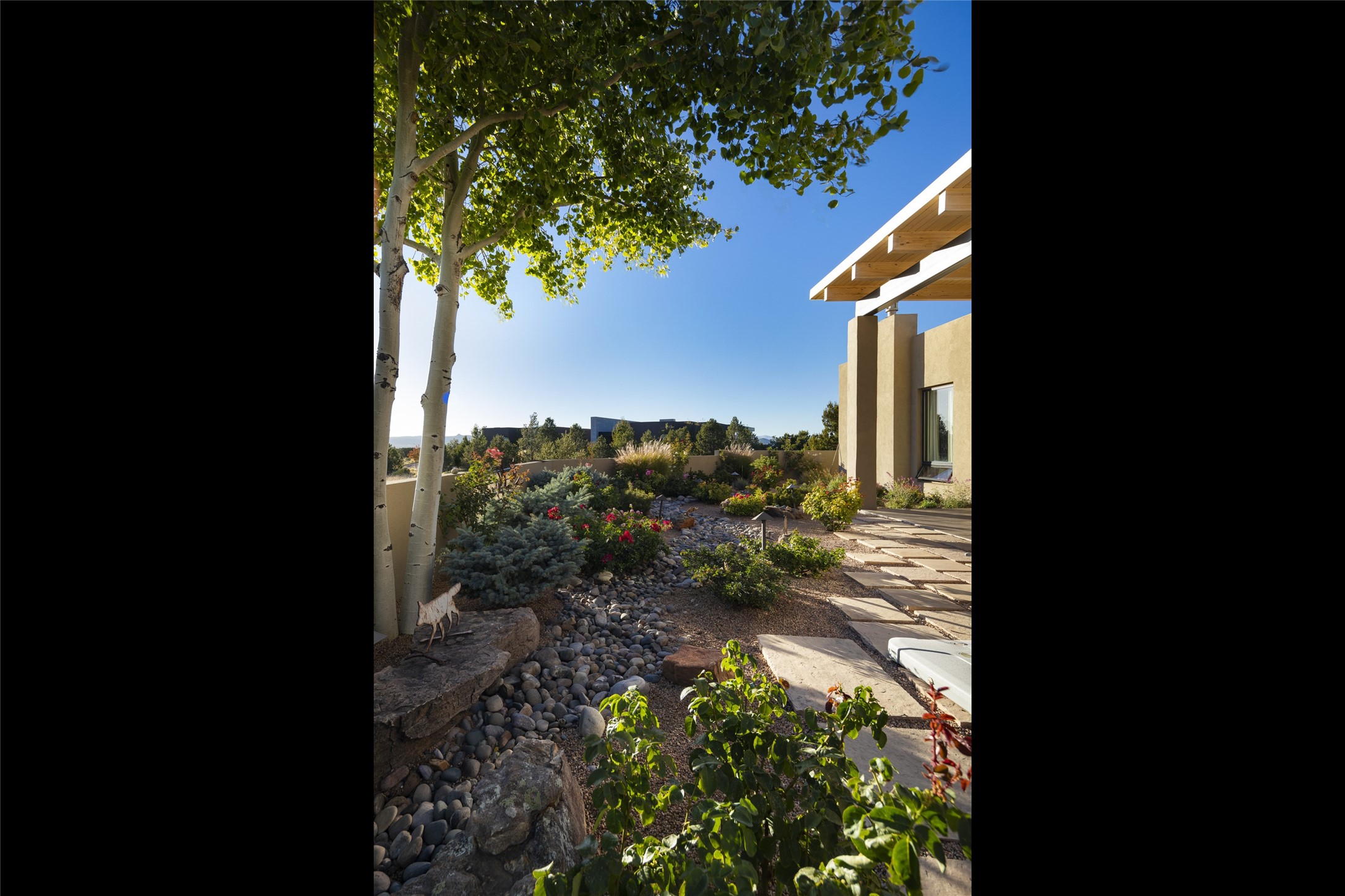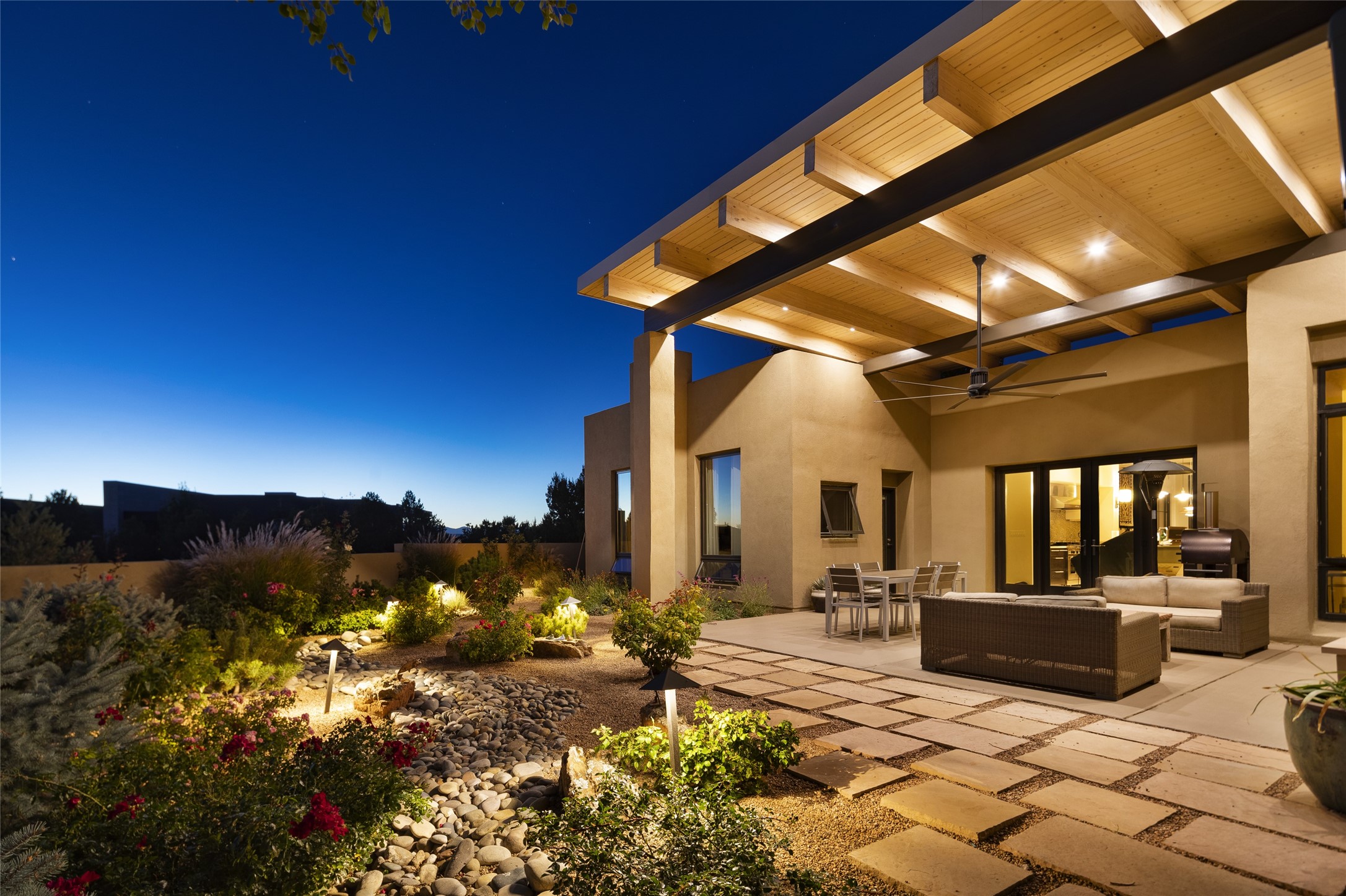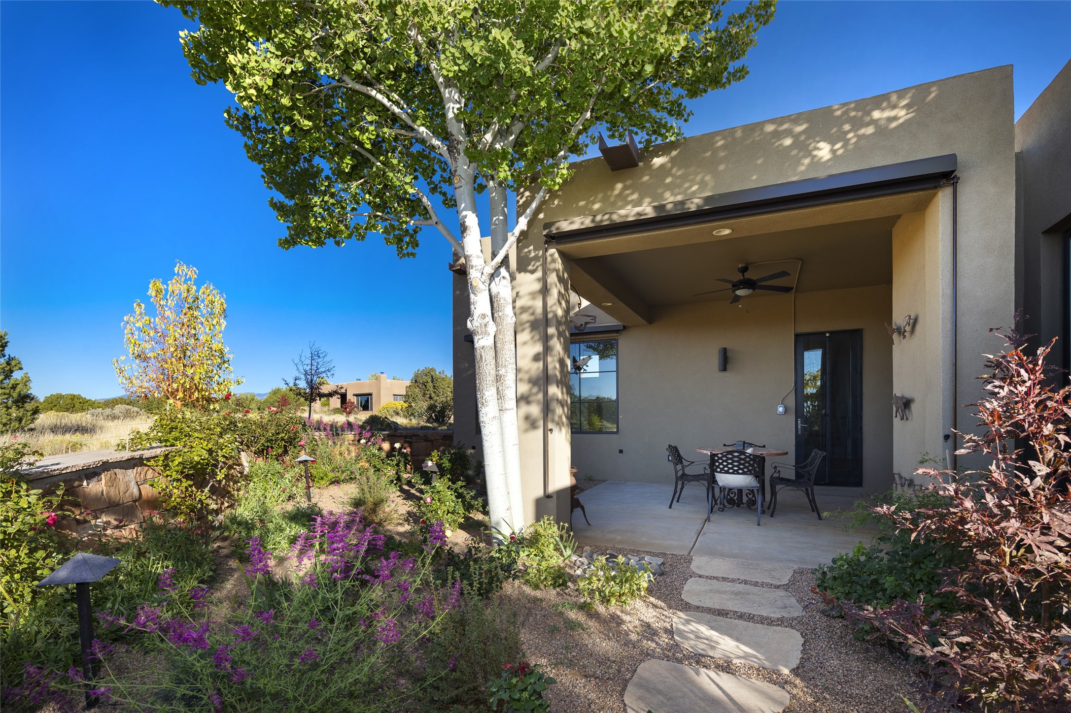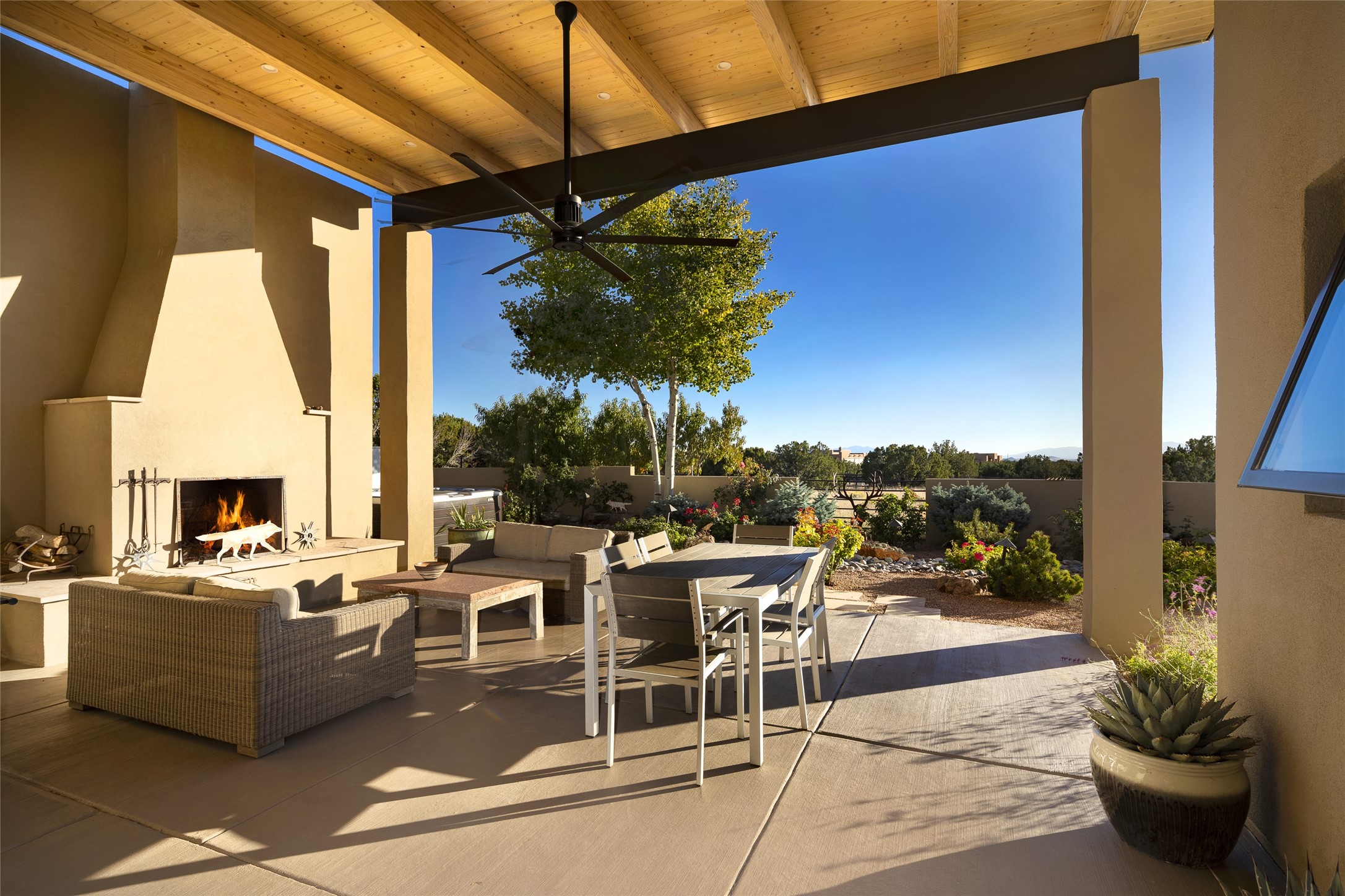 Sophisticated contemporary architecture, by renowned builder, Seth Anderson blended with luxury finishes, a resort-like backyard, and spectacular Mountain views are celebrated at this exciting Las Campanas residence. Designed to enjoy the ultimate Santa Fe lifestyle, this one of a kind residence, located within the master planned community Las Campanas, impresses with exceptional design which seamlessly incorporates the ultimate indoor and outdoor living experience with a newly added elevated portal and fireplace, a modern above ground spa, a substantial roof deck with 360-degree views, vibrant surround landscape, and three separate covered entertainment areas. This exquisite home offers excellent separation of space, with a private owner's suite complete portal access, a spa-like bath with a Victoria Albert soaking tub, a steam shower with glass accents which frame the aspen tree views, custom cabinets, and a spacious wrap around walk-in closet. Flexible design features include two additional bedrooms which share a full bath, plus a newly added modern office or ideal art studio with front courtyard access. The state-of-the-art chef's kitchen delights with Subzero and Wolf appliances, a large island with expansive seating, and a walk-in pantry. Located directly off the kitchen is the ultimate great room for entertaining, which was designed to integrate the surrounding natural landscape and mountain views, complete with a grand gas fireplace, Jemez and Sangre de Cristo Mountain views, and a formal dining area. The outdoor living experience is enhanced by deep portals with mountain views, surround aspen trees, rose gardens, and newly installed photovoltaic landscape lighting. Exceptional features include a spacious heated 3-car garage, a tranquil gated front entrance courtyard, exceptional natural light throughout, radiant in-floor heating with an updated boiler, and custom steel accents which add the highest level of contemporary design.