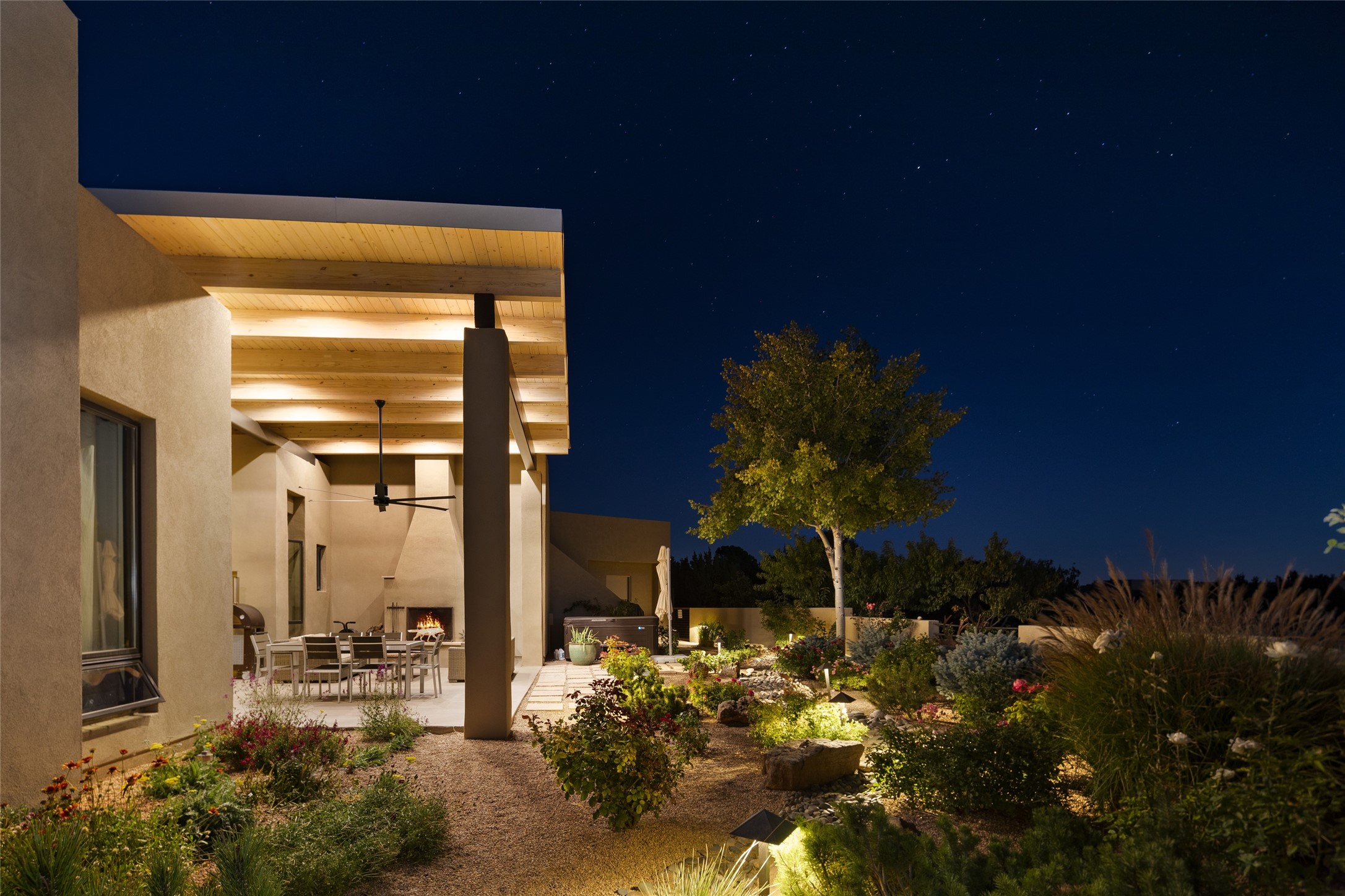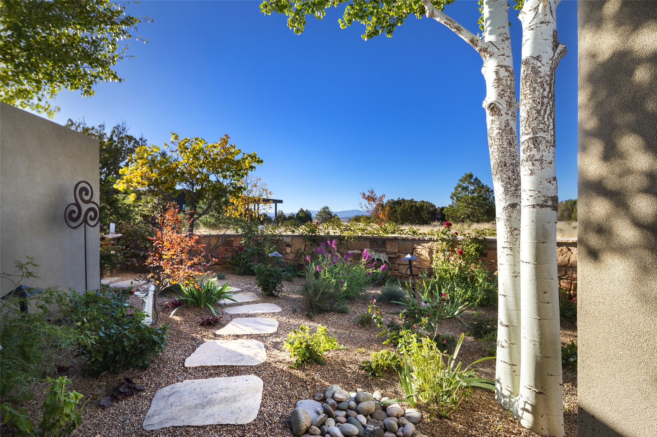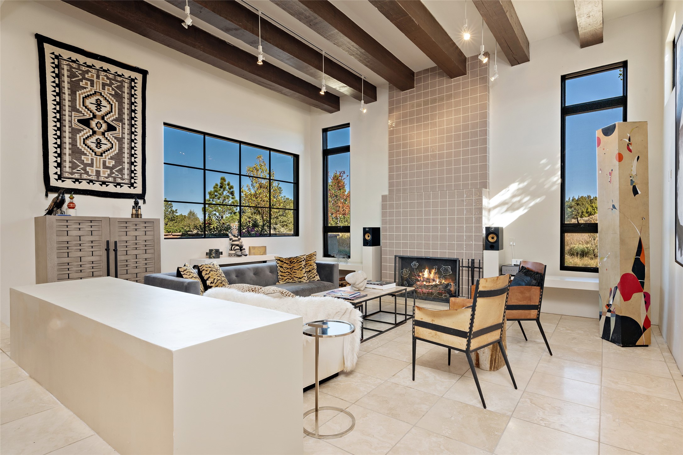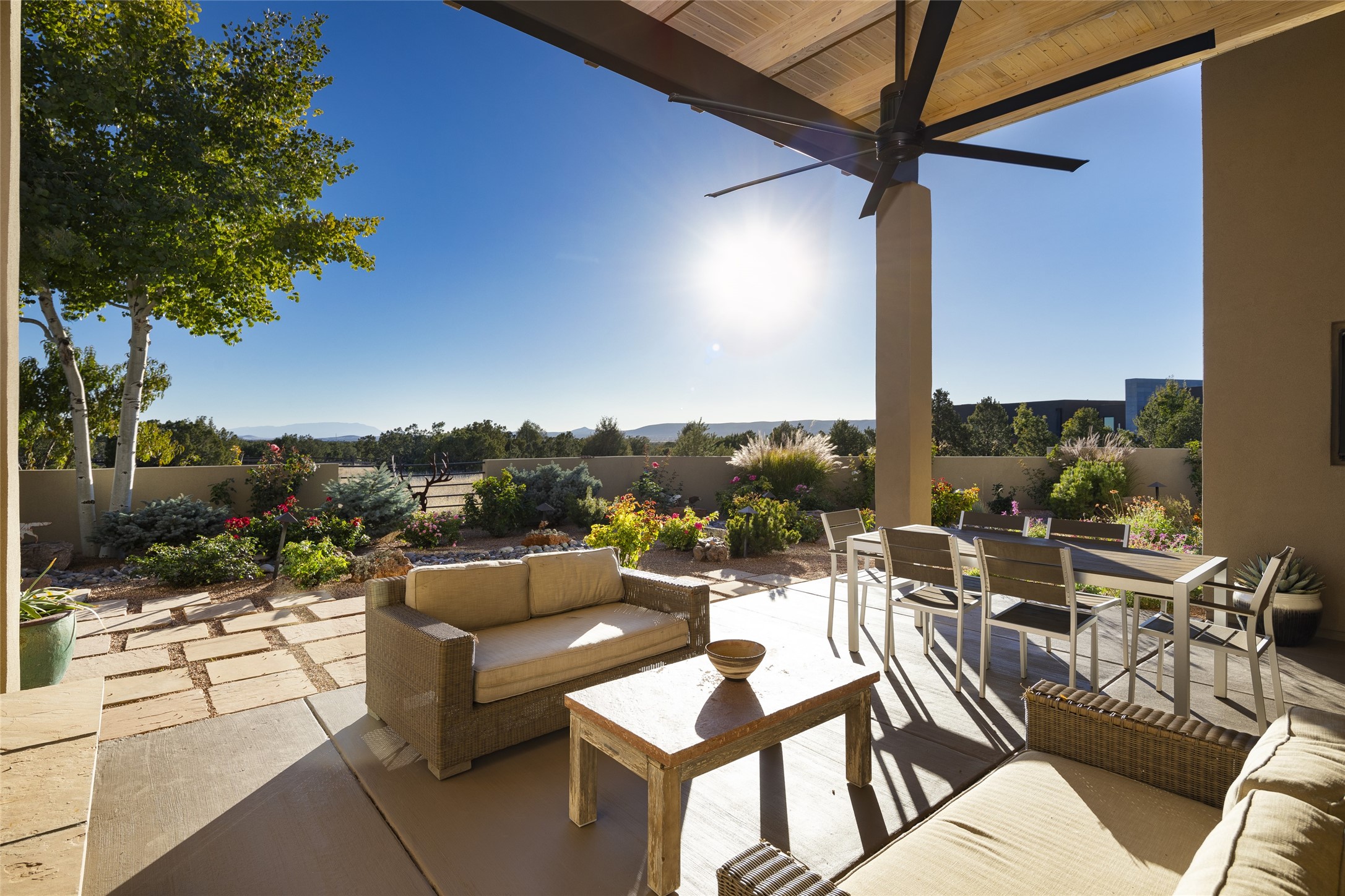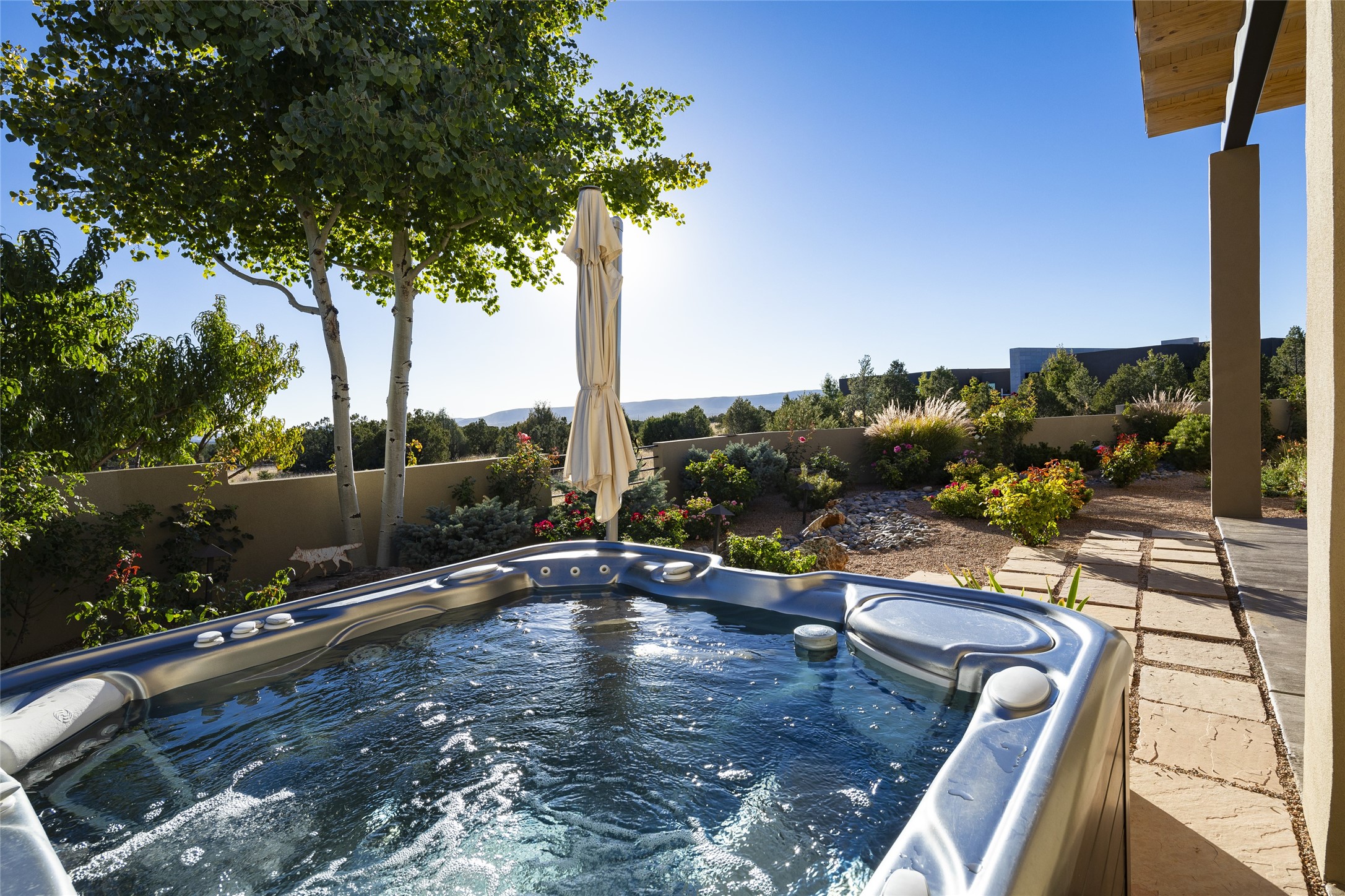 Sophisticated contemporary architecture, by renowned builder, Seth Anderson blended with luxury finishes, a resort-like backyard, and spectacular Mountain views are celebrated at this exciting Las Campanas residence. Designed to enjoy the ultimate Santa Fe lifestyle, this one of a kind residence, located within the master planned community Las Campanas, impresses with exceptional design which seamlessly incorporates the ultimate indoor and outdoor living experience with a newly added elevated portal and fireplace, a modern above ground spa, a substantial roof deck with 360-degree views, vibrant surround landscape, and three separate covered entertainment areas. This exquisite home offers excellent separation of space, with a private owner's suite complete portal access, a spa-like bath with a Victoria Albert soaking tub, a steam shower with glass accents which frame the aspen tree views, custom cabinets, and a spacious wrap around walk-in closet. Flexible design features include two additional bedrooms which share a full bath, plus a newly added modern office or ideal art studio with front courtyard access. The state-of-the-art chef's kitchen delights with Subzero and Wolf appliances, a large island with expansive seating, and a walk-in pantry. Located directly off the kitchen is the ultimate great room for entertaining, which was designed to integrate the surrounding natural landscape and mountain views, complete with a grand gas fireplace, Jemez and Sangre de Cristo Mountain views, and a formal dining area. The outdoor living experience is enhanced by deep portals with mountain views, surround aspen trees, rose gardens, and newly installed photovoltaic landscape lighting. Exceptional features include a spacious heated 3-car garage, a tranquil gated front entrance courtyard, exceptional natural light throughout, radiant in-floor heating with an updated boiler, and custom steel accents which add the highest level of contemporary design.