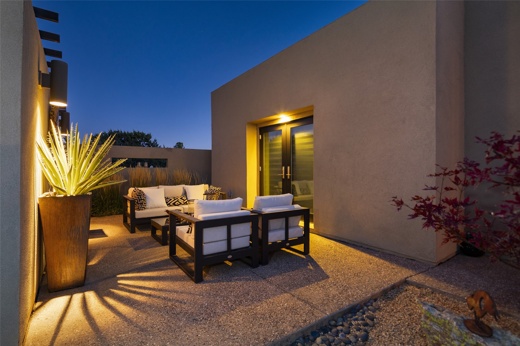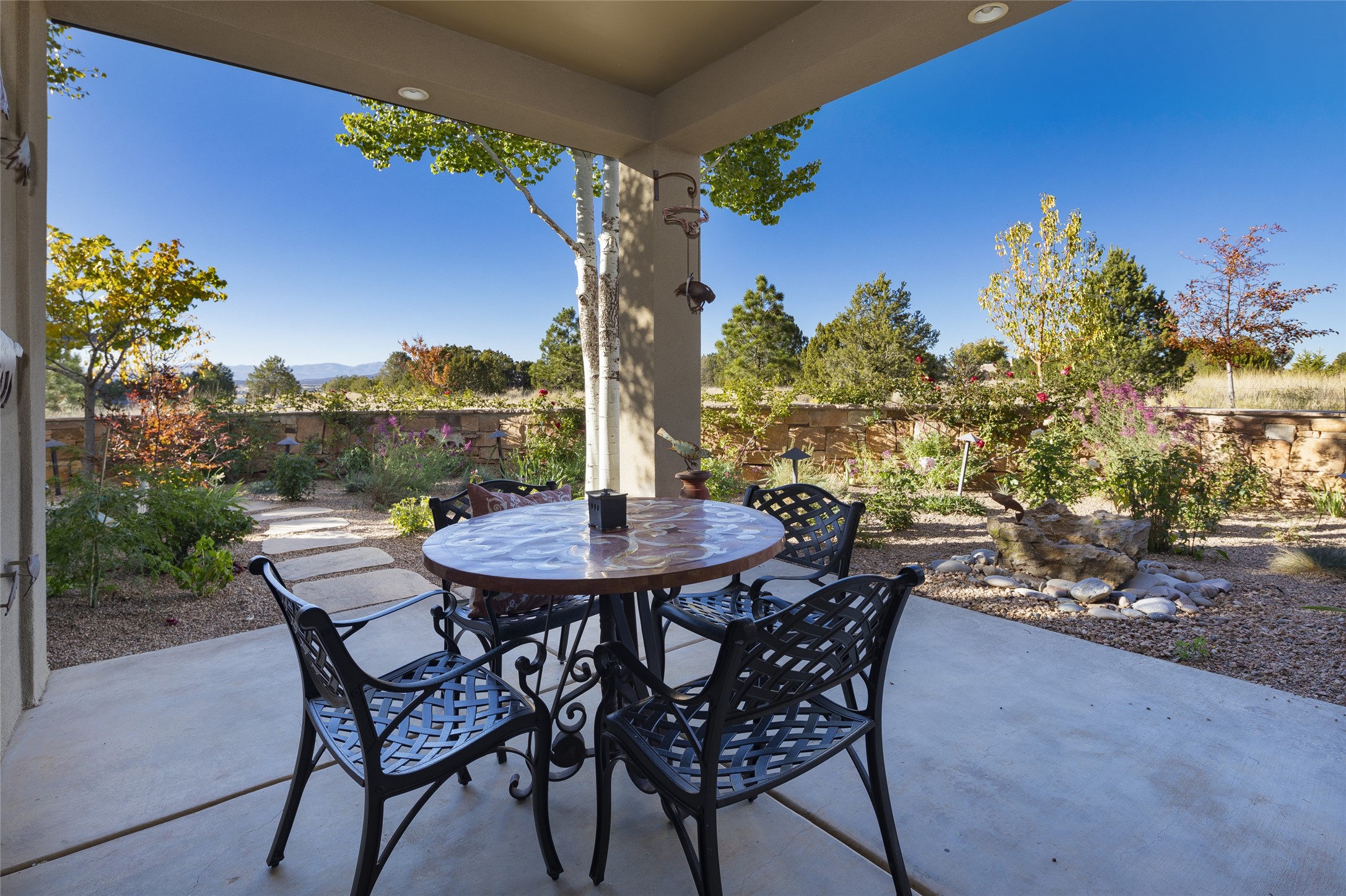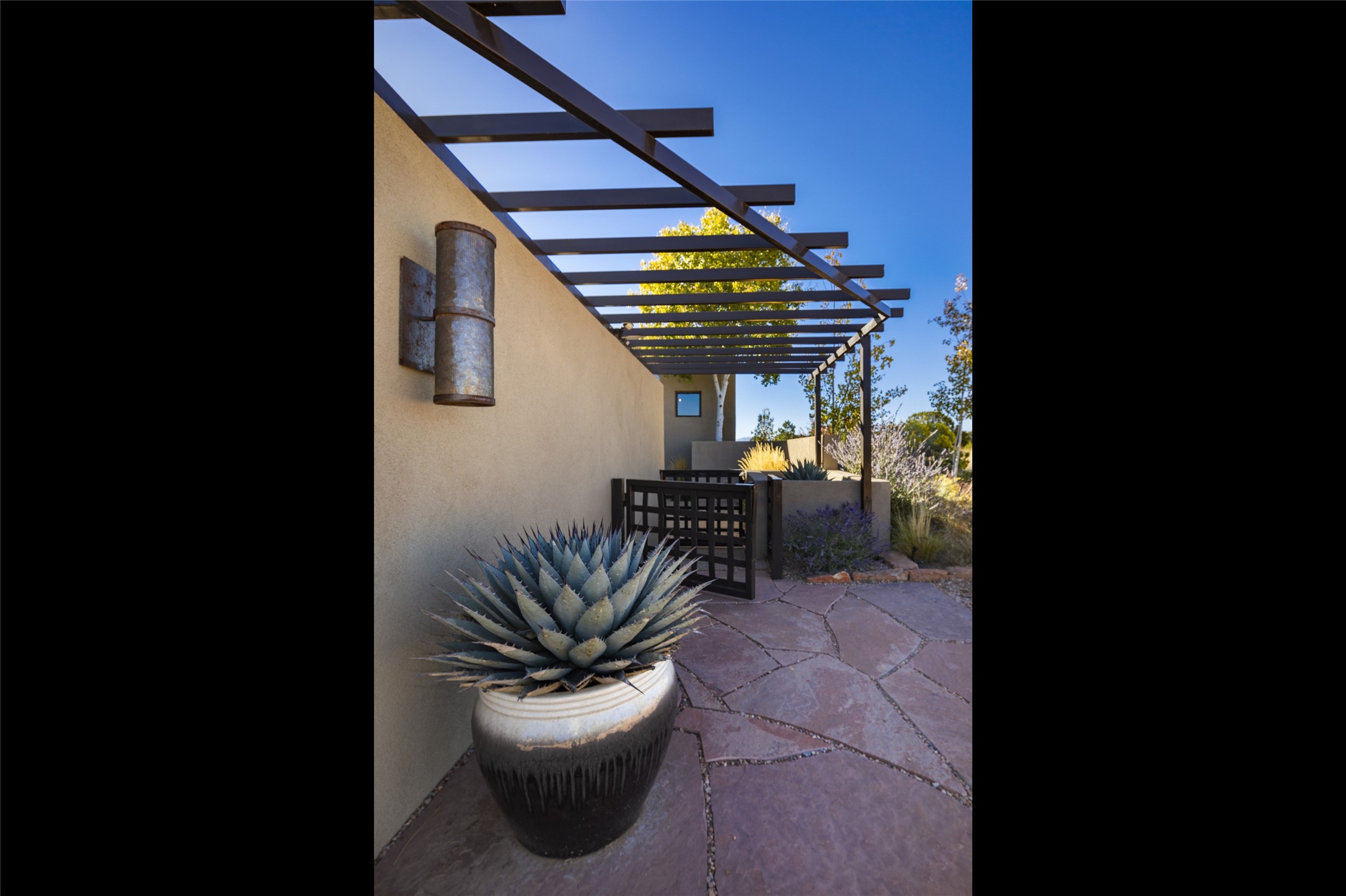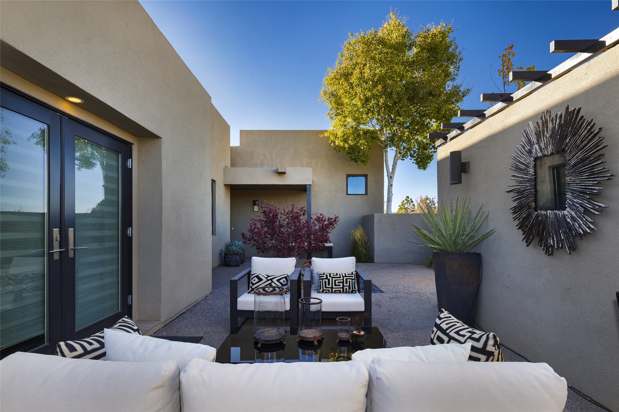 Sophisticated contemporary architecture, by renowned builder, Seth Anderson blended with luxury finishes, a resort-like backyard, and spectacular Mountain views are celebrated at this exciting Las Campanas residence. Designed to enjoy the ultimate Santa Fe lifestyle, this one of a kind residence, located within the master planned community Las Campanas, impresses with exceptional design which seamlessly incorporates the ultimate indoor and outdoor living experience with a newly added elevated portal and fireplace, a modern above ground spa, a substantial roof deck with 360-degree views, vibrant surround landscape, and three separate covered entertainment areas. This exquisite home offers excellent separation of space, with a private owner's suite complete portal access, a spa-like bath with a Victoria Albert soaking tub, a steam shower with glass accents which frame the aspen tree views, custom cabinets, and a spacious wrap around walk-in closet. Flexible design features include two additional bedrooms which share a full bath, plus a newly added modern office or ideal art studio with front courtyard access. The state-of-the-art chef's kitchen delights with Subzero and Wolf appliances, a large island with expansive seating, and a walk-in pantry. Located directly off the kitchen is the ultimate great room for entertaining, which was designed to integrate the surrounding natural landscape and mountain views, complete with a grand gas fireplace, Jemez and Sangre de Cristo Mountain views, and a formal dining area. The outdoor living experience is enhanced by deep portals with mountain views, surround aspen trees, rose gardens, and newly installed photovoltaic landscape lighting. Exceptional features include a spacious heated 3-car garage, a tranquil gated front entrance courtyard, exceptional natural light throughout, radiant in-floor heating with an updated boiler, and custom steel accents which add the highest level of contemporary design.