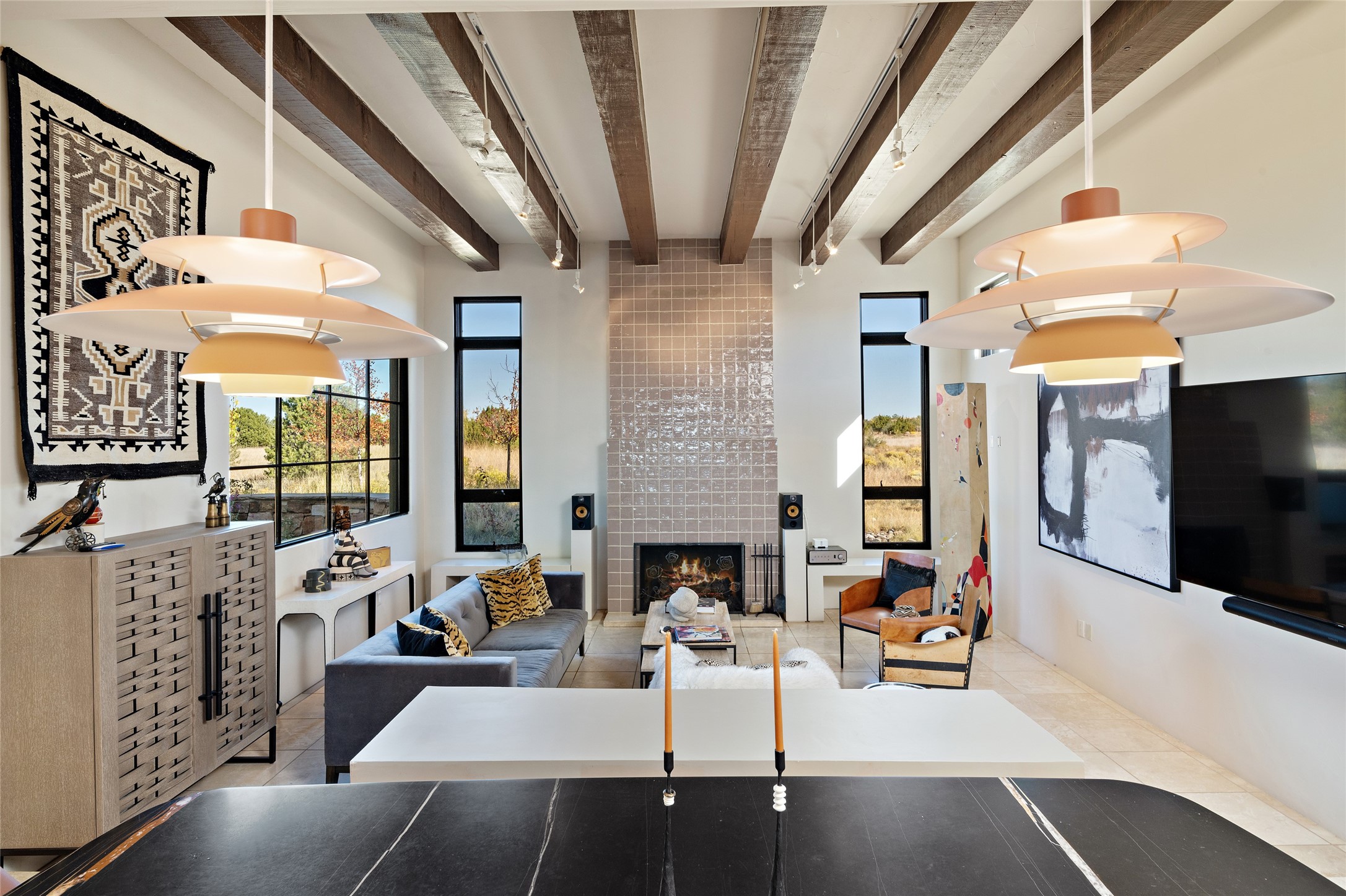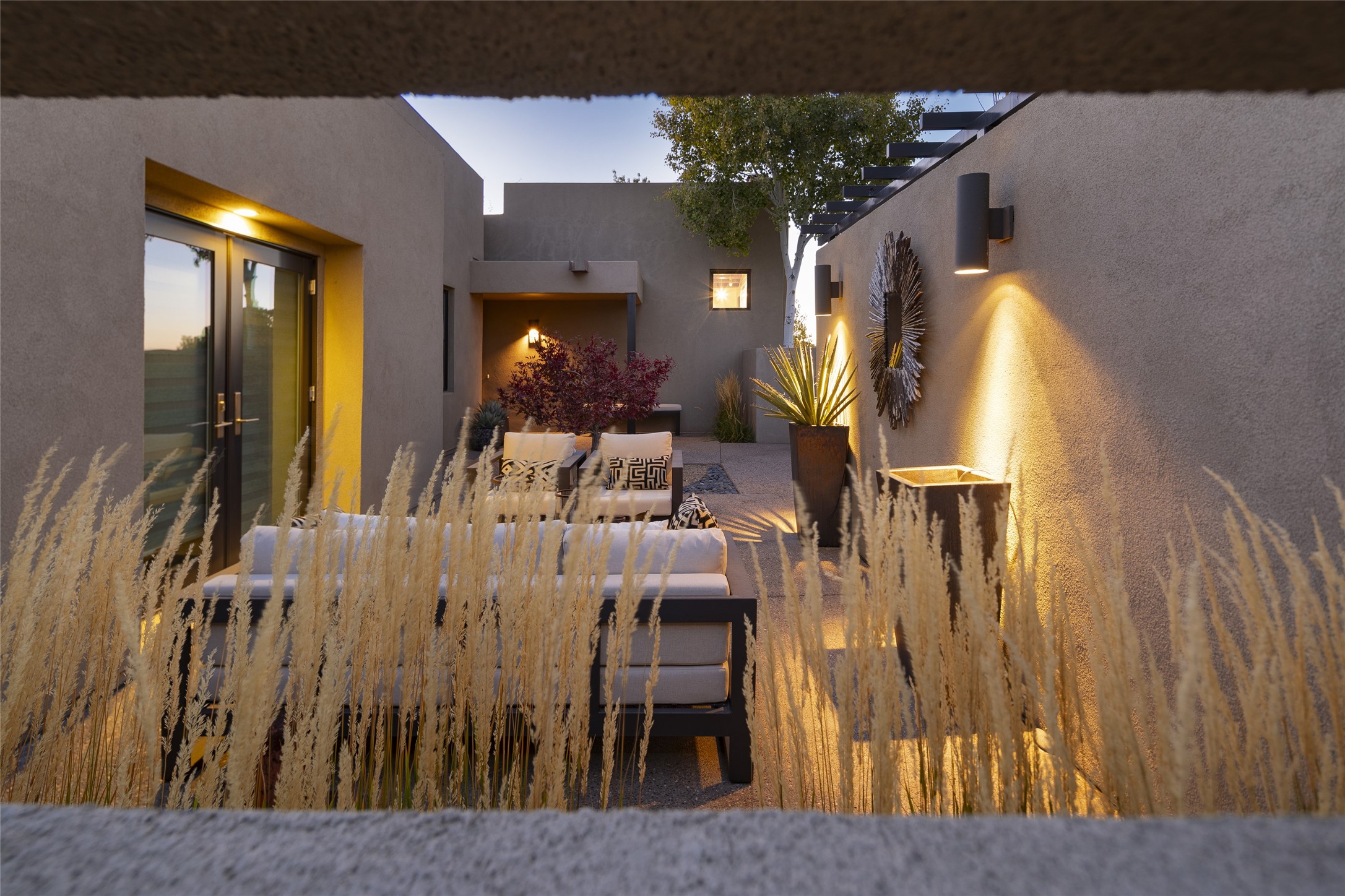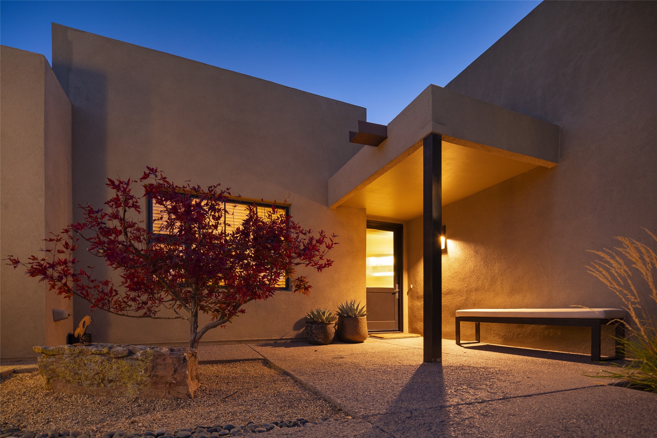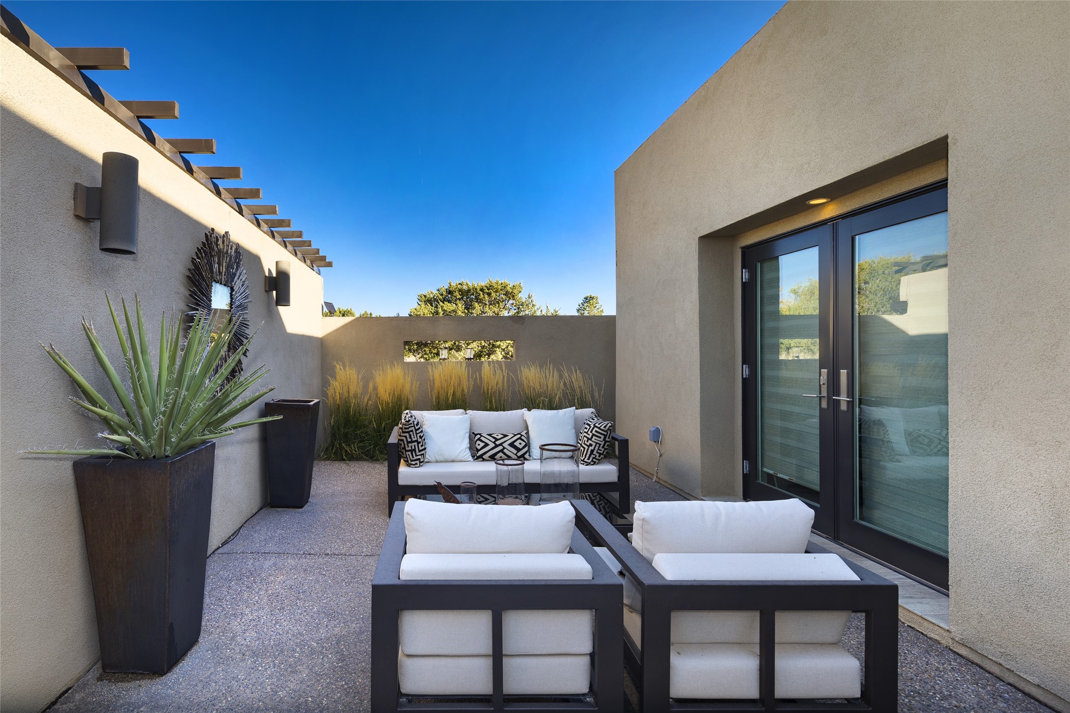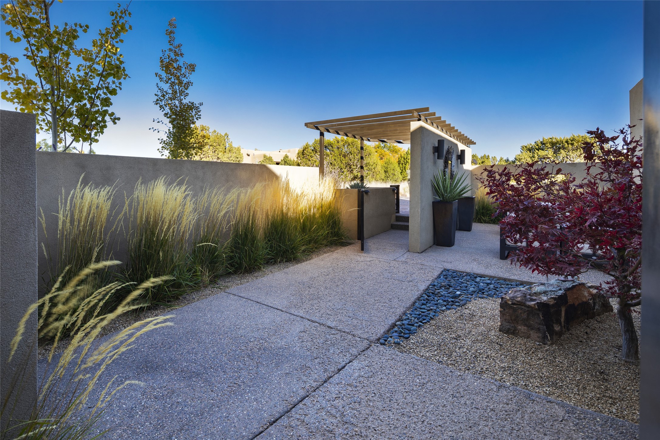 Sophisticated contemporary architecture, by renowned builder, Seth Anderson blended with luxury finishes, a resort-like backyard, and spectacular Mountain views are celebrated at this exciting Las Campanas residence. Designed to enjoy the ultimate Santa Fe lifestyle, this one of a kind residence, located within the master planned community Las Campanas, impresses with exceptional design which seamlessly incorporates the ultimate indoor and outdoor living experience with a newly added elevated portal and fireplace, a modern above ground spa, a substantial roof deck with 360-degree views, vibrant surround landscape, and three separate covered entertainment areas. This exquisite home offers excellent separation of space, with a private owner's suite complete portal access, a spa-like bath with a Victoria Albert soaking tub, a steam shower with glass accents which frame the aspen tree views, custom cabinets, and a spacious wrap around walk-in closet. Flexible design features include two additional bedrooms which share a full bath, plus a newly added modern office or ideal art studio with front courtyard access. The state-of-the-art chef's kitchen delights with Subzero and Wolf appliances, a large island with expansive seating, and a walk-in pantry. Located directly off the kitchen is the ultimate great room for entertaining, which was designed to integrate the surrounding natural landscape and mountain views, complete with a grand gas fireplace, Jemez and Sangre de Cristo Mountain views, and a formal dining area. The outdoor living experience is enhanced by deep portals with mountain views, surround aspen trees, rose gardens, and newly installed photovoltaic landscape lighting. Exceptional features include a spacious heated 3-car garage, a tranquil gated front entrance courtyard, exceptional natural light throughout, radiant in-floor heating with an updated boiler, and custom steel accents which add the highest level of contemporary design.