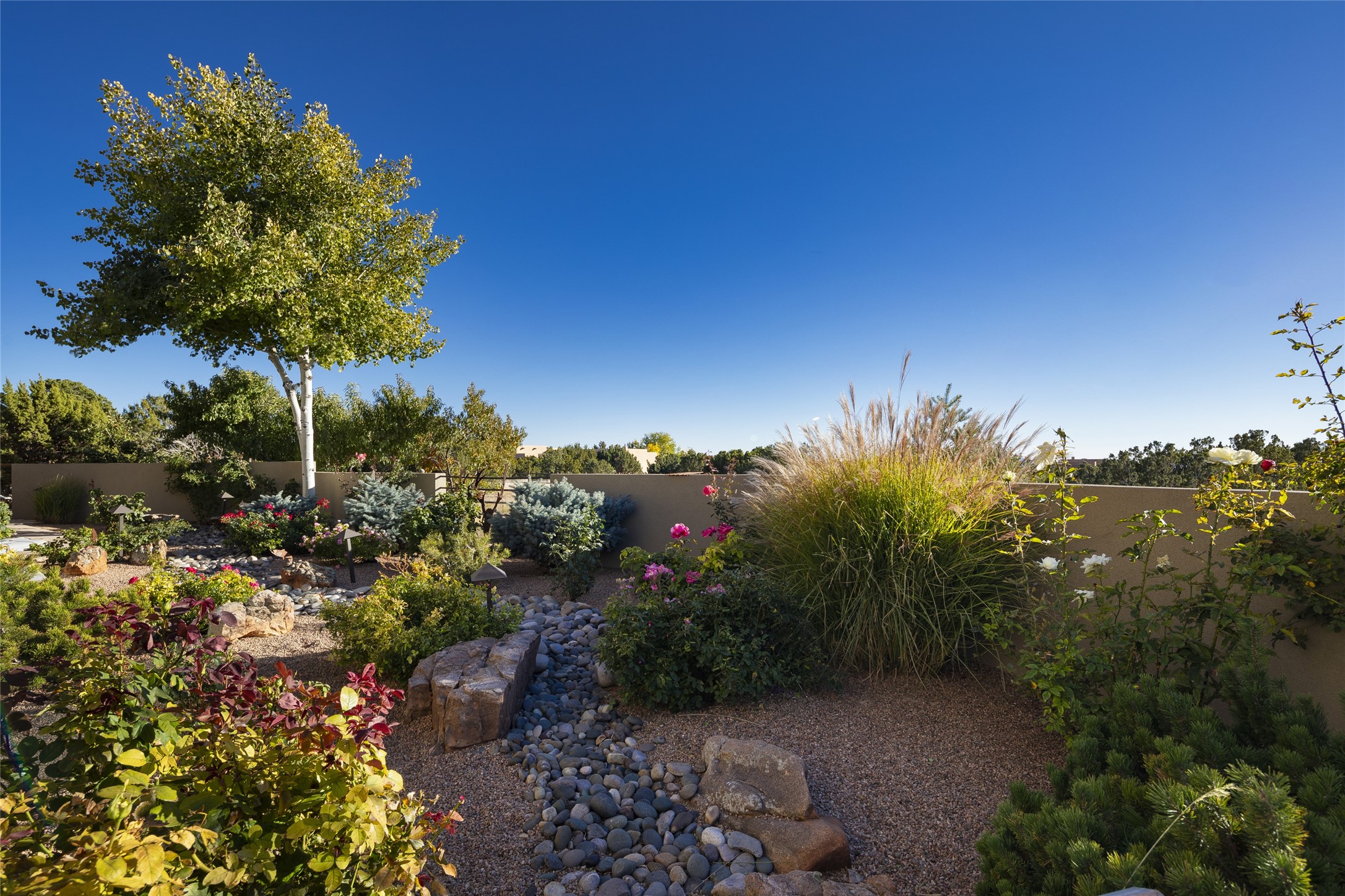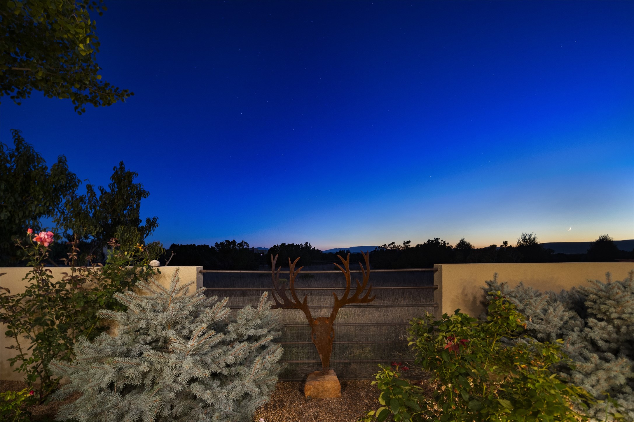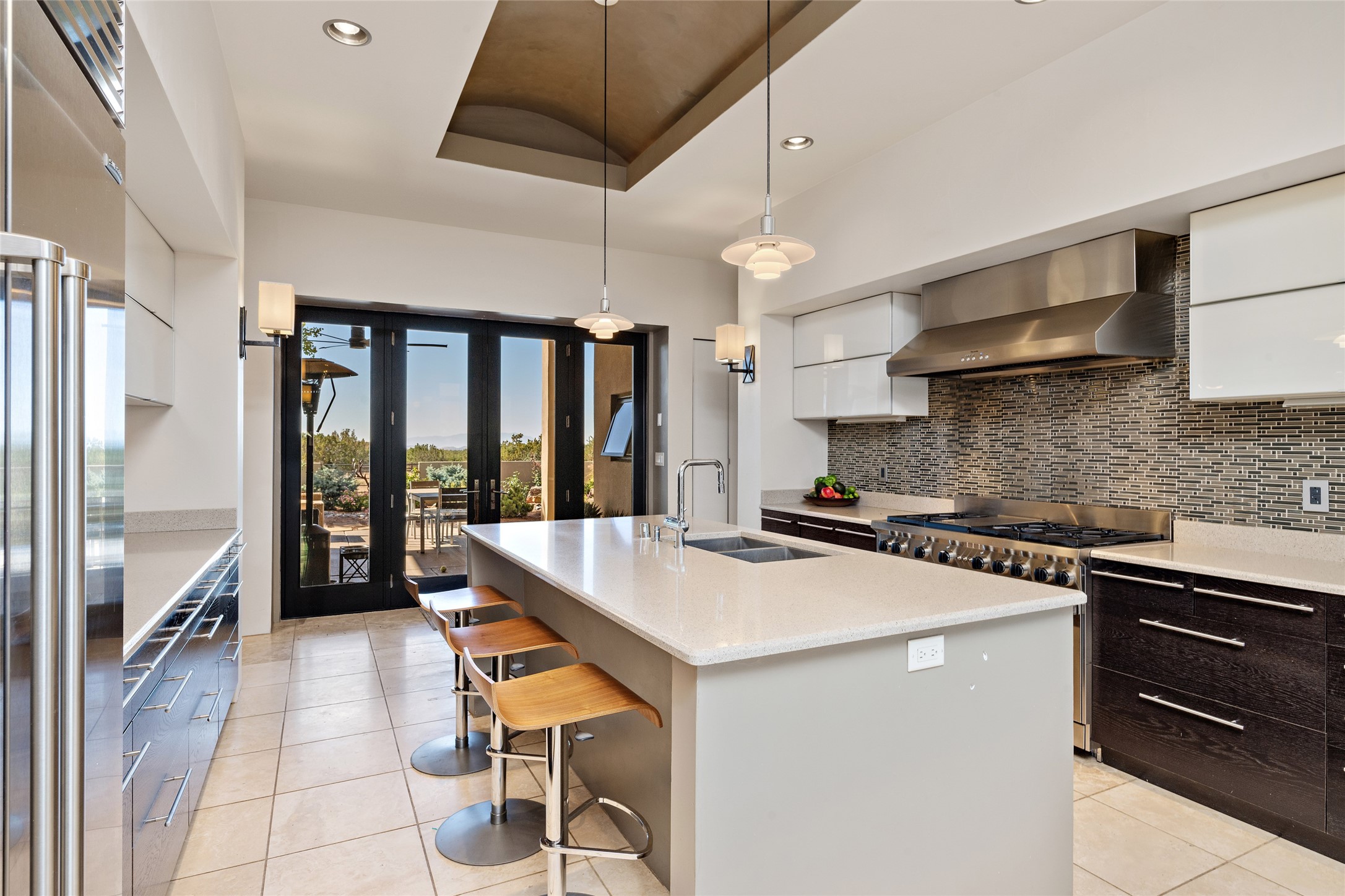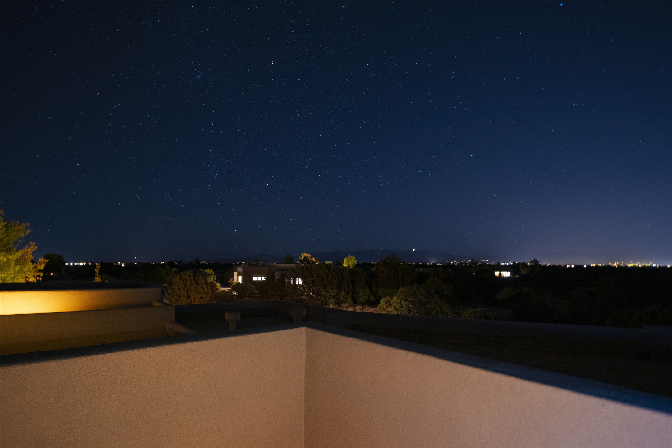 Sophisticated contemporary architecture, by renowned builder, Seth Anderson blended with luxury finishes, a resort-like backyard, and spectacular Mountain views are celebrated at this exciting Las Campanas residence. Designed to enjoy the ultimate Santa Fe lifestyle, this one of a kind residence, located within the master planned community Las Campanas, impresses with exceptional design which seamlessly incorporates the ultimate indoor and outdoor living experience with a newly added elevated portal and fireplace, a modern above ground spa, a substantial roof deck with 360-degree views, vibrant surround landscape, and three separate covered entertainment areas. This exquisite home offers excellent separation of space, with a private owner's suite complete portal access, a spa-like bath with a Victoria Albert soaking tub, a steam shower with glass accents which frame the aspen tree views, custom cabinets, and a spacious wrap around walk-in closet. Flexible design features include two additional bedrooms which share a full bath, plus a newly added modern office or ideal art studio with front courtyard access. The state-of-the-art chef's kitchen delights with Subzero and Wolf appliances, a large island with expansive seating, and a walk-in pantry. Located directly off the kitchen is the ultimate great room for entertaining, which was designed to integrate the surrounding natural landscape and mountain views, complete with a grand gas fireplace, Jemez and Sangre de Cristo Mountain views, and a formal dining area. The outdoor living experience is enhanced by deep portals with mountain views, surround aspen trees, rose gardens, and newly installed photovoltaic landscape lighting. Exceptional features include a spacious heated 3-car garage, a tranquil gated front entrance courtyard, exceptional natural light throughout, radiant in-floor heating with an updated boiler, and custom steel accents which add the highest level of contemporary design.