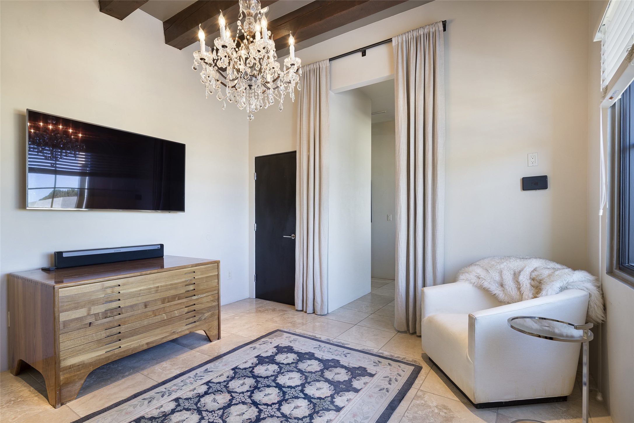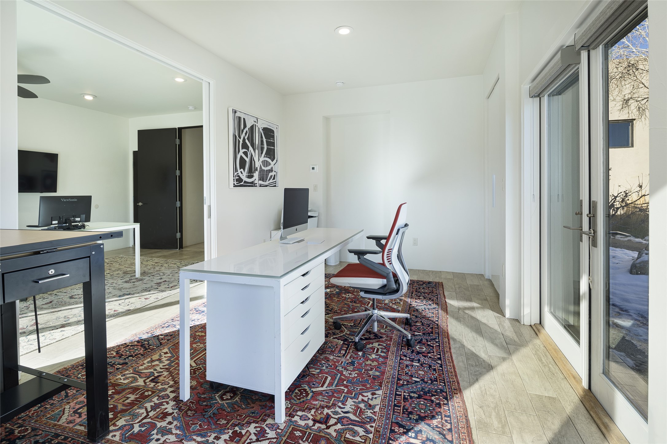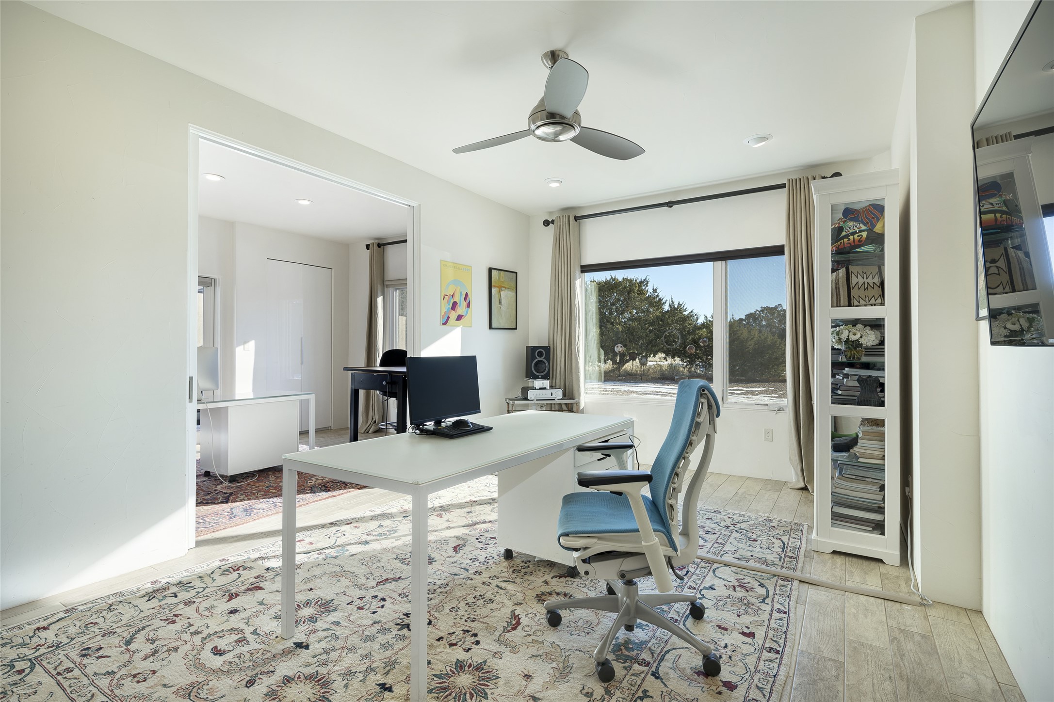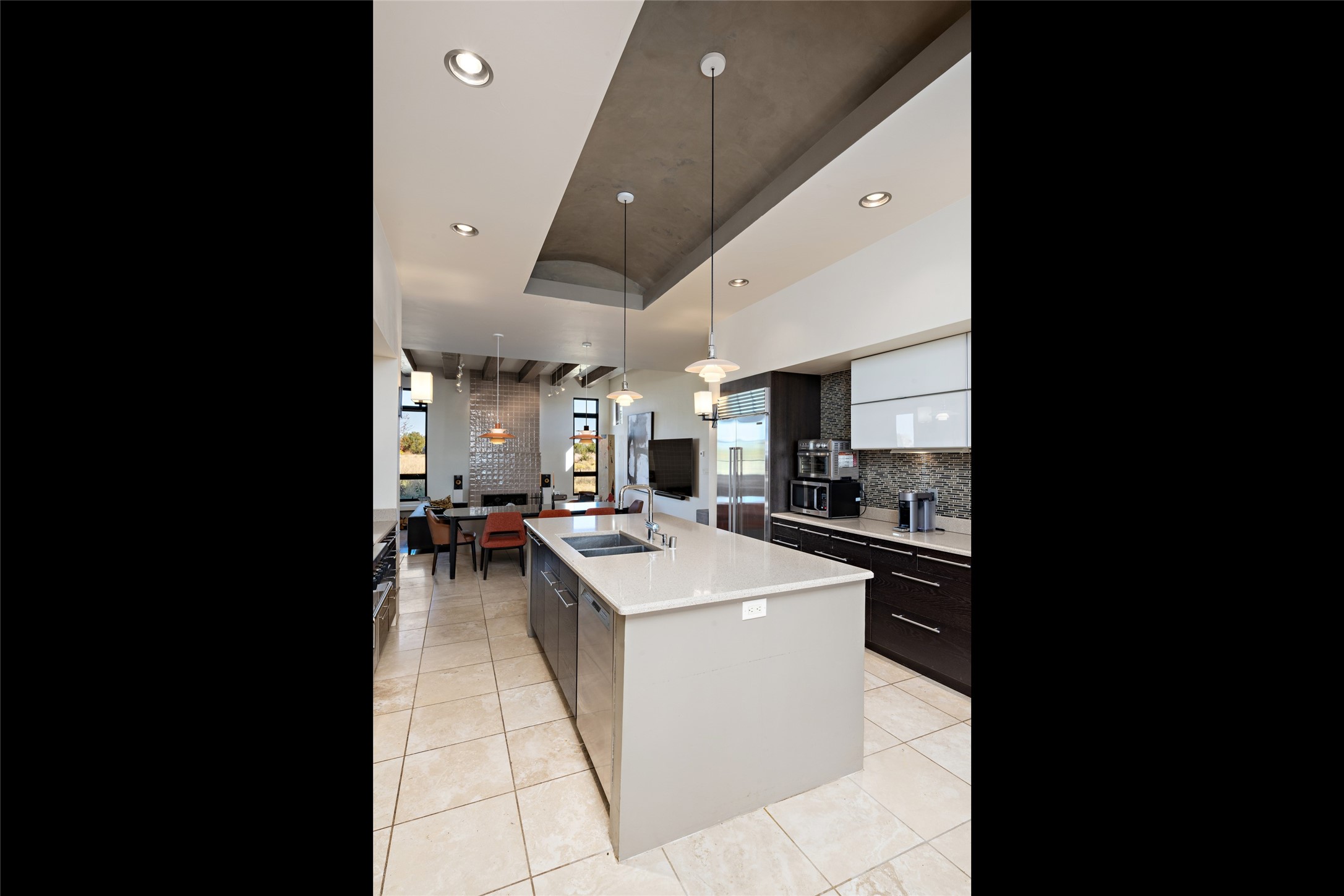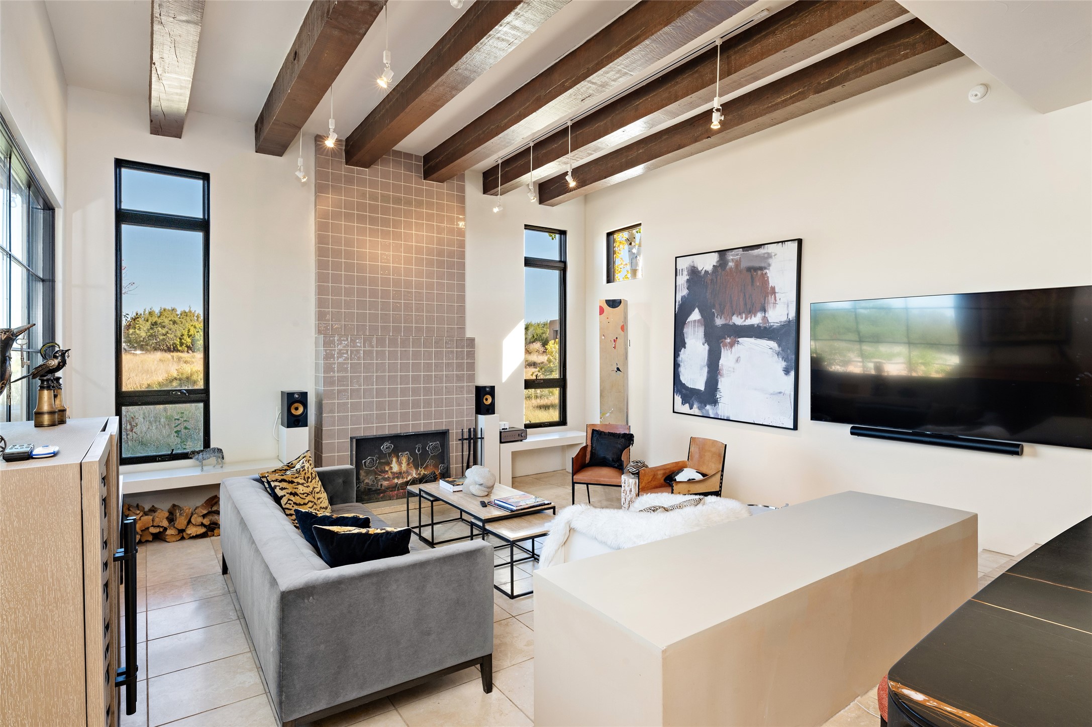 Sophisticated contemporary architecture, by renowned builder, Seth Anderson blended with luxury finishes, a resort-like backyard, and spectacular Mountain views are celebrated at this exciting Las Campanas residence. Designed to enjoy the ultimate Santa Fe lifestyle, this one of a kind residence, located within the master planned community Las Campanas, impresses with exceptional design which seamlessly incorporates the ultimate indoor and outdoor living experience with a newly added elevated portal and fireplace, a modern above ground spa, a substantial roof deck with 360-degree views, vibrant surround landscape, and three separate covered entertainment areas. This exquisite home offers excellent separation of space, with a private owner's suite complete portal access, a spa-like bath with a Victoria Albert soaking tub, a steam shower with glass accents which frame the aspen tree views, custom cabinets, and a spacious wrap around walk-in closet. Flexible design features include two additional bedrooms which share a full bath, plus a newly added modern office or ideal art studio with front courtyard access. The state-of-the-art chef's kitchen delights with Subzero and Wolf appliances, a large island with expansive seating, and a walk-in pantry. Located directly off the kitchen is the ultimate great room for entertaining, which was designed to integrate the surrounding natural landscape and mountain views, complete with a grand gas fireplace, Jemez and Sangre de Cristo Mountain views, and a formal dining area. The outdoor living experience is enhanced by deep portals with mountain views, surround aspen trees, rose gardens, and newly installed photovoltaic landscape lighting. Exceptional features include a spacious heated 3-car garage, a tranquil gated front entrance courtyard, exceptional natural light throughout, radiant in-floor heating with an updated boiler, and custom steel accents which add the highest level of contemporary design.