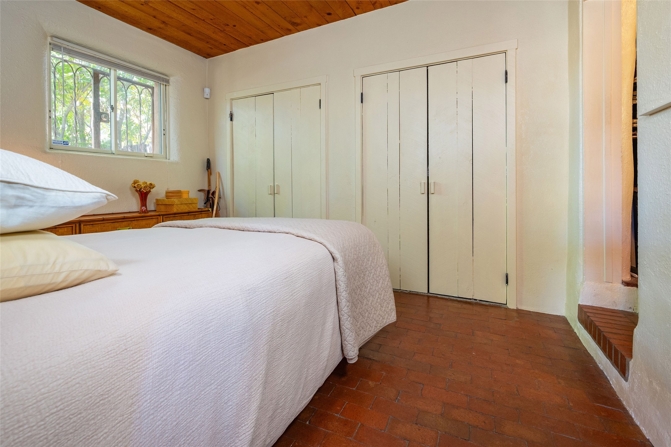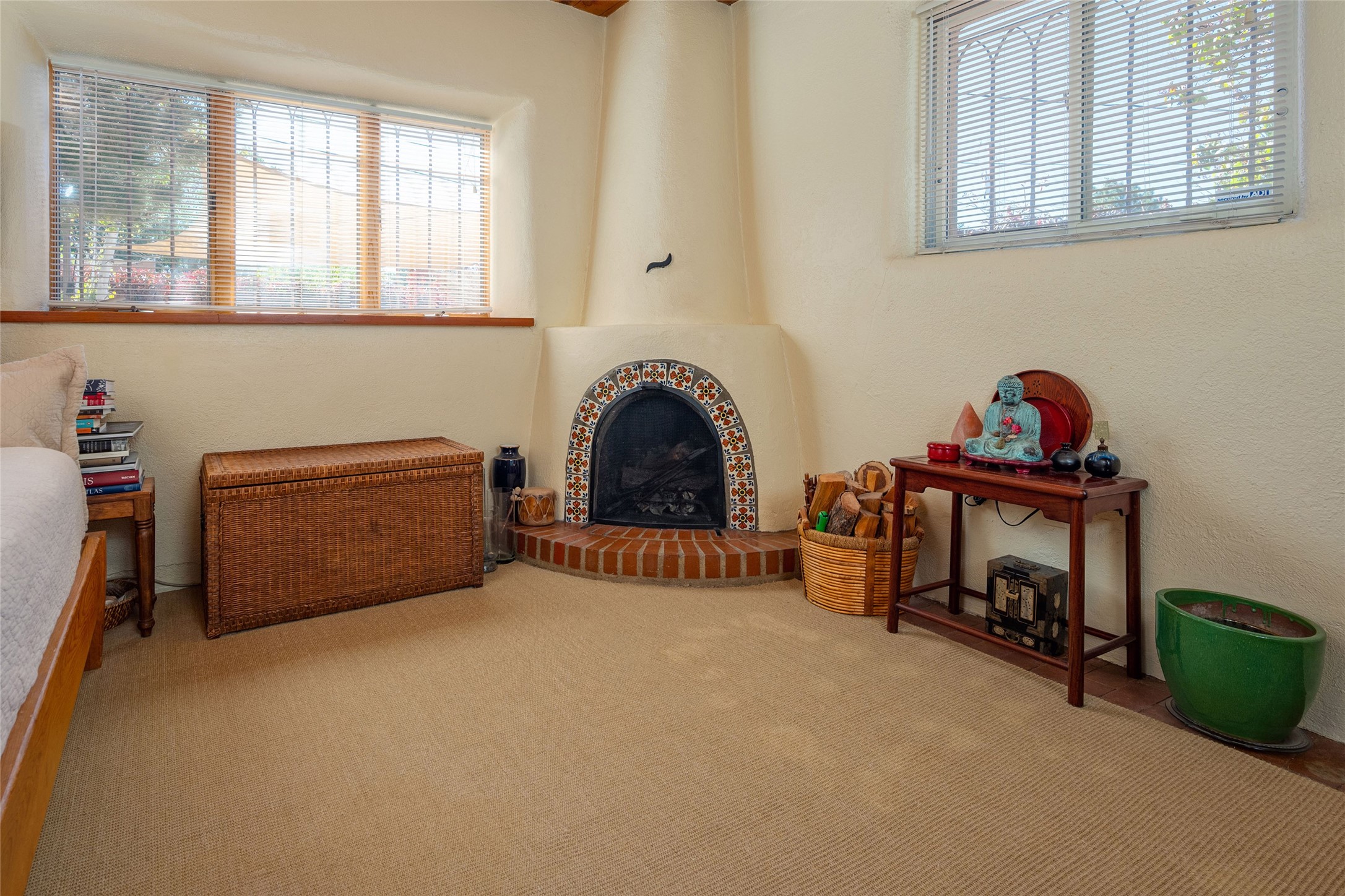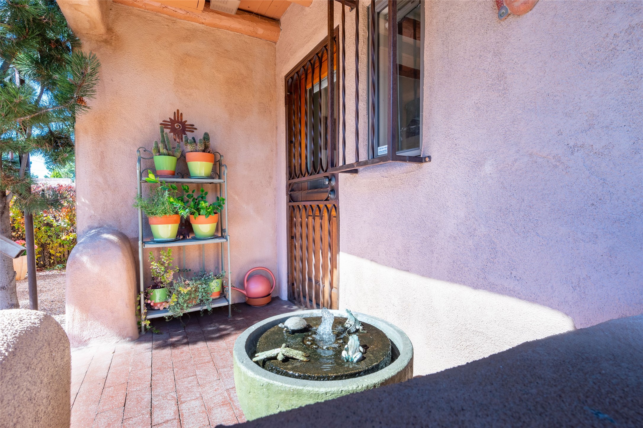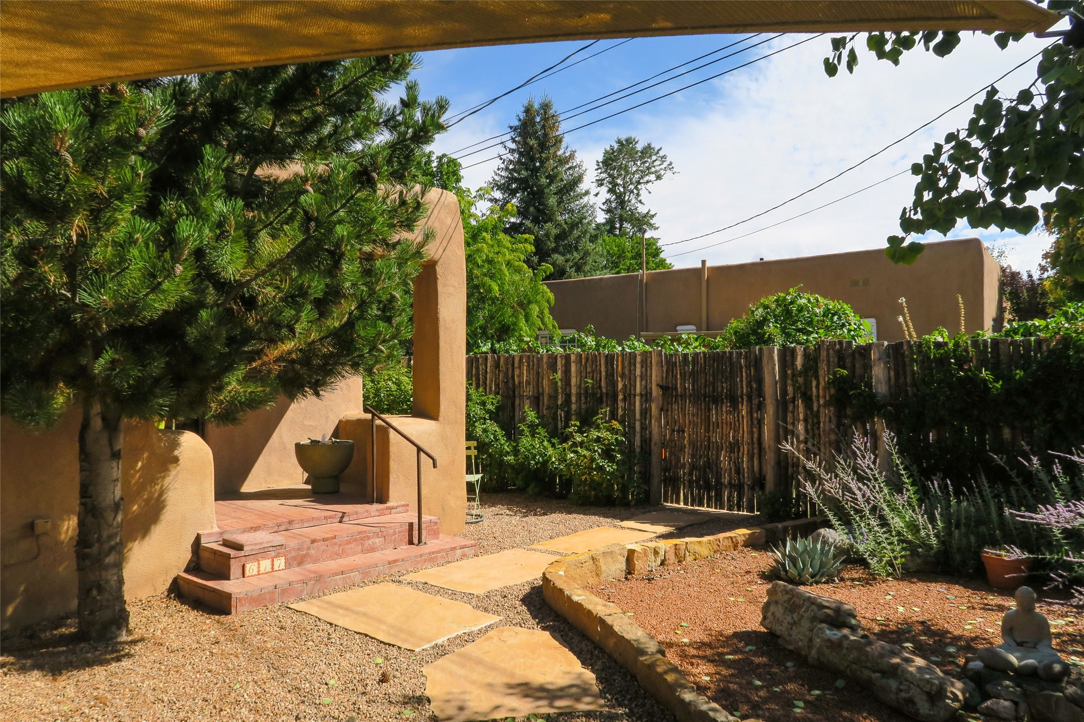 Charming original Pueblo-style condo in the Westside Guadalupe Historic District, 1 bedroom 1 bath with small den/workspace. A special historic property remodeled and upgraded in 2008, excellent location close to Santa Fe Plaza, and the Railyard with Santa Fe Farmers' Market. Entrance has stone wall and 6ft high coyote fence covered with Virginia creepers that surrounds the entire property. Enter to the serene and private flagstone and gravel garden with Aspens, Bosnian Pine, Roses, Lilacs and Russian Sage, and shade sails for outdoor dining and leisure. Automated irrigation watering system, door and windows have decorative security ironwork, and ADT installed. The entry portal has a water fountain, and traditional vigas that continue into the kitchen that has a gas range/oven, refrigerator, 2021 washer and dryer, and Mexican tile counter space. There are brick floors throughout the home, and the ceilings are broad plank rough-cut pine. The living-dining room has west and south facing windows, a traditional working Kiva fireplace appointed with Mexican tile, and a skylight over the dining area. The bedroom has a wall-to-wall closet. The full-bath has a tub-shower with sliding glass doors, a ceiling heater, and a small window. The den/workspace has a window in the deep walls that are traditional in original adobe structures. There is on street parking in this private neighborhood with residential parking only and a non-fee decal permit in addition to guest permits.