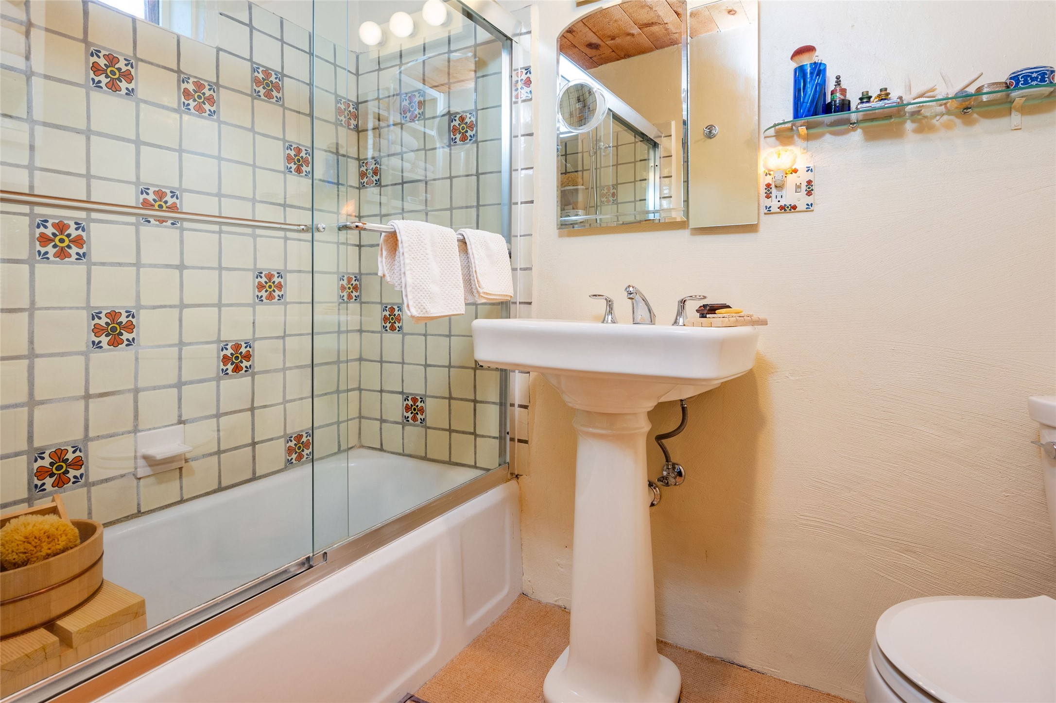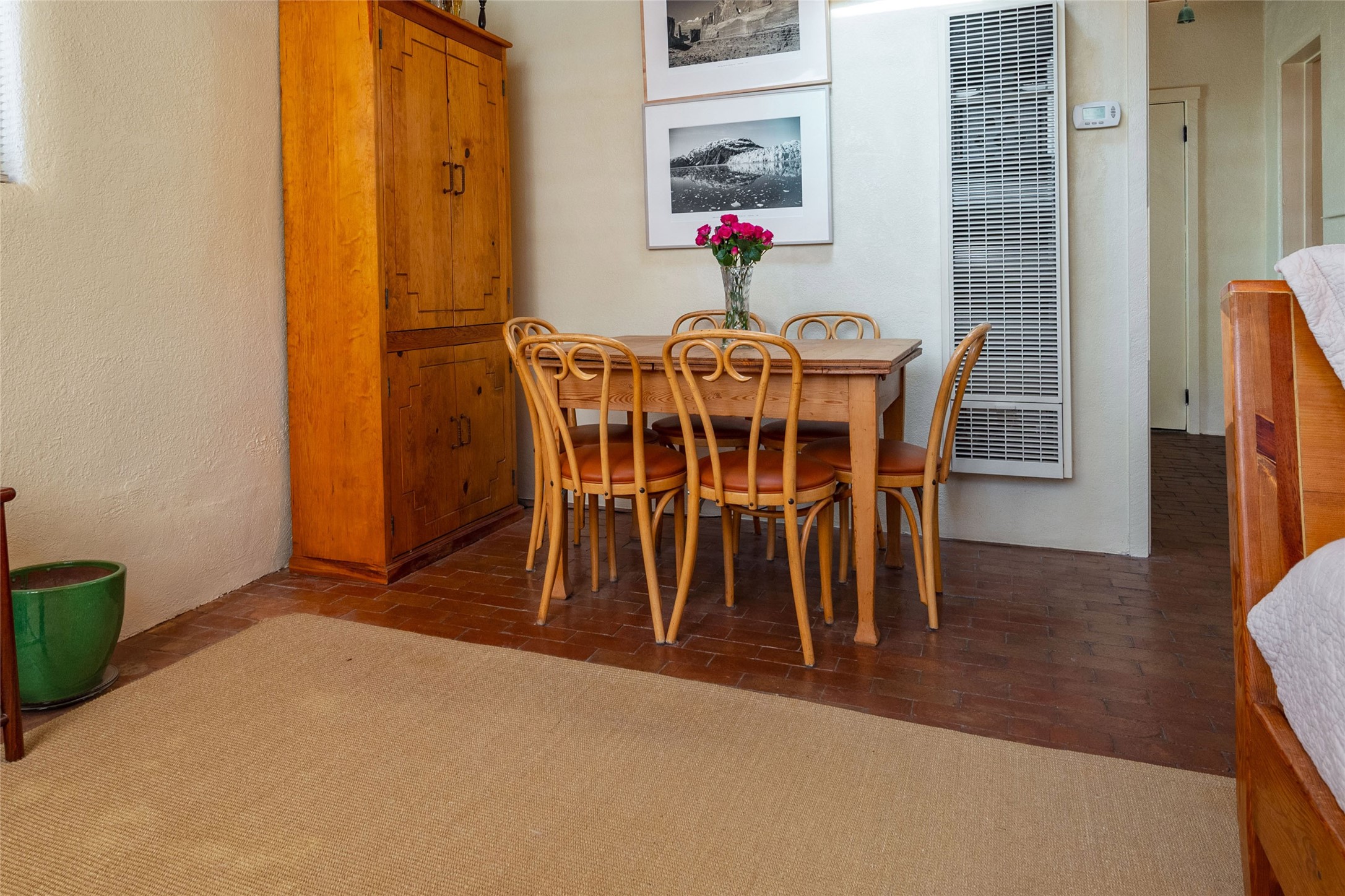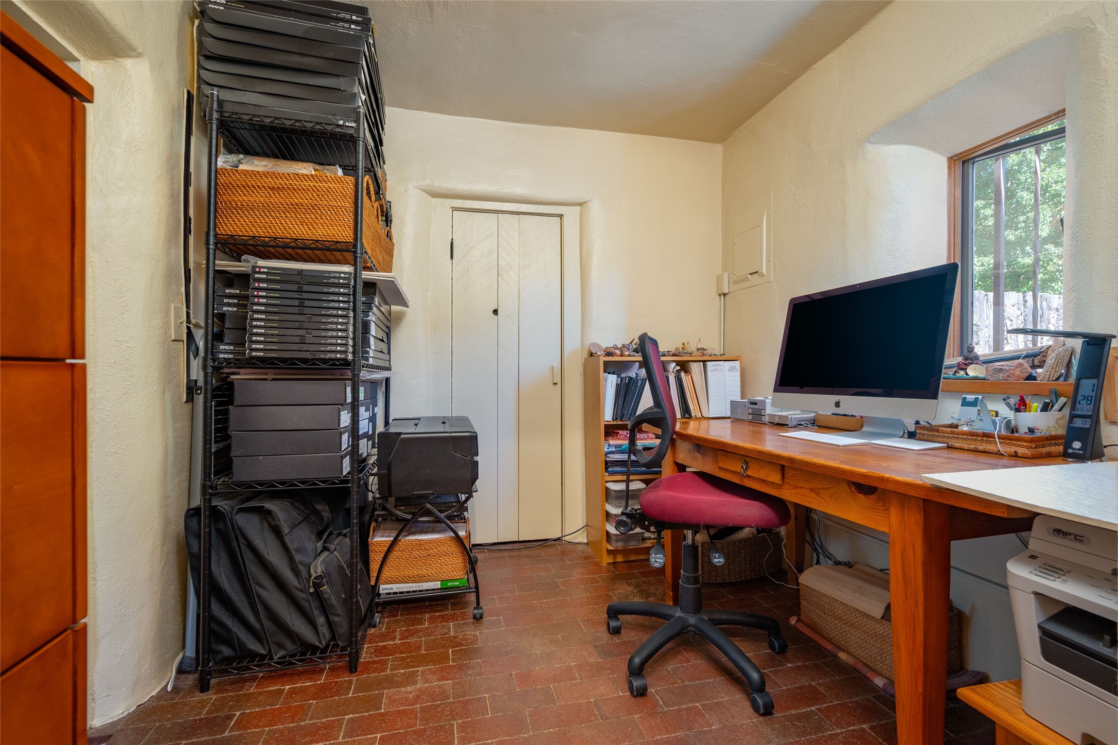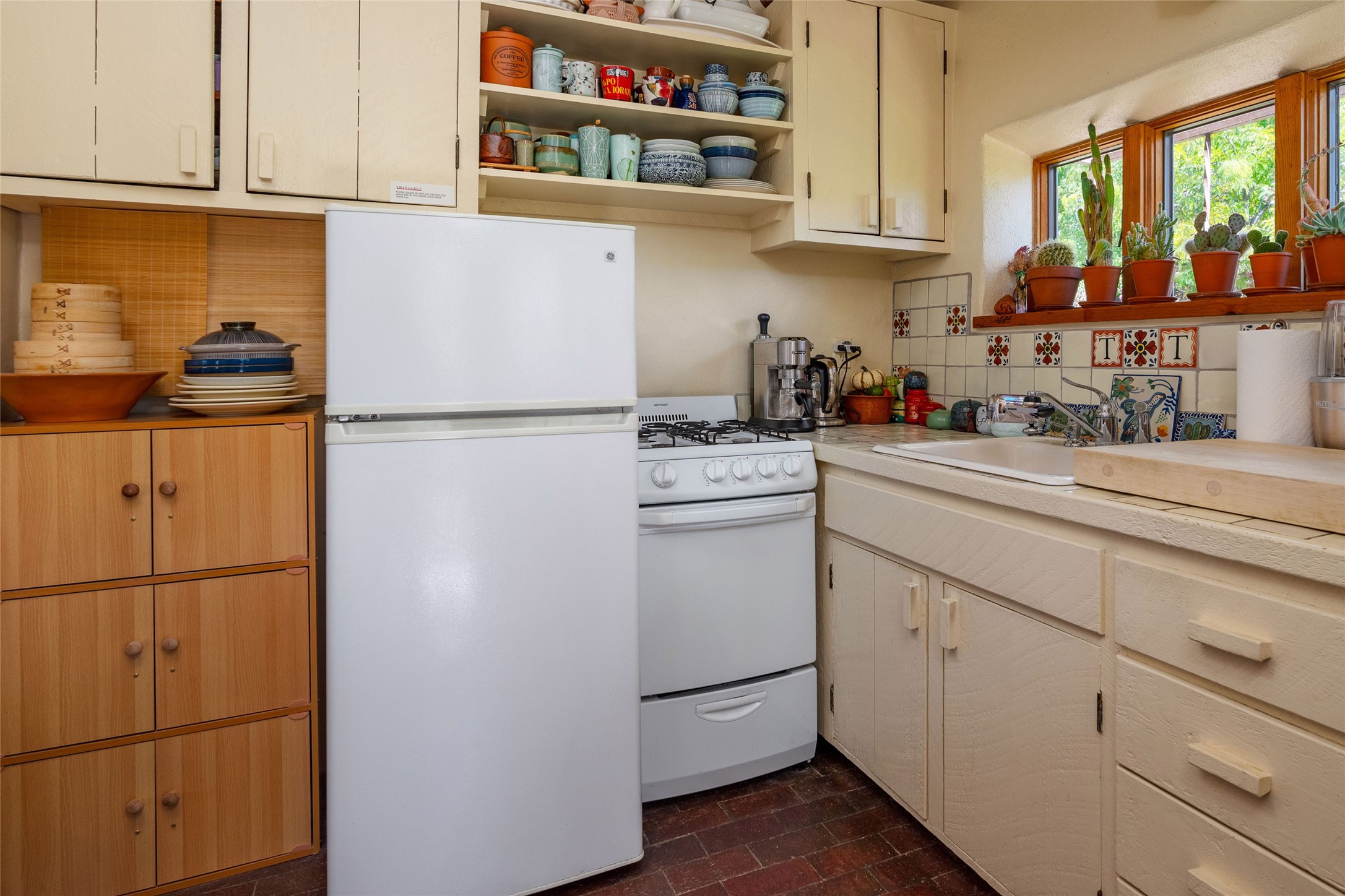 Charming original Pueblo-style condo in the Westside Guadalupe Historic District, 1 bedroom 1 bath with small den/workspace. A special historic property remodeled and upgraded in 2008, excellent location close to Santa Fe Plaza, and the Railyard with Santa Fe Farmers' Market. Entrance has stone wall and 6ft high coyote fence covered with Virginia creepers that surrounds the entire property. Enter to the serene and private flagstone and gravel garden with Aspens, Bosnian Pine, Roses, Lilacs and Russian Sage, and shade sails for outdoor dining and leisure. Automated irrigation watering system, door and windows have decorative security ironwork, and ADT installed. The entry portal has a water fountain, and traditional vigas that continue into the kitchen that has a gas range/oven, refrigerator, 2021 washer and dryer, and Mexican tile counter space. There are brick floors throughout the home, and the ceilings are broad plank rough-cut pine. The living-dining room has west and south facing windows, a traditional working Kiva fireplace appointed with Mexican tile, and a skylight over the dining area. The bedroom has a wall-to-wall closet. The full-bath has a tub-shower with sliding glass doors, a ceiling heater, and a small window. The den/workspace has a window in the deep walls that are traditional in original adobe structures. There is on street parking in this private neighborhood with residential parking only and a non-fee decal permit in addition to guest permits.