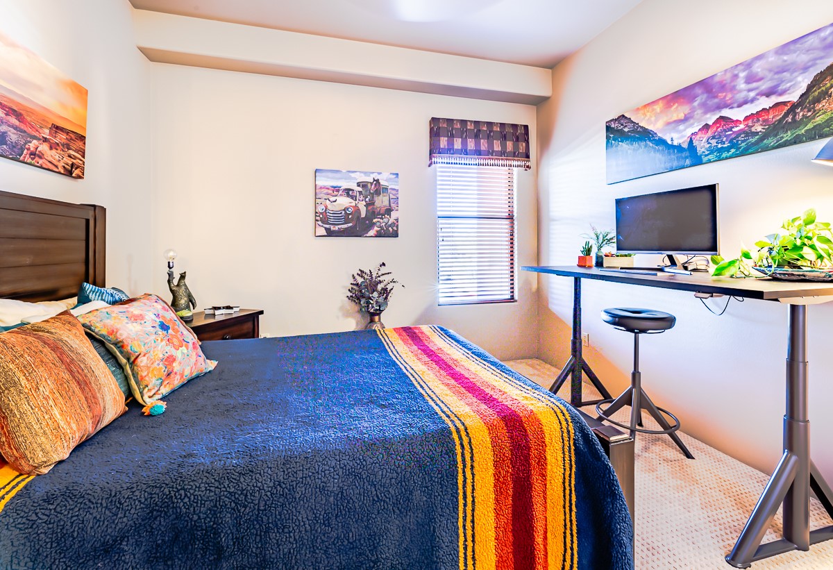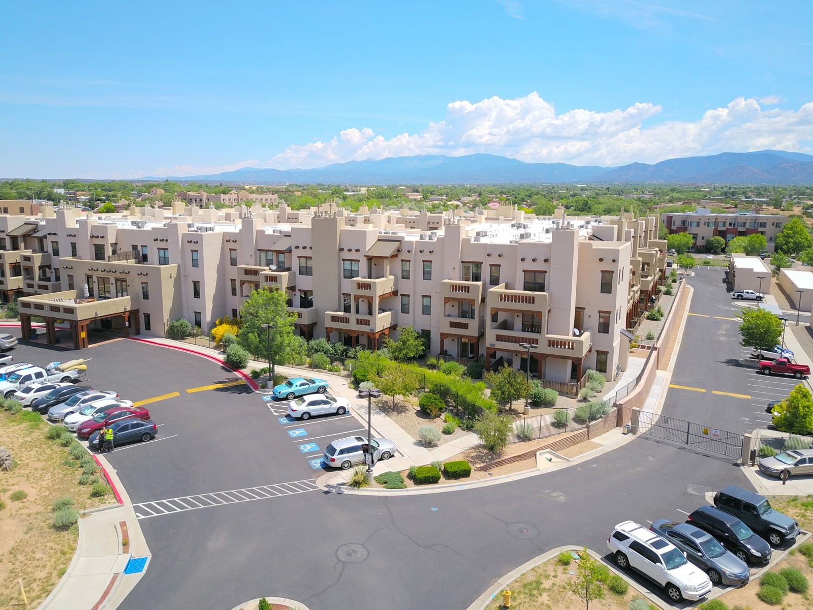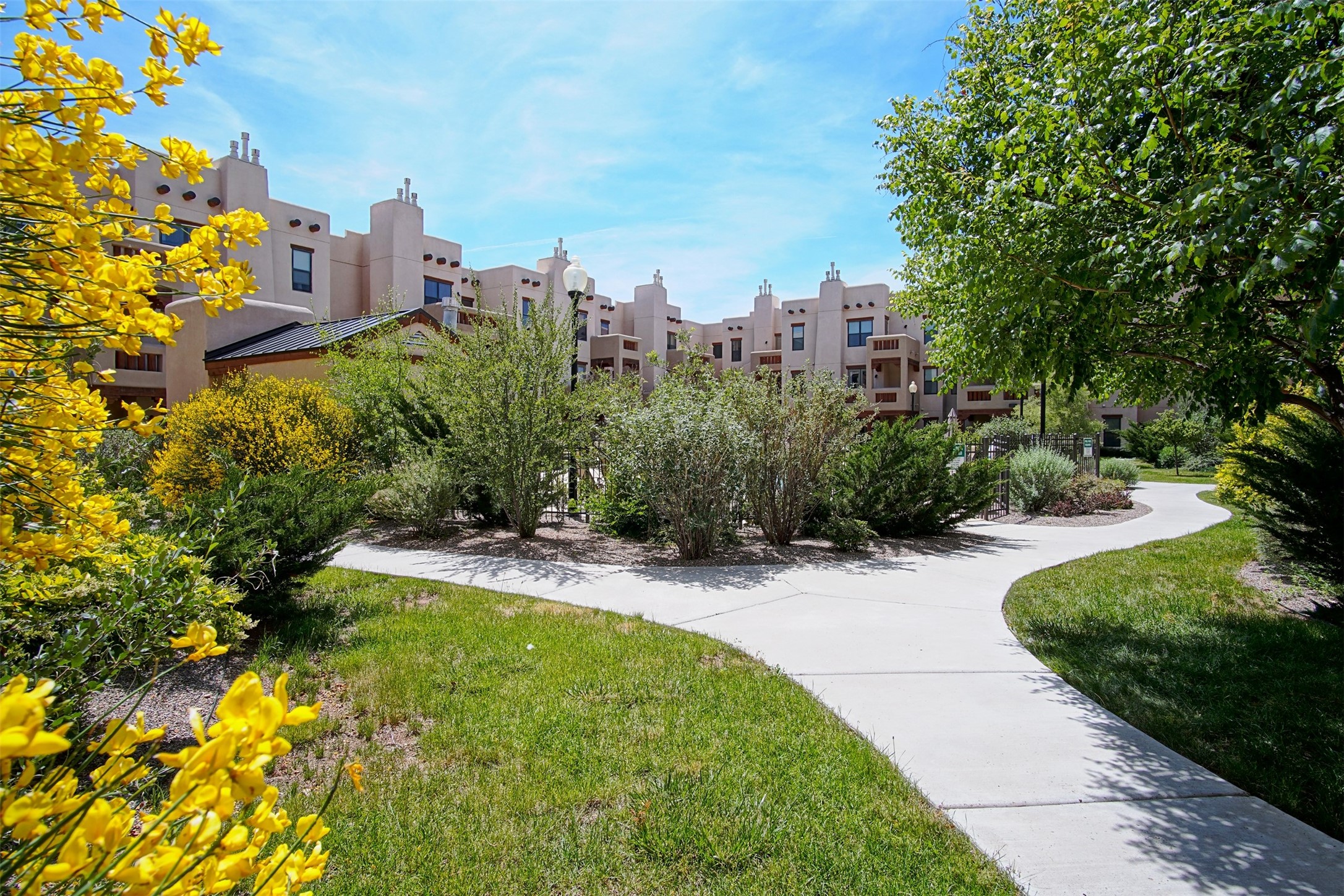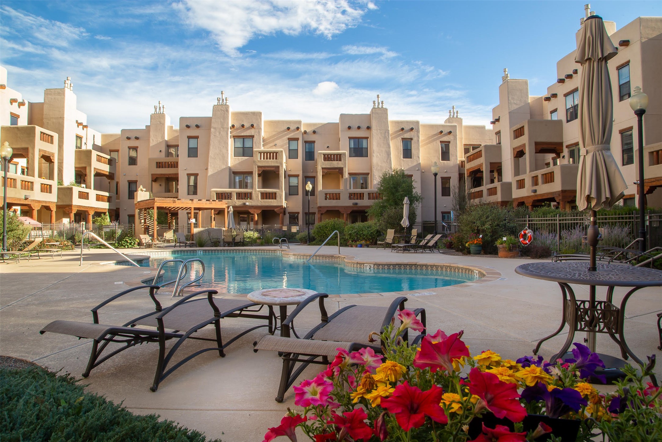 Welcome to the Alameda Condominiums, where luxury and style come together in this glamorous second-floor condo. This 2 BR/2 BA, 1171 sf Pueblo-style residence is perfectly positioned in a coveted corner location, offering views from east to west via the wraparound patio. Luxe appointments abound in the sun-drenched interior: espresso flooring, beautiful vigas, a gas Kiva FP, updated lighting, gleaming slate and granite, quartz kitchen sink, hi-end refrigerator, double ovens, and a new Samsung washer-dryer duo. The master suite is a sanctuary of comfort, with a dazzling bathroom featuring double sinks, glass shower, deep soaking tub, and a spacious walk-in closet. A well-appointed guest wing with its own second bathroom, walk-in closet, and office nook provides ample space for family or guests. This condo is conveniently located near the elevator, fitness center, and lobby for added ease of access. ***The package is complete with a jumbo STORAGE UNIT and a one-car GARAGE*** plus 2 additional parking spaces in the gated lot. Building amenities include pool, fitness center, full-time onsite management, community rooms, library, gated parking, and 24-hour controlled access for your peace of mind. Alameda Condominiums is ideally located, just 12 minutes away from the Santa Fe Plaza, offering easy access to the city's vibrant cultural and culinary scene. With so much to love in this remarkable condo, this is a rare opportunity to experience the ultimate in Santa Fe living.