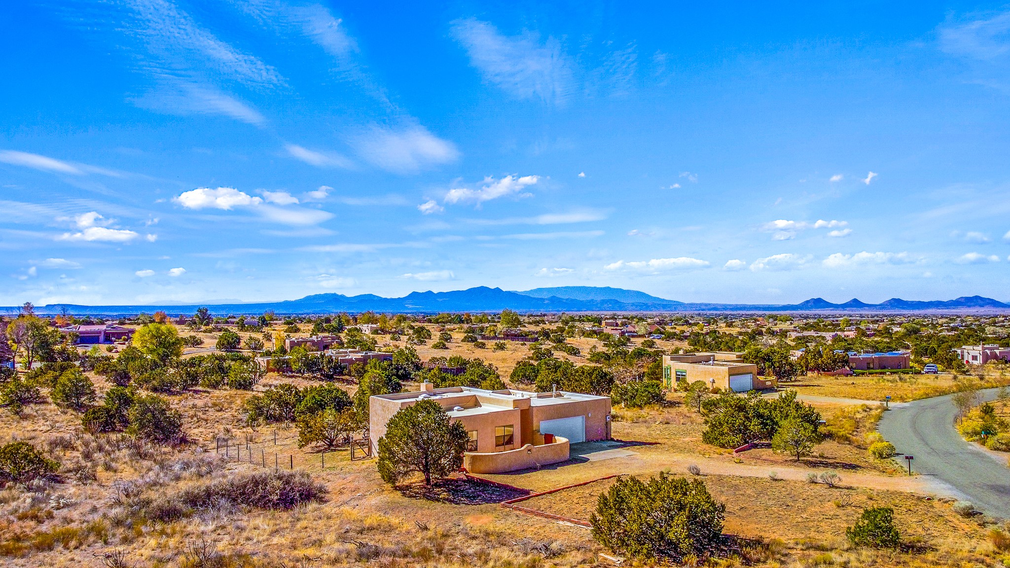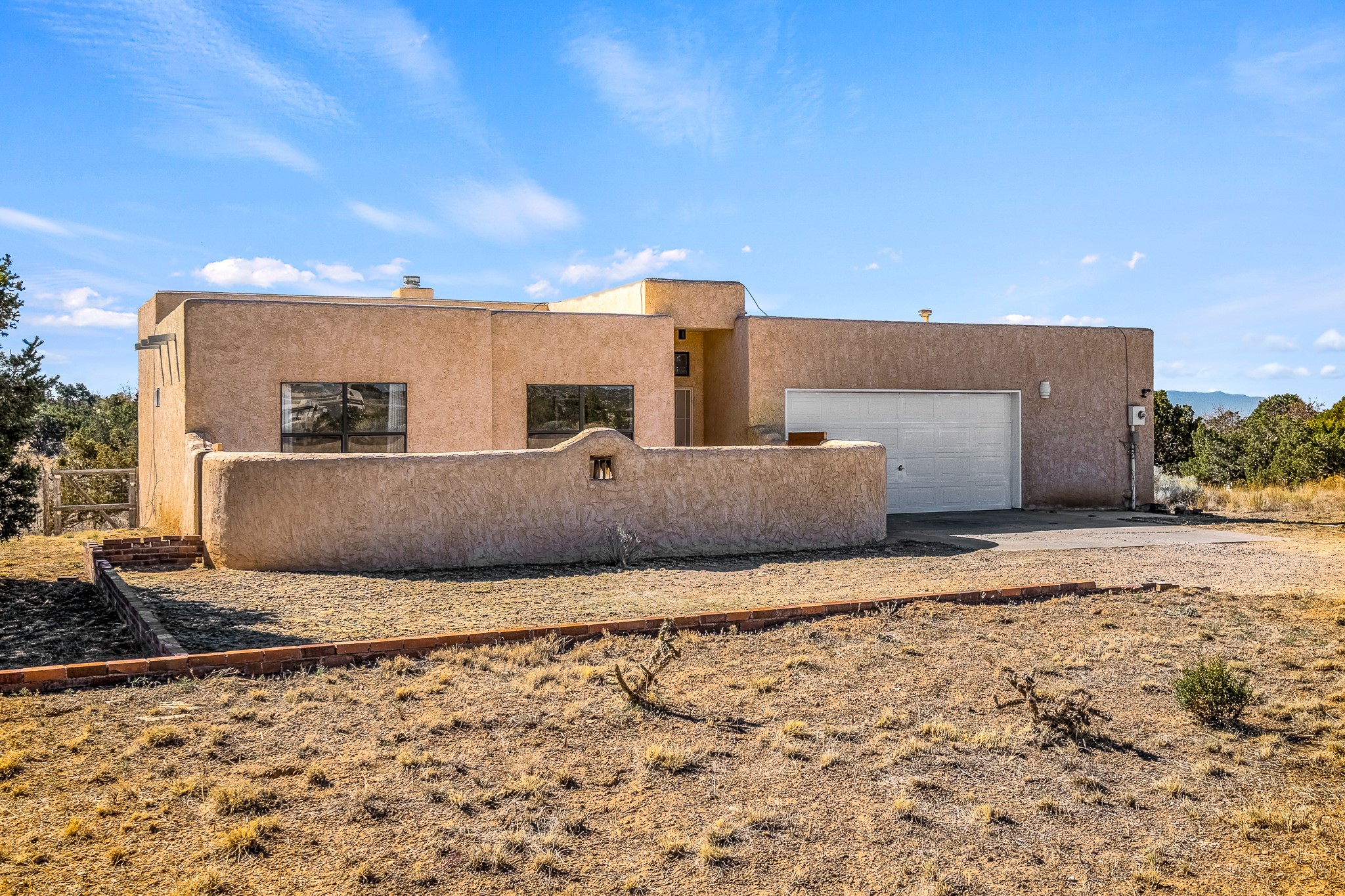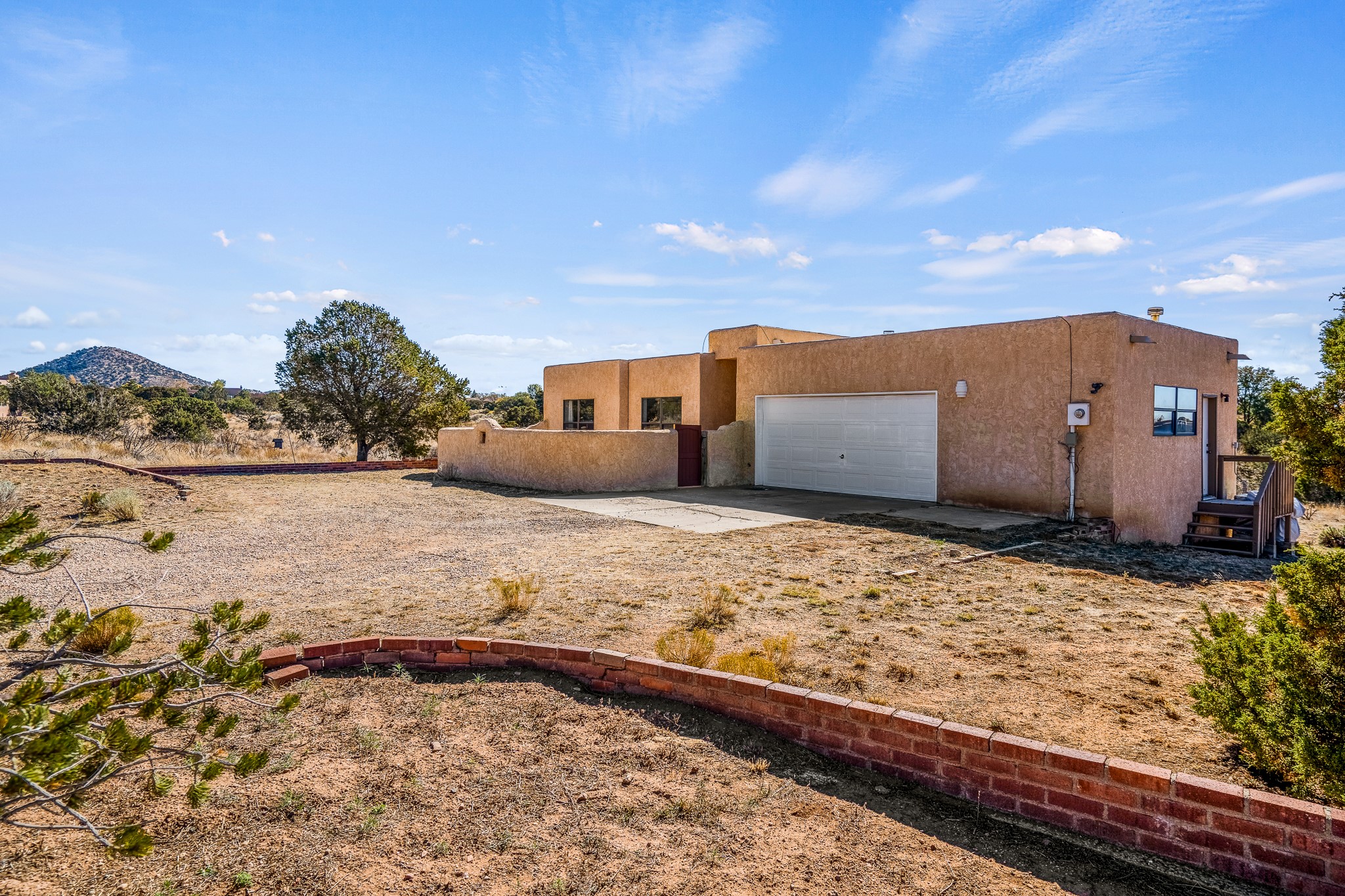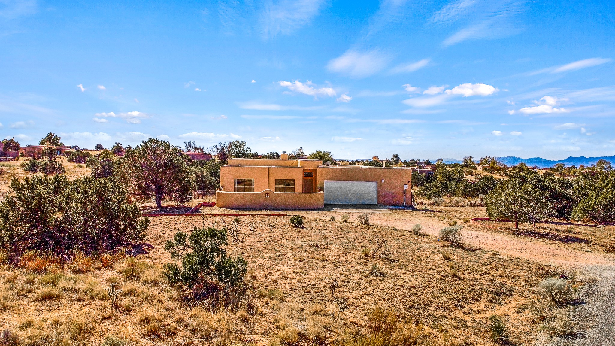 Welcome to a sunny, eco-friendly haven on 1.64 acres, three bedrooms and 1 3/4 baths. This passive solar home captures the essence of Southwestern living, offering picturesque views of the majestic Sandia Mountains and the serene Eldorado hills. Step inside to an inviting open-concept layout, where a cozy living room with a warming fireplace beckons you. The dining area, nestled within a bay window, creates the perfect spot for family meals or entertaining. The spacious kitchen features ample cabinetry and flows seamlessly, making it kitchen enjoy your cooking! Convenience is at your fingertips with a pantry/laundry room, complete with a sink, and direct access to the 600 sq. ft. 2-car garage/workshop.Begin each day with a peaceful view toward the Sandia Mountains from the primary bedroom. The sense of open space surrounding this property creates a tranquil environment. Ideally located, this home is a stone's throw from the Community Center, shopping, restaurants, and the Eldorado Community School. Access to 285 makes the daily commute very convenient. Notable updates include a new TPO roof in 2019, adding to this home's value and peace of mind. Don't miss this opportunity to own a piece of our Santa Fe paradise. Your dream home awaits.