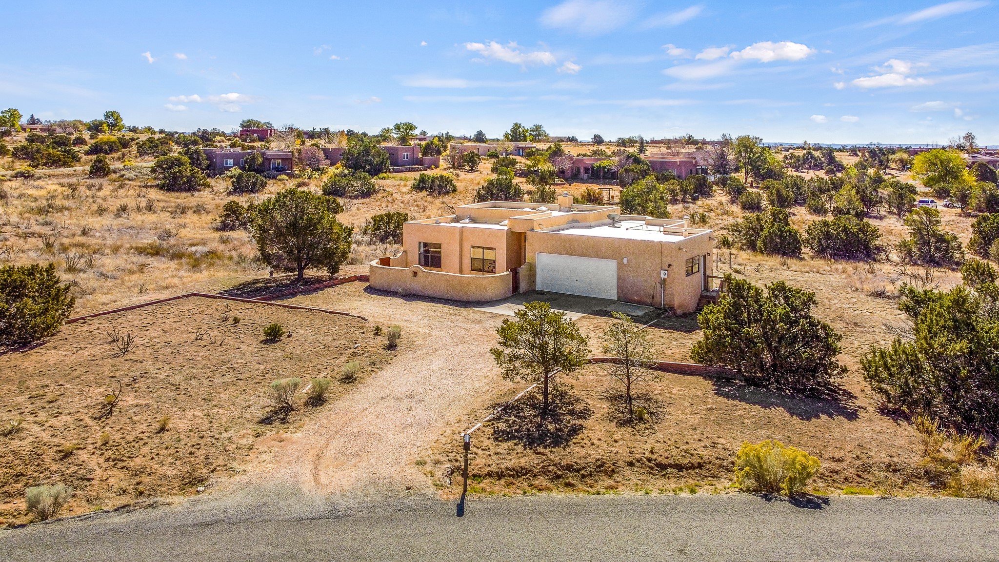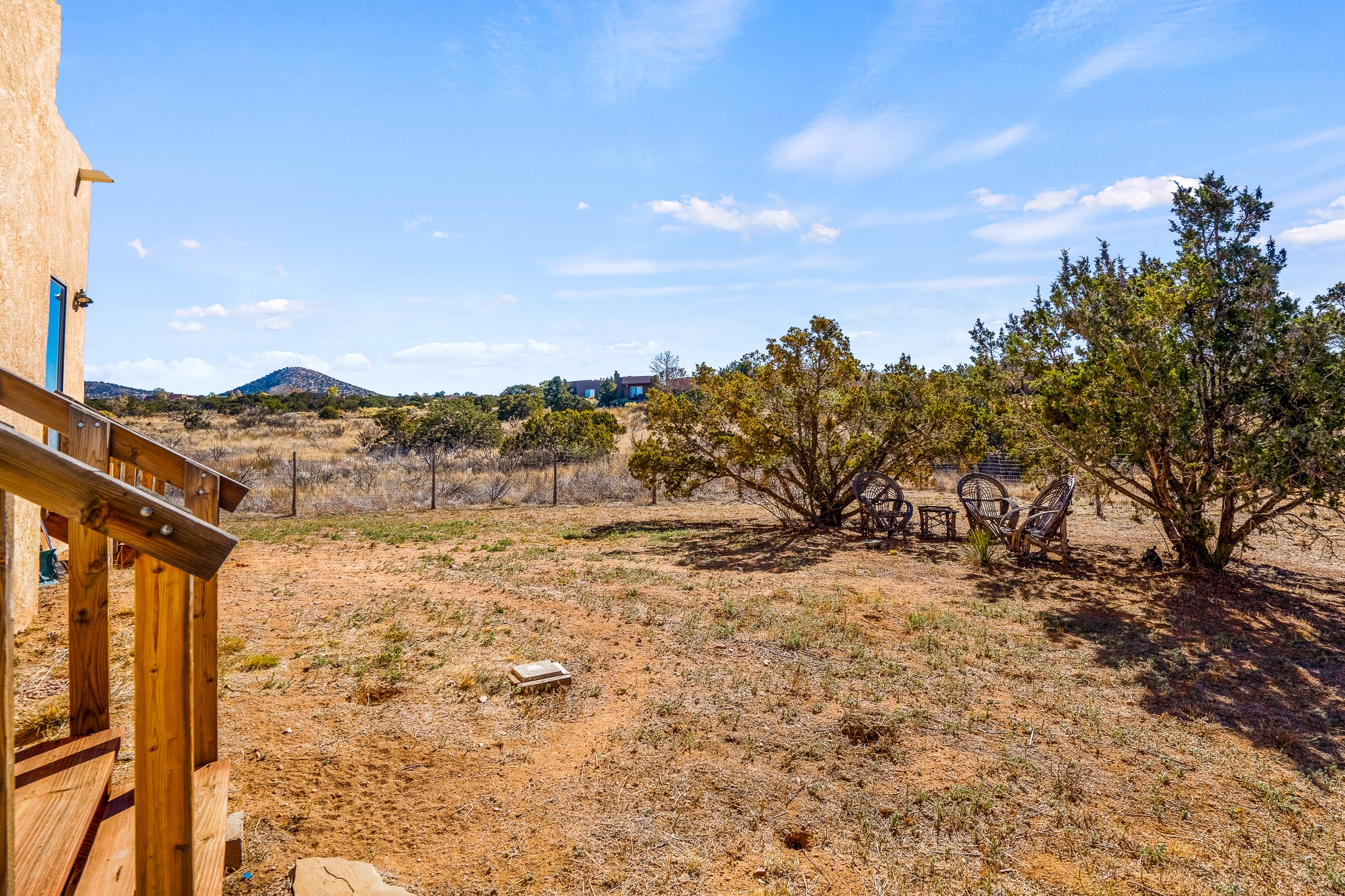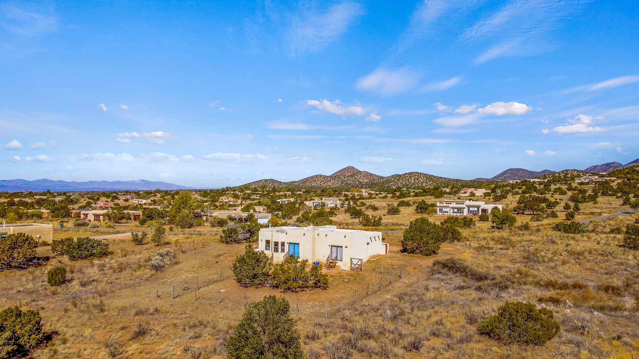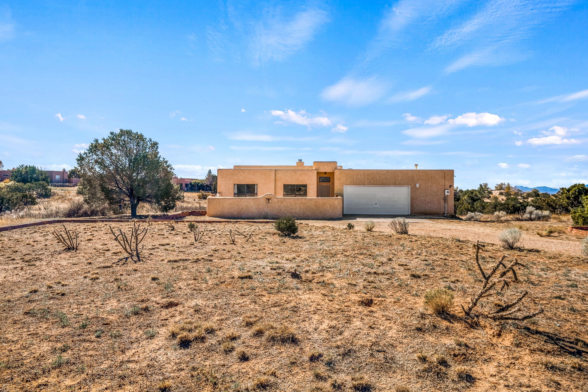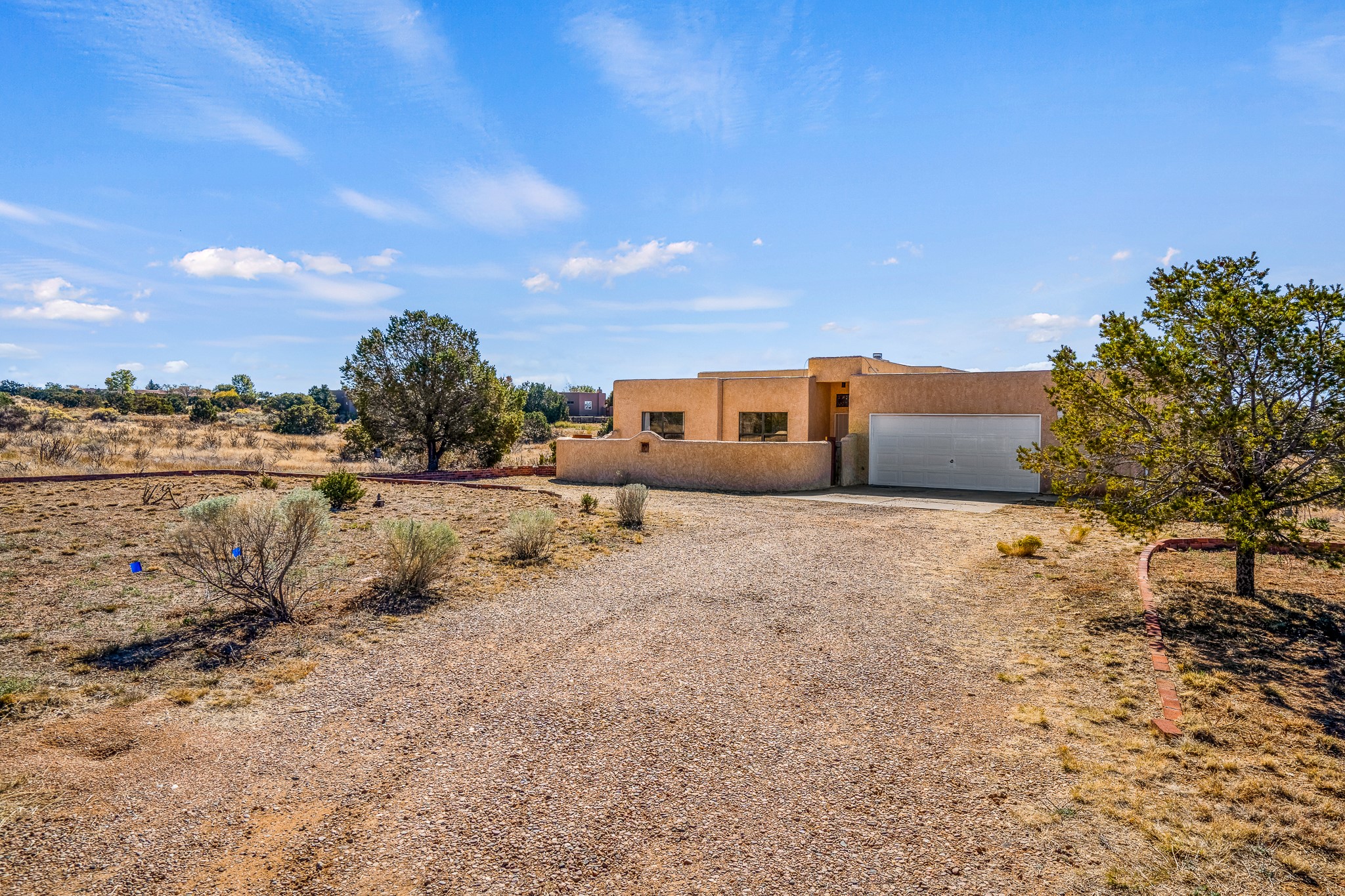 Welcome to a sunny, eco-friendly haven on 1.64 acres, three bedrooms and 1 3/4 baths. This passive solar home captures the essence of Southwestern living, offering picturesque views of the majestic Sandia Mountains and the serene Eldorado hills. Step inside to an inviting open-concept layout, where a cozy living room with a warming fireplace beckons you. The dining area, nestled within a bay window, creates the perfect spot for family meals or entertaining. The spacious kitchen features ample cabinetry and flows seamlessly, making it kitchen enjoy your cooking! Convenience is at your fingertips with a pantry/laundry room, complete with a sink, and direct access to the 600 sq. ft. 2-car garage/workshop.Begin each day with a peaceful view toward the Sandia Mountains from the primary bedroom. The sense of open space surrounding this property creates a tranquil environment. Ideally located, this home is a stone's throw from the Community Center, shopping, restaurants, and the Eldorado Community School. Access to 285 makes the daily commute very convenient. Notable updates include a new TPO roof in 2019, adding to this home's value and peace of mind. Don't miss this opportunity to own a piece of our Santa Fe paradise. Your dream home awaits.