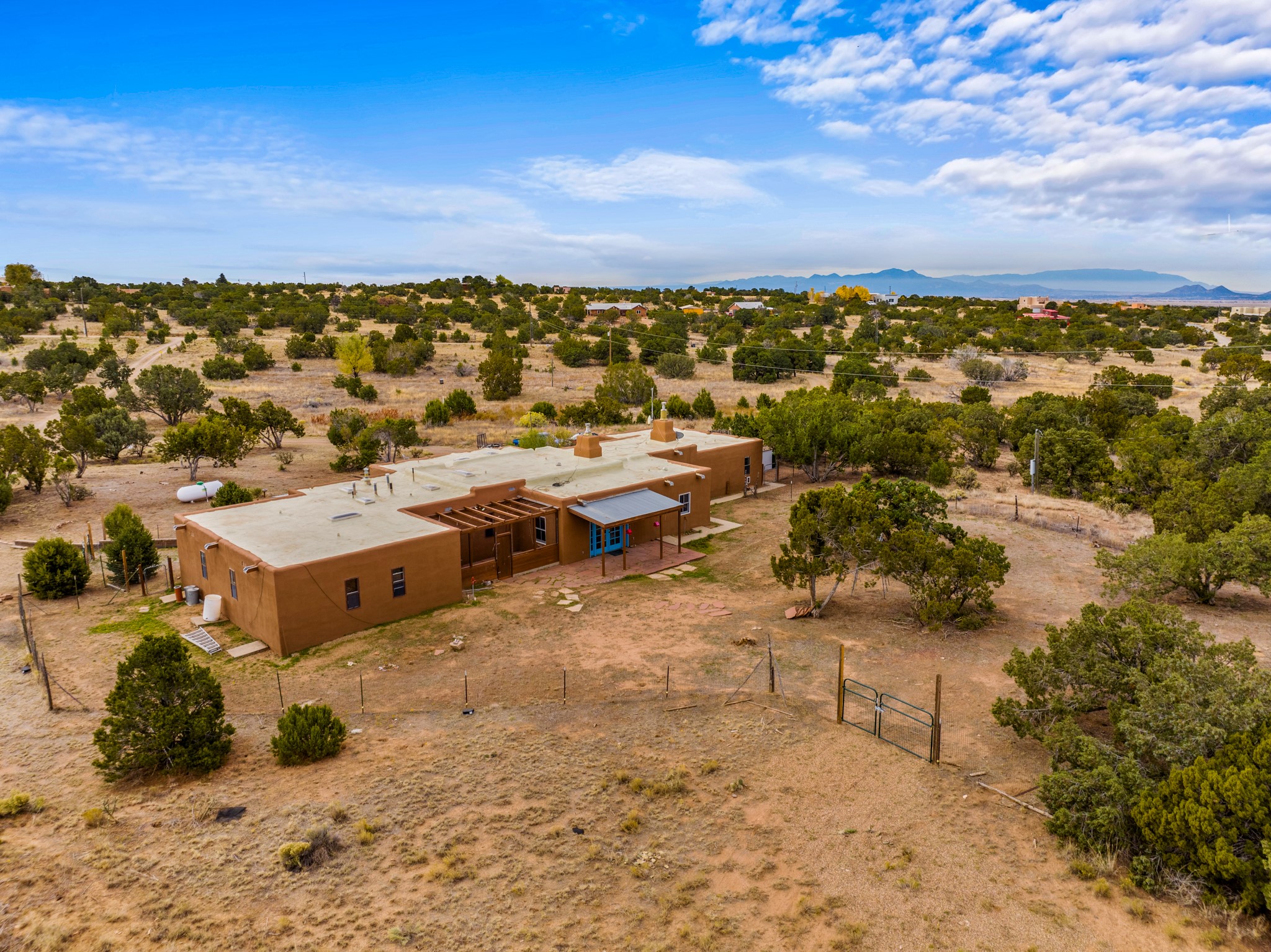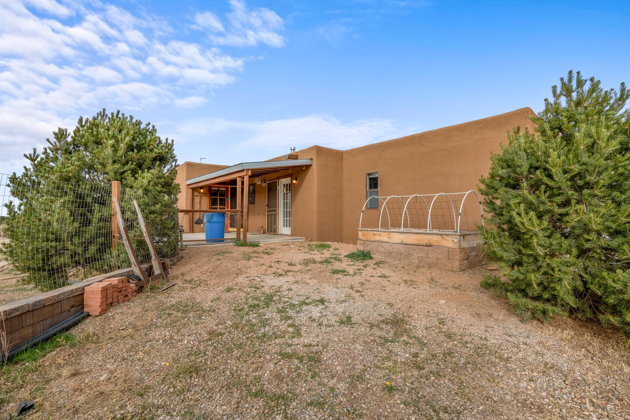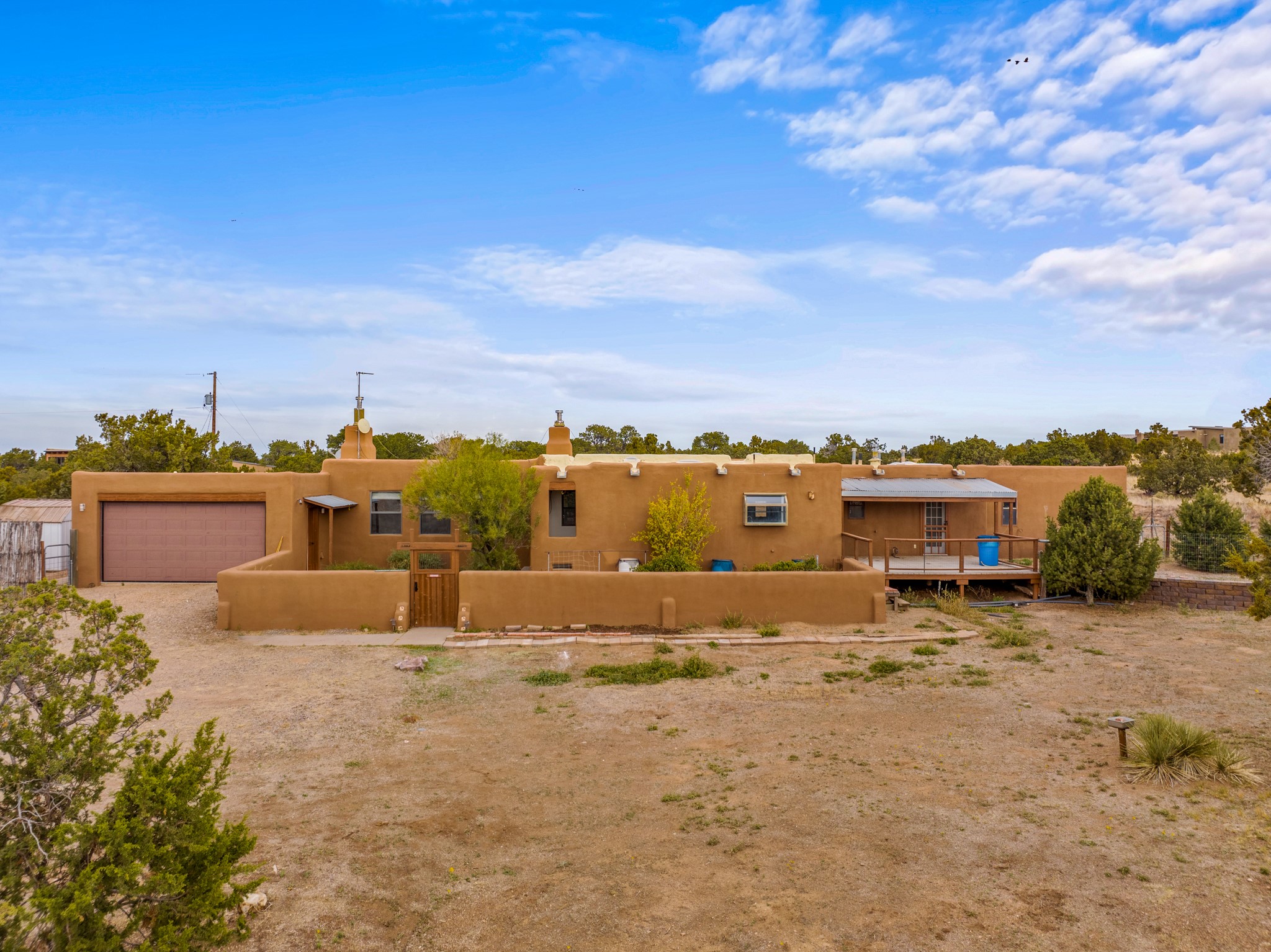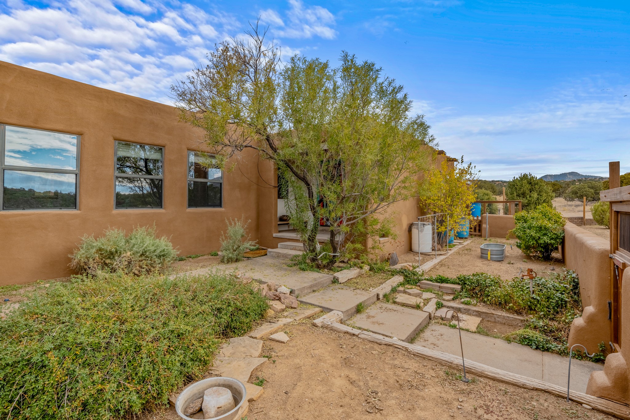 Nestled within the Sunlit Hills area of Santa Fe, this exceptional single-level home awaits its next chapter. Boasting 4 bedrooms, 2.5 baths, and a generous ~2,800 sq. ft. of living space, it sits majestically on a sprawling 5-acre lot, offering a canvas of possibilities. If your dreams include having a horse property and/or installing a a solar panel array to go greener, this is your chance to bring those dreams to life.Step inside and find a warm and inviting interior where an open living area takes center stage. The kitchen features recent updates, namely new marble countertops, sink, and range, making meal preparation a delight. With a sunny family room to bask in the morning light, a charming front porch and courtyard to savor the Santa Fe evenings, a deck with a propane BBQ hookup for outdoor dining enjoyment, a raised bed for gardeners, and a private "Catio" safely located within a half-acre fenced dog yard for your furry companions, you'll find enchanting spaces for every moment.For those seeking convenience and storage, a storage shed is on hand, and the detached 2-car garage (also with addt'l storage) along with a divided driveway offers additional parking and level in direct access to the kitchen. The flexible floorplan and property holds enormous potential for you to shape as you desire, offering the perfect blend of comfort and opportunity. New roof, stucco, + other improvements done Summer/Fall '23.Make Sunlit Hills your home and experience the charm and potential it holds.