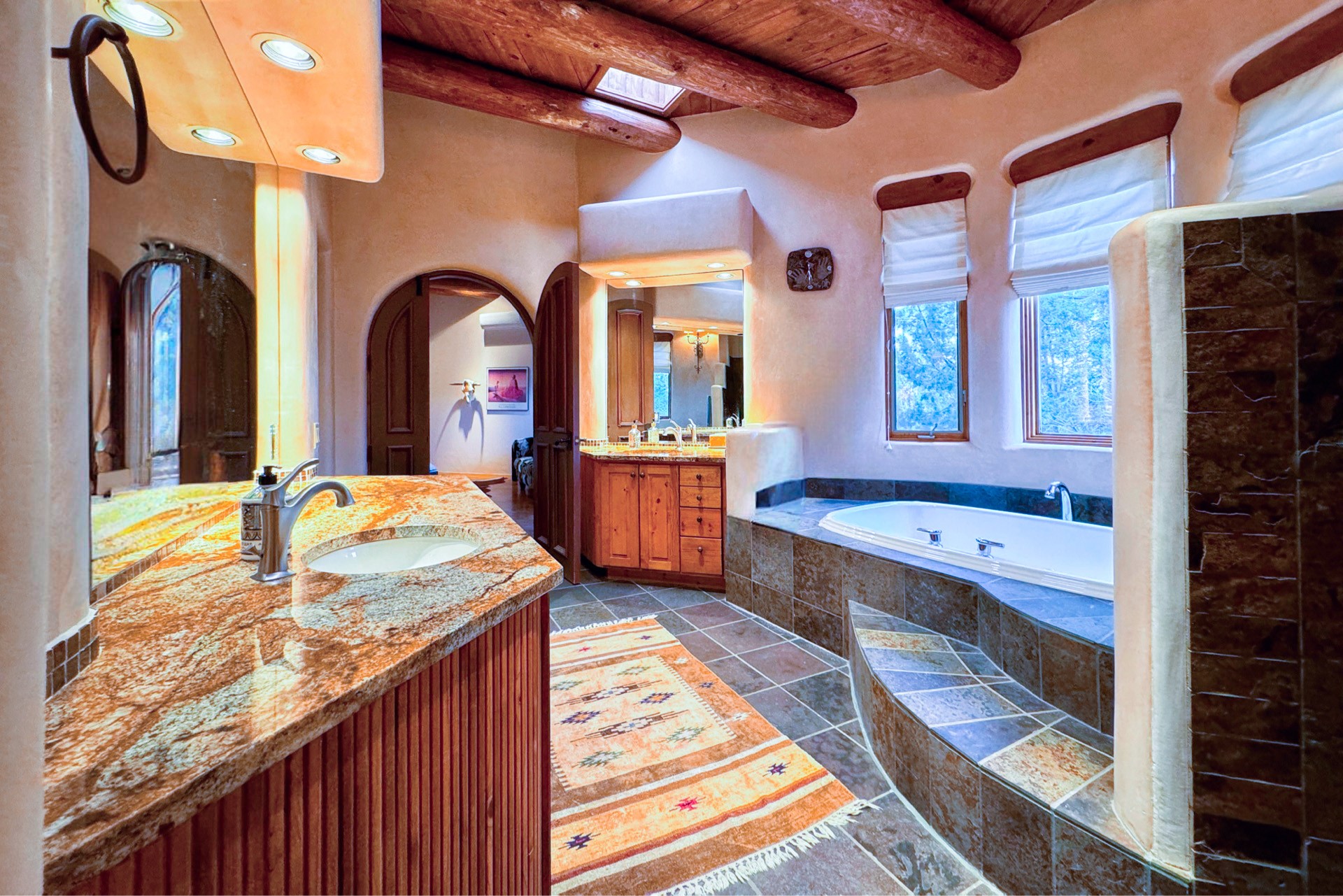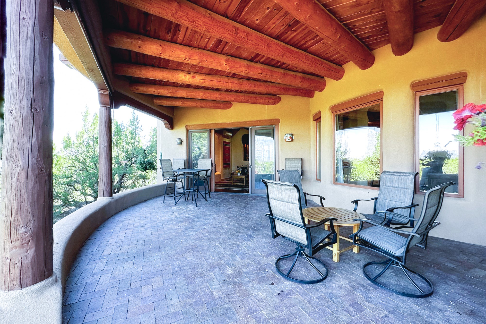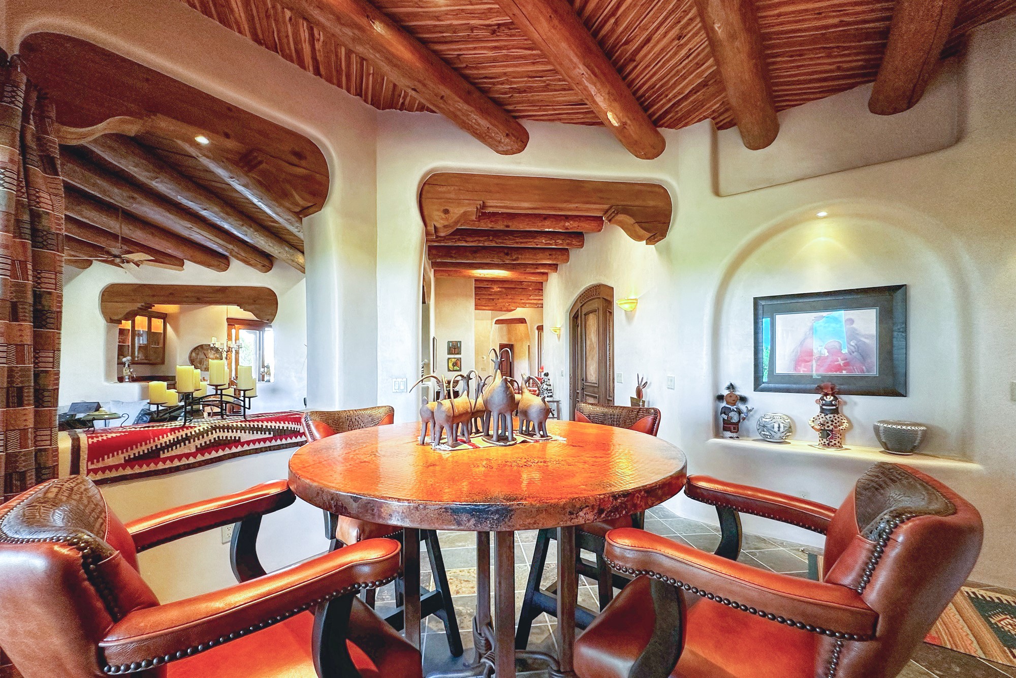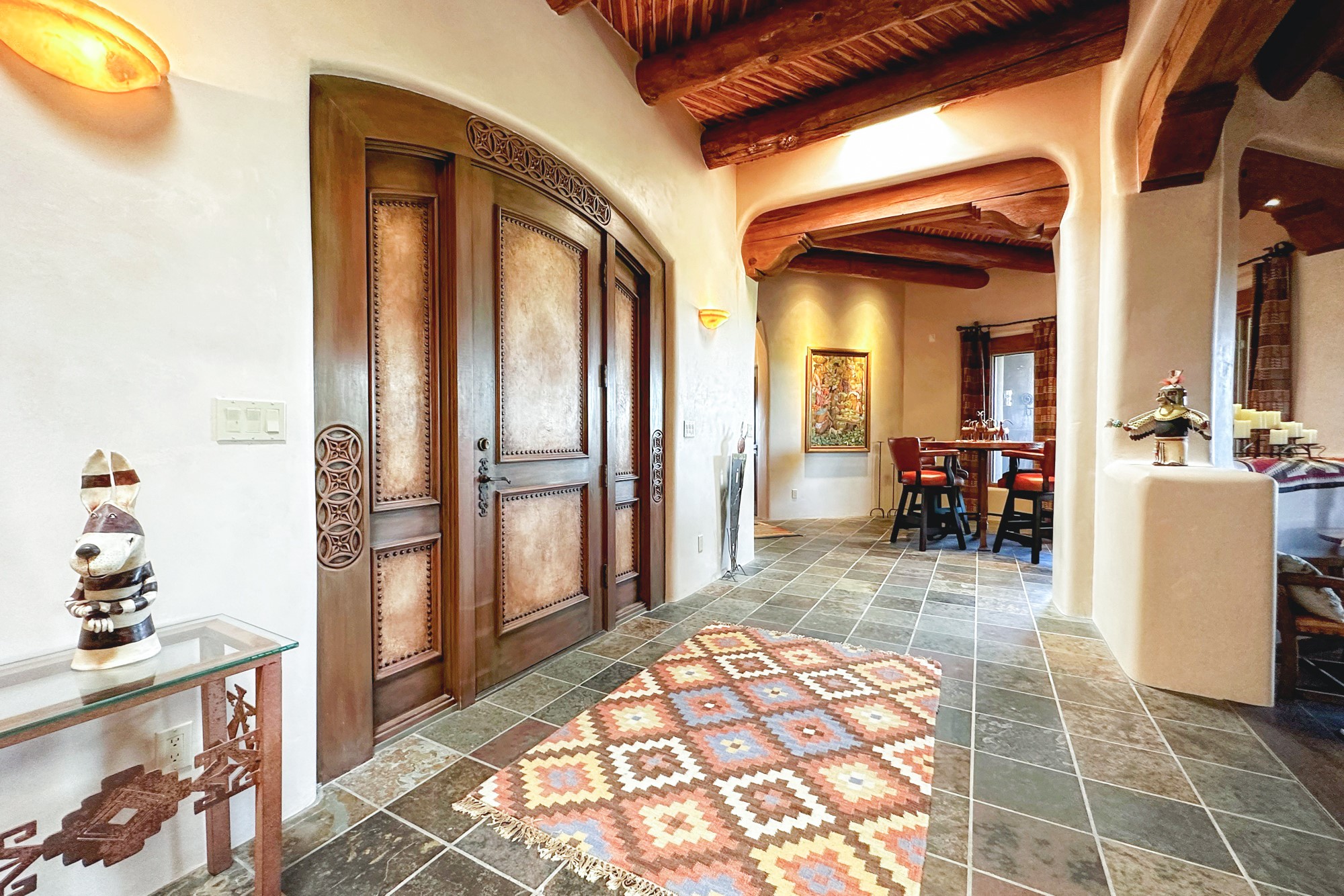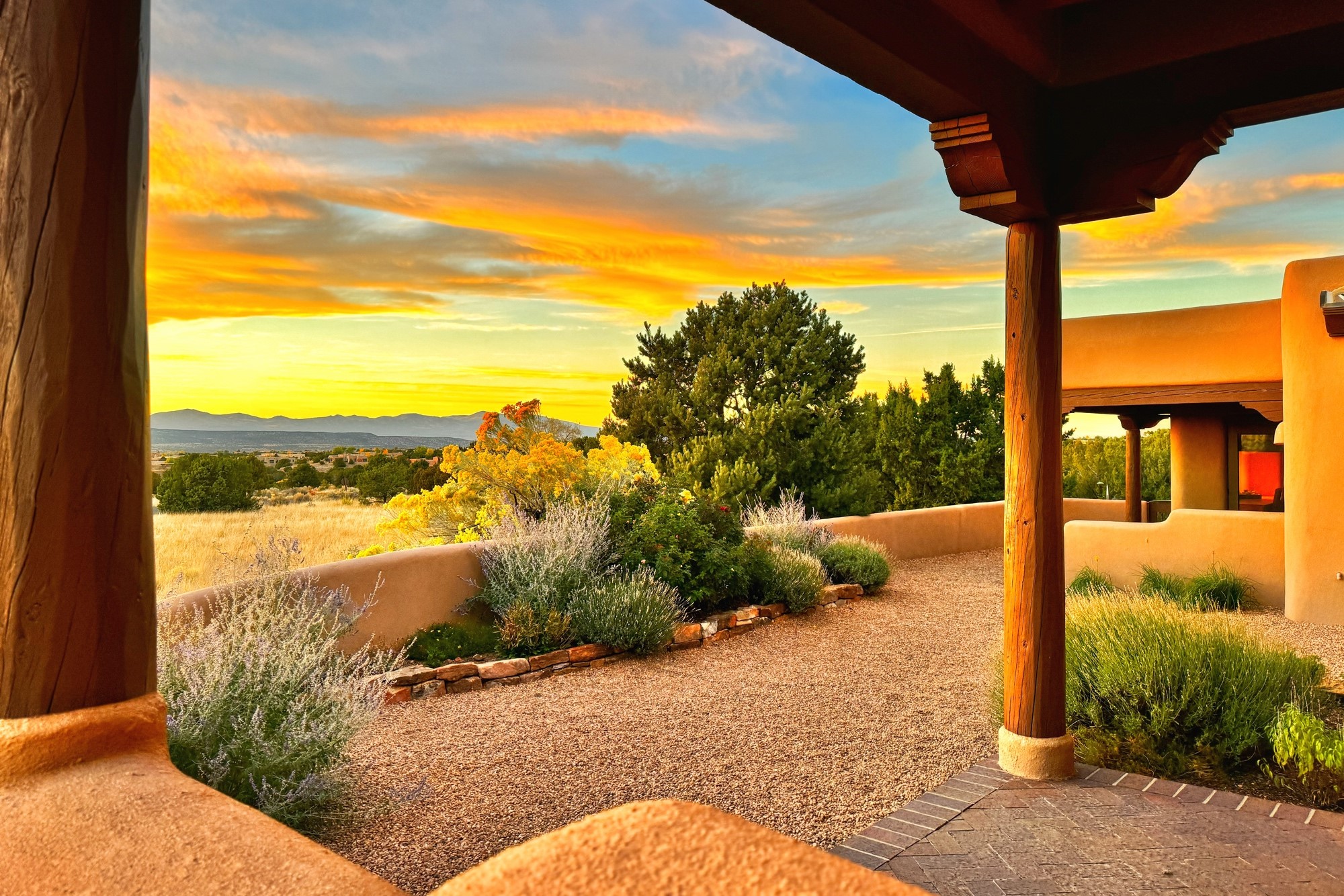 This extraordinary Santa Fe Estate is situated in the renowned Estate III of Las Campanas, offering the epitome of luxury and the comfort of Santa Fe Hacienda-style living. Upon arrival, a breathtaking courtyard welcomes you, with sweeping mountain vistas and expansive skies as your backdrop. The outdoor living spaces have been carefully designed to enhance your experience, featuring private portals, gardens, and patios, plus a cherished rooftop deck providing 360-degree views. In addition to the main house, a separate freshly painted 1,114 sq. ft. guesthouse awaits, complete with a full kitchen, washer and dryer, a custom murphy bed, a delightful portal, and patio for the ultimate in guest comfort, whether for short or extended stays. This custom-built home by Madera in 1998 boasts an array of features, including three Kiva fireplaces, soaring 16-foot ceilings, an inviting Chef's Kitchen with an eat-in area, formal dining space, and a combination of slate and wood flooring throughout. Brand new countertops in bathroom and kitchen. You'll find custom built-ins in every room, with bookshelves, desks, and a murphy bed thoughtfully incorporated in the office space. Traditional design elements like ceiling beams, vigas, latillas, lentils, and hand-carved doors adorn both the guesthouse and the main residence. Additional amenities include an oversized 3.5-car garage, radiant heating, and mini-splits throughout the property. The Club at Las Campanas membership is optional and subject to approval. Please note that there is not Kitech or Entran.