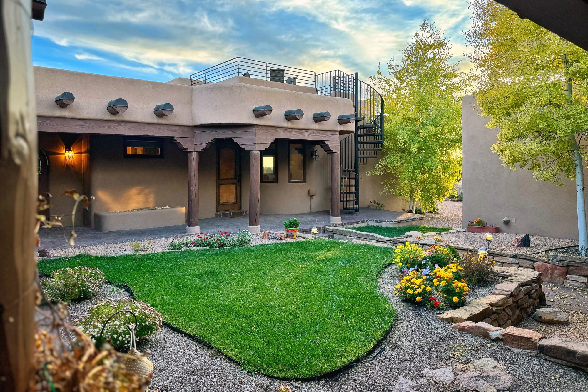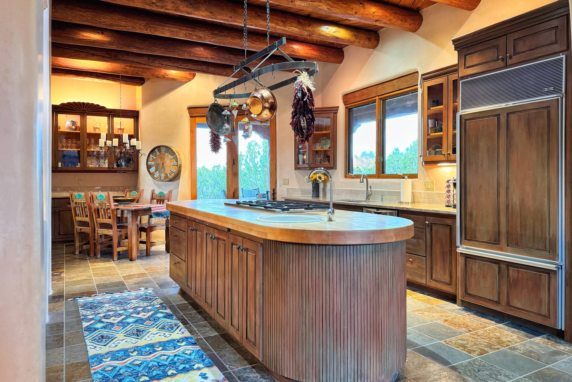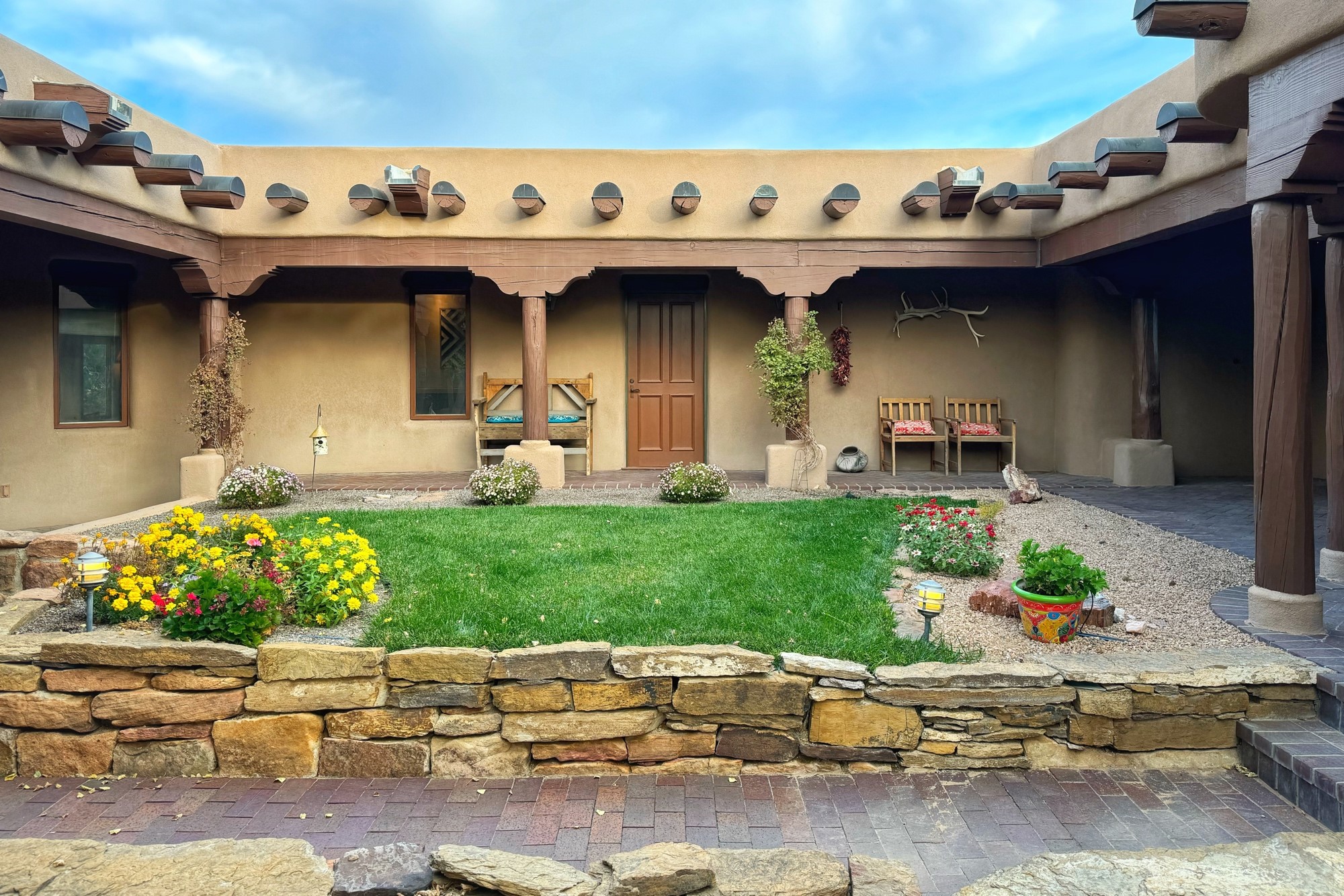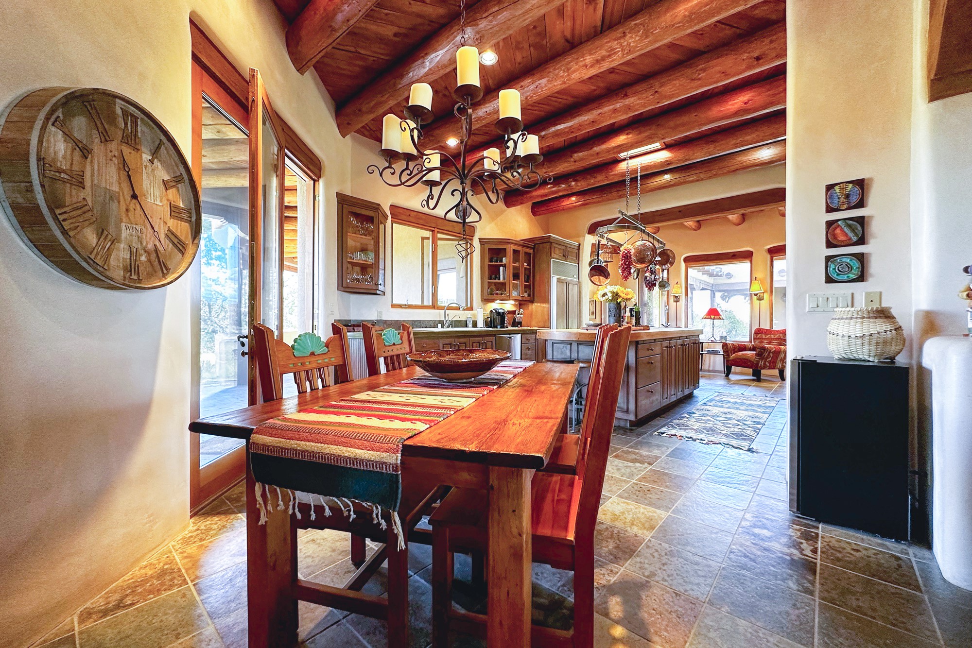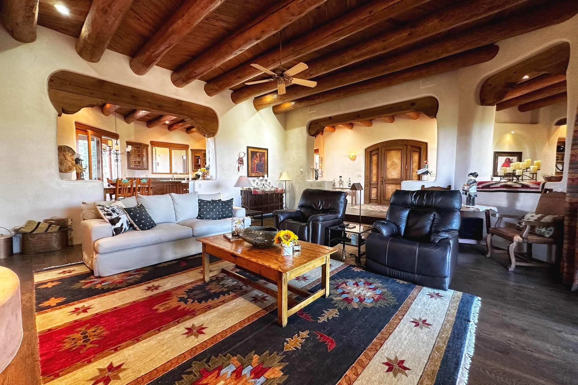 This extraordinary Santa Fe Estate is situated in the renowned Estate III of Las Campanas, offering the epitome of luxury and the comfort of Santa Fe Hacienda-style living. Upon arrival, a breathtaking courtyard welcomes you, with sweeping mountain vistas and expansive skies as your backdrop. The outdoor living spaces have been carefully designed to enhance your experience, featuring private portals, gardens, and patios, plus a cherished rooftop deck providing 360-degree views. In addition to the main house, a separate freshly painted 1,114 sq. ft. guesthouse awaits, complete with a full kitchen, washer and dryer, a custom murphy bed, a delightful portal, and patio for the ultimate in guest comfort, whether for short or extended stays. This custom-built home by Madera in 1998 boasts an array of features, including three Kiva fireplaces, soaring 16-foot ceilings, an inviting Chef's Kitchen with an eat-in area, formal dining space, and a combination of slate and wood flooring throughout. Brand new countertops in bathroom and kitchen. You'll find custom built-ins in every room, with bookshelves, desks, and a murphy bed thoughtfully incorporated in the office space. Traditional design elements like ceiling beams, vigas, latillas, lentils, and hand-carved doors adorn both the guesthouse and the main residence. Additional amenities include an oversized 3.5-car garage, radiant heating, and mini-splits throughout the property. The Club at Las Campanas membership is optional and subject to approval. Please note that there is not Kitech or Entran.