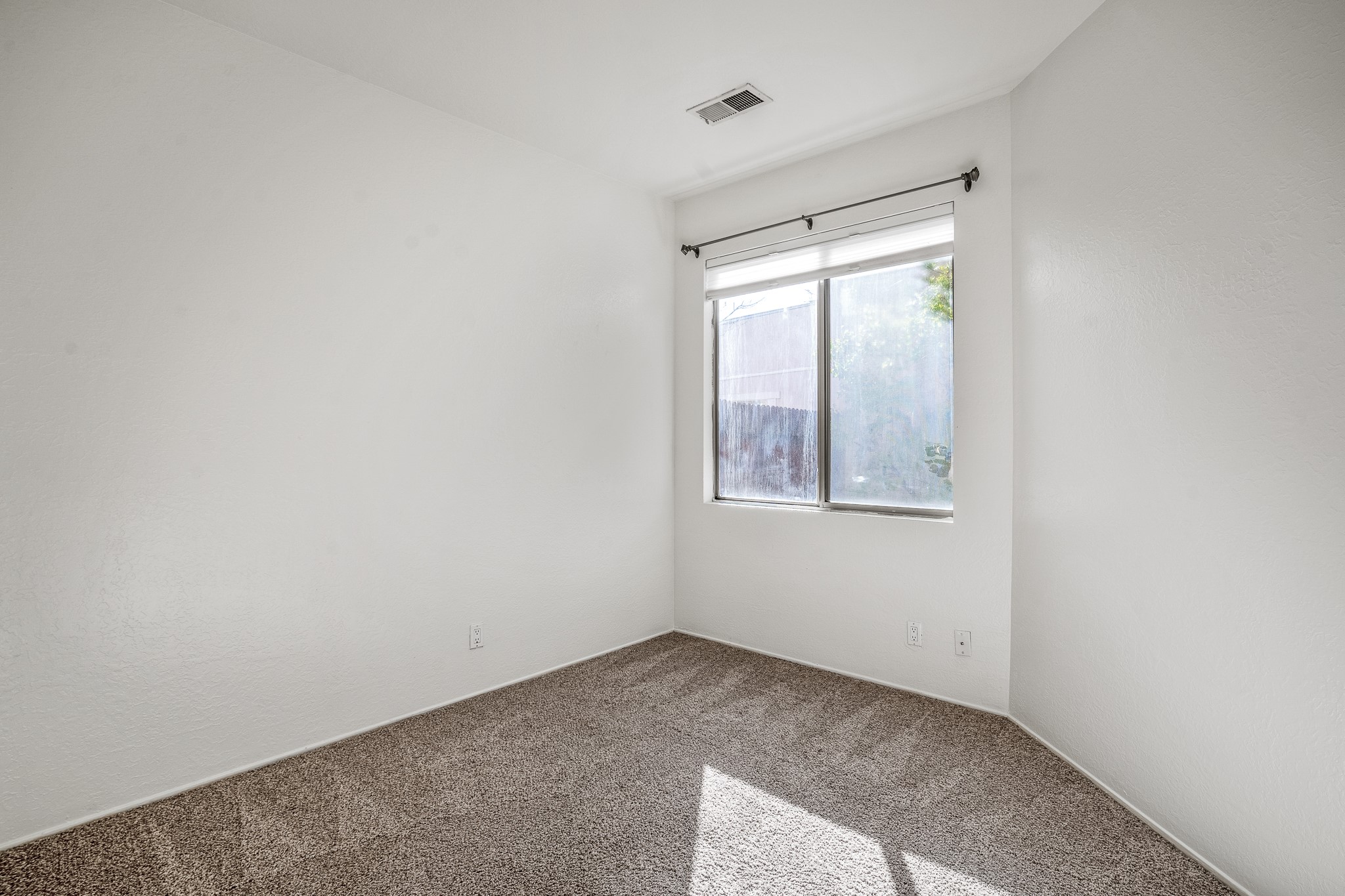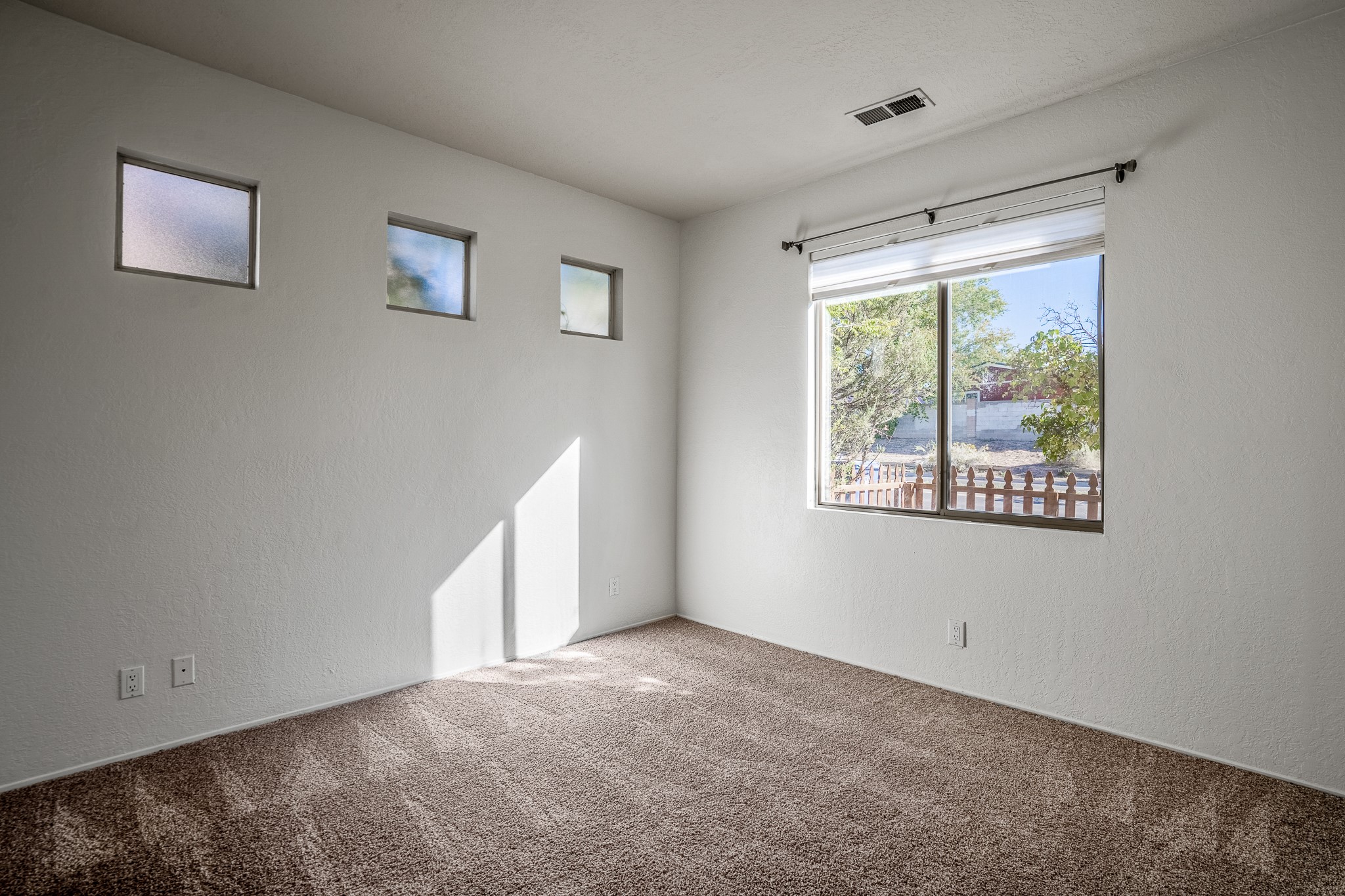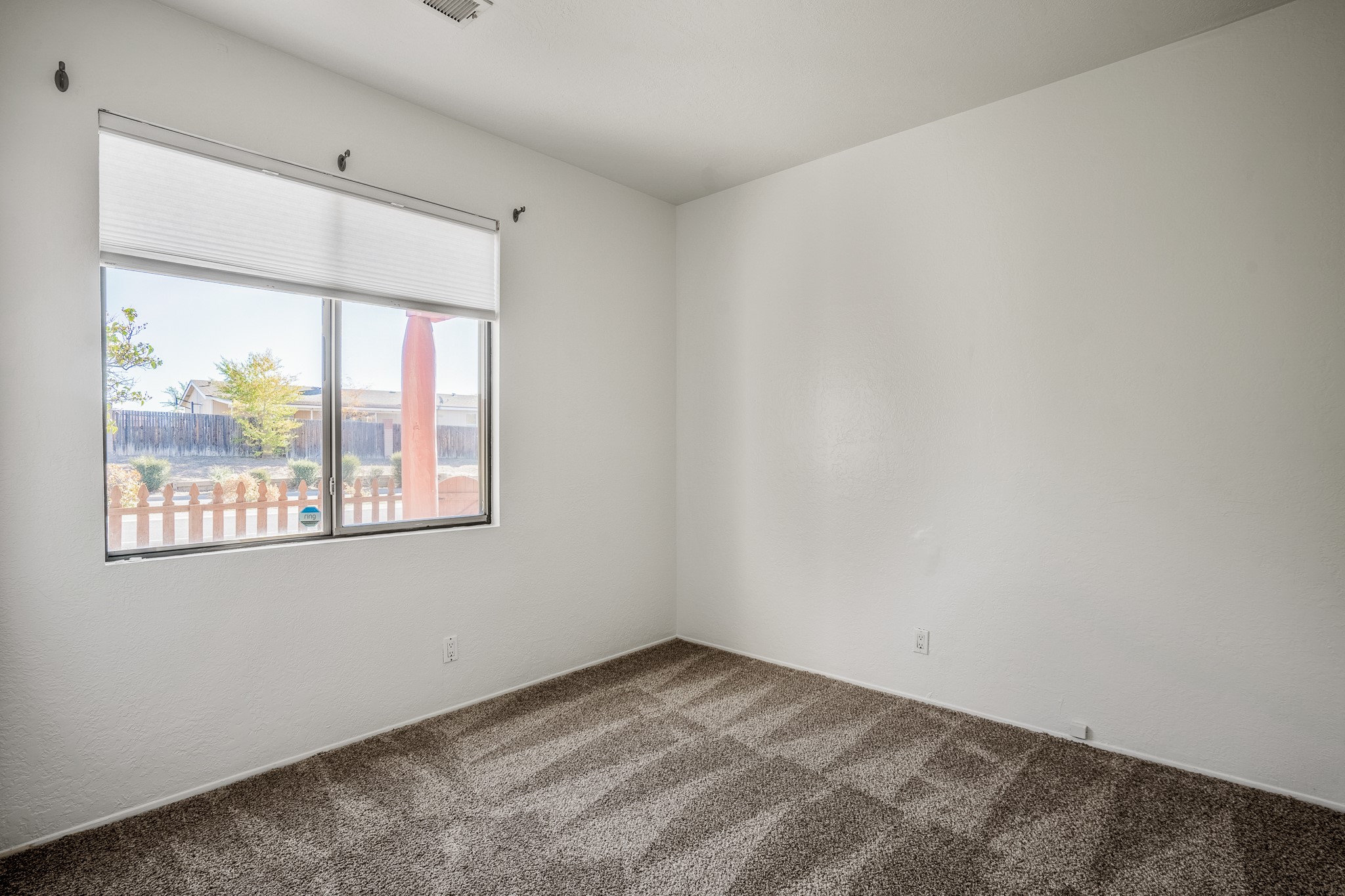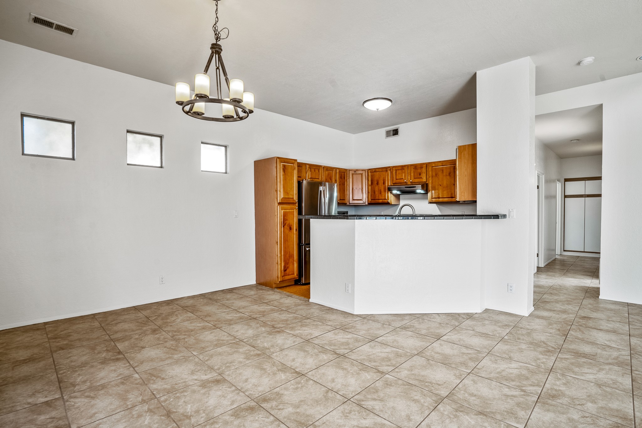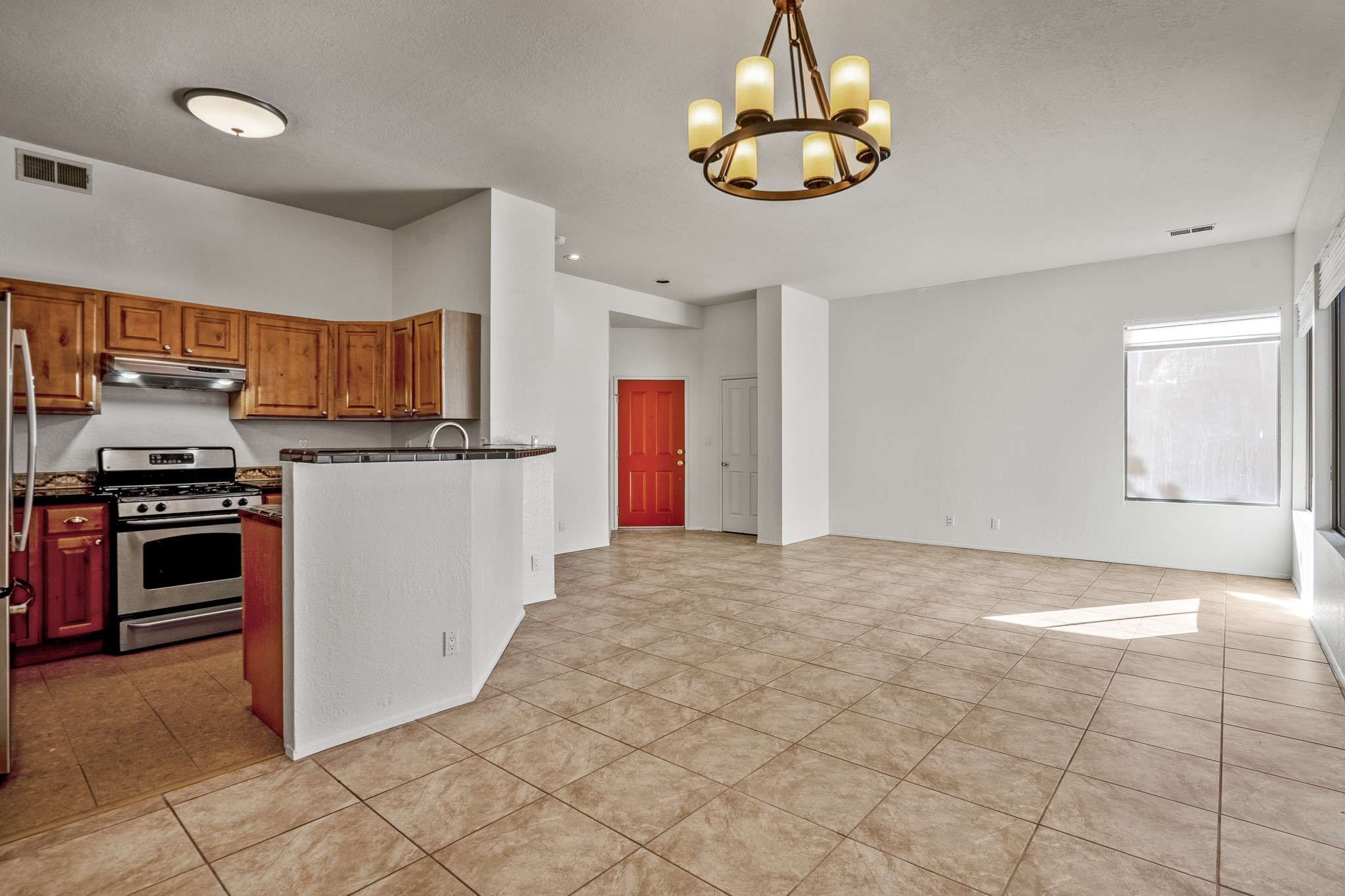 Come see this fantastic single level home with soaring ceilings and tons of natural light. The floor plan makes for easy living with a large kitchen / living room / dining space and three spacious bedrooms. The outdoor space is spacious yet manageable, allowing for easy indoor - outdoor living. There is even a large two car garage and central air. Located near shopping, schools, parks, walking trails, and easy access to 599, the Santa Fe Regional Airport and I-25.