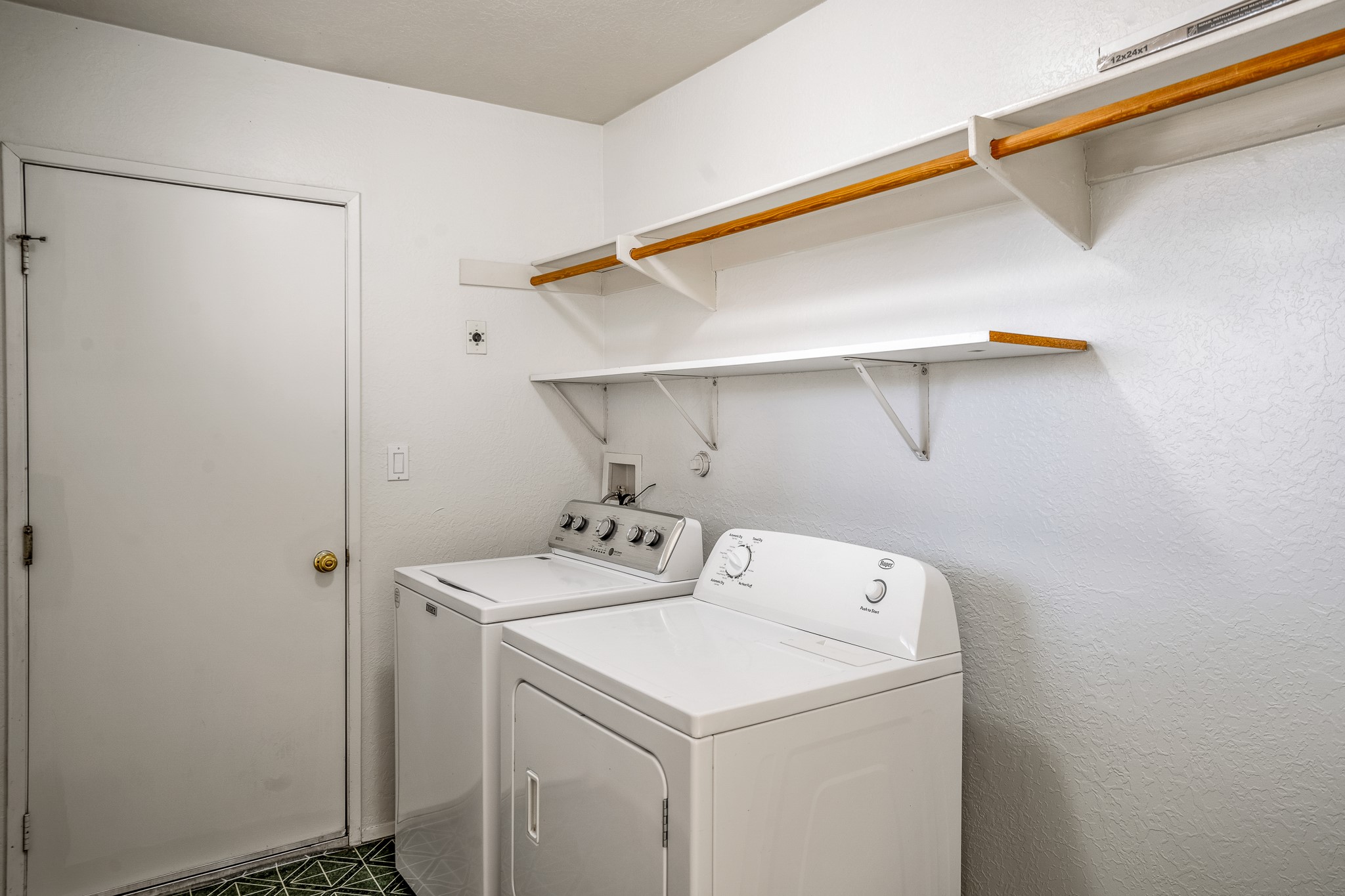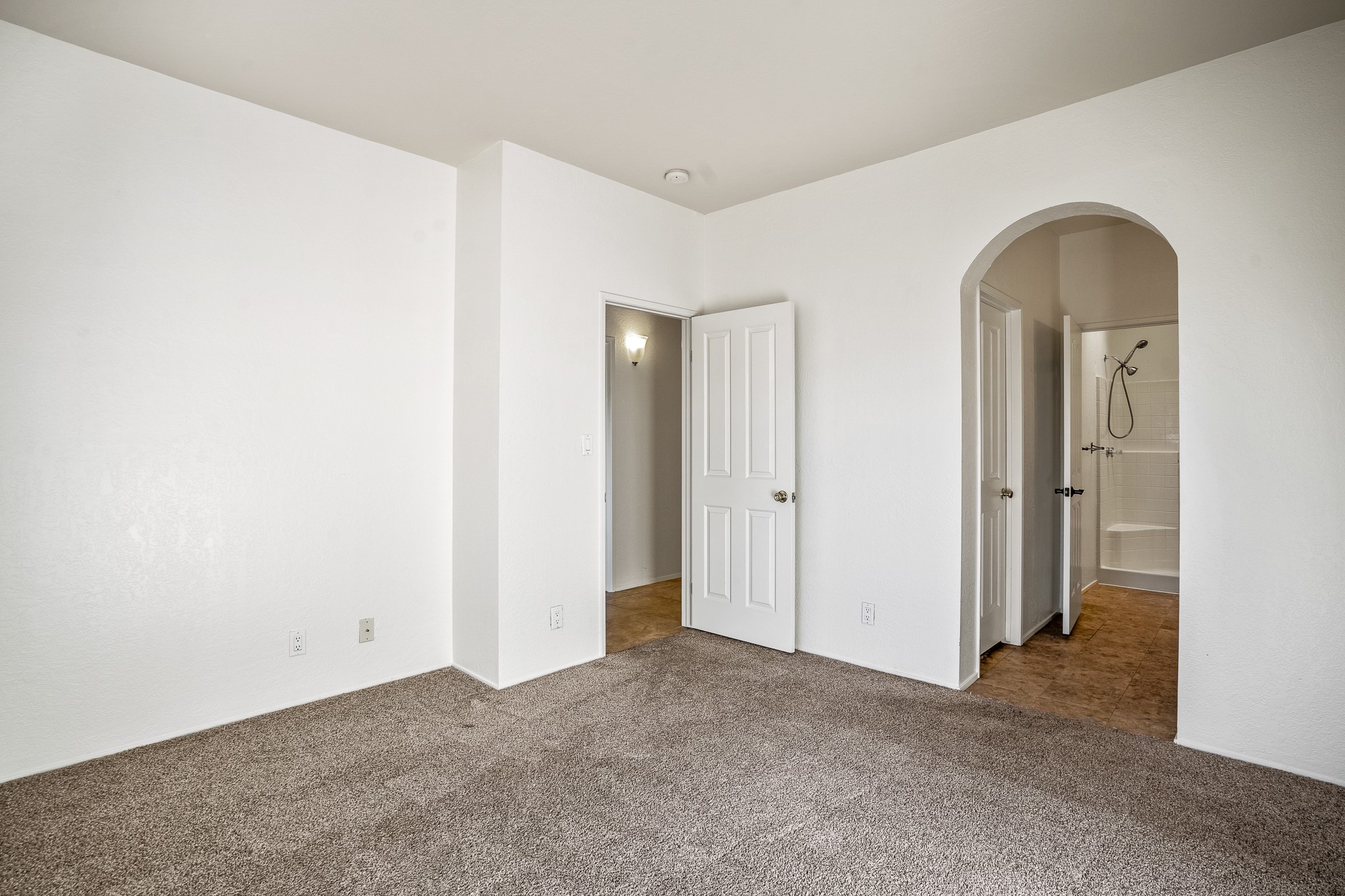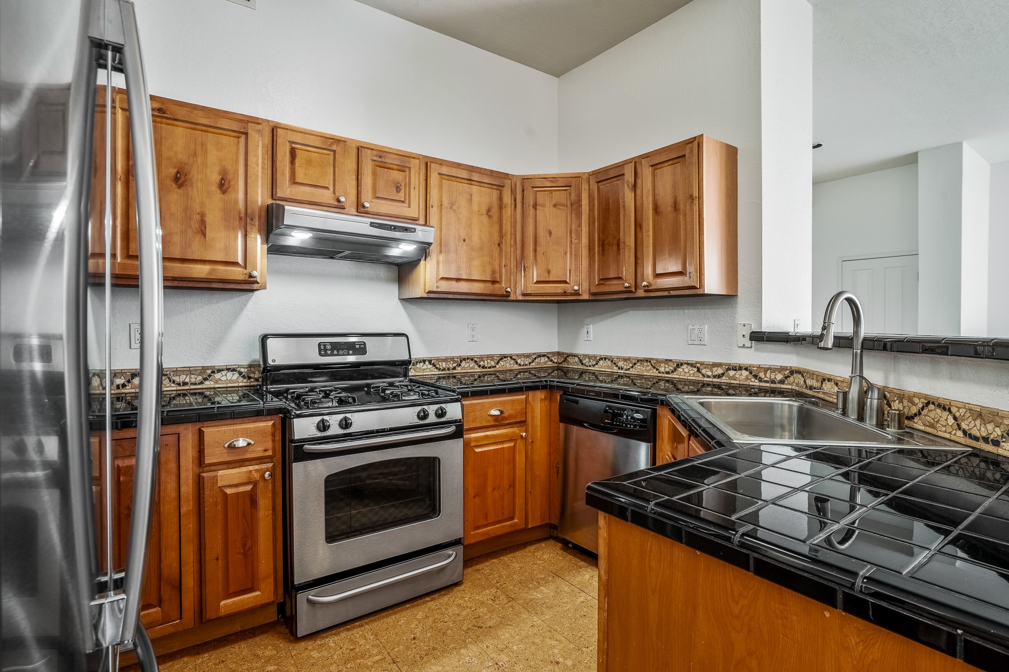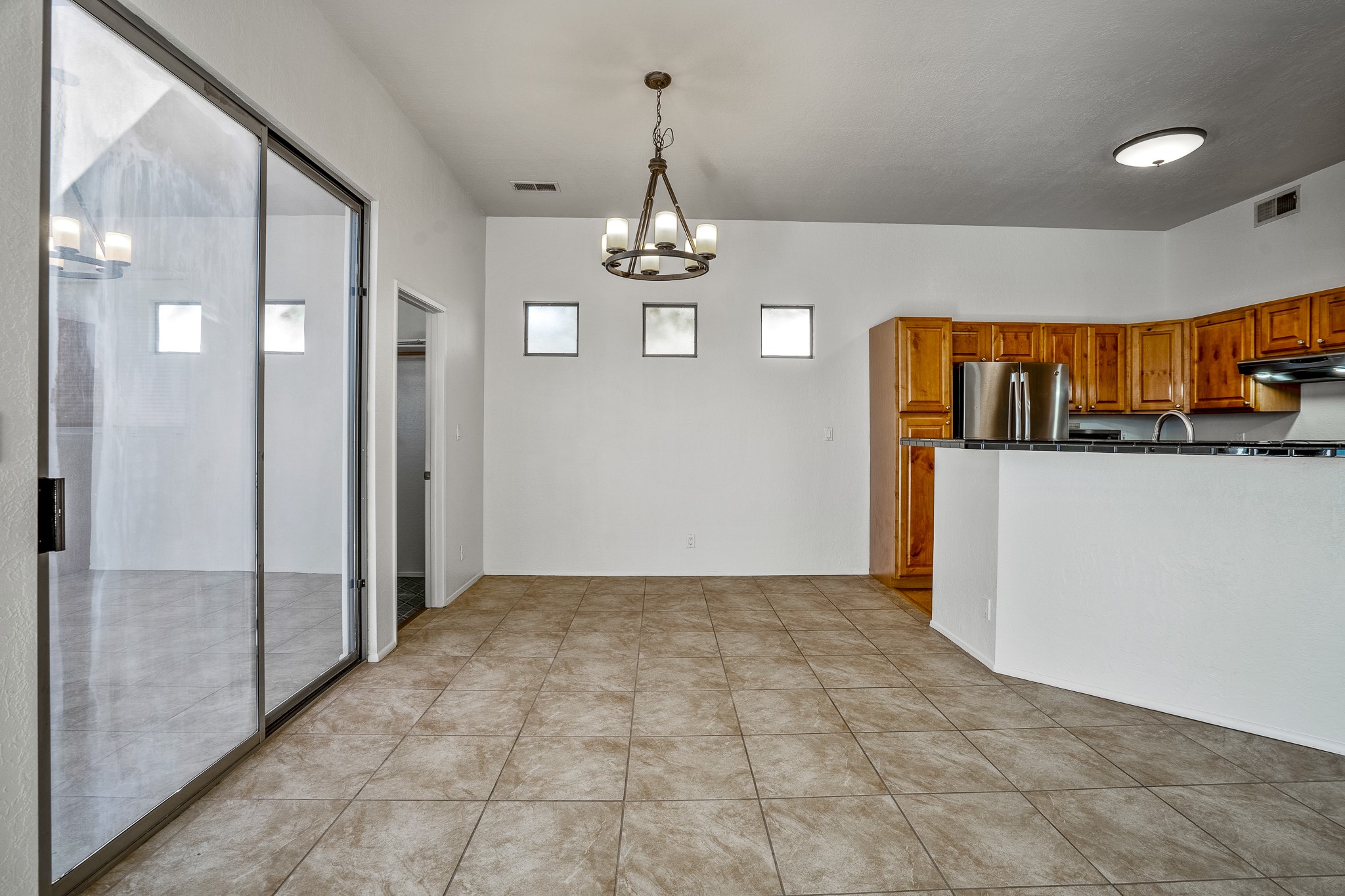 Come see this fantastic single level home with soaring ceilings and tons of natural light. The floor plan makes for easy living with a large kitchen / living room / dining space and three spacious bedrooms. The outdoor space is spacious yet manageable, allowing for easy indoor - outdoor living. There is even a large two car garage and central air. Located near shopping, schools, parks, walking trails, and easy access to 599, the Santa Fe Regional Airport and I-25.