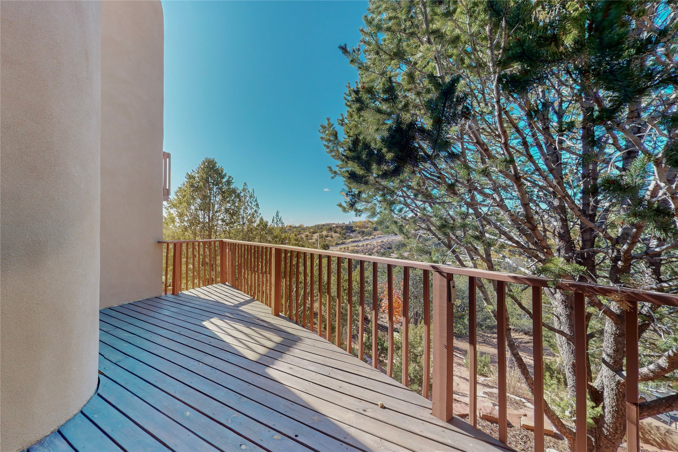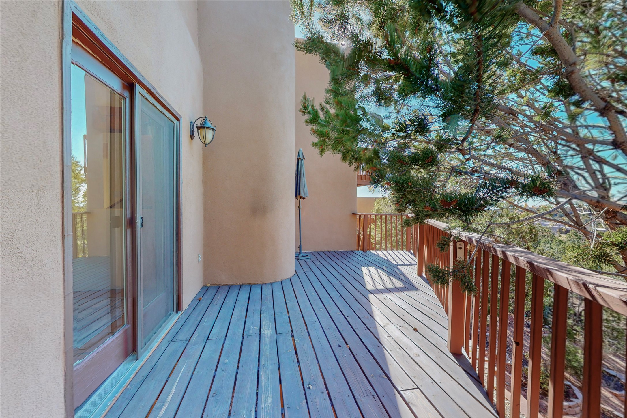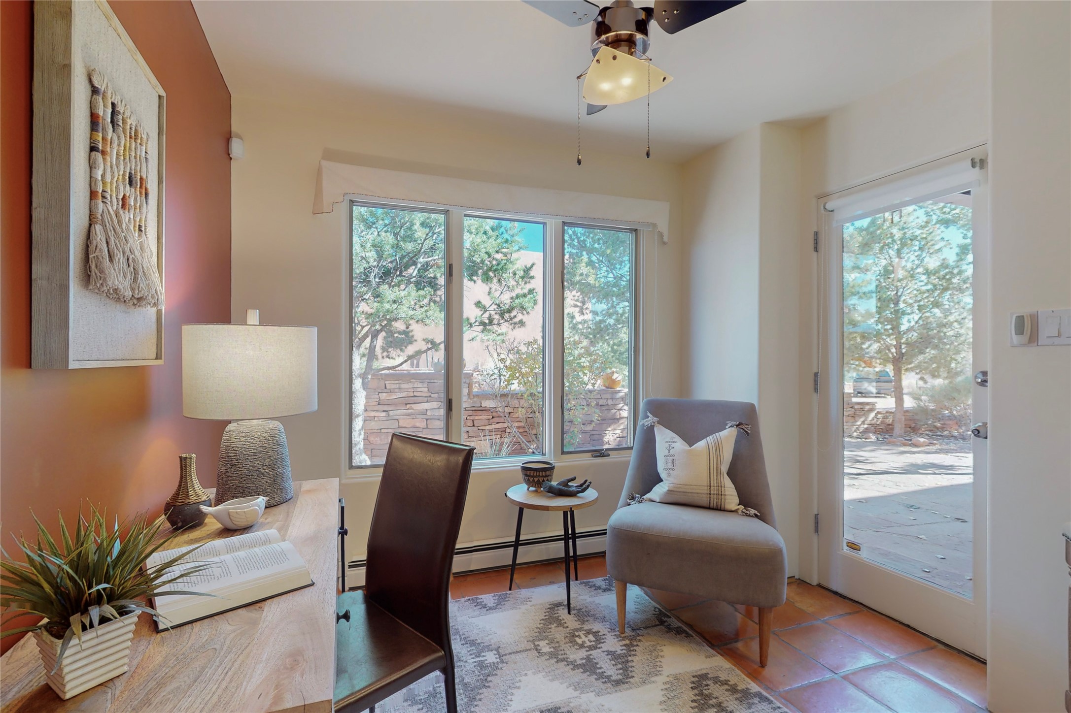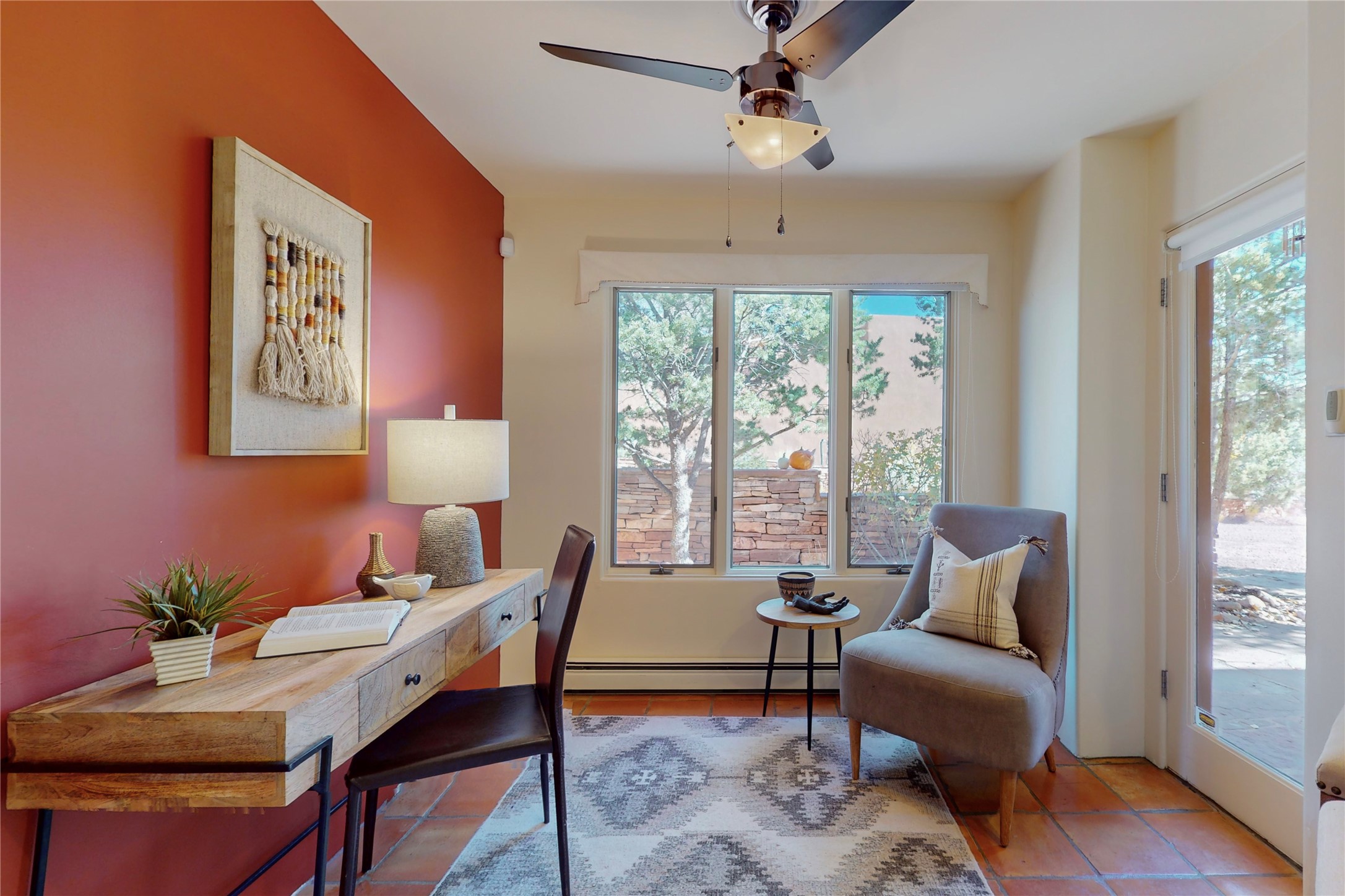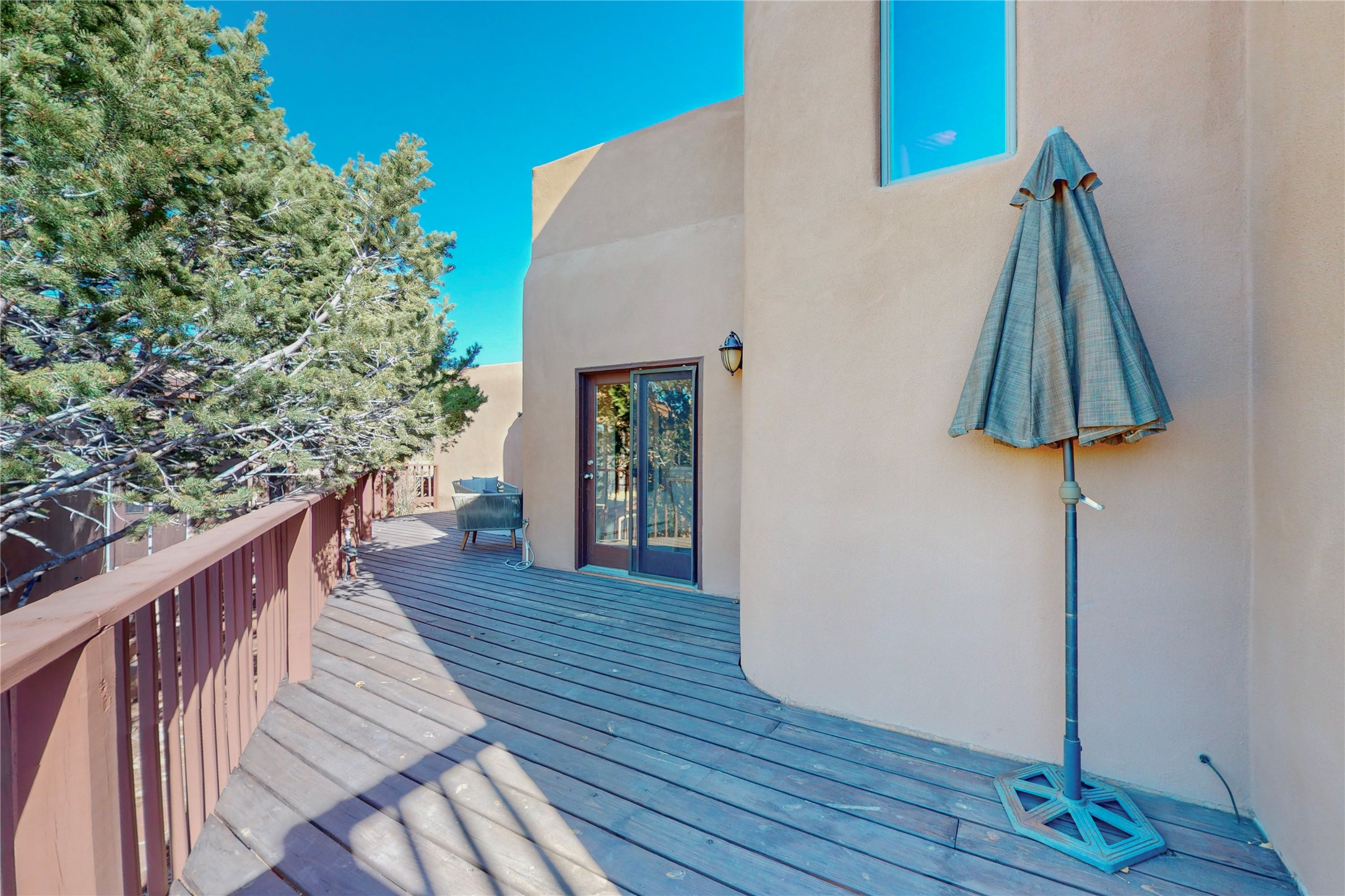 These homes are rarely available and so close to historic and downtown Santa Fe. This remodeled 2 story, 2 bedroom, 2 bath home has an open feeling with a lot of natural light. In keeping with the pueblo style, it has vigas, latillas and high ceilings. The home is on a cul-de-sac. Nice sunset views can be enjoyed from the back deck. There is formal and informal dining and a well-appointed spacious upgraded kitchen with a large pantry. An attached two car garage and Solar photovoltaic panels completes this offering. Estancia Primera has a clubhouse with a kitchen, an outdoor swimming pool, tennis and racquetball courts.