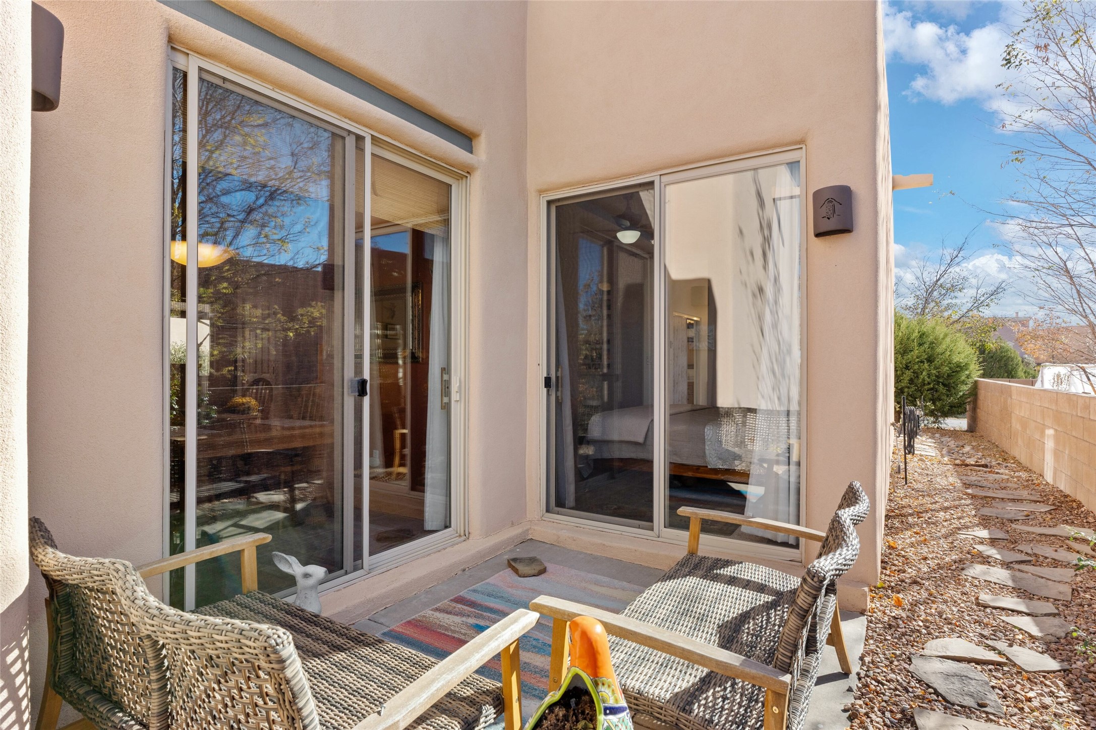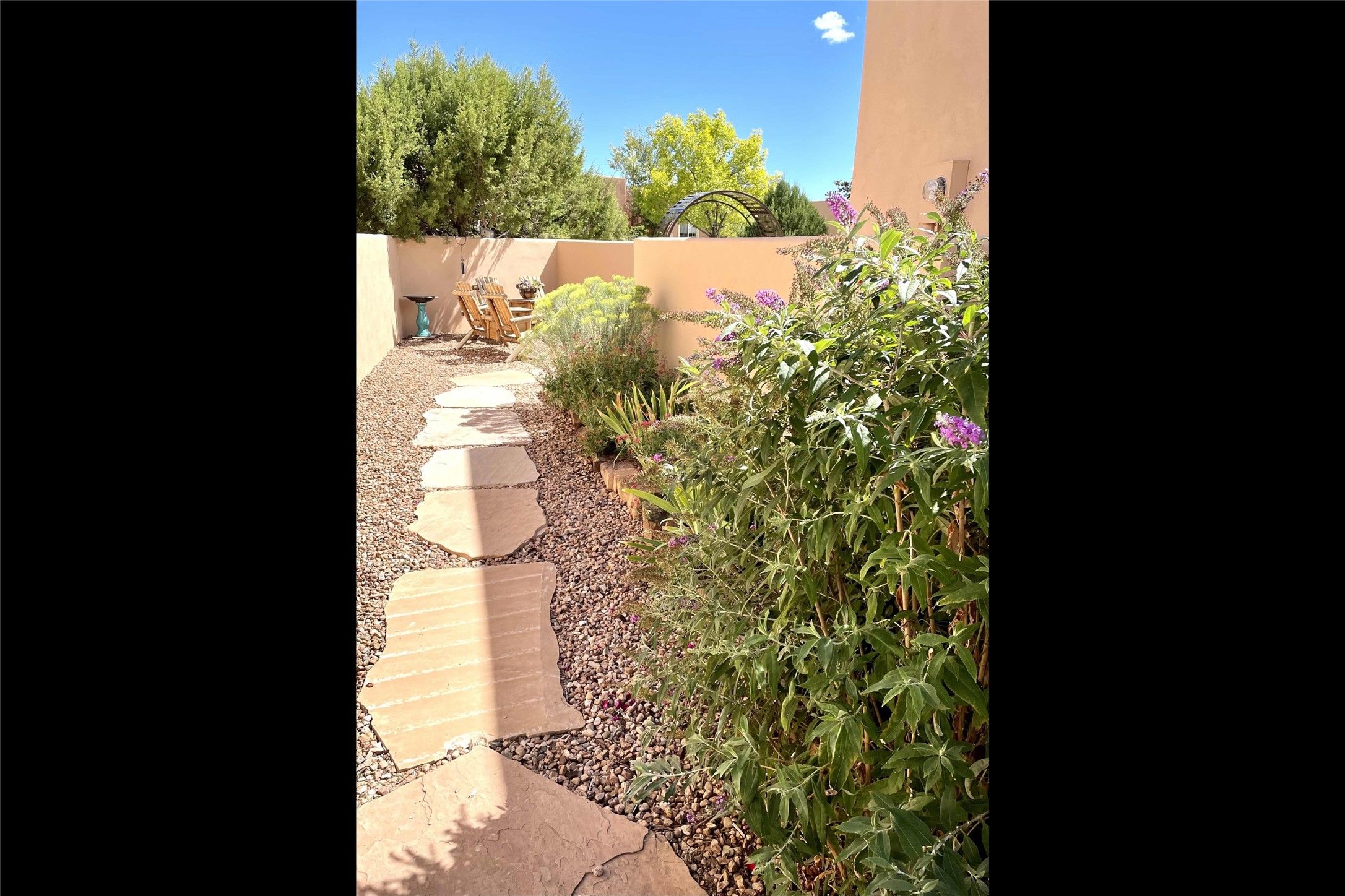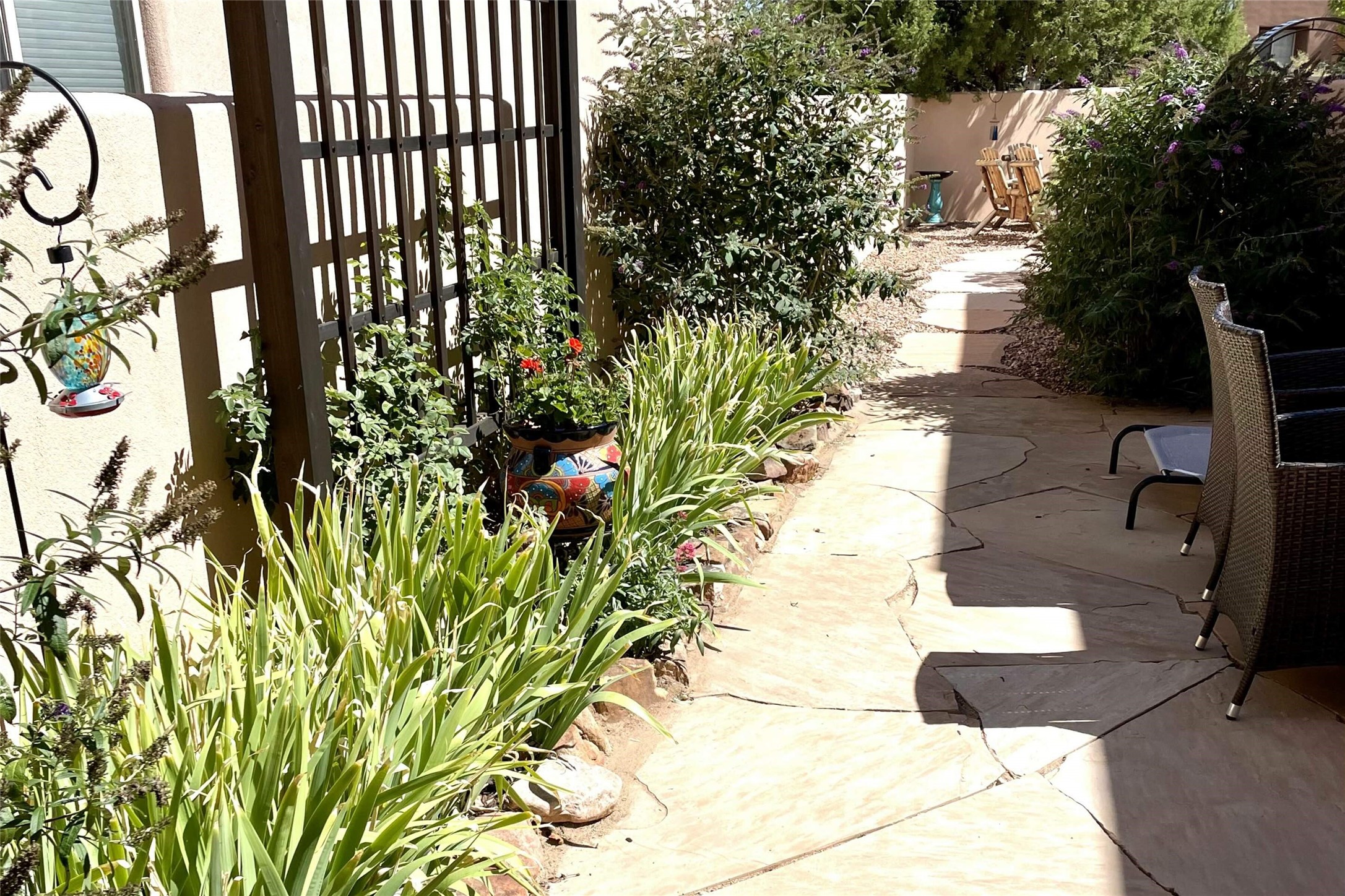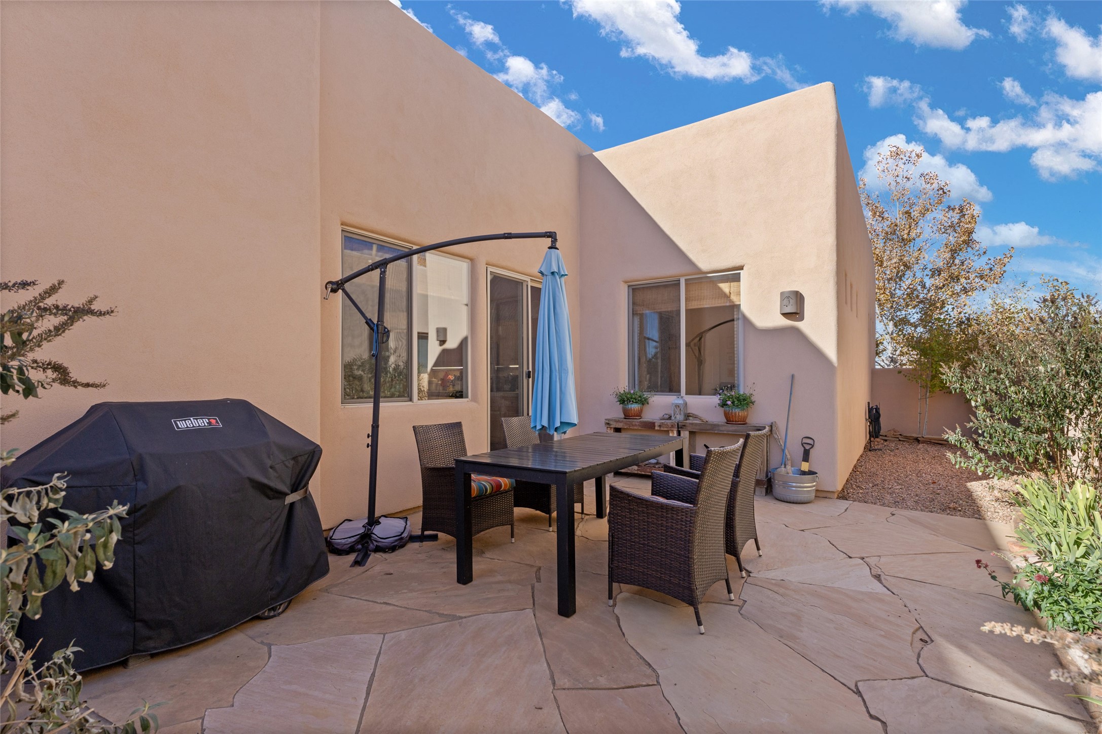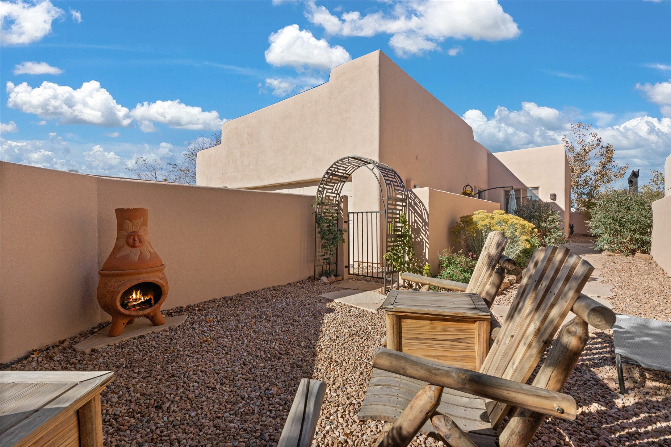 This beautiful single level home in the desirable Rancho Viejo neighborhood is filled with Santa Fe charm. The handcrafted wood entry door welcomes you to this traditional and timeless Santa Fe architecture & design. The high ceilings in the entry, living room and dining area are carefully crafted with rounded Vigas and T&G finishes. Terra Cotta colored gas Kiva fireplace in the cozy living room for those cold winter evenings. Dining room is adjacent to the living room and kitchen - an ideal layout for entertaining. The kitchen is spacious with a raised bar top seating area, as well as a large island. The bedroom layout is ideal with the two spare bedrooms and bath on one wing, and the primary bedroom and bath on another wing which offers lots of privacy. The primary bathroom has recently been beautifully remodeled, with a large walk-in shower and custom vanity. A sliding door from the primary bedroom, as well as the dining room, lead to small patio - ideal for your morning coffee or tea. An enclosed yard is located thru the sliding door of the kitchen, with an incredible flagstone patio, garden area, mature shrubs and aspen trees, plus extra space to enjoy the beauty of your surroundings. A small neighborhood park is just outside the back of the property, near the driveway to the two car garage. From the front of the property, near the corner of Chili Line Rd. & San Antonio Peak, there is access to one of the many trailheads throughout Rancho Viejo. One block away from this home is one of the largest parks in Rancho Viejo. Pride of ownership is clearly seen in this meticulously cared for home. New evaporative cooler in 2022 and new kitchen appliances in 2021. Seller has raised the wall height to the enclosed yard for added privacy. Secondary fridge in garage conveys.