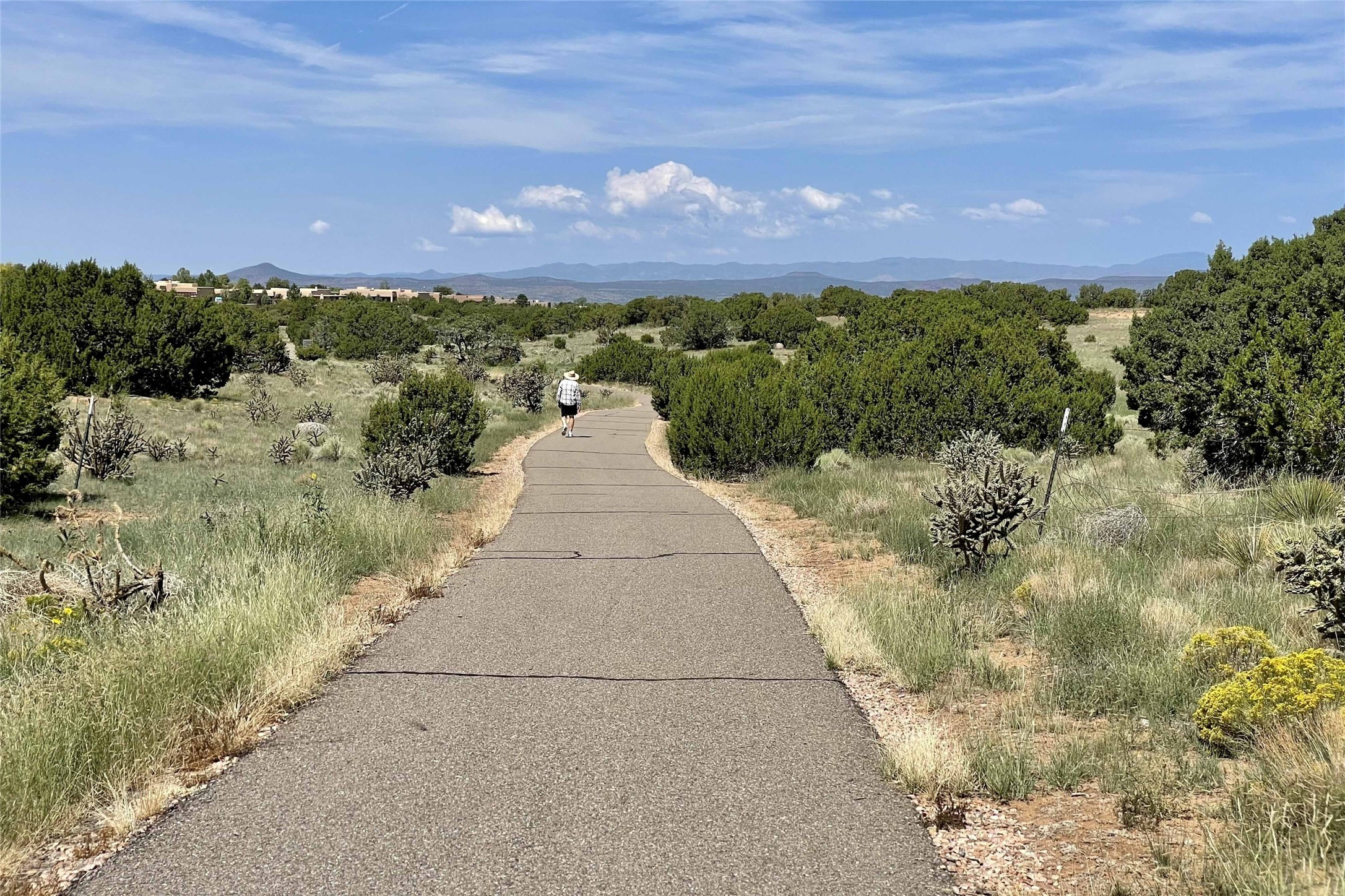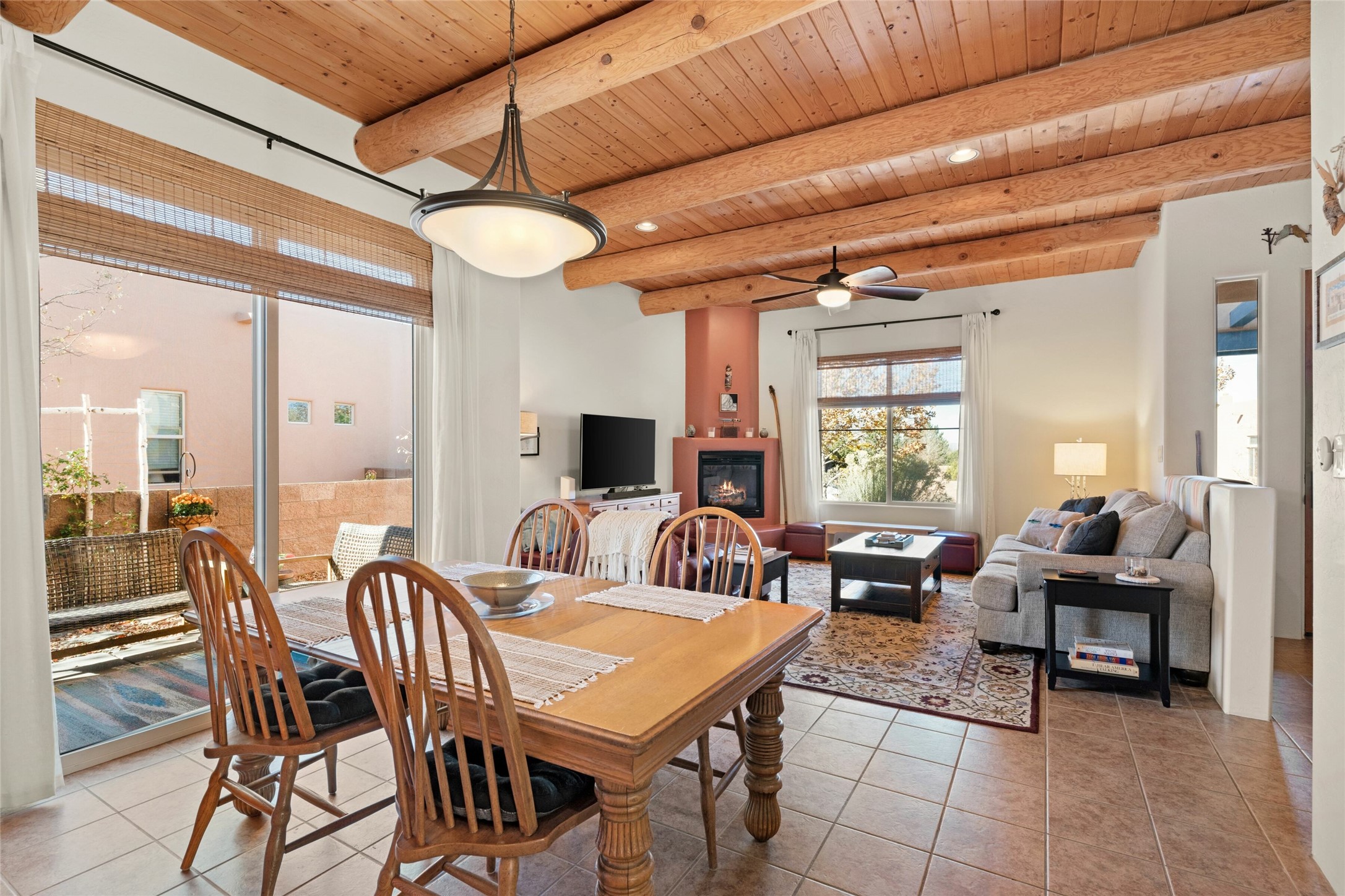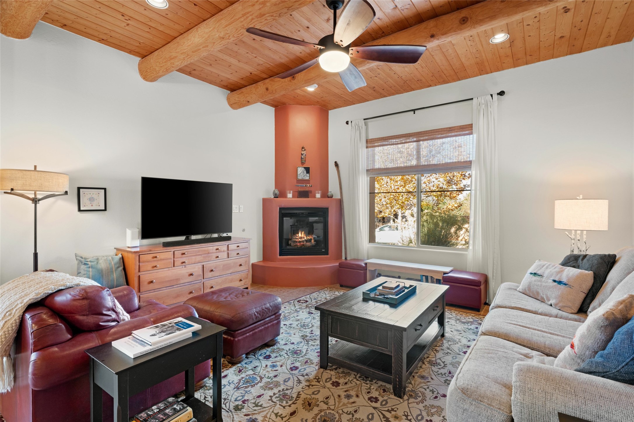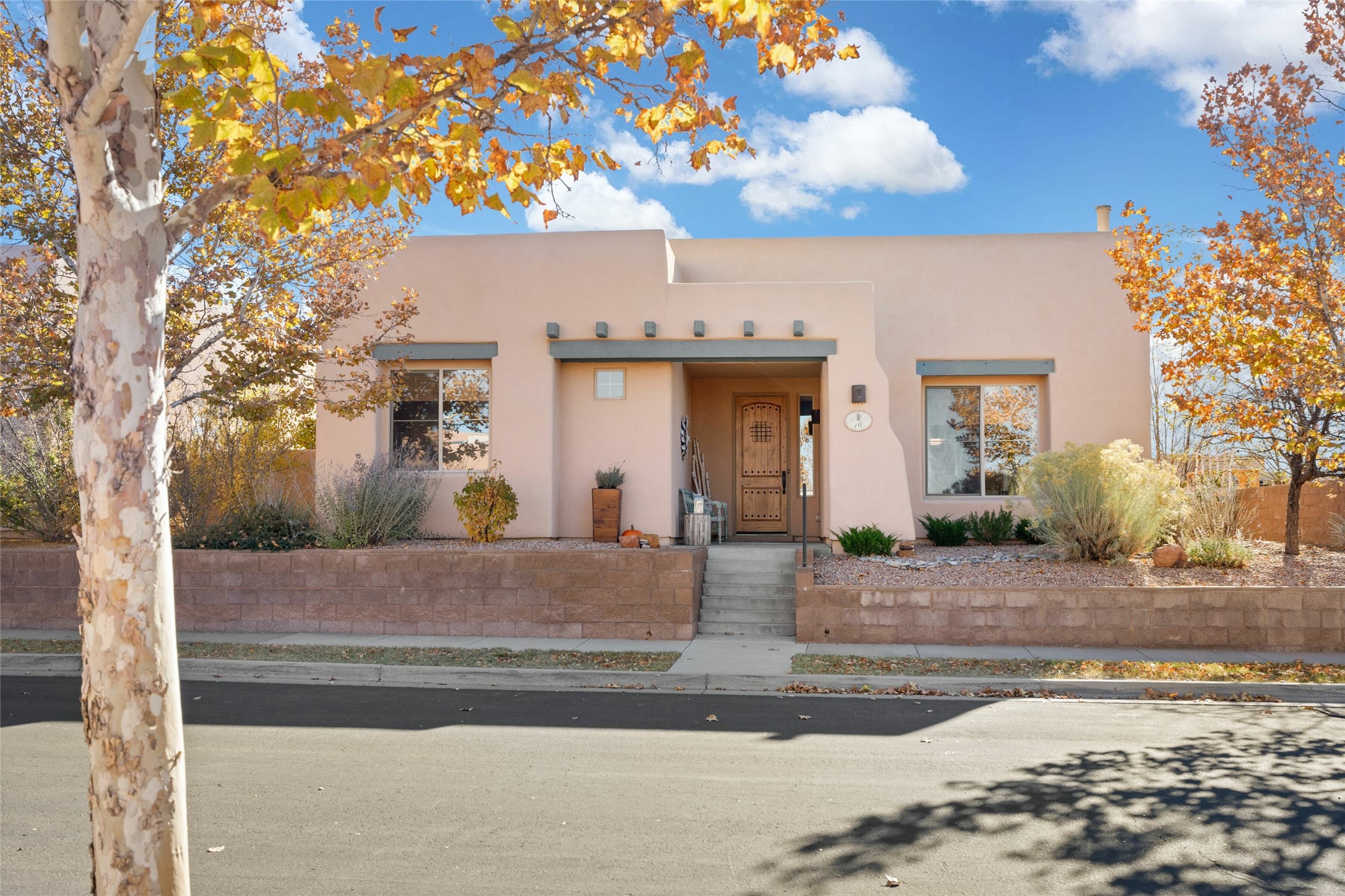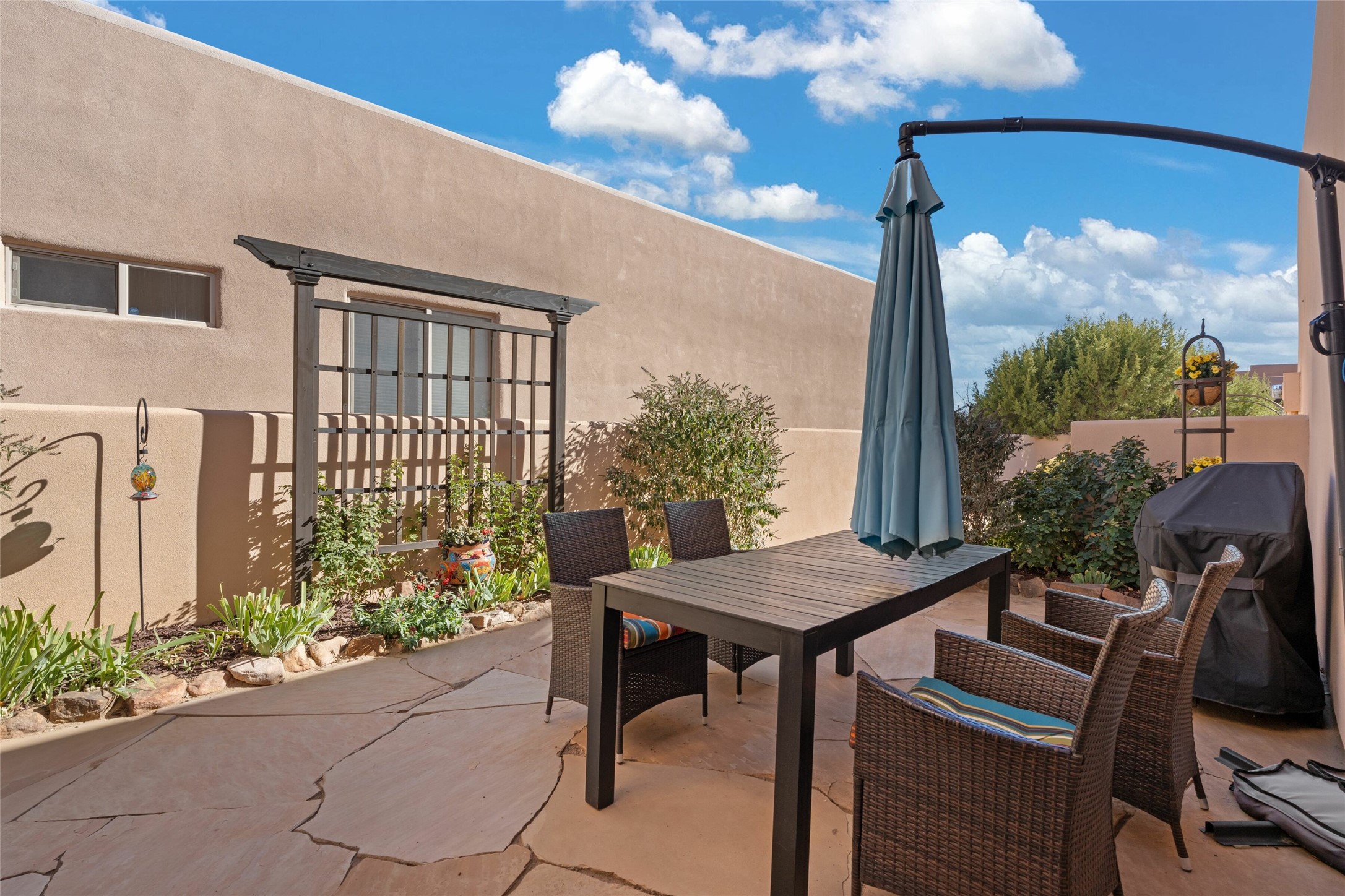 This beautiful single level home in the desirable Rancho Viejo neighborhood is filled with Santa Fe charm. The handcrafted wood entry door welcomes you to this traditional and timeless Santa Fe architecture & design. The high ceilings in the entry, living room and dining area are carefully crafted with rounded Vigas and T&G finishes. Terra Cotta colored gas Kiva fireplace in the cozy living room for those cold winter evenings. Dining room is adjacent to the living room and kitchen - an ideal layout for entertaining. The kitchen is spacious with a raised bar top seating area, as well as a large island. The bedroom layout is ideal with the two spare bedrooms and bath on one wing, and the primary bedroom and bath on another wing which offers lots of privacy. The primary bathroom has recently been beautifully remodeled, with a large walk-in shower and custom vanity. A sliding door from the primary bedroom, as well as the dining room, lead to small patio - ideal for your morning coffee or tea. An enclosed yard is located thru the sliding door of the kitchen, with an incredible flagstone patio, garden area, mature shrubs and aspen trees, plus extra space to enjoy the beauty of your surroundings. A small neighborhood park is just outside the back of the property, near the driveway to the two car garage. From the front of the property, near the corner of Chili Line Rd. & San Antonio Peak, there is access to one of the many trailheads throughout Rancho Viejo. One block away from this home is one of the largest parks in Rancho Viejo. Pride of ownership is clearly seen in this meticulously cared for home. New evaporative cooler in 2022 and new kitchen appliances in 2021. Seller has raised the wall height to the enclosed yard for added privacy. Secondary fridge in garage conveys.