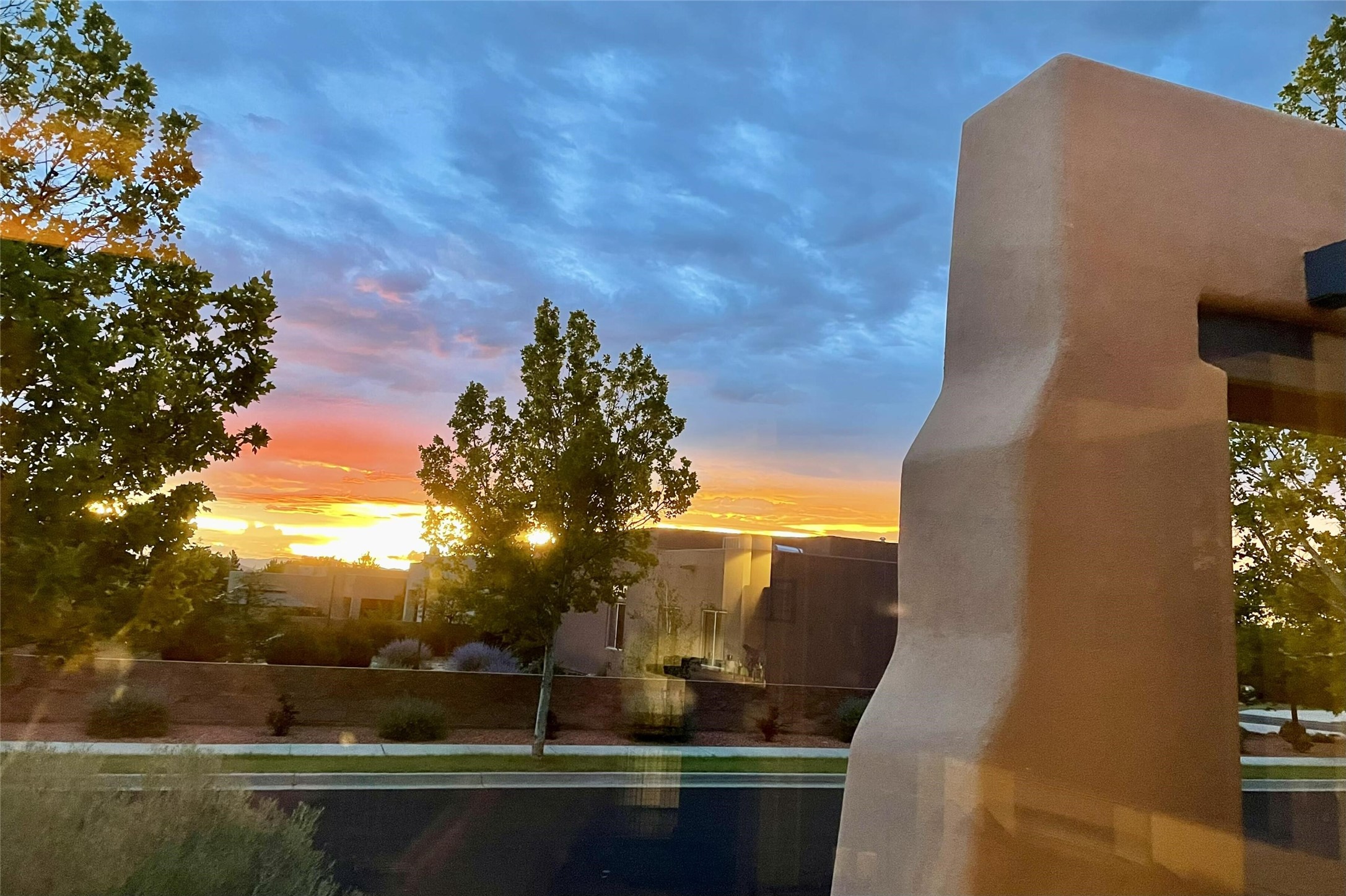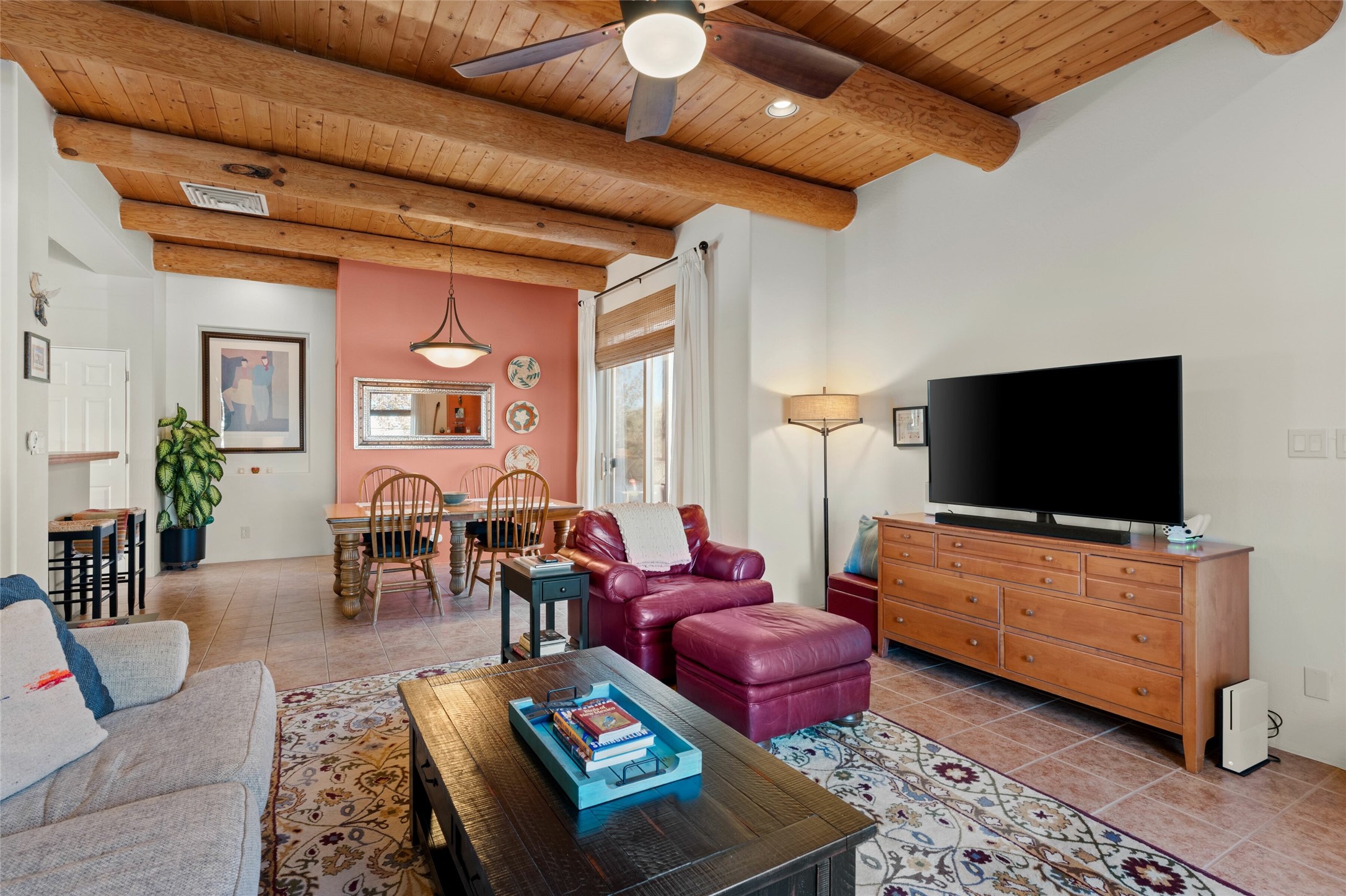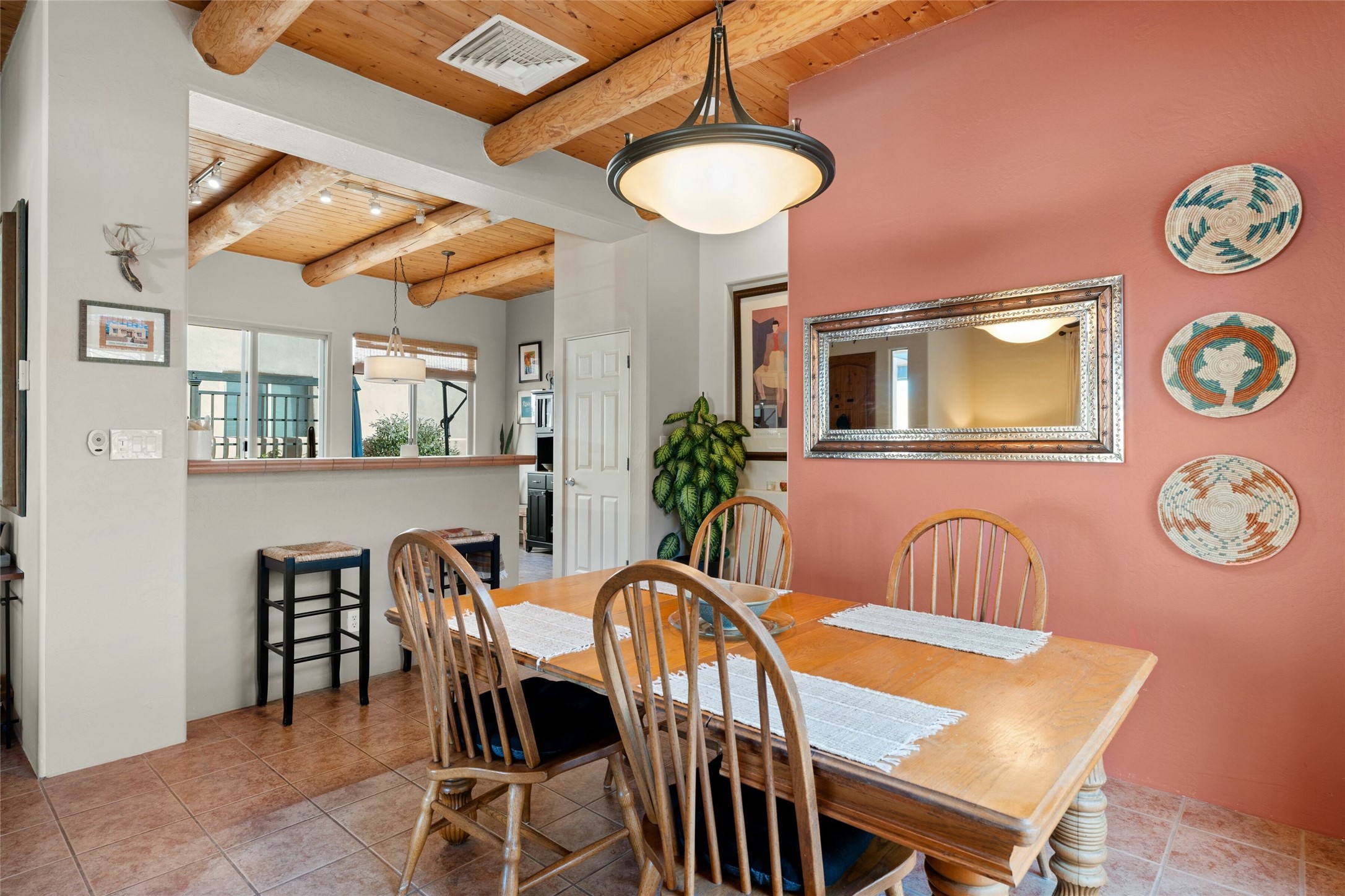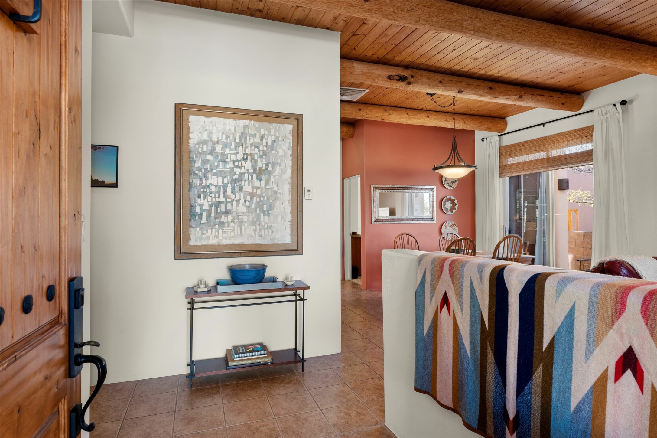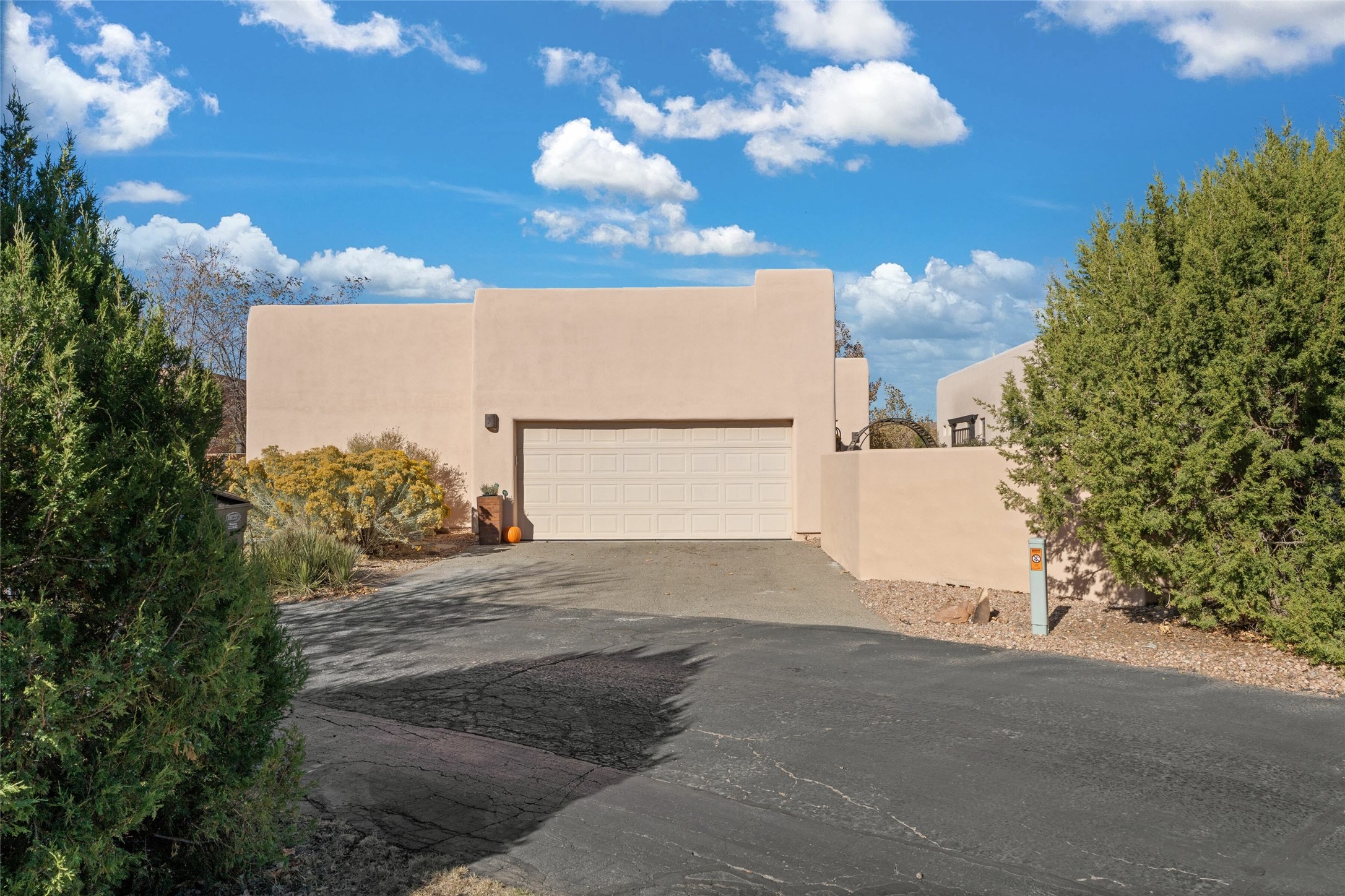 This beautiful single level home in the desirable Rancho Viejo neighborhood is filled with Santa Fe charm. The handcrafted wood entry door welcomes you to this traditional and timeless Santa Fe architecture & design. The high ceilings in the entry, living room and dining area are carefully crafted with rounded Vigas and T&G finishes. Terra Cotta colored gas Kiva fireplace in the cozy living room for those cold winter evenings. Dining room is adjacent to the living room and kitchen - an ideal layout for entertaining. The kitchen is spacious with a raised bar top seating area, as well as a large island. The bedroom layout is ideal with the two spare bedrooms and bath on one wing, and the primary bedroom and bath on another wing which offers lots of privacy. The primary bathroom has recently been beautifully remodeled, with a large walk-in shower and custom vanity. A sliding door from the primary bedroom, as well as the dining room, lead to small patio - ideal for your morning coffee or tea. An enclosed yard is located thru the sliding door of the kitchen, with an incredible flagstone patio, garden area, mature shrubs and aspen trees, plus extra space to enjoy the beauty of your surroundings. A small neighborhood park is just outside the back of the property, near the driveway to the two car garage. From the front of the property, near the corner of Chili Line Rd. & San Antonio Peak, there is access to one of the many trailheads throughout Rancho Viejo. One block away from this home is one of the largest parks in Rancho Viejo. Pride of ownership is clearly seen in this meticulously cared for home. New evaporative cooler in 2022 and new kitchen appliances in 2021. Seller has raised the wall height to the enclosed yard for added privacy. Secondary fridge in garage conveys.