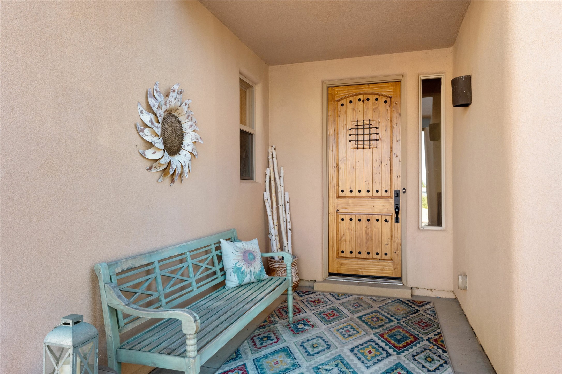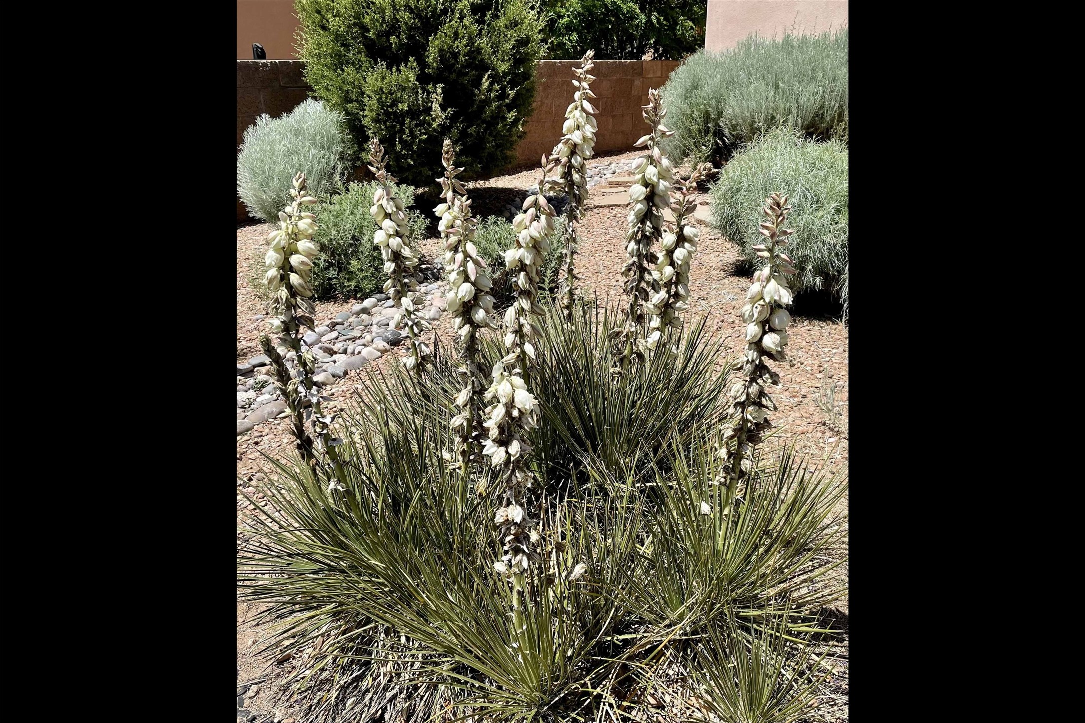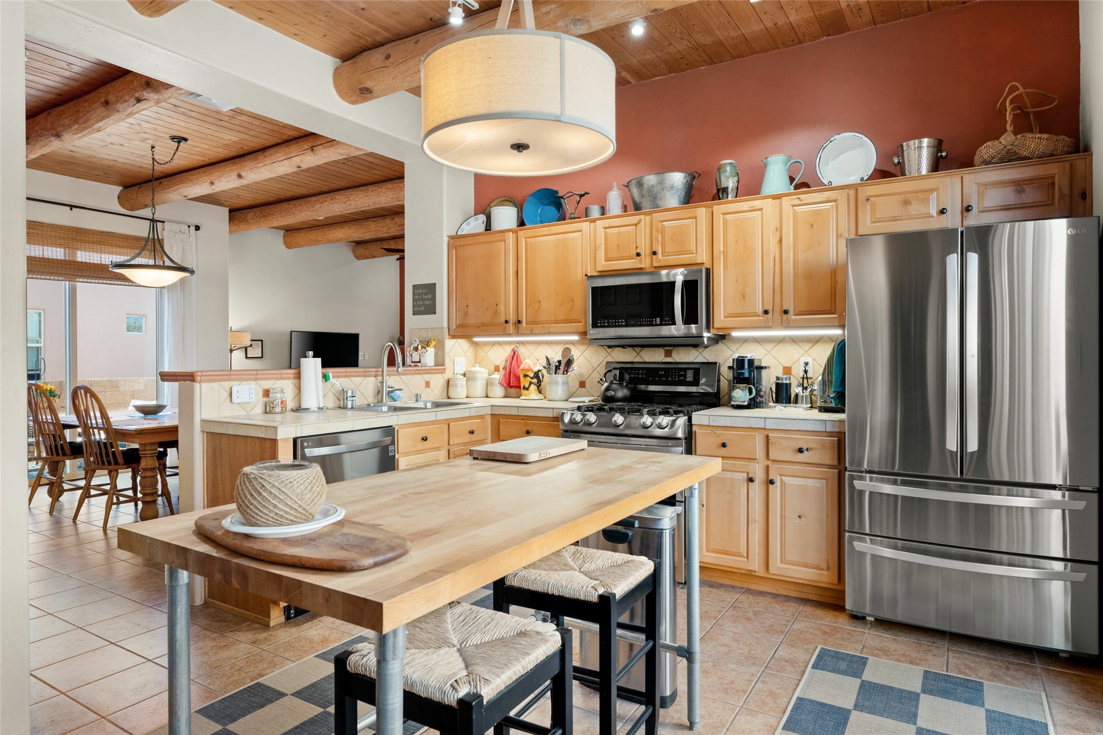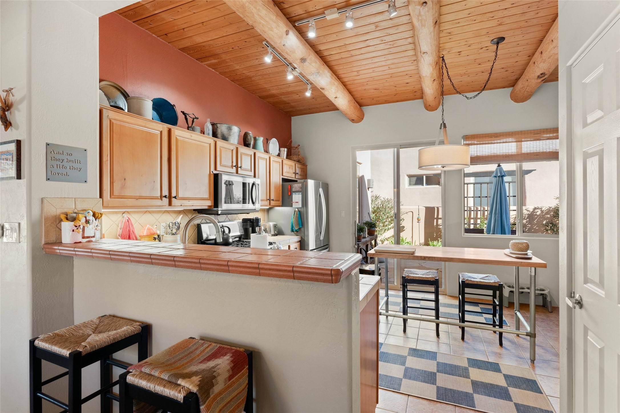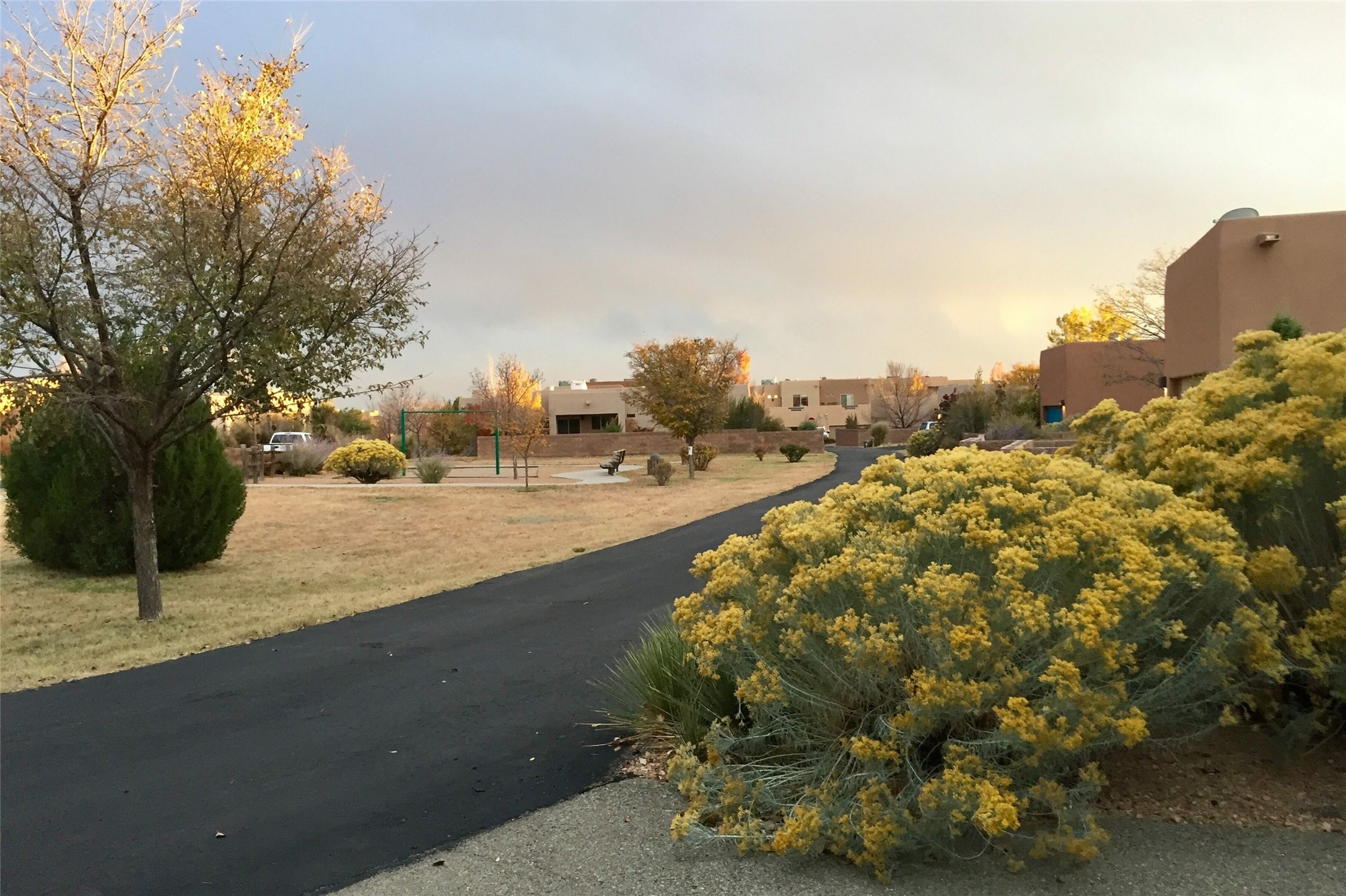 This beautiful single level home in the desirable Rancho Viejo neighborhood is filled with Santa Fe charm. The handcrafted wood entry door welcomes you to this traditional and timeless Santa Fe architecture & design. The high ceilings in the entry, living room and dining area are carefully crafted with rounded Vigas and T&G finishes. Terra Cotta colored gas Kiva fireplace in the cozy living room for those cold winter evenings. Dining room is adjacent to the living room and kitchen - an ideal layout for entertaining. The kitchen is spacious with a raised bar top seating area, as well as a large island. The bedroom layout is ideal with the two spare bedrooms and bath on one wing, and the primary bedroom and bath on another wing which offers lots of privacy. The primary bathroom has recently been beautifully remodeled, with a large walk-in shower and custom vanity. A sliding door from the primary bedroom, as well as the dining room, lead to small patio - ideal for your morning coffee or tea. An enclosed yard is located thru the sliding door of the kitchen, with an incredible flagstone patio, garden area, mature shrubs and aspen trees, plus extra space to enjoy the beauty of your surroundings. A small neighborhood park is just outside the back of the property, near the driveway to the two car garage. From the front of the property, near the corner of Chili Line Rd. & San Antonio Peak, there is access to one of the many trailheads throughout Rancho Viejo. One block away from this home is one of the largest parks in Rancho Viejo. Pride of ownership is clearly seen in this meticulously cared for home. New evaporative cooler in 2022 and new kitchen appliances in 2021. Seller has raised the wall height to the enclosed yard for added privacy. Secondary fridge in garage conveys.
