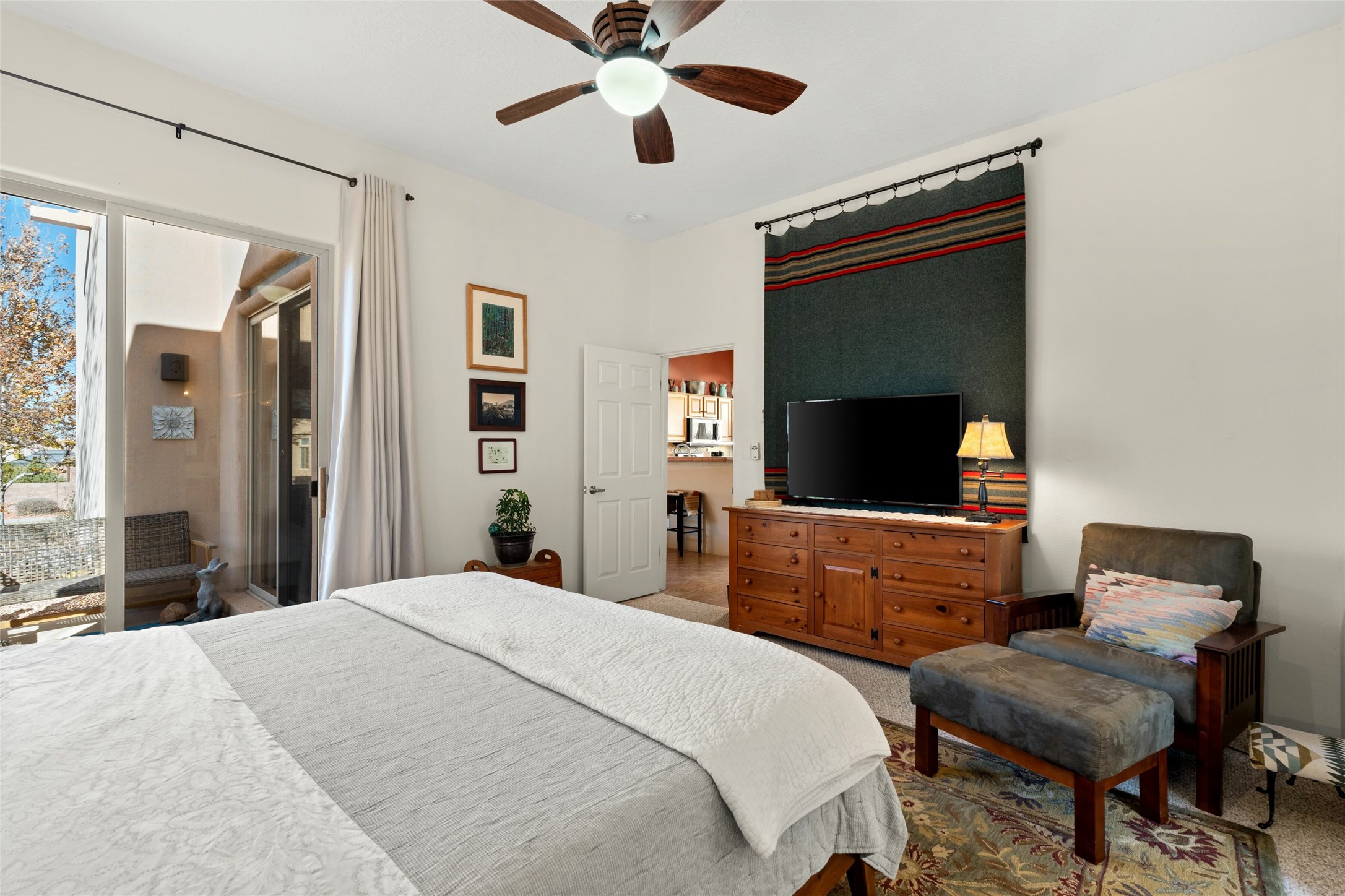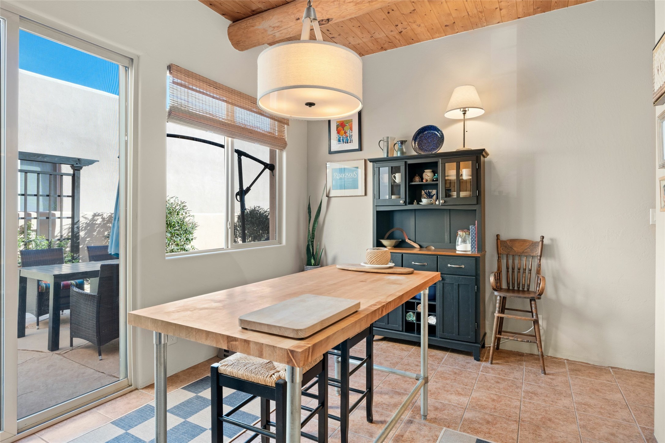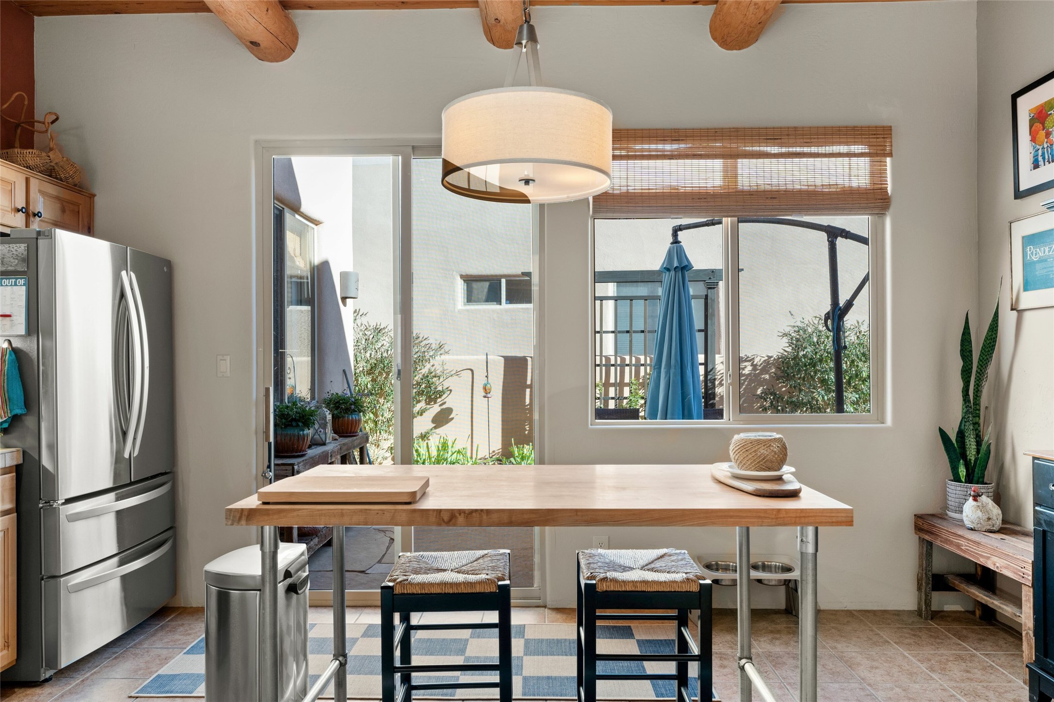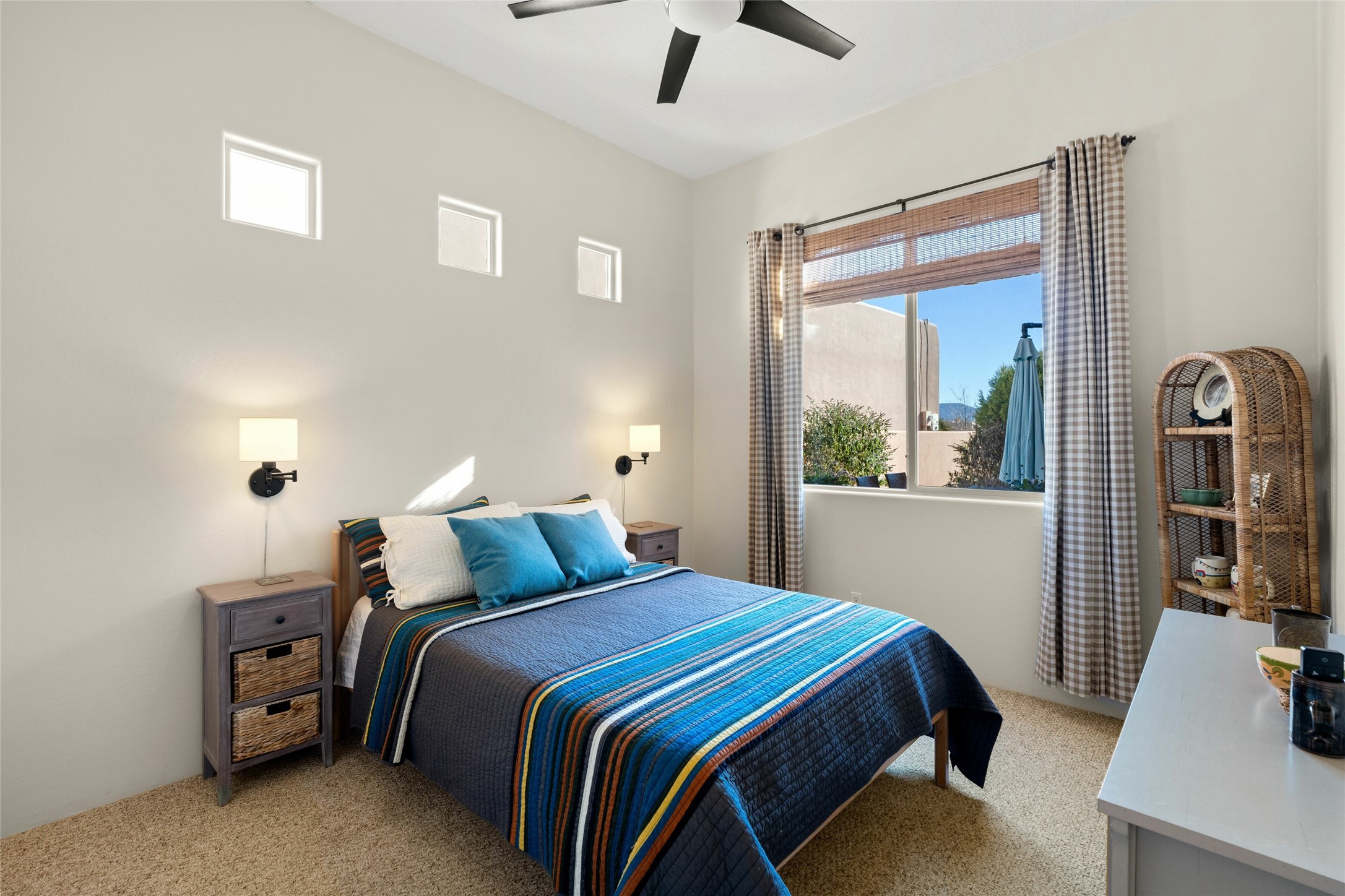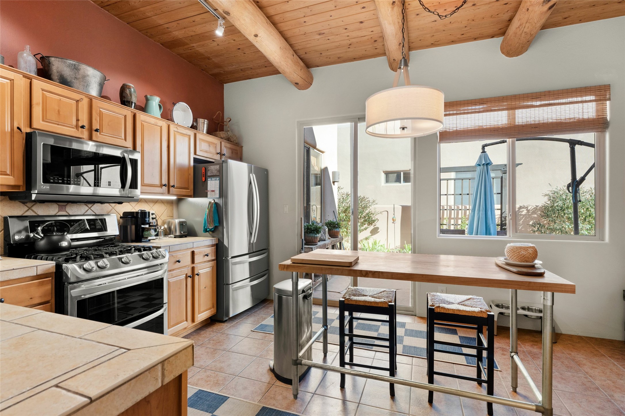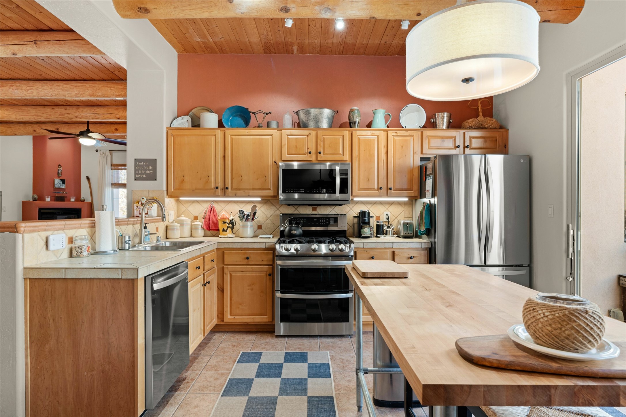 This beautiful single level home in the desirable Rancho Viejo neighborhood is filled with Santa Fe charm. The handcrafted wood entry door welcomes you to this traditional and timeless Santa Fe architecture & design. The high ceilings in the entry, living room and dining area are carefully crafted with rounded Vigas and T&G finishes. Terra Cotta colored gas Kiva fireplace in the cozy living room for those cold winter evenings. Dining room is adjacent to the living room and kitchen - an ideal layout for entertaining. The kitchen is spacious with a raised bar top seating area, as well as a large island. The bedroom layout is ideal with the two spare bedrooms and bath on one wing, and the primary bedroom and bath on another wing which offers lots of privacy. The primary bathroom has recently been beautifully remodeled, with a large walk-in shower and custom vanity. A sliding door from the primary bedroom, as well as the dining room, lead to small patio - ideal for your morning coffee or tea. An enclosed yard is located thru the sliding door of the kitchen, with an incredible flagstone patio, garden area, mature shrubs and aspen trees, plus extra space to enjoy the beauty of your surroundings. A small neighborhood park is just outside the back of the property, near the driveway to the two car garage. From the front of the property, near the corner of Chili Line Rd. & San Antonio Peak, there is access to one of the many trailheads throughout Rancho Viejo. One block away from this home is one of the largest parks in Rancho Viejo. Pride of ownership is clearly seen in this meticulously cared for home. New evaporative cooler in 2022 and new kitchen appliances in 2021. Seller has raised the wall height to the enclosed yard for added privacy. Secondary fridge in garage conveys.