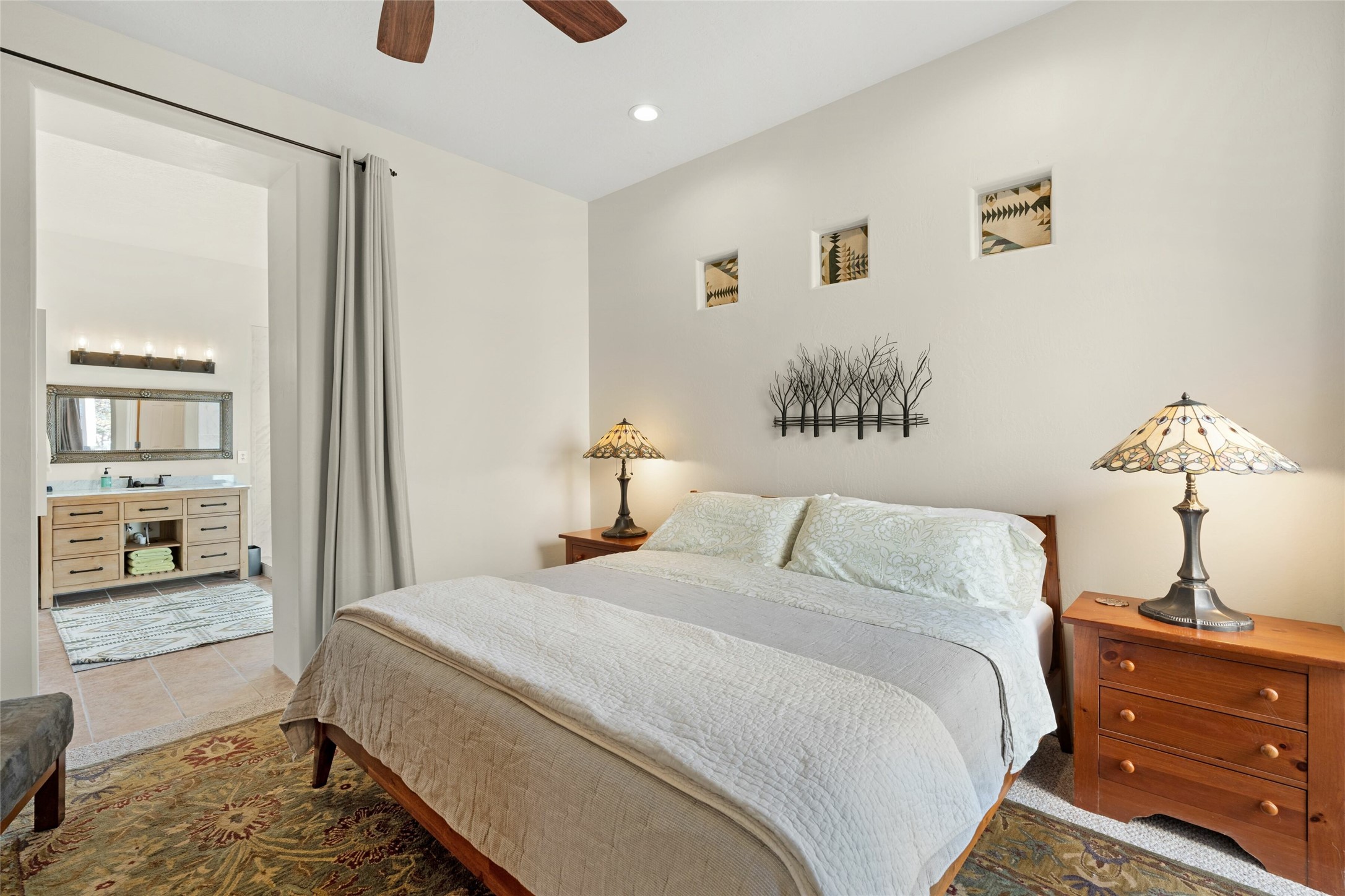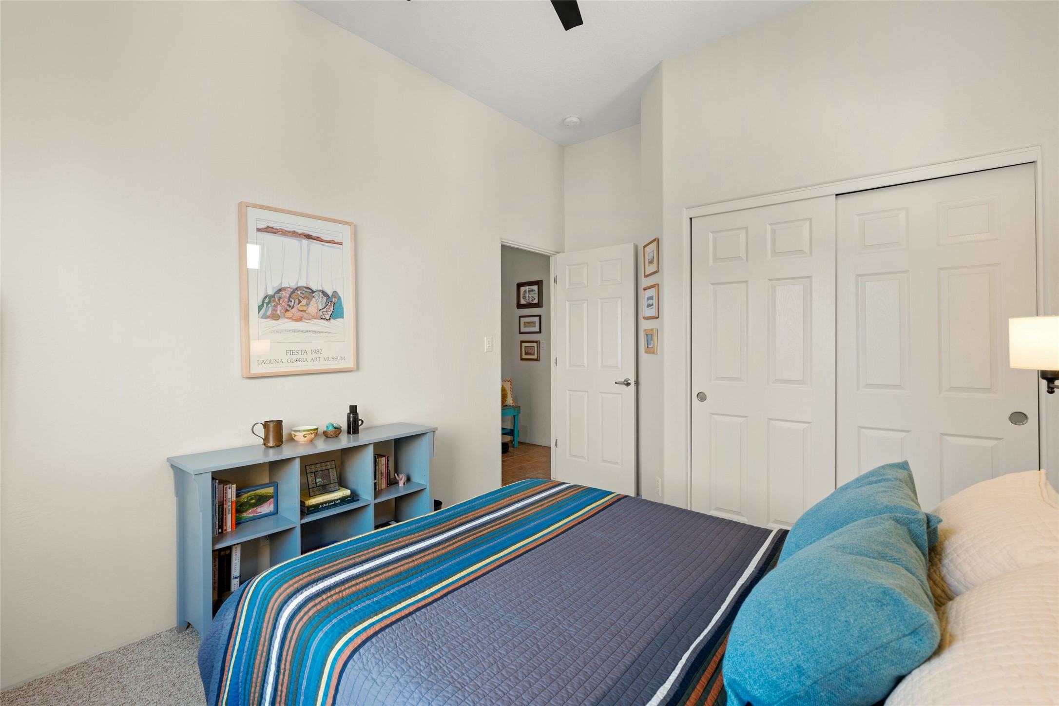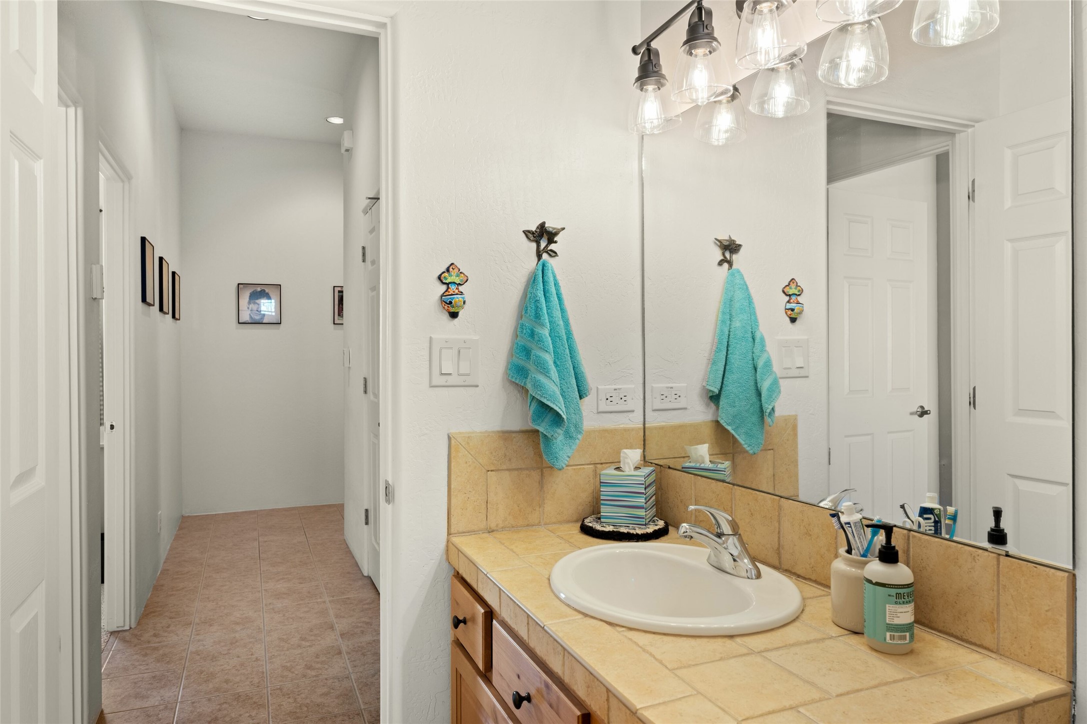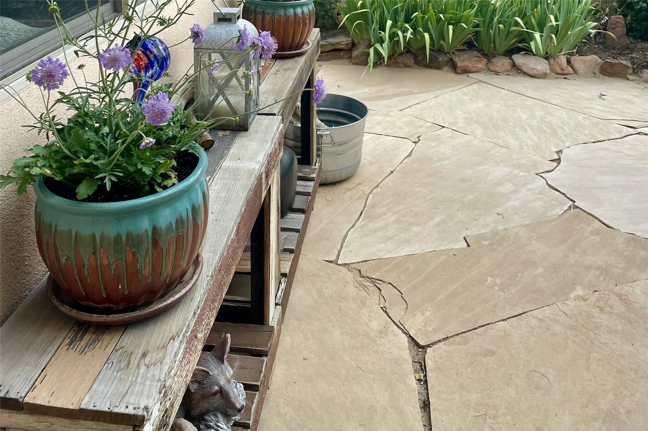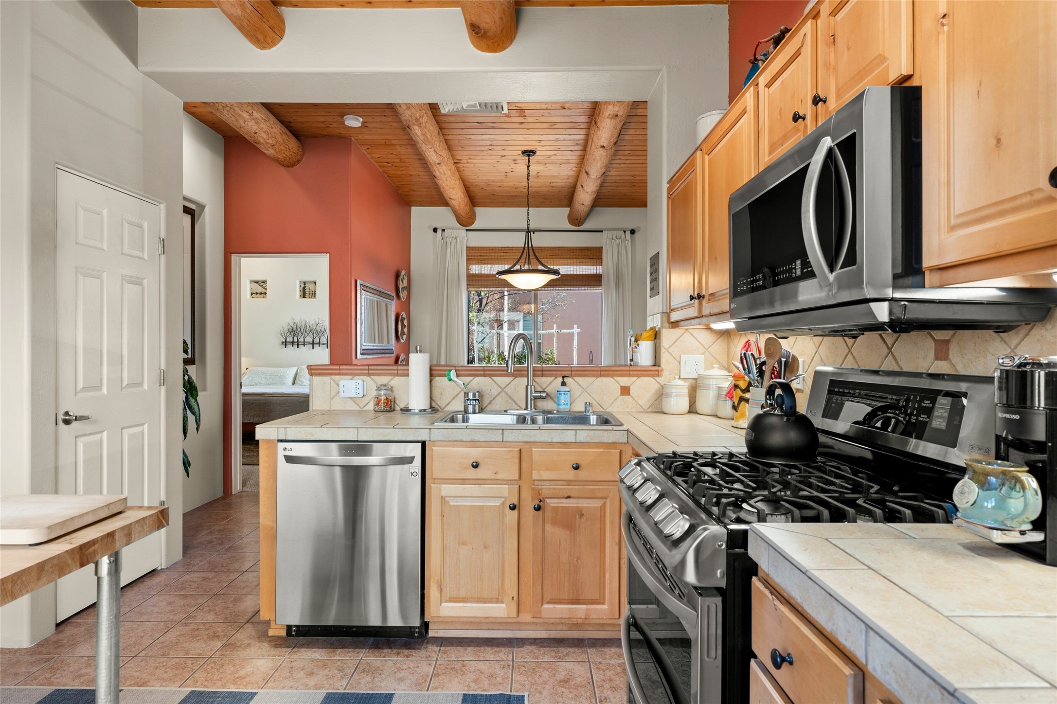This beautiful single level home in the desirable Rancho Viejo neighborhood is filled with Santa Fe charm. The handcrafted wood entry door welcomes you to this traditional and timeless Santa Fe architecture & design. The high ceilings in the entry, living room and dining area are carefully crafted with rounded Vigas and T&G finishes. Terra Cotta colored gas Kiva fireplace in the cozy living room for those cold winter evenings. Dining room is adjacent to the living room and kitchen - an ideal layout for entertaining. The kitchen is spacious with a raised bar top seating area, as well as a large island. The bedroom layout is ideal with the two spare bedrooms and bath on one wing, and the primary bedroom and bath on another wing which offers lots of privacy. The primary bathroom has recently been beautifully remodeled, with a large walk-in shower and custom vanity. A sliding door from the primary bedroom, as well as the dining room, lead to small patio - ideal for your morning coffee or tea. An enclosed yard is located thru the sliding door of the kitchen, with an incredible flagstone patio, garden area, mature shrubs and aspen trees, plus extra space to enjoy the beauty of your surroundings. A small neighborhood park is just outside the back of the property, near the driveway to the two car garage. From the front of the property, near the corner of Chili Line Rd. & San Antonio Peak, there is access to one of the many trailheads throughout Rancho Viejo. One block away from this home is one of the largest parks in Rancho Viejo. Pride of ownership is clearly seen in this meticulously cared for home. New evaporative cooler in 2022 and new kitchen appliances in 2021. Seller has raised the wall height to the enclosed yard for added privacy. Secondary fridge in garage conveys.