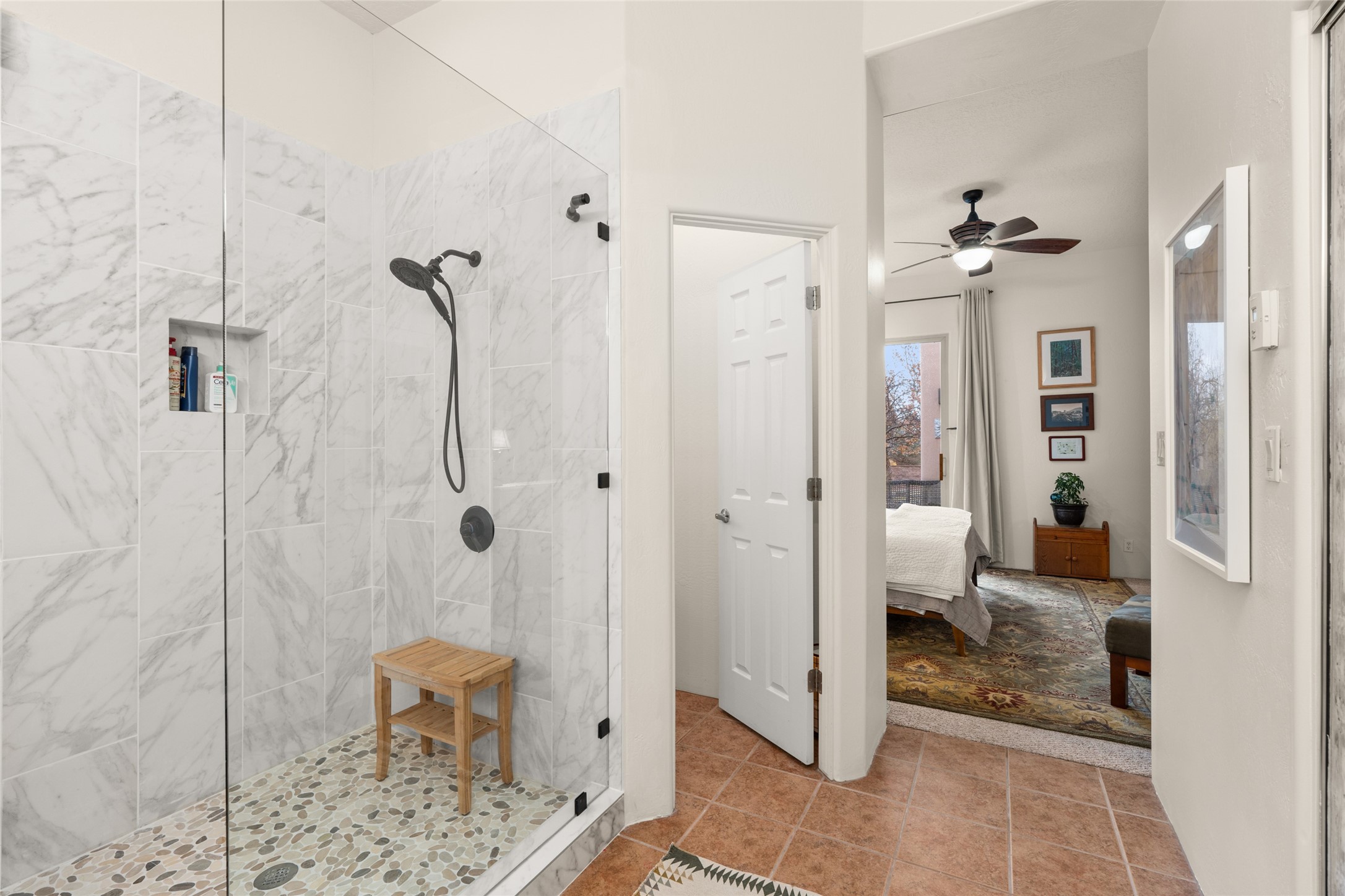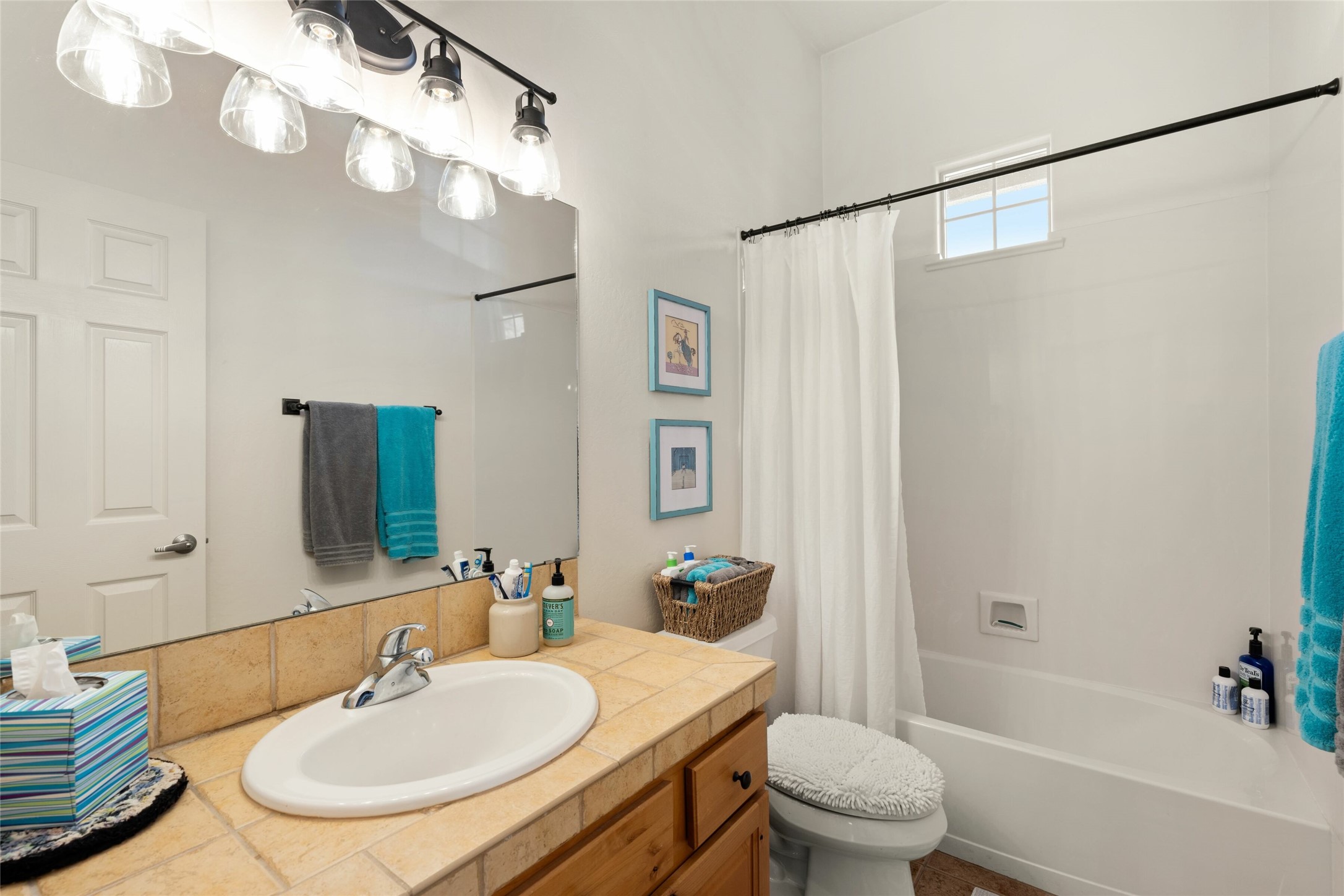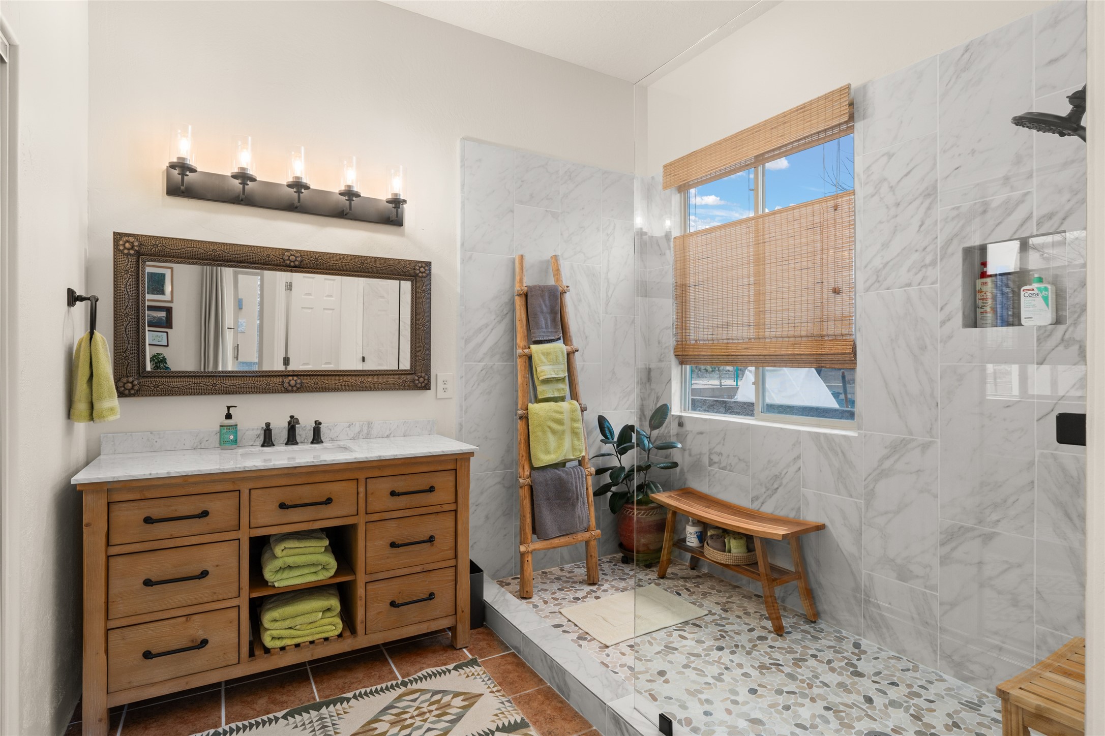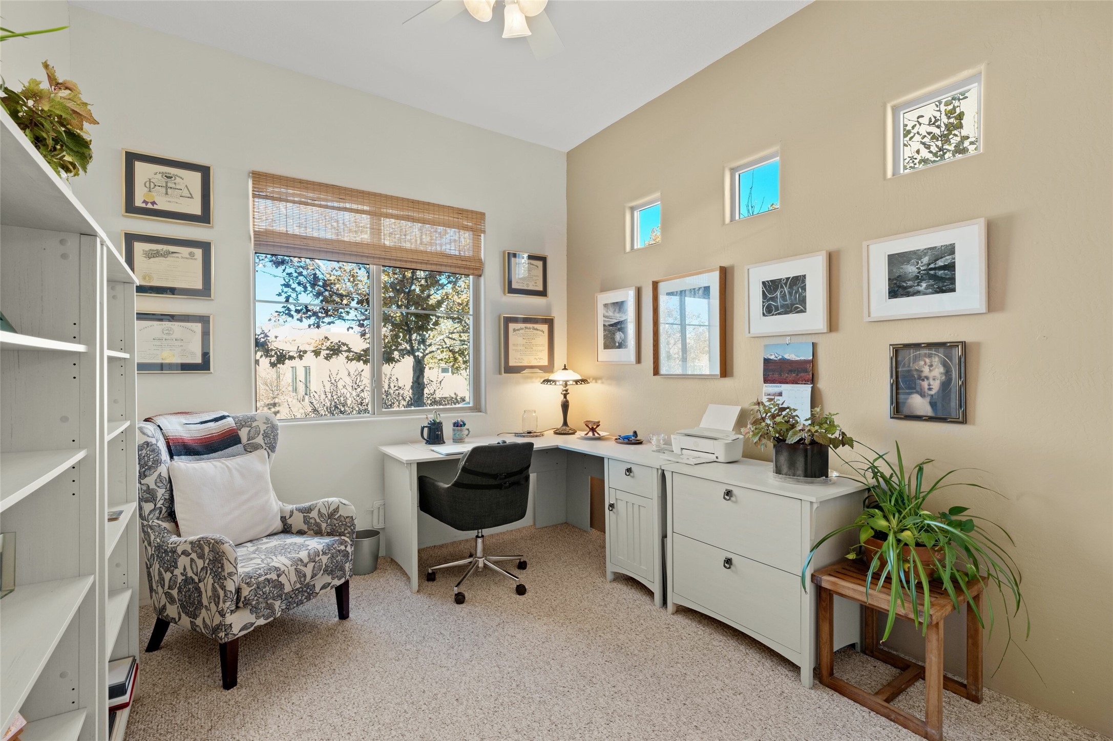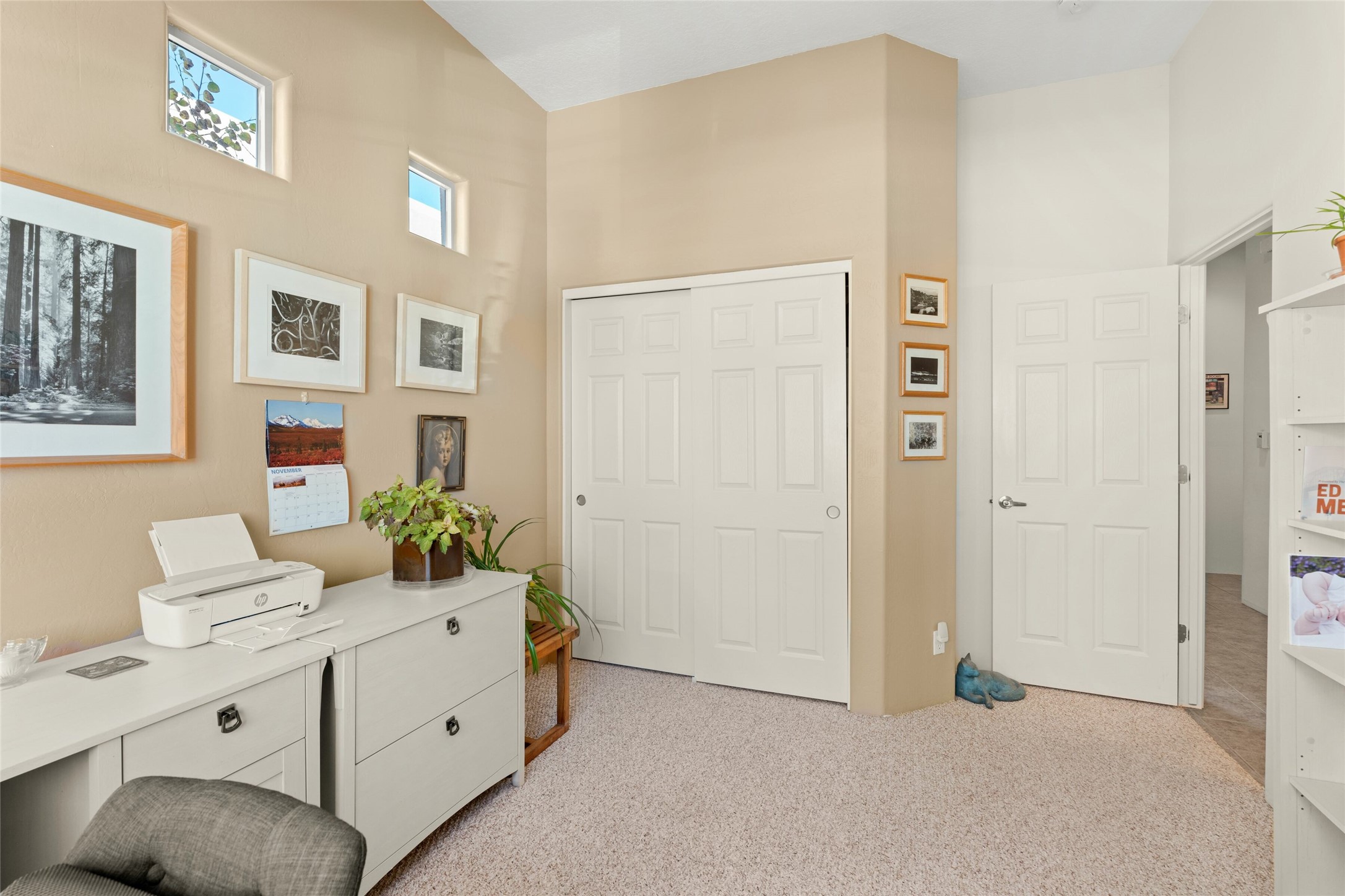 This beautiful single level home in the desirable Rancho Viejo neighborhood is filled with Santa Fe charm. The handcrafted wood entry door welcomes you to this traditional and timeless Santa Fe architecture & design. The high ceilings in the entry, living room and dining area are carefully crafted with rounded Vigas and T&G finishes. Terra Cotta colored gas Kiva fireplace in the cozy living room for those cold winter evenings. Dining room is adjacent to the living room and kitchen - an ideal layout for entertaining. The kitchen is spacious with a raised bar top seating area, as well as a large island. The bedroom layout is ideal with the two spare bedrooms and bath on one wing, and the primary bedroom and bath on another wing which offers lots of privacy. The primary bathroom has recently been beautifully remodeled, with a large walk-in shower and custom vanity. A sliding door from the primary bedroom, as well as the dining room, lead to small patio - ideal for your morning coffee or tea. An enclosed yard is located thru the sliding door of the kitchen, with an incredible flagstone patio, garden area, mature shrubs and aspen trees, plus extra space to enjoy the beauty of your surroundings. A small neighborhood park is just outside the back of the property, near the driveway to the two car garage. From the front of the property, near the corner of Chili Line Rd. & San Antonio Peak, there is access to one of the many trailheads throughout Rancho Viejo. One block away from this home is one of the largest parks in Rancho Viejo. Pride of ownership is clearly seen in this meticulously cared for home. New evaporative cooler in 2022 and new kitchen appliances in 2021. Seller has raised the wall height to the enclosed yard for added privacy. Secondary fridge in garage conveys.