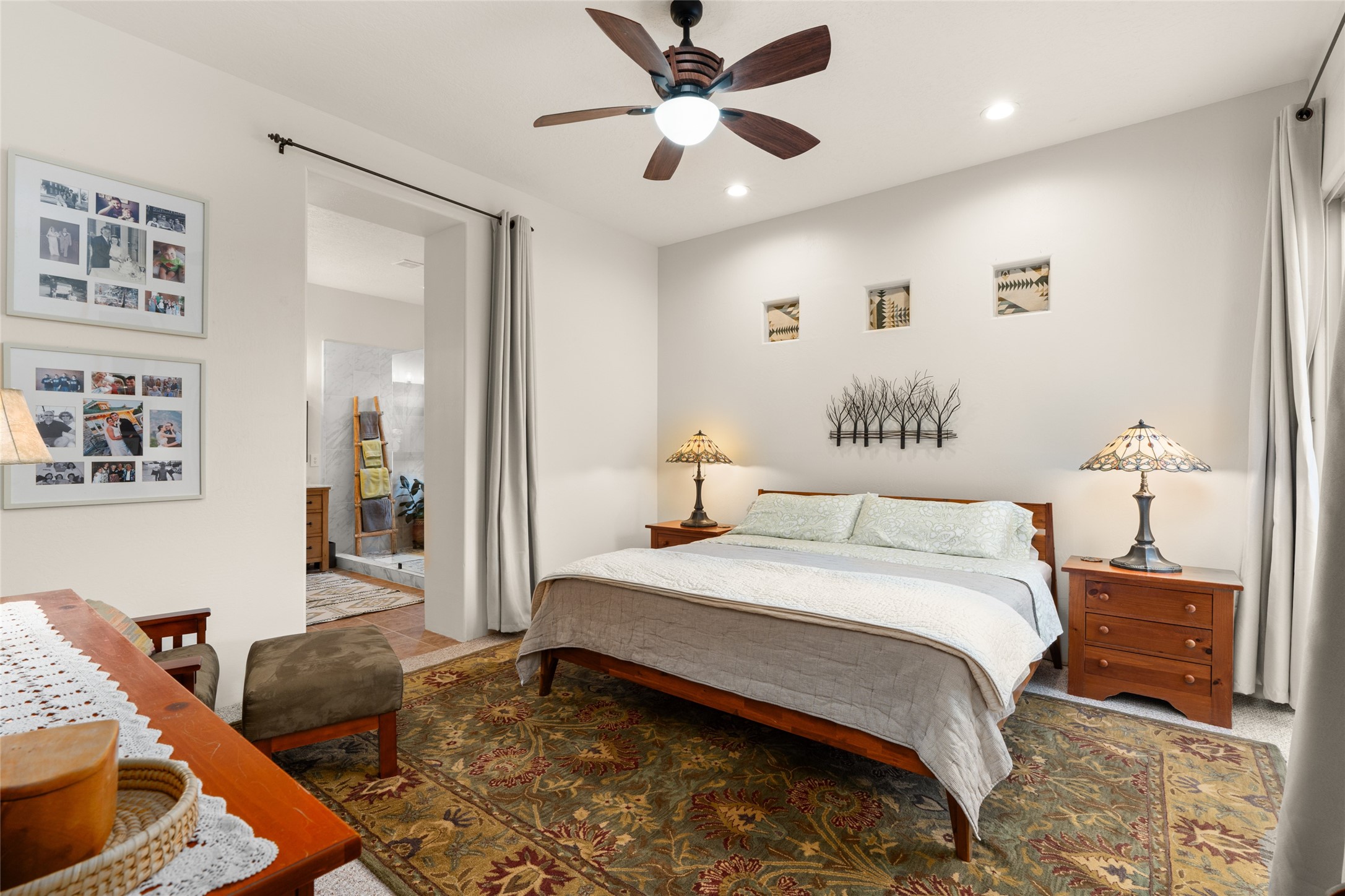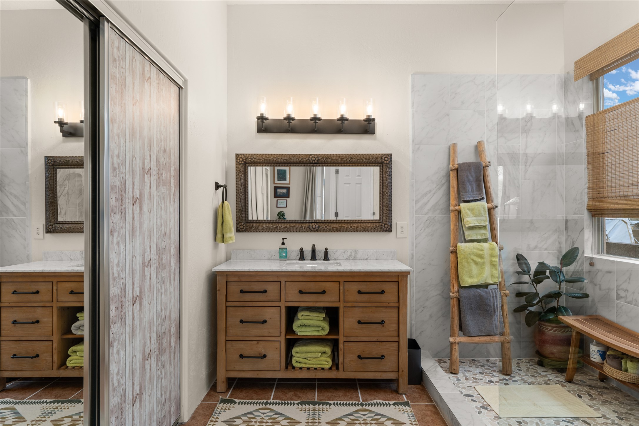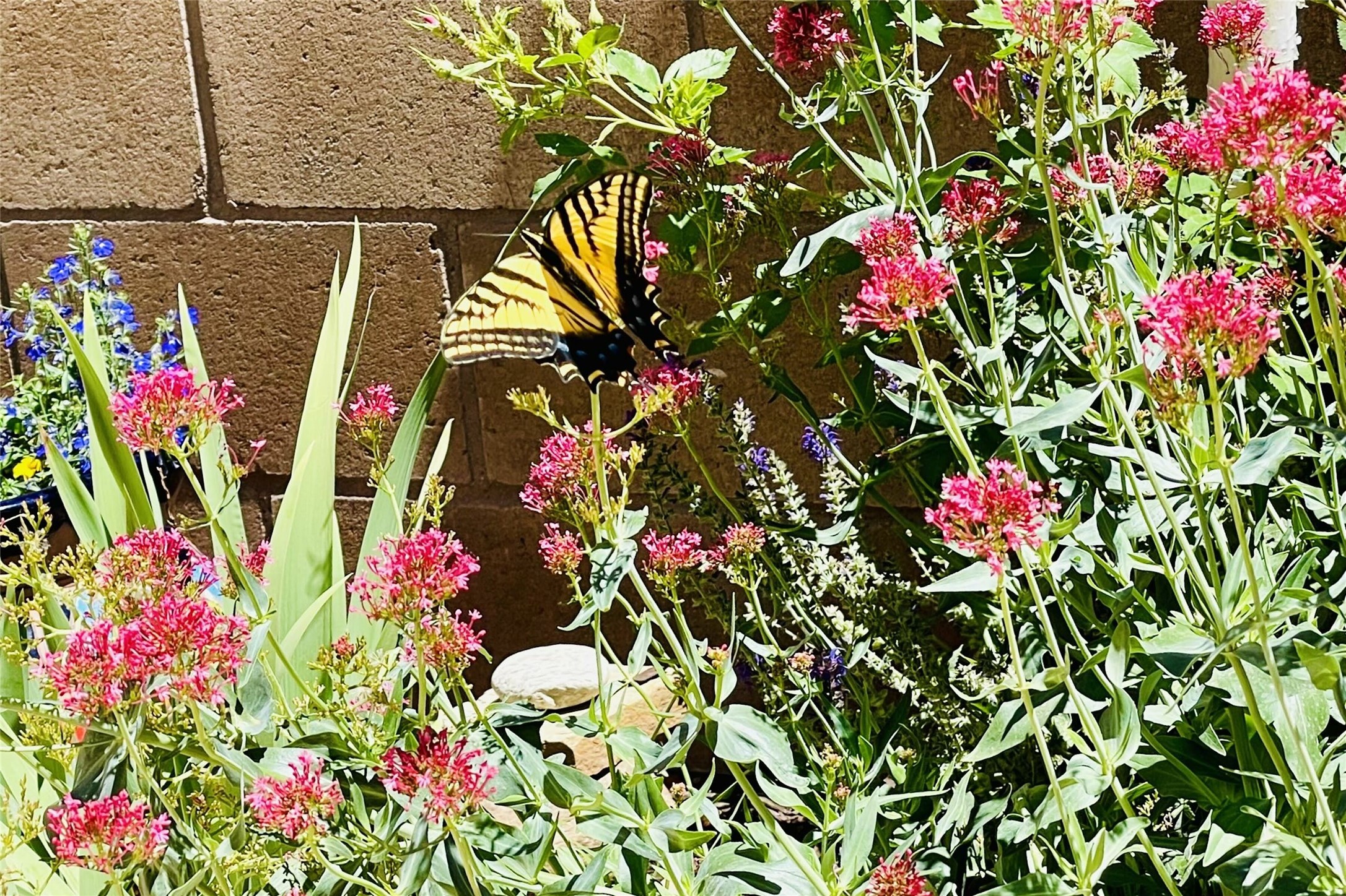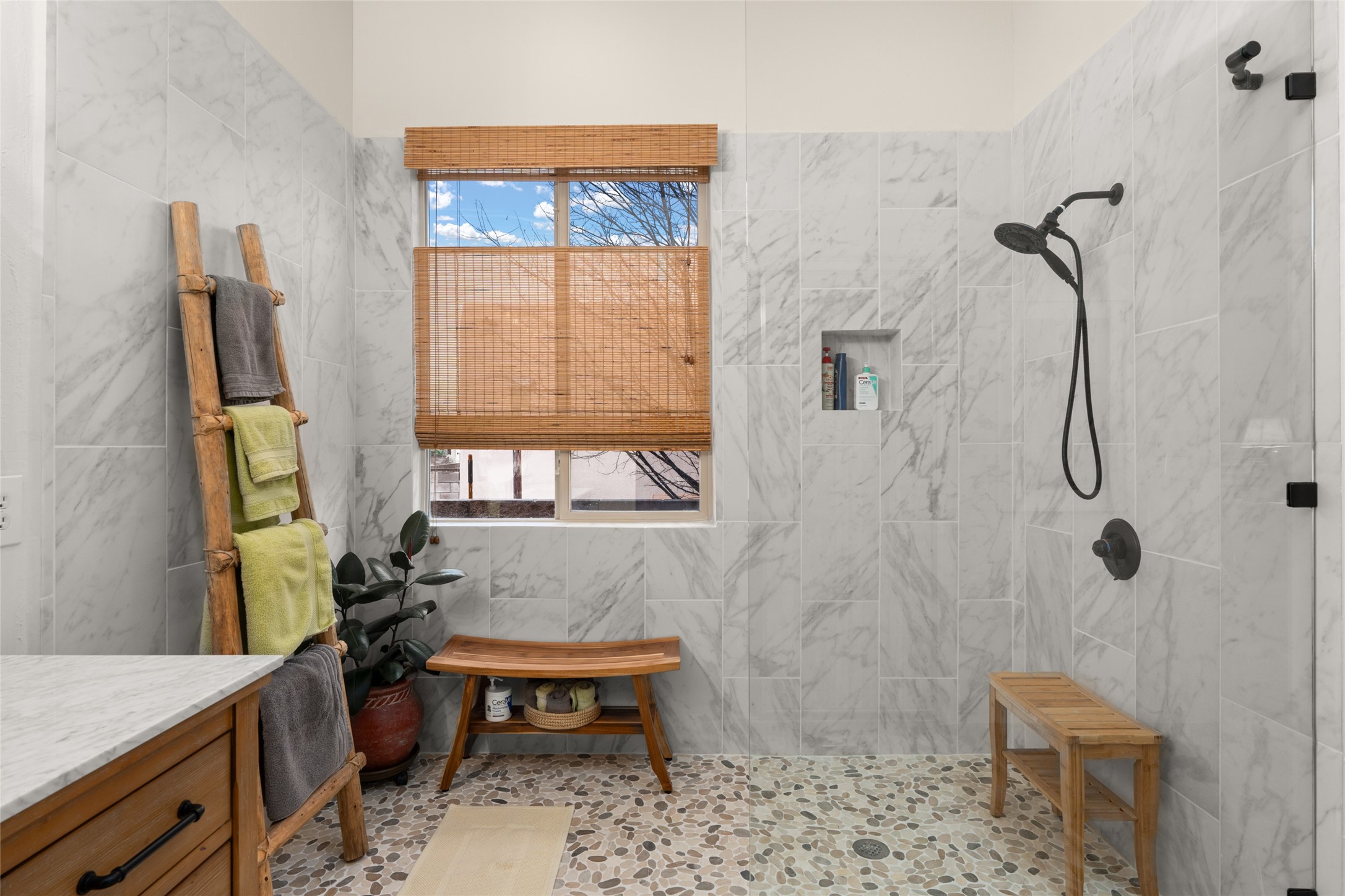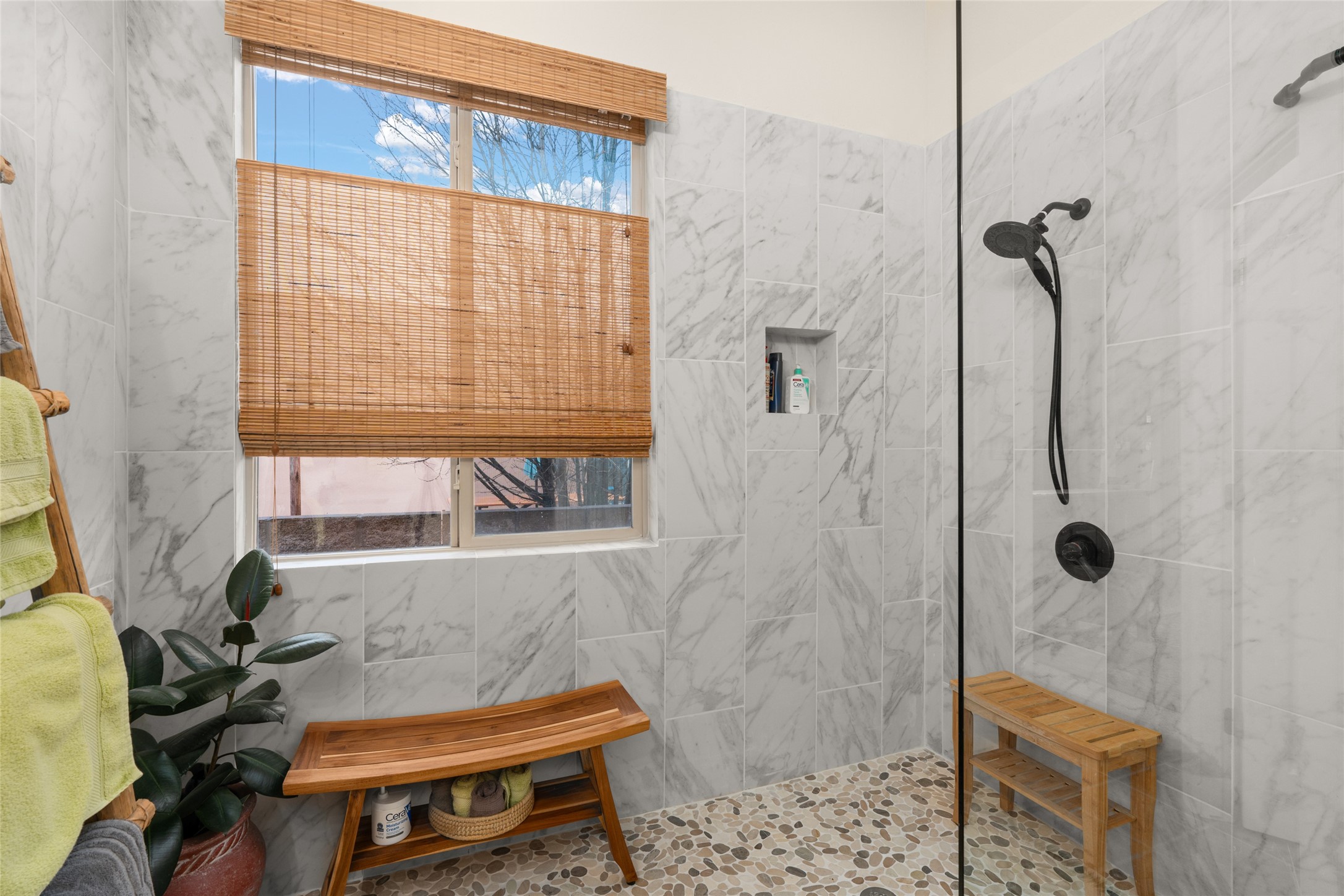 This beautiful single level home in the desirable Rancho Viejo neighborhood is filled with Santa Fe charm. The handcrafted wood entry door welcomes you to this traditional and timeless Santa Fe architecture & design. The high ceilings in the entry, living room and dining area are carefully crafted with rounded Vigas and T&G finishes. Terra Cotta colored gas Kiva fireplace in the cozy living room for those cold winter evenings. Dining room is adjacent to the living room and kitchen - an ideal layout for entertaining. The kitchen is spacious with a raised bar top seating area, as well as a large island. The bedroom layout is ideal with the two spare bedrooms and bath on one wing, and the primary bedroom and bath on another wing which offers lots of privacy. The primary bathroom has recently been beautifully remodeled, with a large walk-in shower and custom vanity. A sliding door from the primary bedroom, as well as the dining room, lead to small patio - ideal for your morning coffee or tea. An enclosed yard is located thru the sliding door of the kitchen, with an incredible flagstone patio, garden area, mature shrubs and aspen trees, plus extra space to enjoy the beauty of your surroundings. A small neighborhood park is just outside the back of the property, near the driveway to the two car garage. From the front of the property, near the corner of Chili Line Rd. & San Antonio Peak, there is access to one of the many trailheads throughout Rancho Viejo. One block away from this home is one of the largest parks in Rancho Viejo. Pride of ownership is clearly seen in this meticulously cared for home. New evaporative cooler in 2022 and new kitchen appliances in 2021. Seller has raised the wall height to the enclosed yard for added privacy. Secondary fridge in garage conveys.
