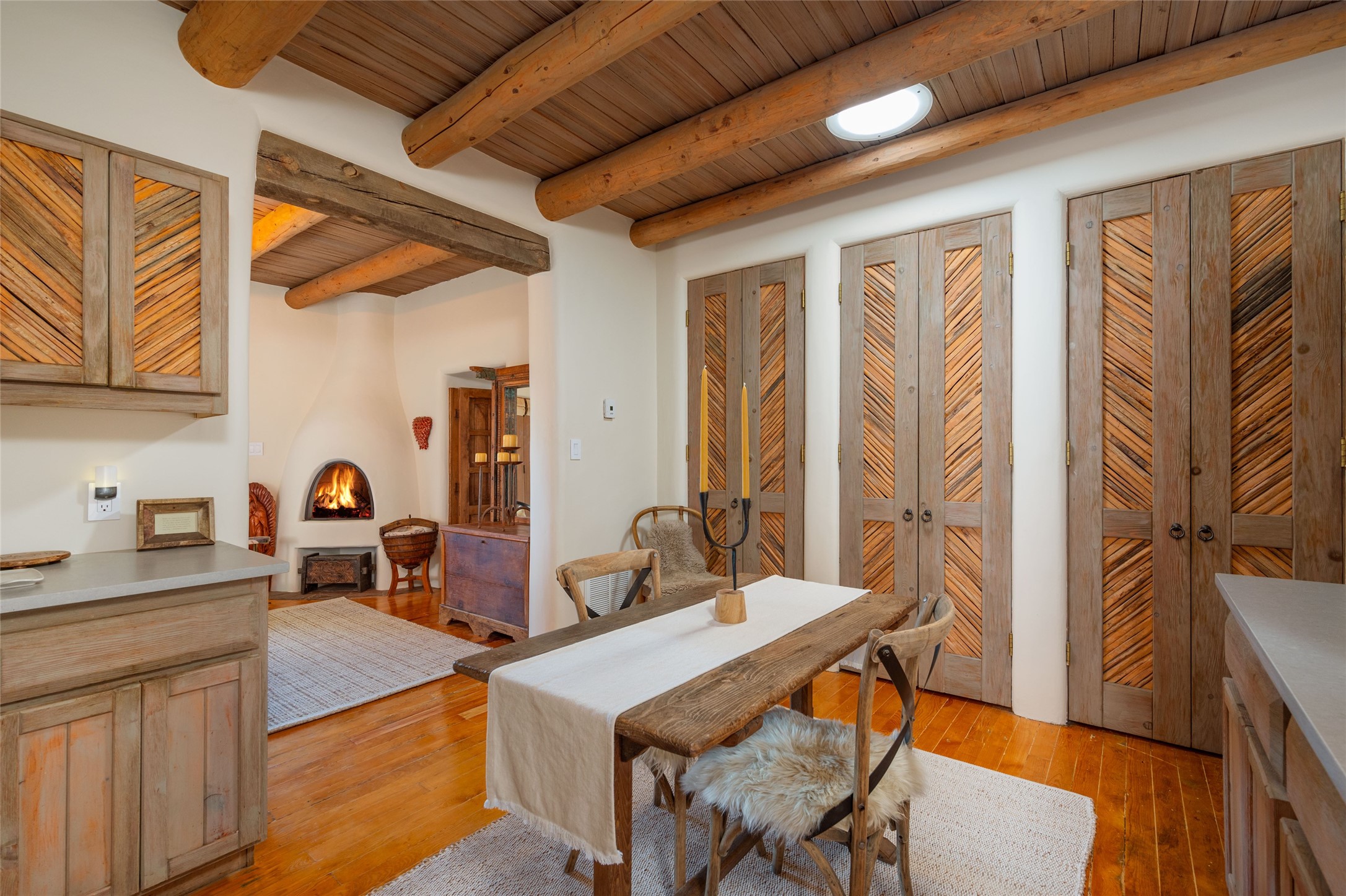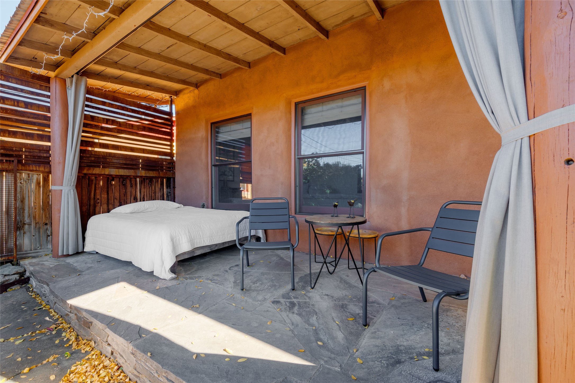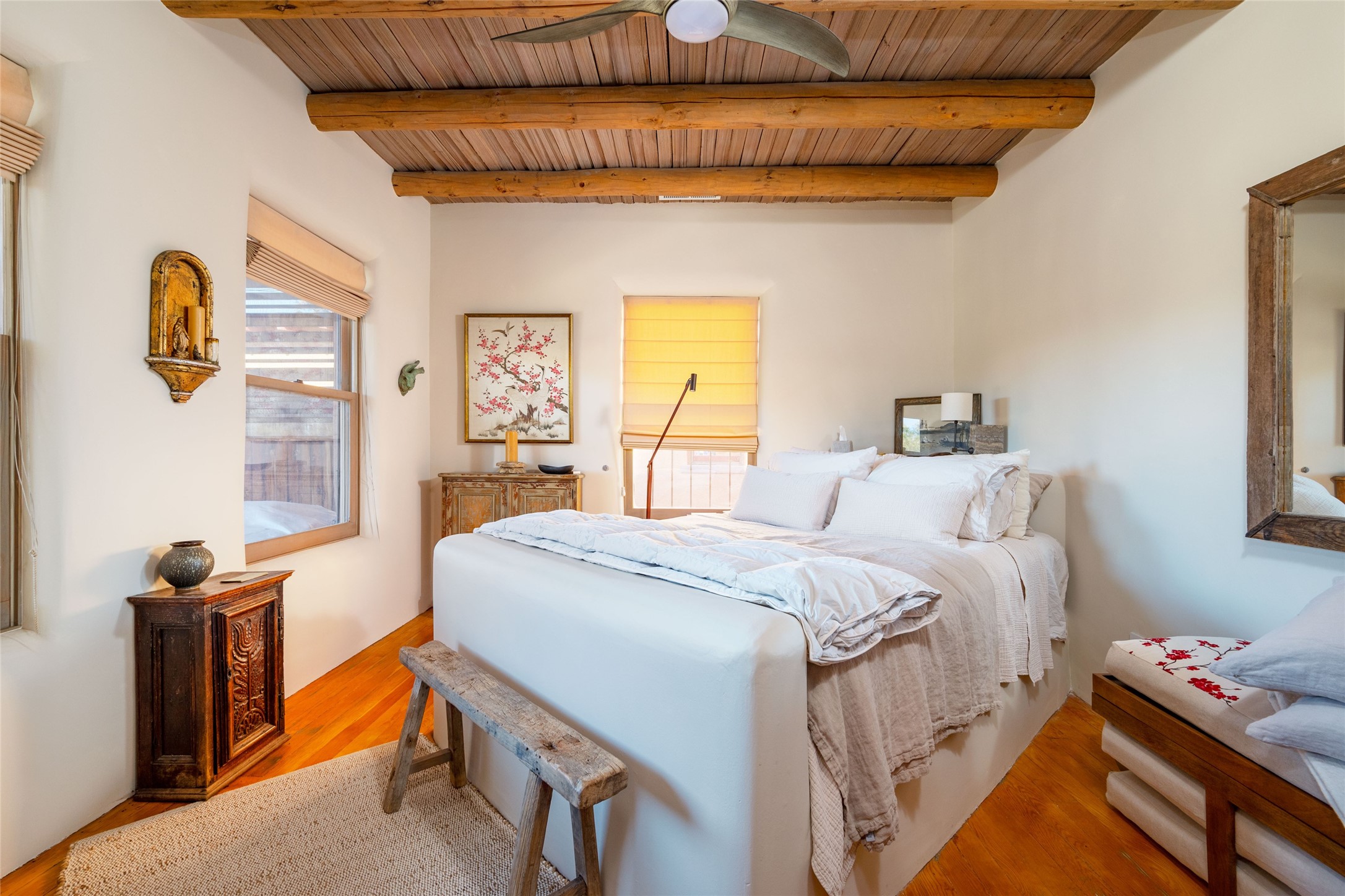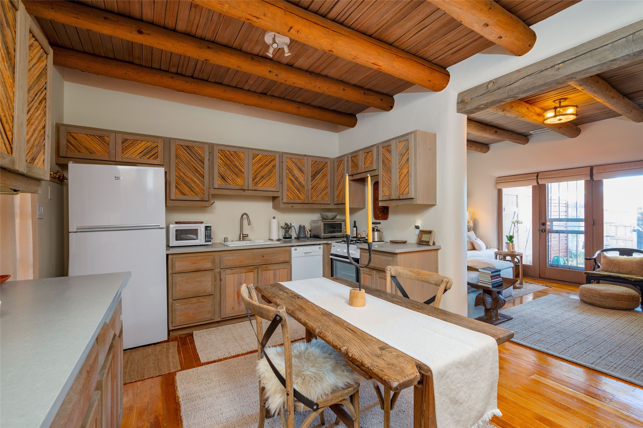 Enchanting, updated 1 bedroom 1 bath condo in the desirable, close-in Guadalupe Historic District. Single level, no interior steps. Iconic Santa Fe style with vigas and tongue and groove ceilings, kiva fireplace, bancos, and pine plank flooring. Updated chef's kitchen with quartz counters and plenty of storage. Spacious flagstone patio and garden area offer expanded living and dining. A perfect place for entertaining and enjoying the New Mexico skies. One reserved parking space. Coveted location close to the Santa Fe Railyard District, the historic Plaza and Museum Hill.