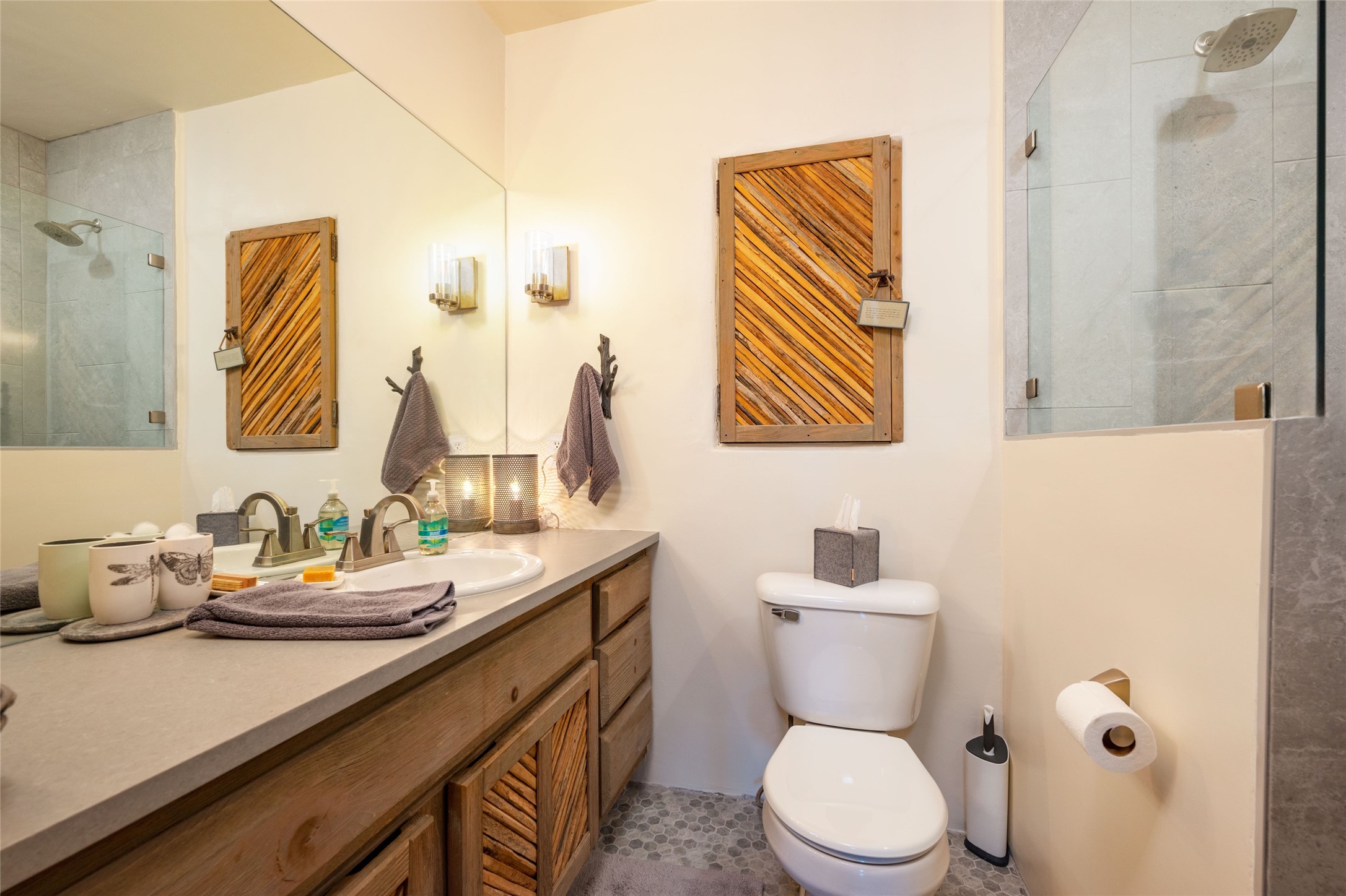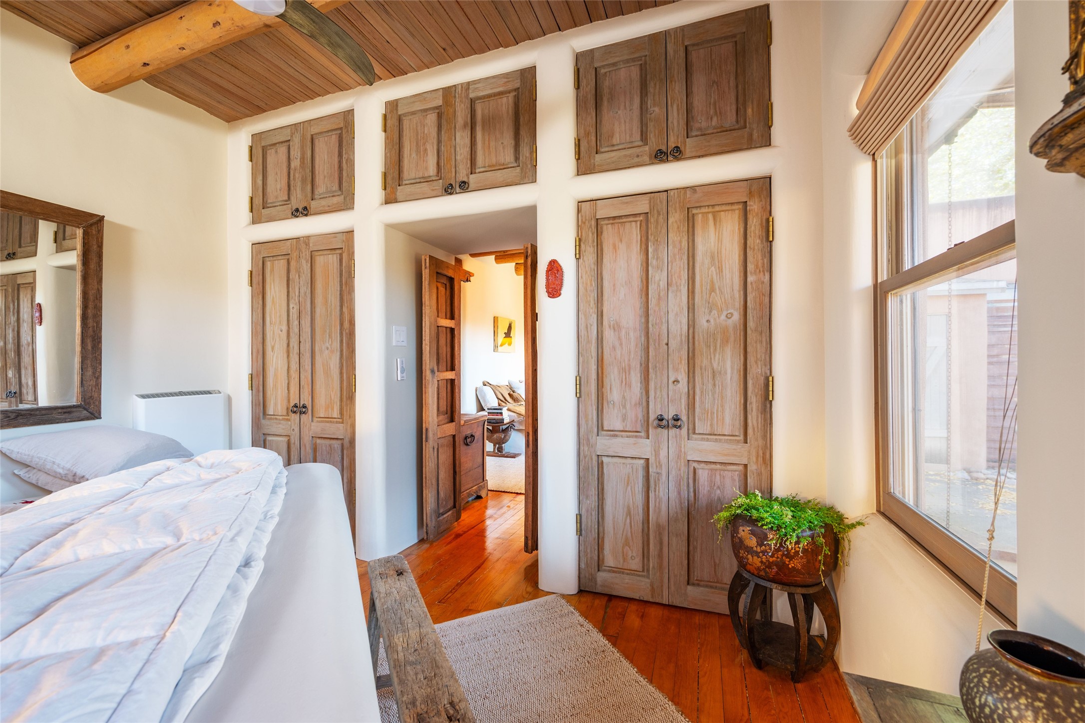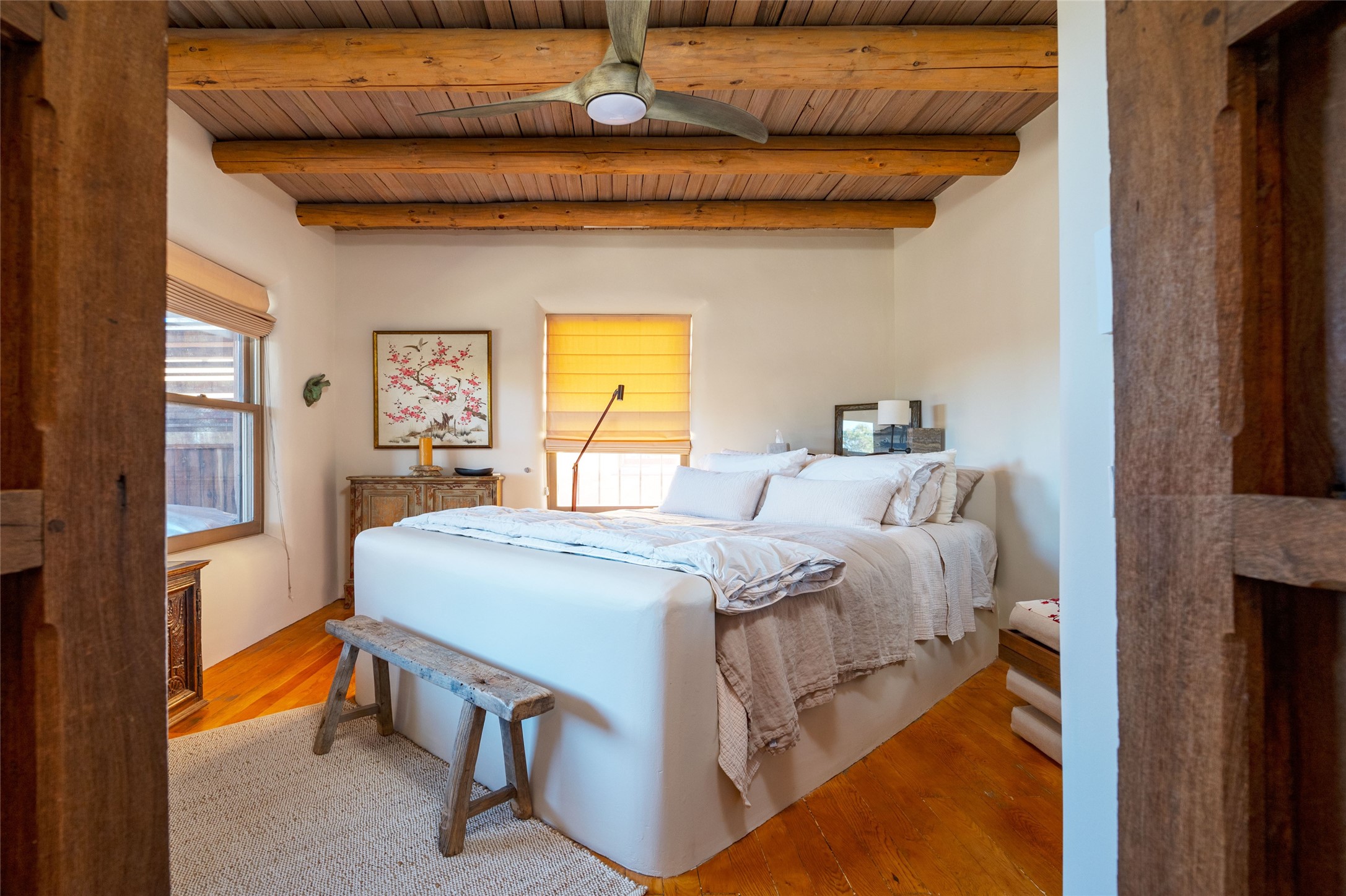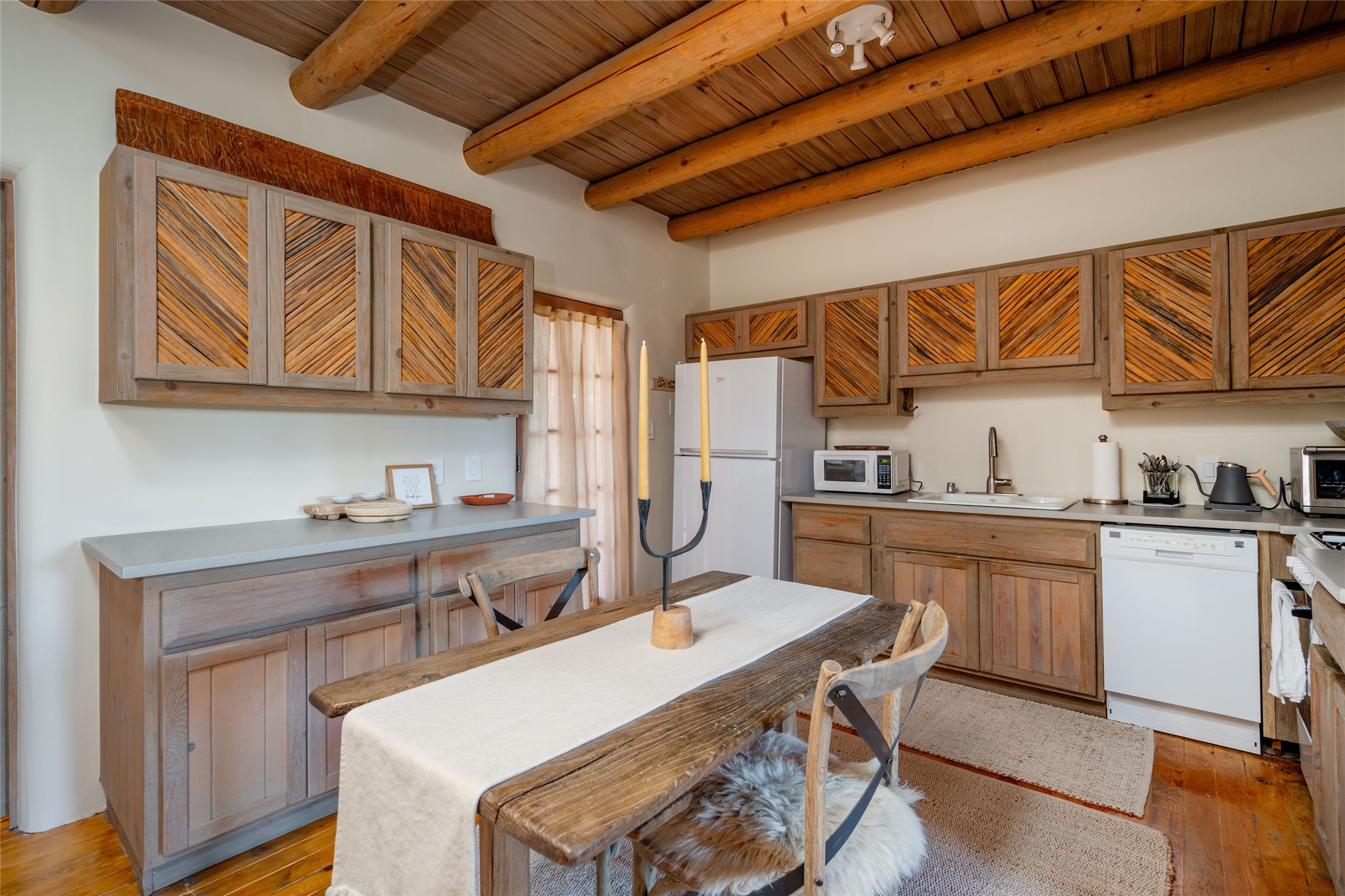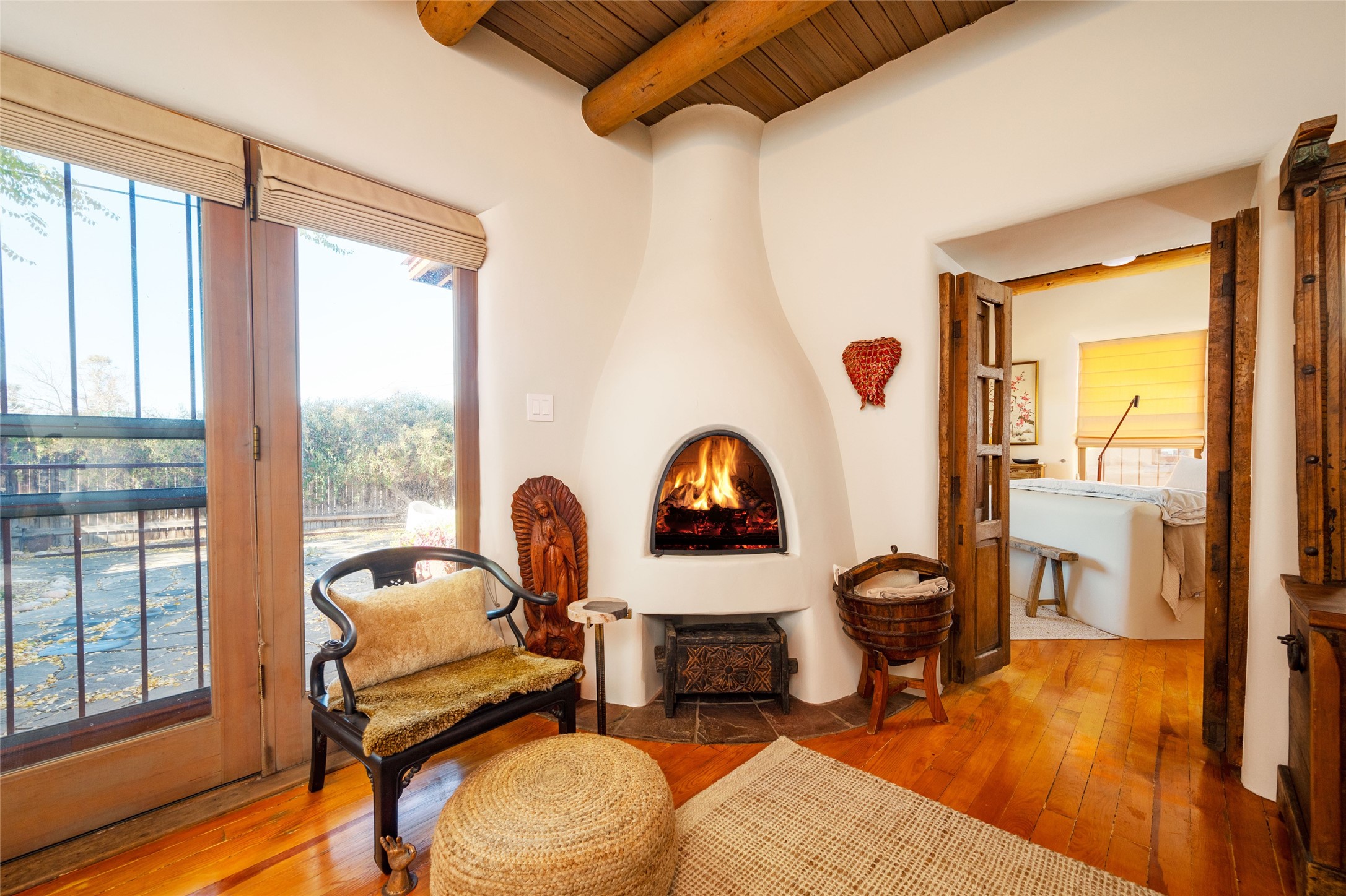 Enchanting, updated 1 bedroom 1 bath condo in the desirable, close-in Guadalupe Historic District. Single level, no interior steps. Iconic Santa Fe style with vigas and tongue and groove ceilings, kiva fireplace, bancos, and pine plank flooring. Updated chef's kitchen with quartz counters and plenty of storage. Spacious flagstone patio and garden area offer expanded living and dining. A perfect place for entertaining and enjoying the New Mexico skies. One reserved parking space. Coveted location close to the Santa Fe Railyard District, the historic Plaza and Museum Hill.