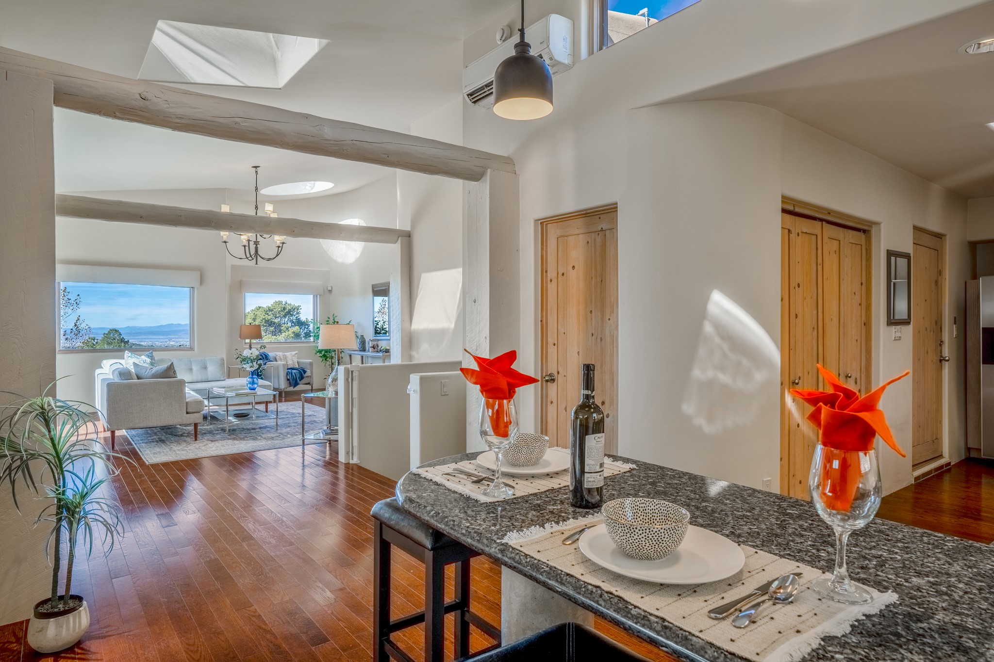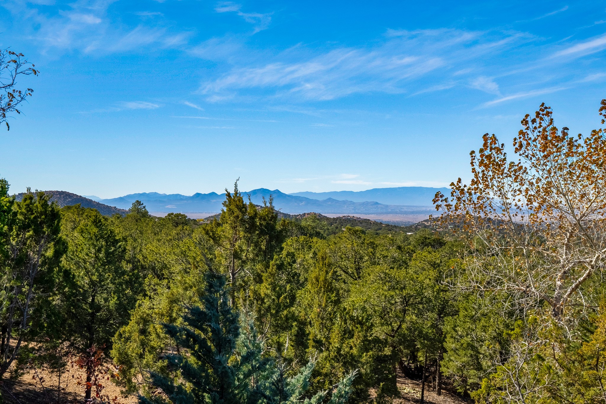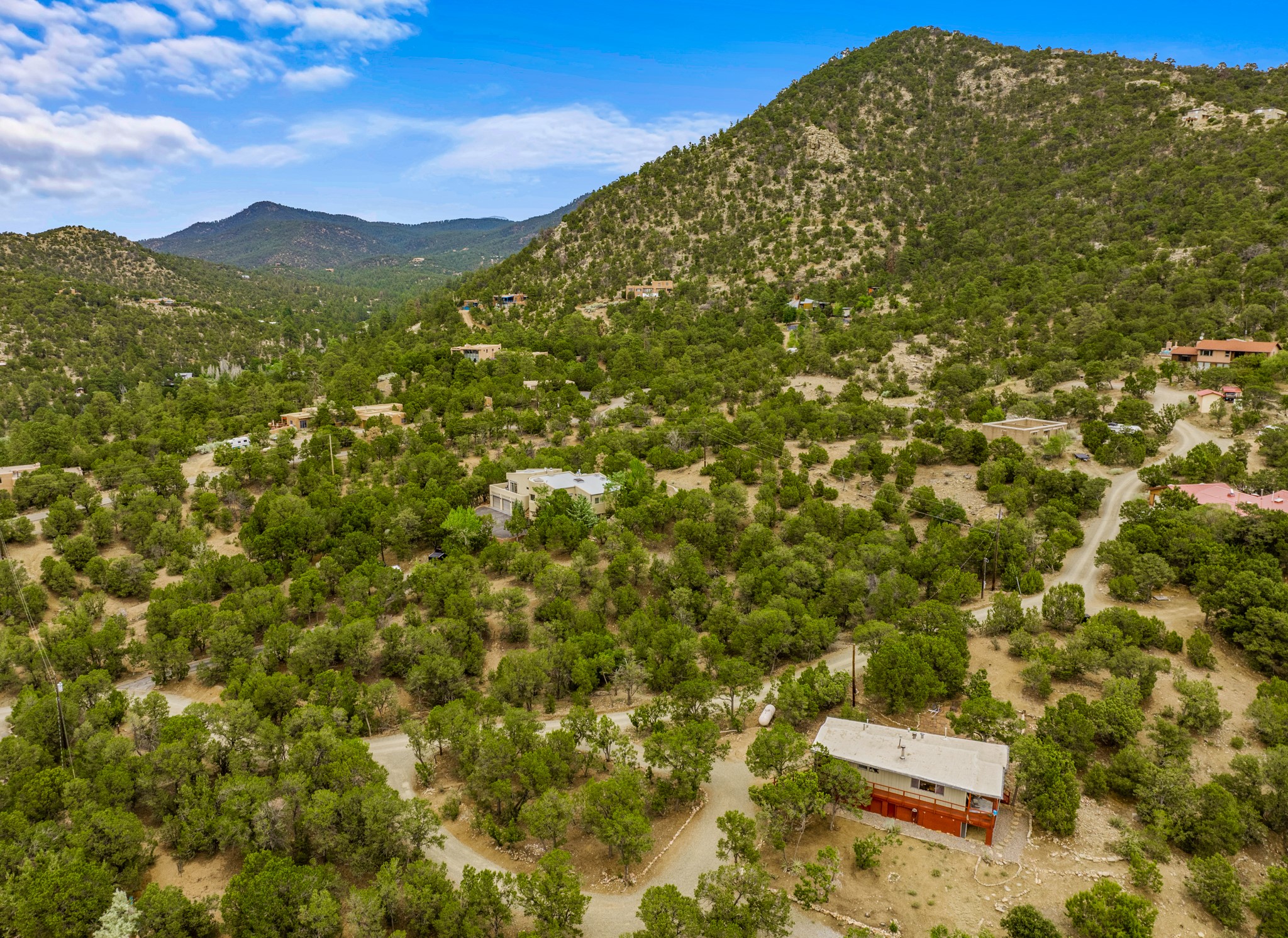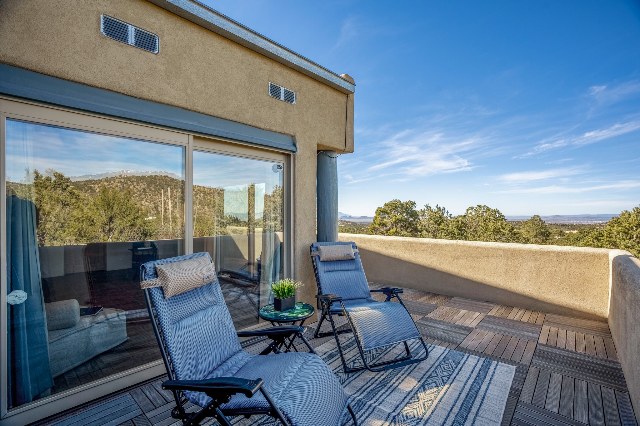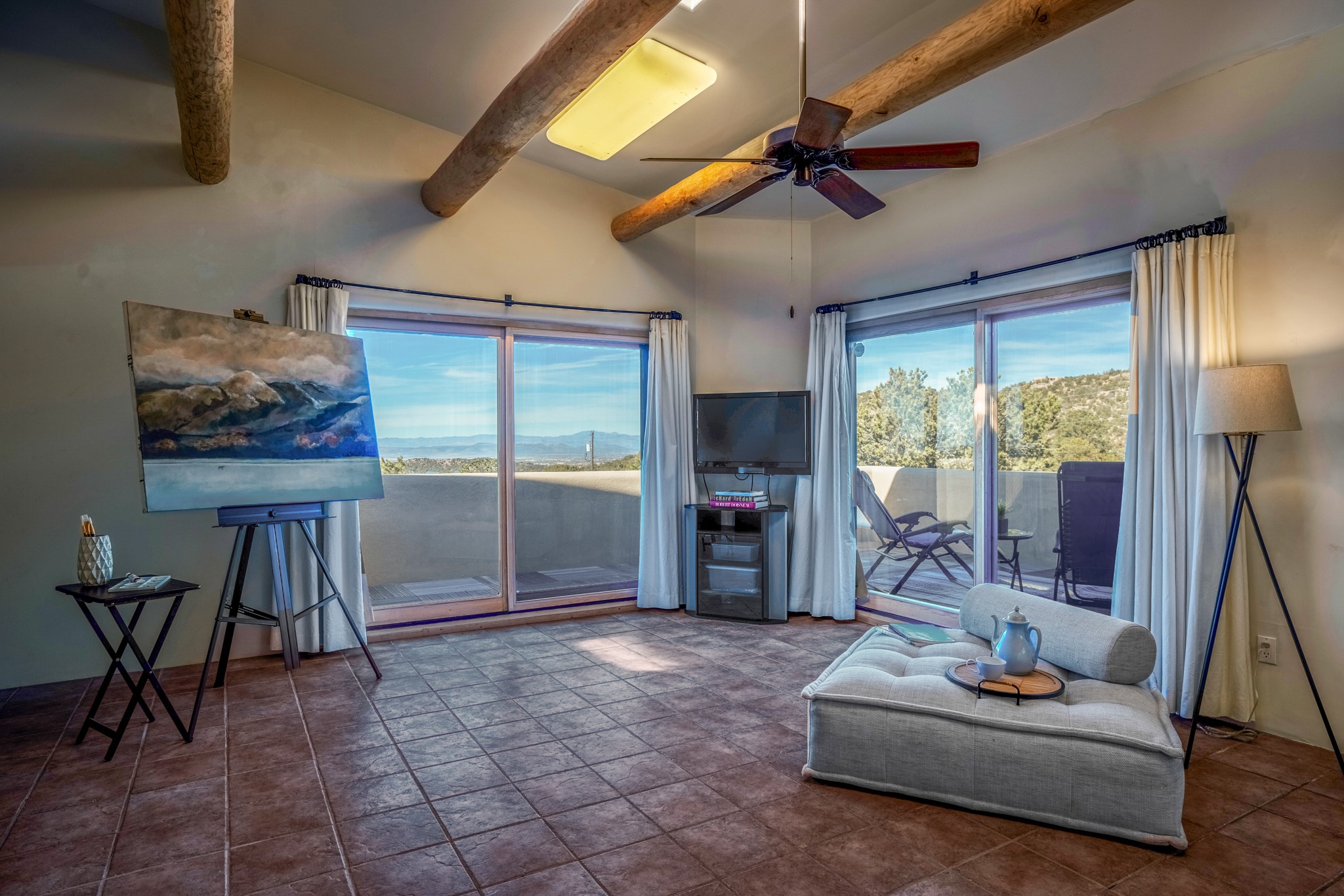 Nestled into the mountainside landscape and sited on approx. 4 acres, this sublimely private residence (home, studio, & guesthouse...PASSIVE INCOME built-in!!!) is a short, 7-minute drive to downtown Santa Fe. Here, contemporary style blends seamlessly with Southwestern elements, allowing light & shadow to play off of plaster walls, high ceilings, and gleaming wood floors.This spacious 2800+/- sqft home offers comfort and quietude with VIEWS. The floor plan thoughtfully utilizes a grand foyer to separate the 2-level home from the attached studio (+/-526sqft) with terrace above a 3-car garage. Tucked into the hillside on the ground level, the owners suite, two additional bedrooms, and a hallway bath are truly serene. An open concept living space fills the upper level with a sleek kitchen, den, dining, and living rooms, all with picture windows that frame fabulous mountain vistas. This enchanting home also includes a separate hillside homesite, entered by a circular driveway, with a mobile home that has been reimagined and enhanced to +/- 630 sqft with tasteful additions. The large wrap-around porch greets guests while the large flagstone patio provides ample room for entertaining in the back. A cozy interior features a full kitchen with dining nook, bedroom suite with an attached bathroom and built-in cabinetry, and a spacious living room with a wood stove. Lots of natural light bathes the spaces and views of tree tops and far off mountains add to the appeal. With room to roam and spaces to captivate, as well as air conditioning, well water, filtration systems, and thorough maintenance records, this unique property awaits your imprint.