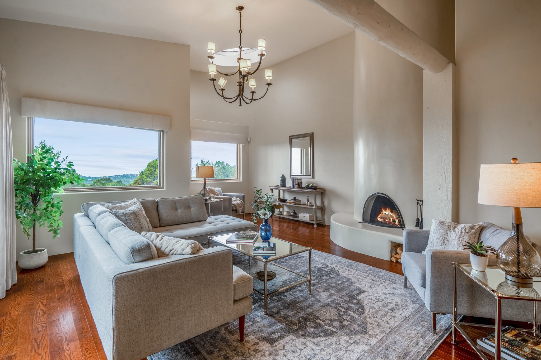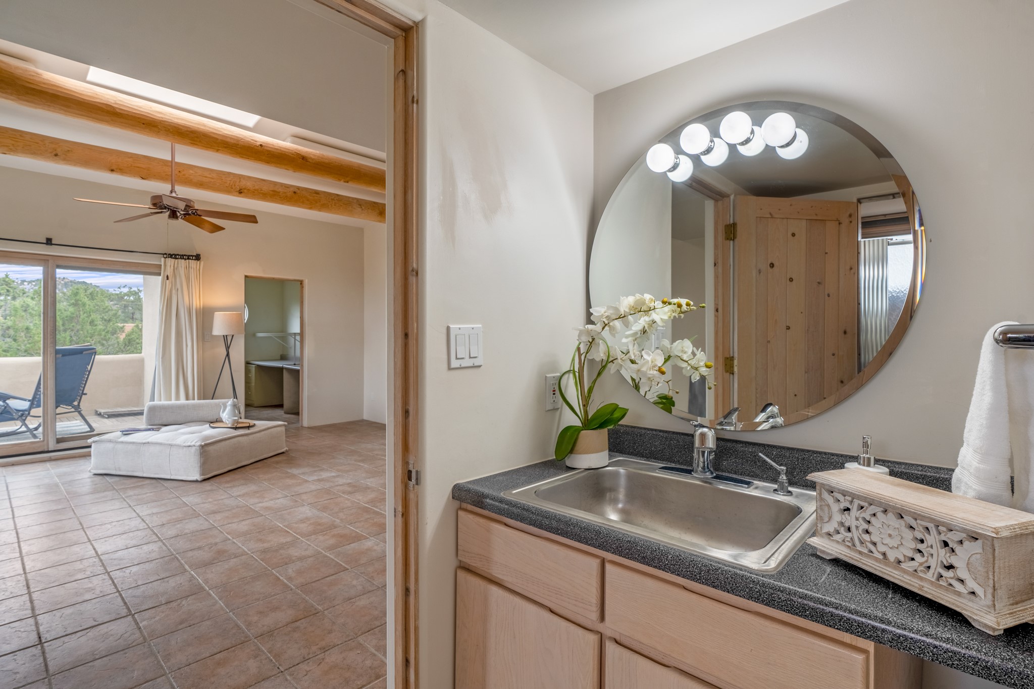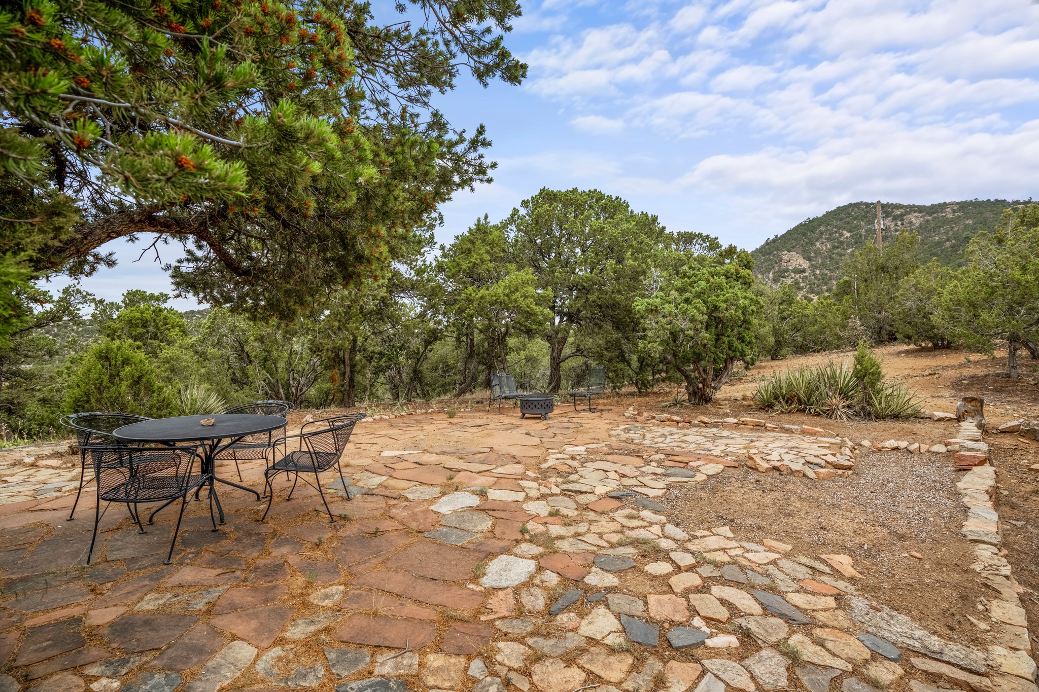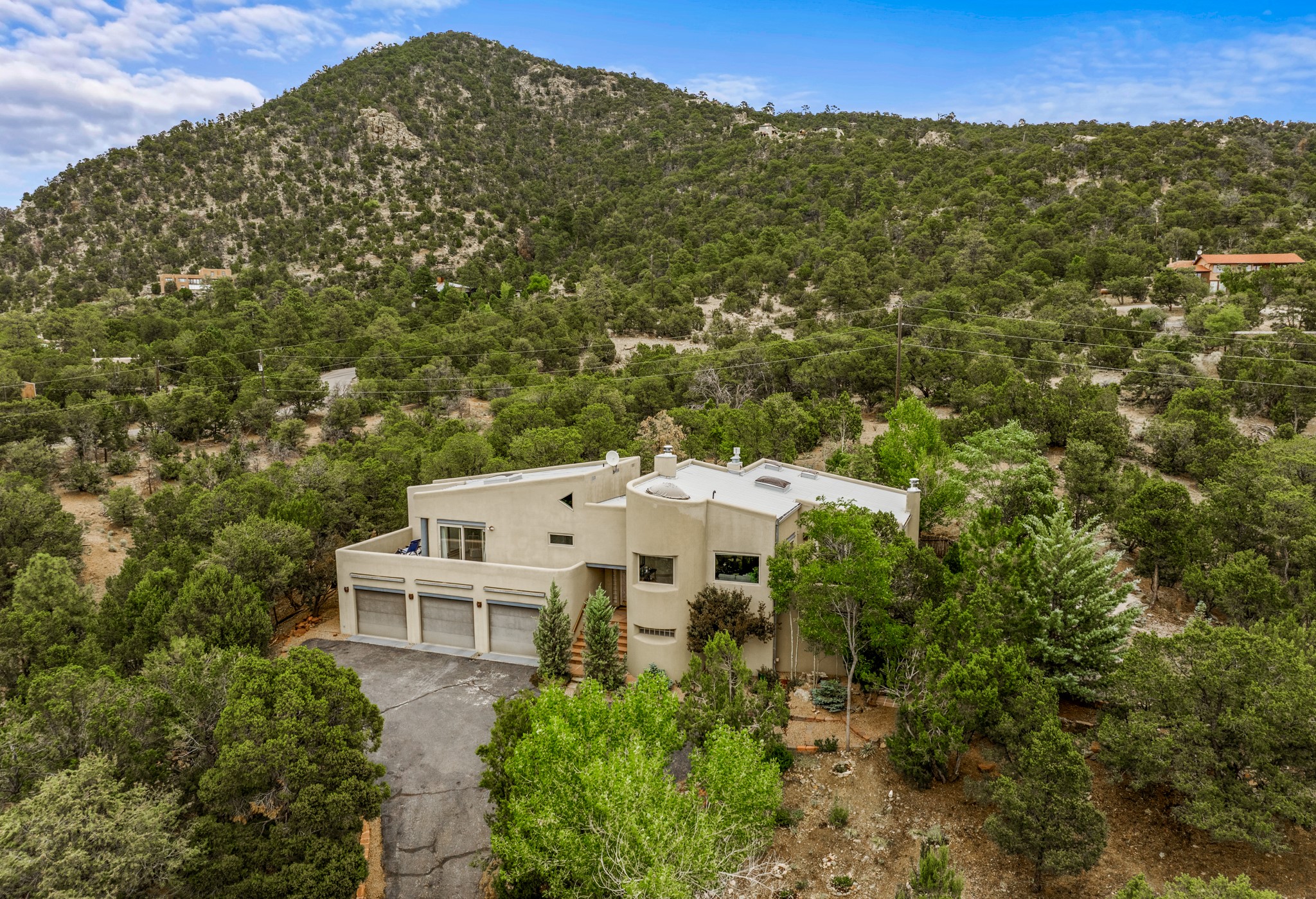 Nestled into the mountainside landscape and sited on approx. 4 acres, this sublimely private residence (home, studio, & guesthouse...PASSIVE INCOME built-in!!!) is a short, 7-minute drive to downtown Santa Fe. Here, contemporary style blends seamlessly with Southwestern elements, allowing light & shadow to play off of plaster walls, high ceilings, and gleaming wood floors.This spacious 2800+/- sqft home offers comfort and quietude with VIEWS. The floor plan thoughtfully utilizes a grand foyer to separate the 2-level home from the attached studio (+/-526sqft) with terrace above a 3-car garage. Tucked into the hillside on the ground level, the owners suite, two additional bedrooms, and a hallway bath are truly serene. An open concept living space fills the upper level with a sleek kitchen, den, dining, and living rooms, all with picture windows that frame fabulous mountain vistas. This enchanting home also includes a separate hillside homesite, entered by a circular driveway, with a mobile home that has been reimagined and enhanced to +/- 630 sqft with tasteful additions. The large wrap-around porch greets guests while the large flagstone patio provides ample room for entertaining in the back. A cozy interior features a full kitchen with dining nook, bedroom suite with an attached bathroom and built-in cabinetry, and a spacious living room with a wood stove. Lots of natural light bathes the spaces and views of tree tops and far off mountains add to the appeal. With room to roam and spaces to captivate, as well as air conditioning, well water, filtration systems, and thorough maintenance records, this unique property awaits your imprint.