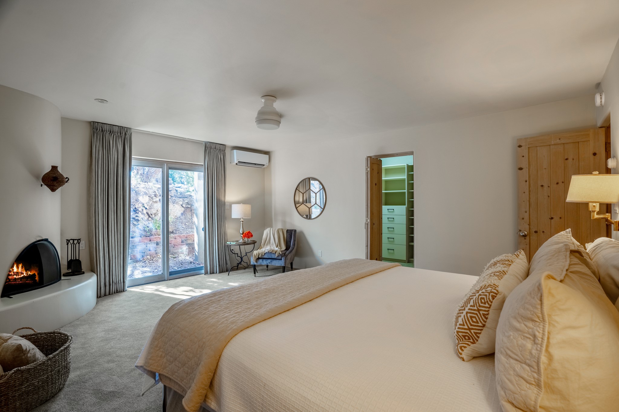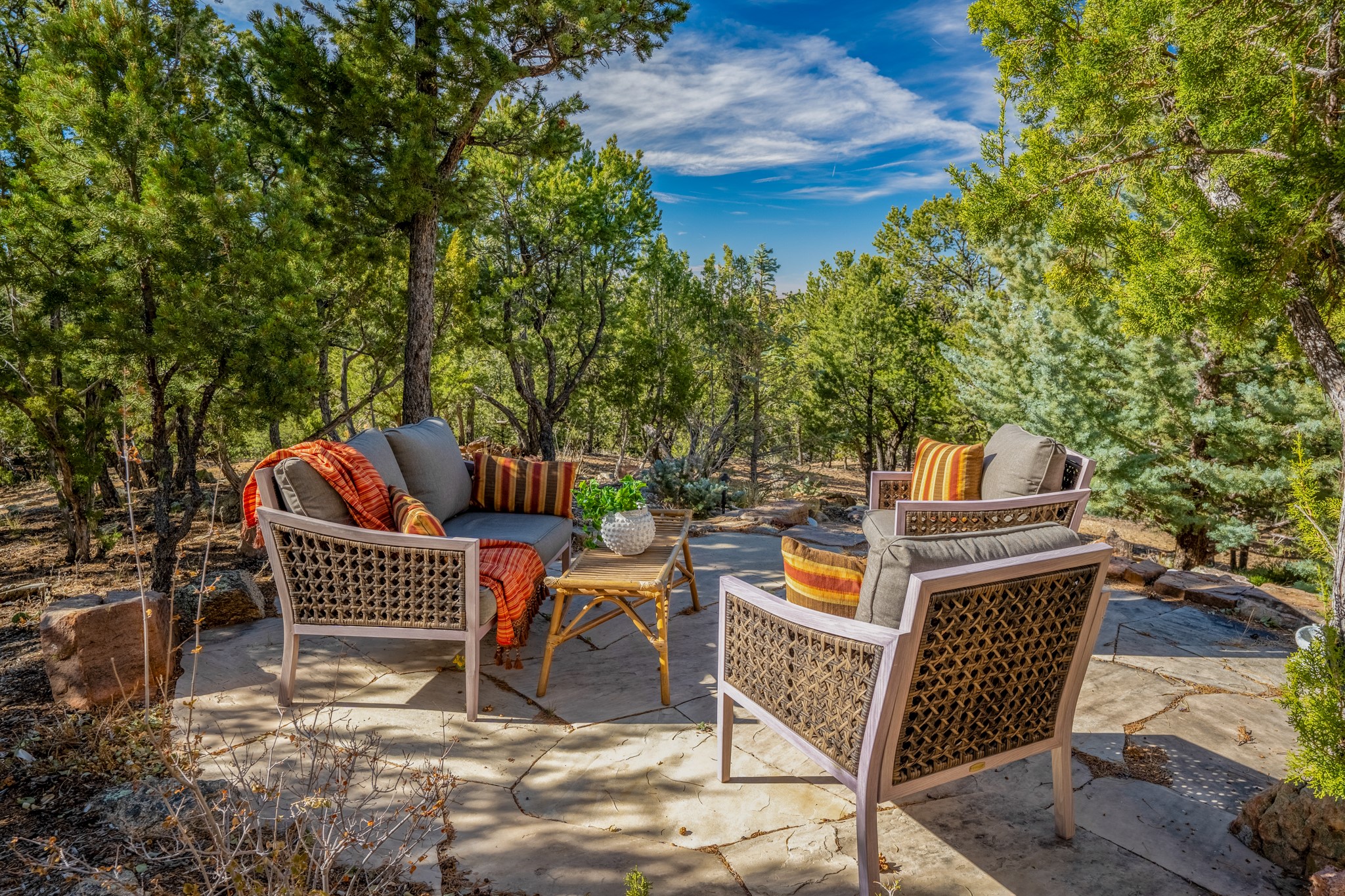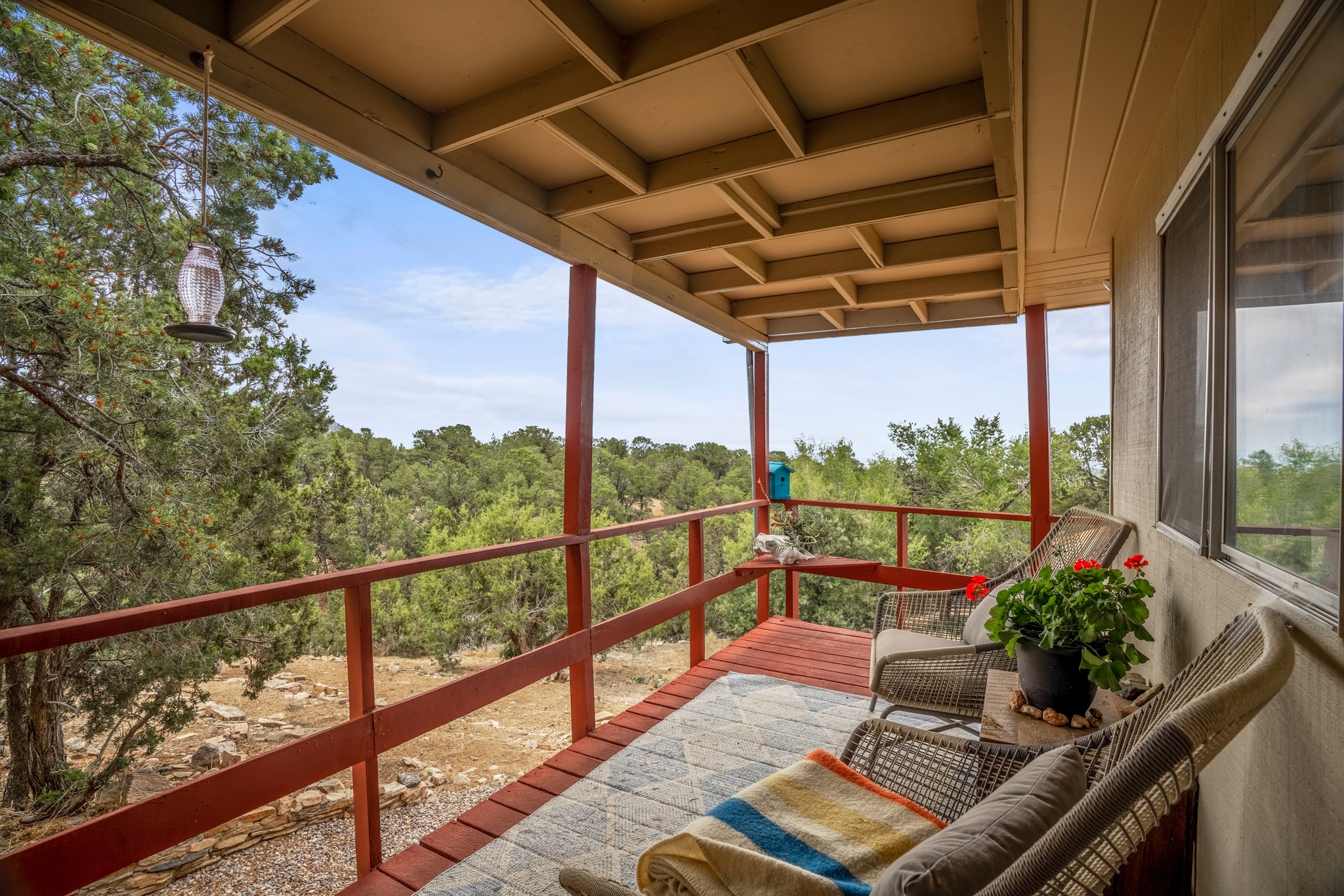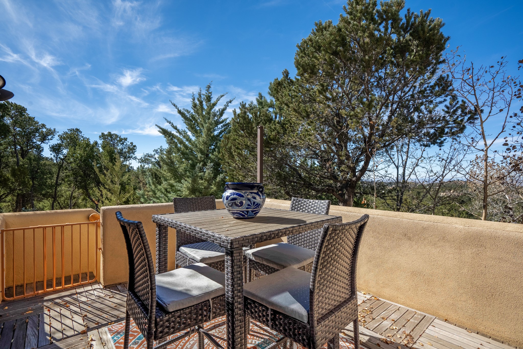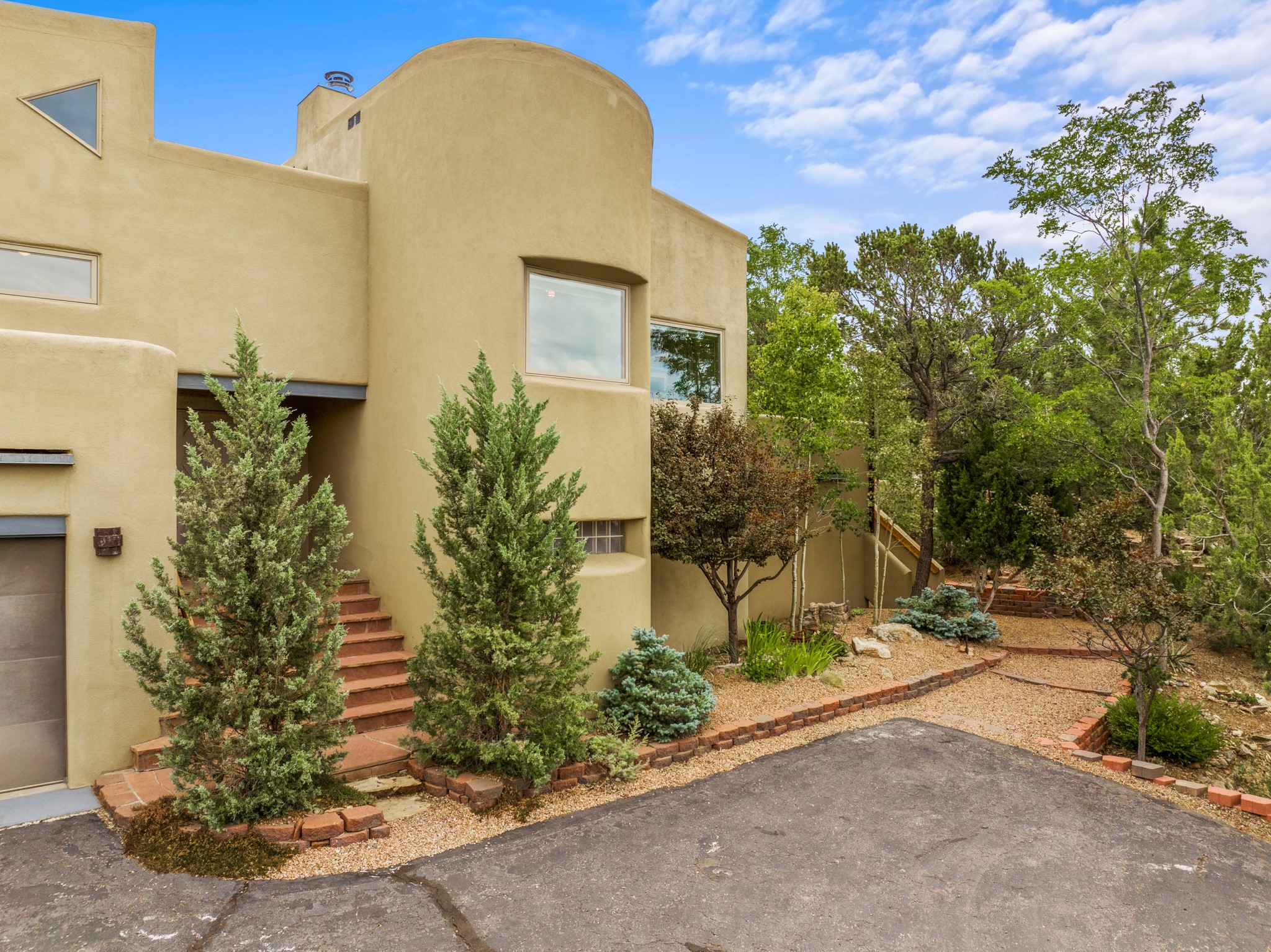 Nestled into the mountainside landscape and sited on approx. 4 acres, this sublimely private residence (home, studio, & guesthouse...PASSIVE INCOME built-in!!!) is a short, 7-minute drive to downtown Santa Fe. Here, contemporary style blends seamlessly with Southwestern elements, allowing light & shadow to play off of plaster walls, high ceilings, and gleaming wood floors.This spacious 2800+/- sqft home offers comfort and quietude with VIEWS. The floor plan thoughtfully utilizes a grand foyer to separate the 2-level home from the attached studio (+/-526sqft) with terrace above a 3-car garage. Tucked into the hillside on the ground level, the owners suite, two additional bedrooms, and a hallway bath are truly serene. An open concept living space fills the upper level with a sleek kitchen, den, dining, and living rooms, all with picture windows that frame fabulous mountain vistas. This enchanting home also includes a separate hillside homesite, entered by a circular driveway, with a mobile home that has been reimagined and enhanced to +/- 630 sqft with tasteful additions. The large wrap-around porch greets guests while the large flagstone patio provides ample room for entertaining in the back. A cozy interior features a full kitchen with dining nook, bedroom suite with an attached bathroom and built-in cabinetry, and a spacious living room with a wood stove. Lots of natural light bathes the spaces and views of tree tops and far off mountains add to the appeal. With room to roam and spaces to captivate, as well as air conditioning, well water, filtration systems, and thorough maintenance records, this unique property awaits your imprint.