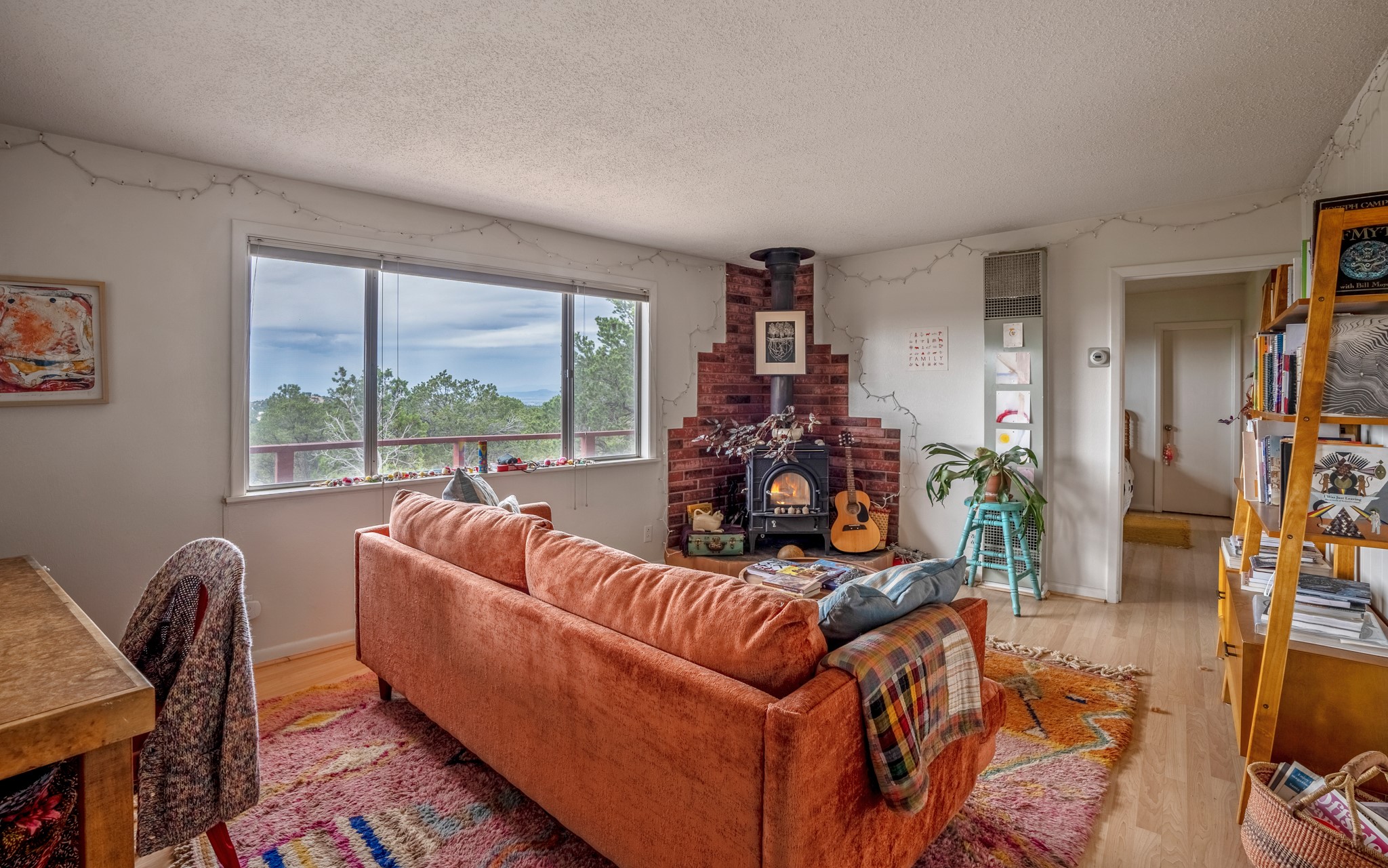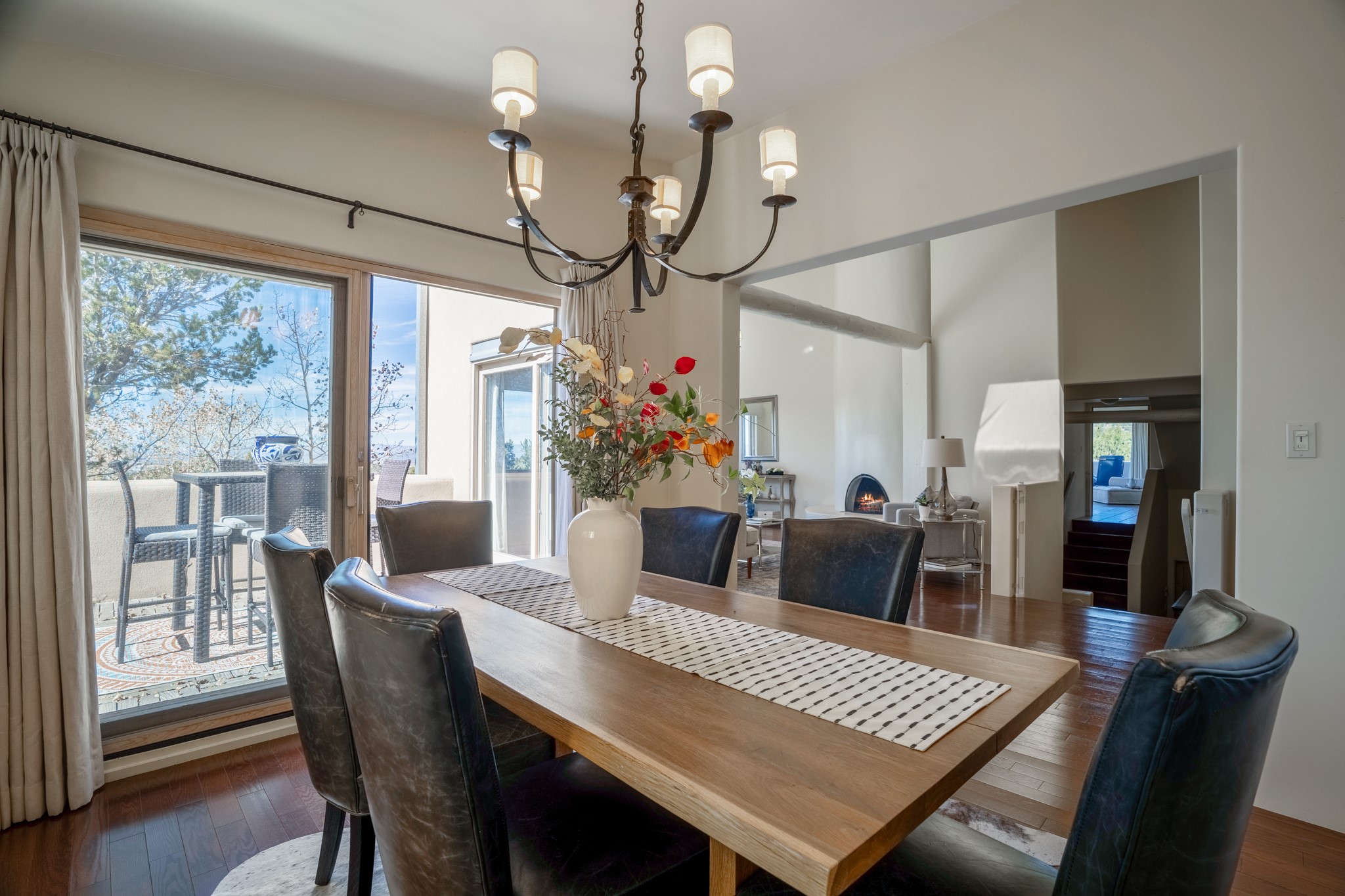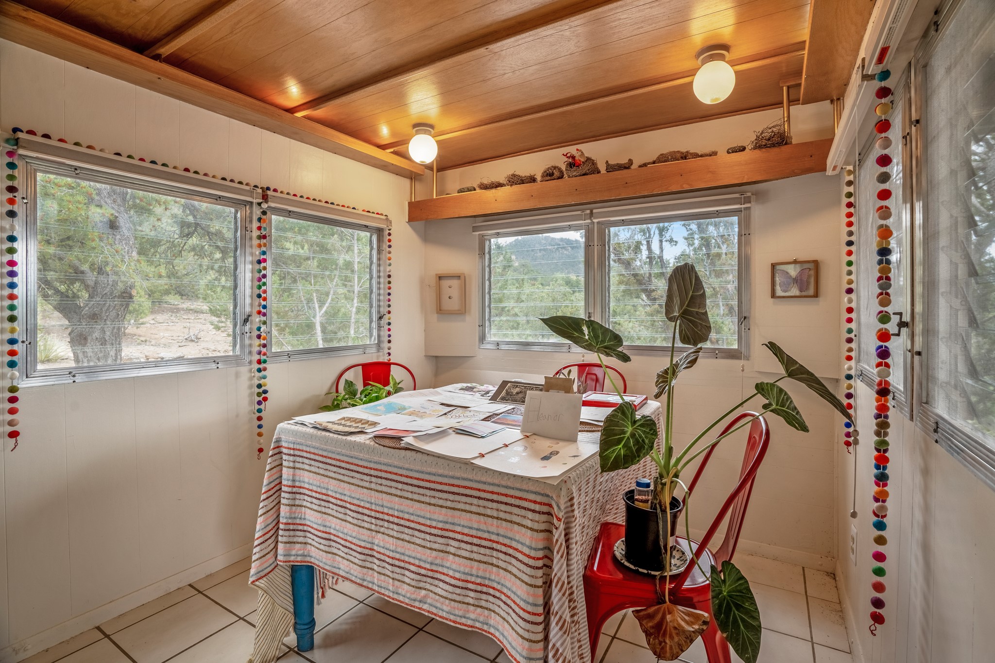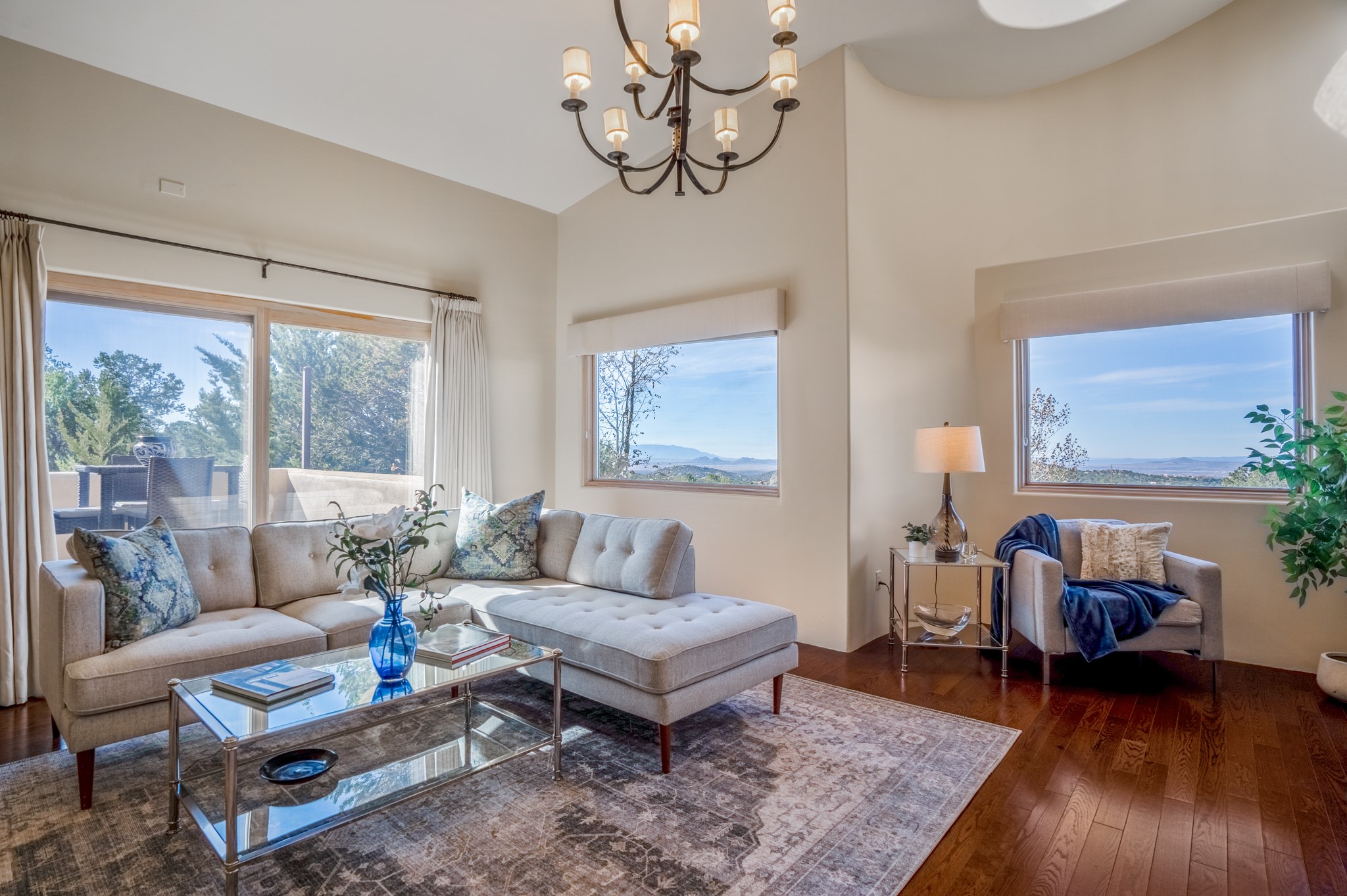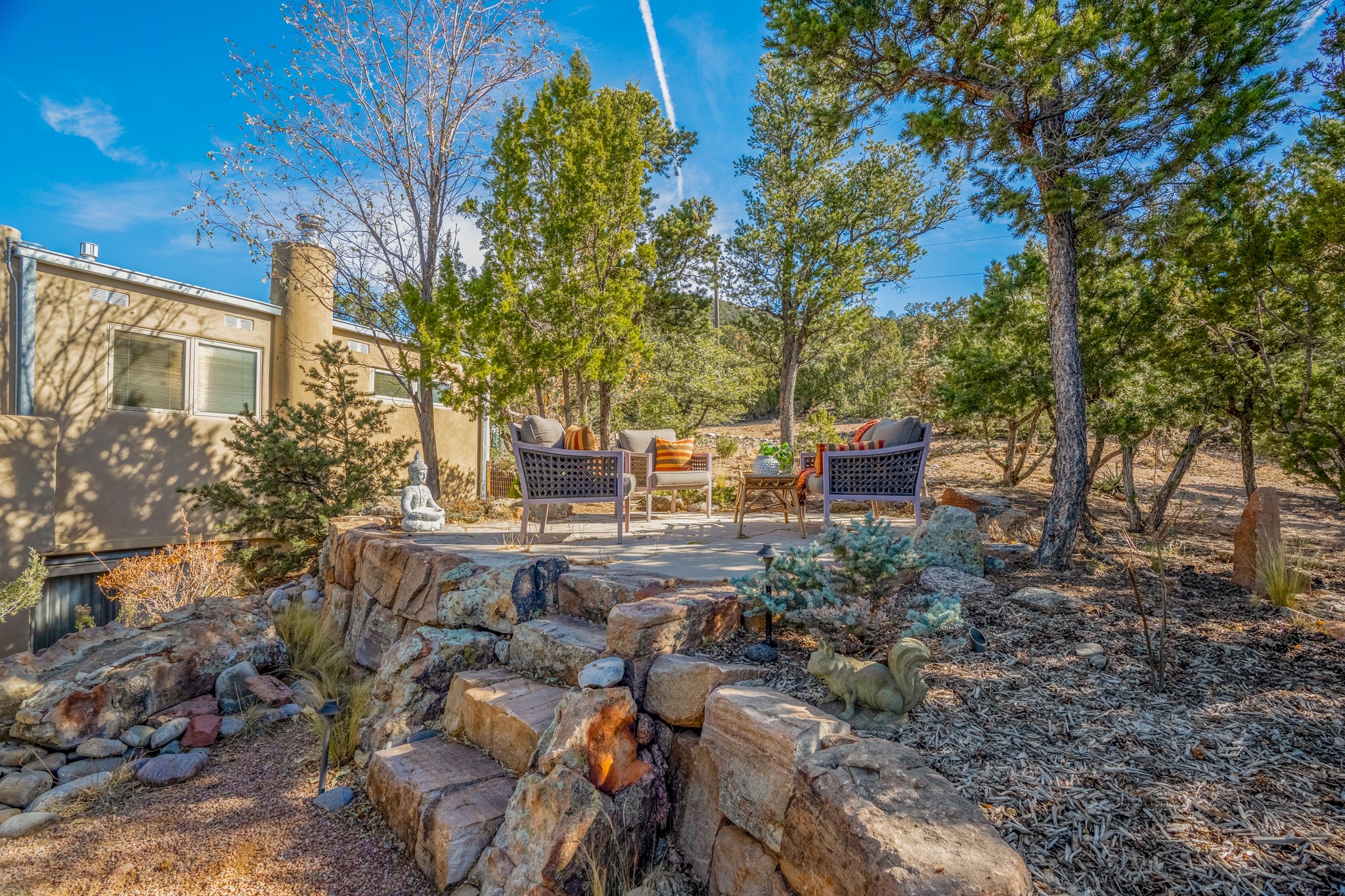 Nestled into the mountainside landscape and sited on approx. 4 acres, this sublimely private residence (home, studio, & guesthouse...PASSIVE INCOME built-in!!!) is a short, 7-minute drive to downtown Santa Fe. Here, contemporary style blends seamlessly with Southwestern elements, allowing light & shadow to play off of plaster walls, high ceilings, and gleaming wood floors.This spacious 2800+/- sqft home offers comfort and quietude with VIEWS. The floor plan thoughtfully utilizes a grand foyer to separate the 2-level home from the attached studio (+/-526sqft) with terrace above a 3-car garage. Tucked into the hillside on the ground level, the owners suite, two additional bedrooms, and a hallway bath are truly serene. An open concept living space fills the upper level with a sleek kitchen, den, dining, and living rooms, all with picture windows that frame fabulous mountain vistas. This enchanting home also includes a separate hillside homesite, entered by a circular driveway, with a mobile home that has been reimagined and enhanced to +/- 630 sqft with tasteful additions. The large wrap-around porch greets guests while the large flagstone patio provides ample room for entertaining in the back. A cozy interior features a full kitchen with dining nook, bedroom suite with an attached bathroom and built-in cabinetry, and a spacious living room with a wood stove. Lots of natural light bathes the spaces and views of tree tops and far off mountains add to the appeal. With room to roam and spaces to captivate, as well as air conditioning, well water, filtration systems, and thorough maintenance records, this unique property awaits your imprint.
