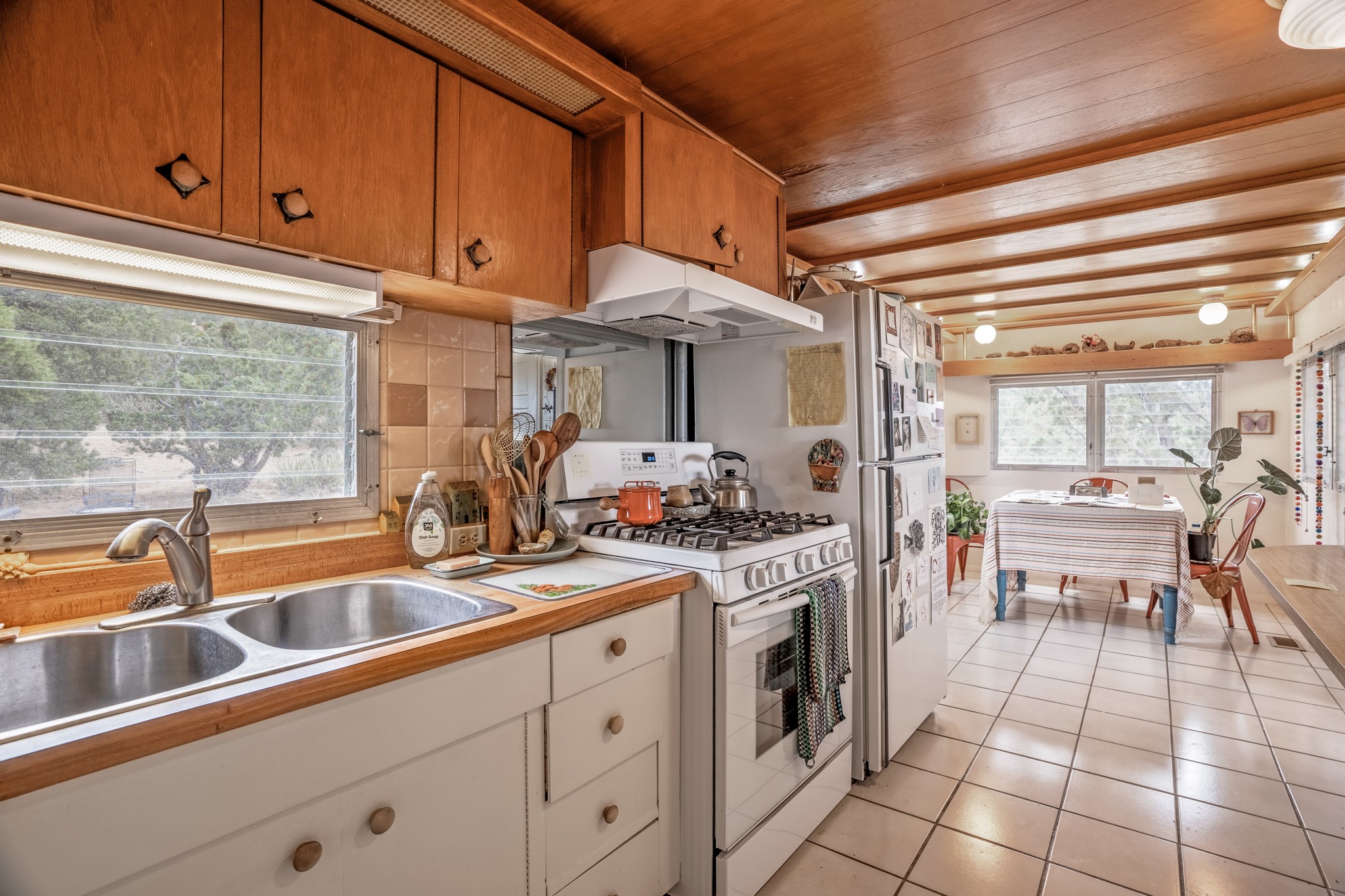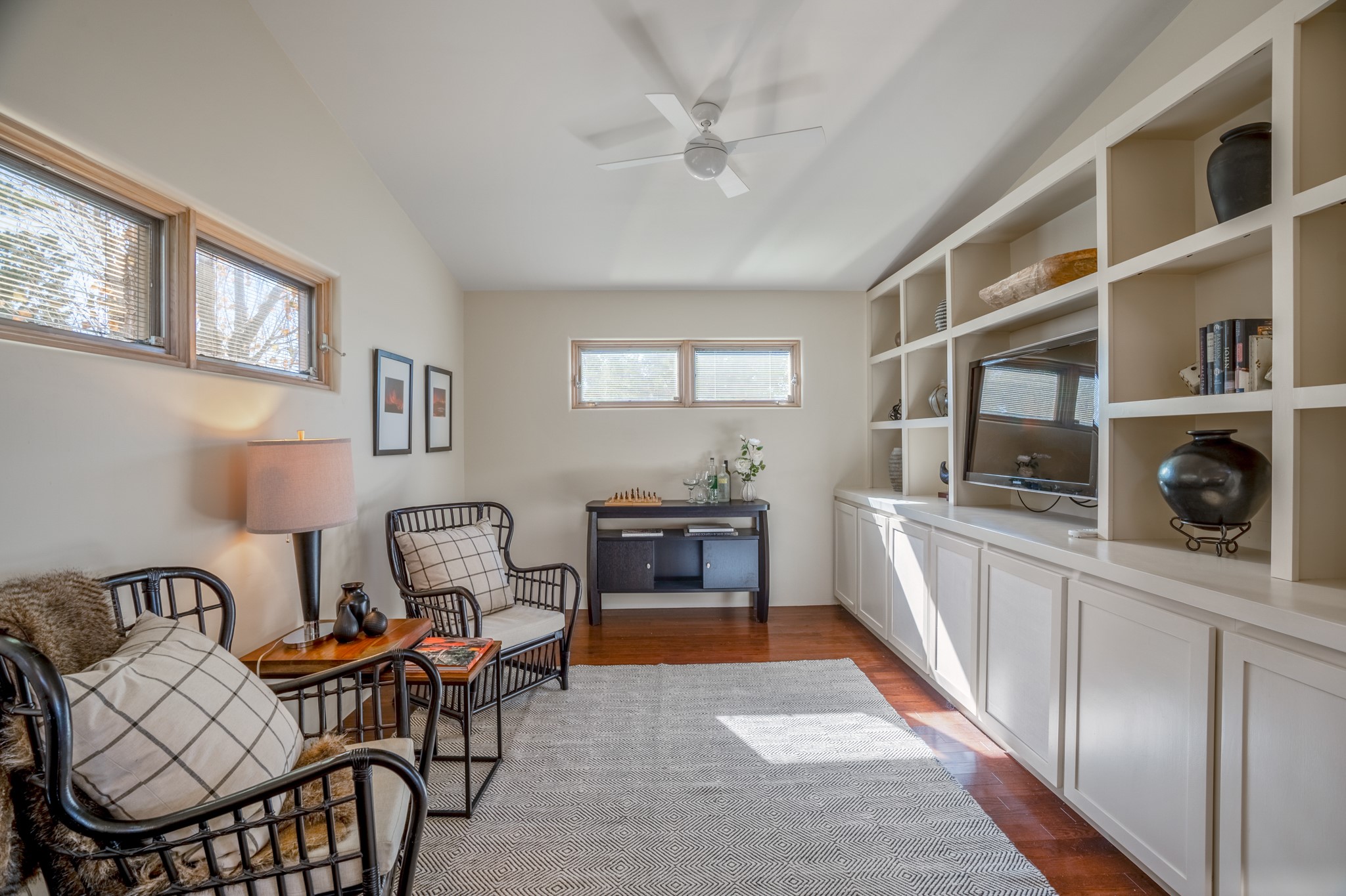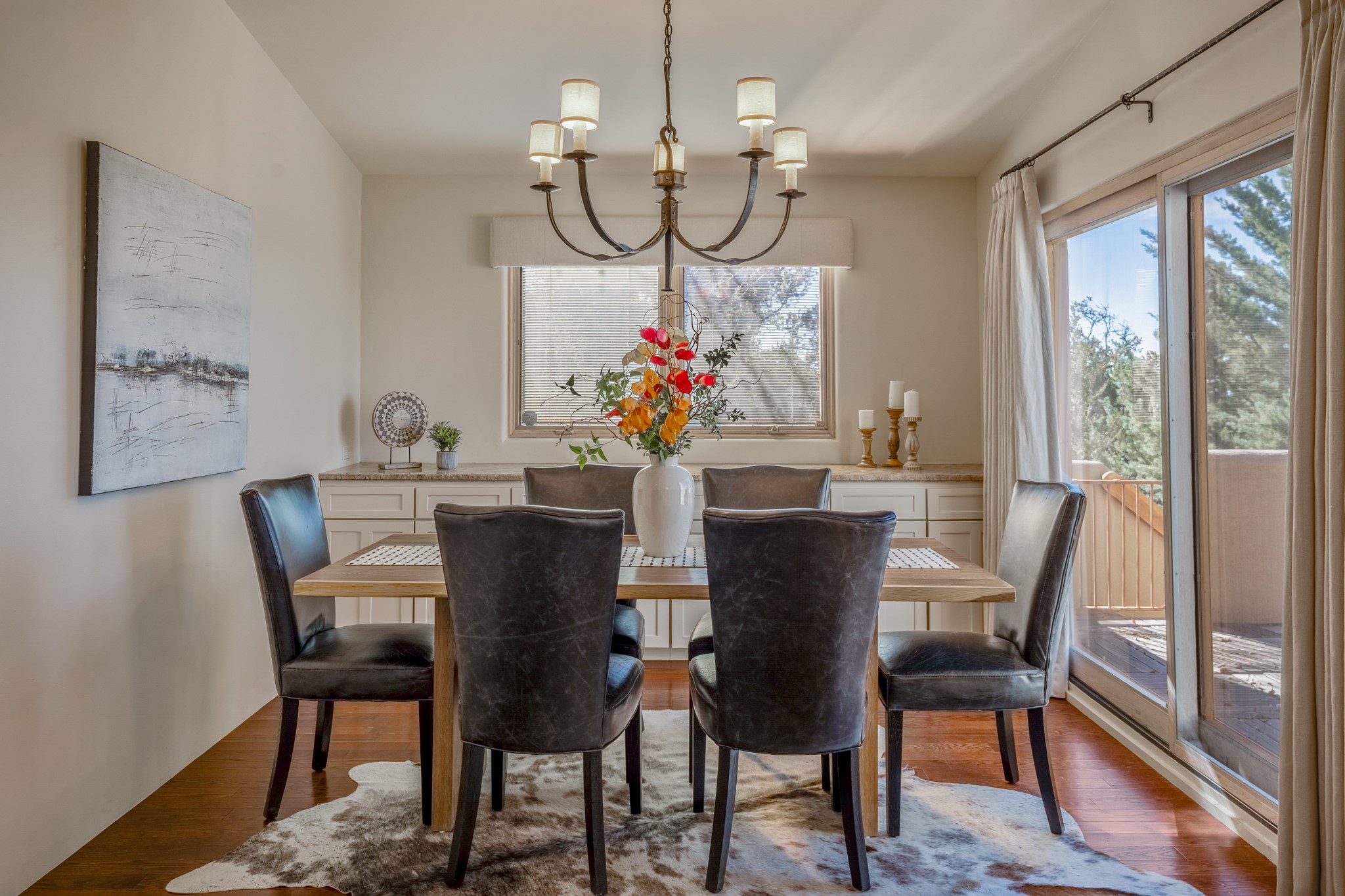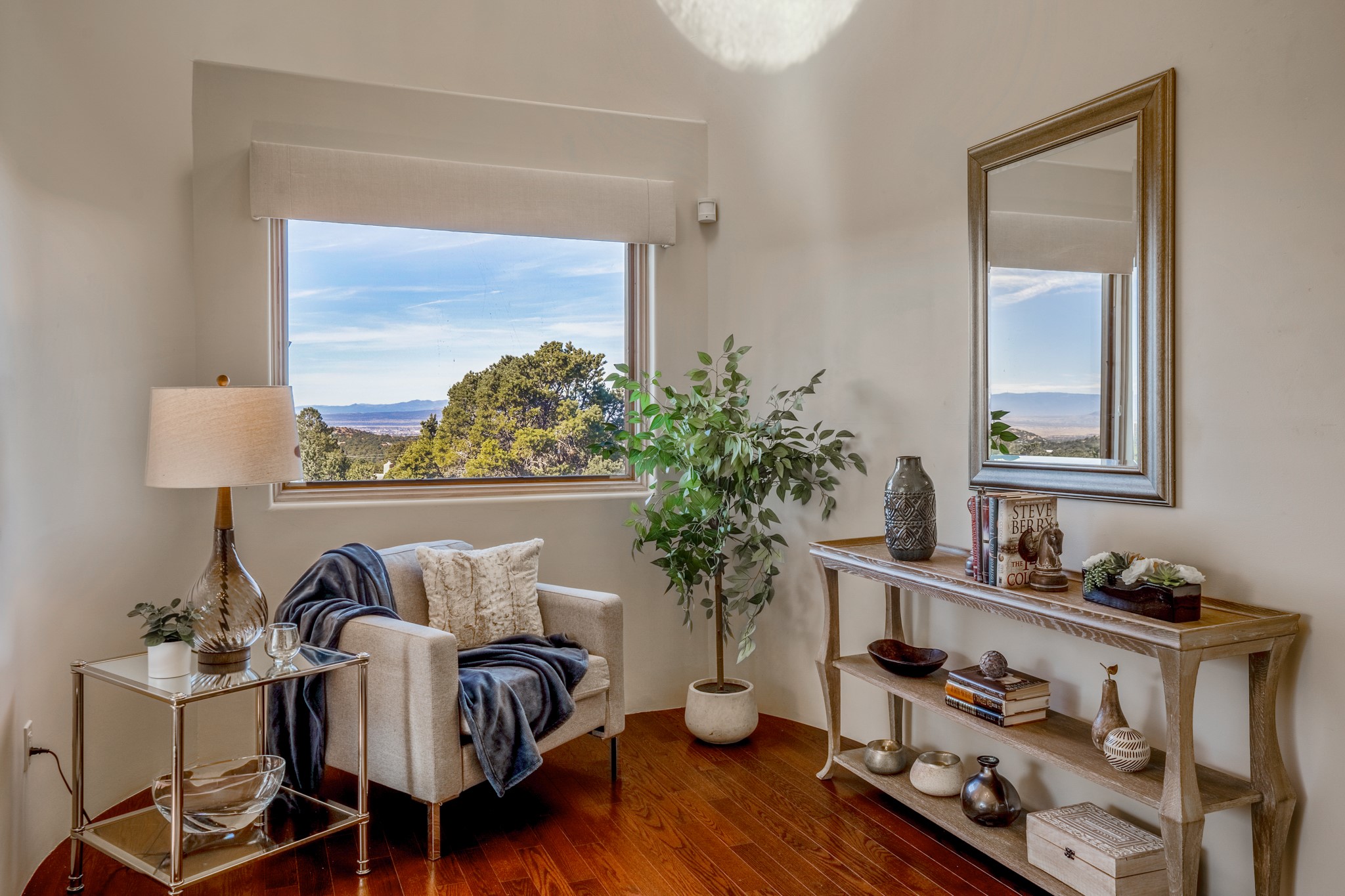 Nestled into the mountainside landscape and sited on approx. 4 acres, this sublimely private residence (home, studio, & guesthouse...PASSIVE INCOME built-in!!!) is a short, 7-minute drive to downtown Santa Fe. Here, contemporary style blends seamlessly with Southwestern elements, allowing light & shadow to play off of plaster walls, high ceilings, and gleaming wood floors.This spacious 2800+/- sqft home offers comfort and quietude with VIEWS. The floor plan thoughtfully utilizes a grand foyer to separate the 2-level home from the attached studio (+/-526sqft) with terrace above a 3-car garage. Tucked into the hillside on the ground level, the owners suite, two additional bedrooms, and a hallway bath are truly serene. An open concept living space fills the upper level with a sleek kitchen, den, dining, and living rooms, all with picture windows that frame fabulous mountain vistas. This enchanting home also includes a separate hillside homesite, entered by a circular driveway, with a mobile home that has been reimagined and enhanced to +/- 630 sqft with tasteful additions. The large wrap-around porch greets guests while the large flagstone patio provides ample room for entertaining in the back. A cozy interior features a full kitchen with dining nook, bedroom suite with an attached bathroom and built-in cabinetry, and a spacious living room with a wood stove. Lots of natural light bathes the spaces and views of tree tops and far off mountains add to the appeal. With room to roam and spaces to captivate, as well as air conditioning, well water, filtration systems, and thorough maintenance records, this unique property awaits your imprint.