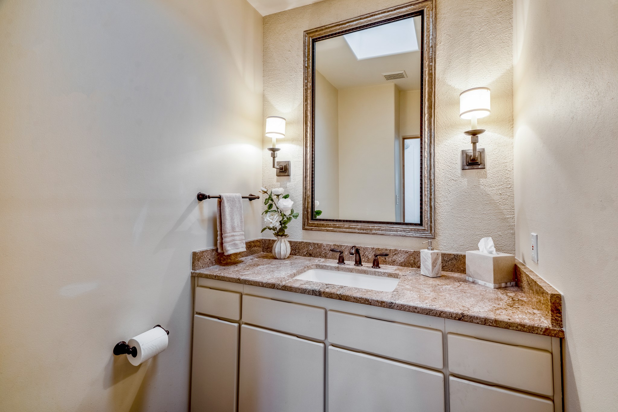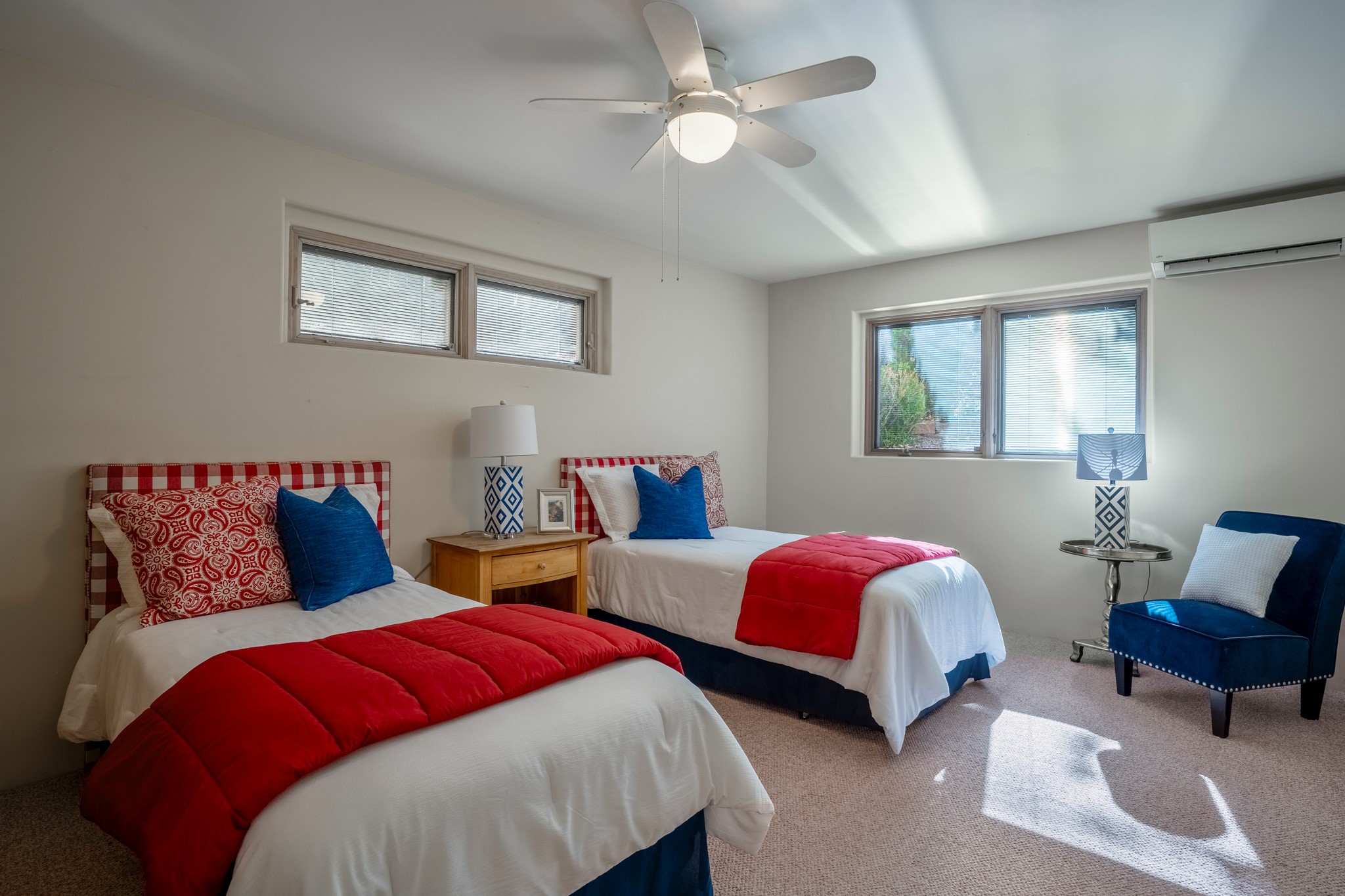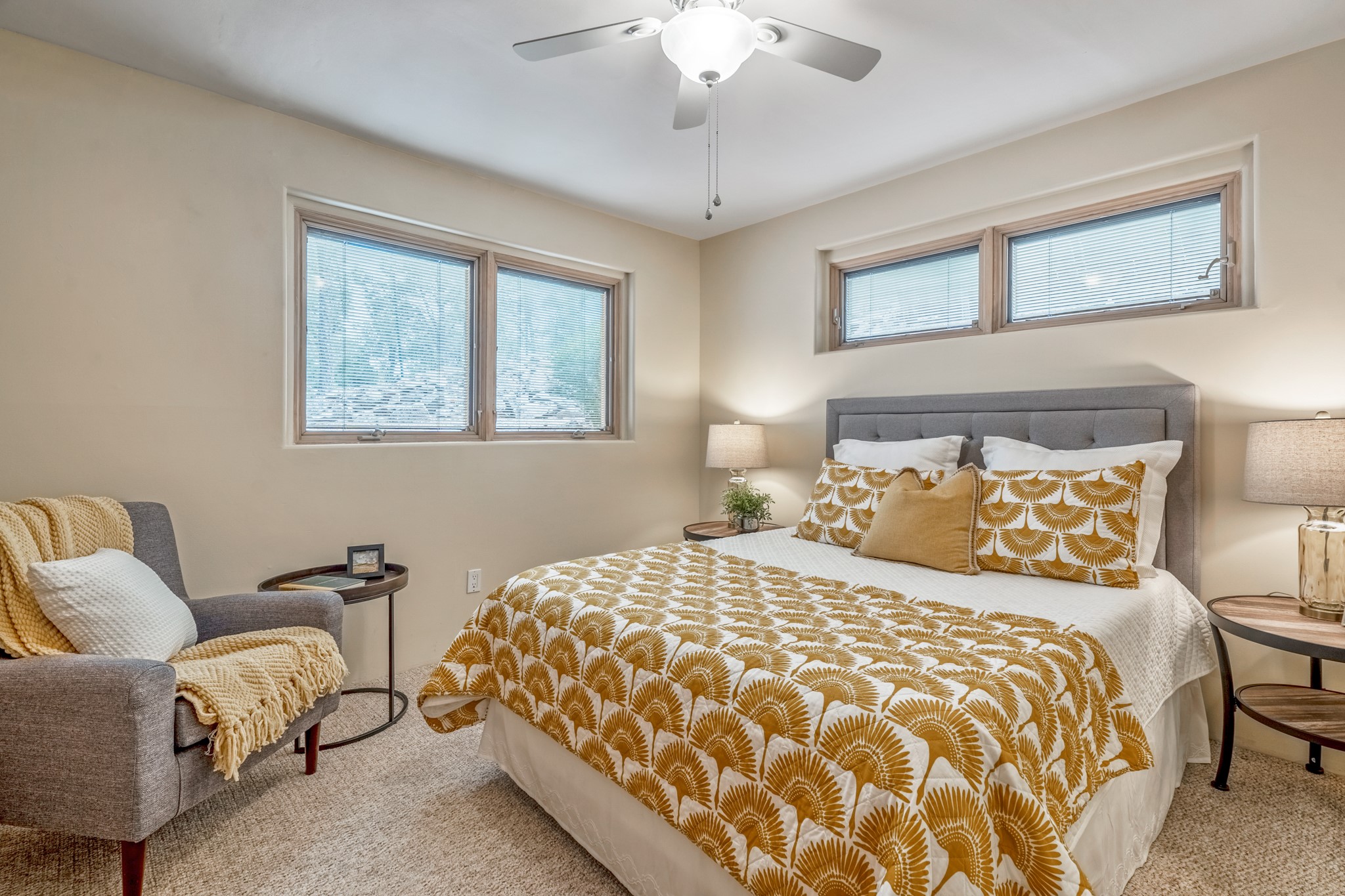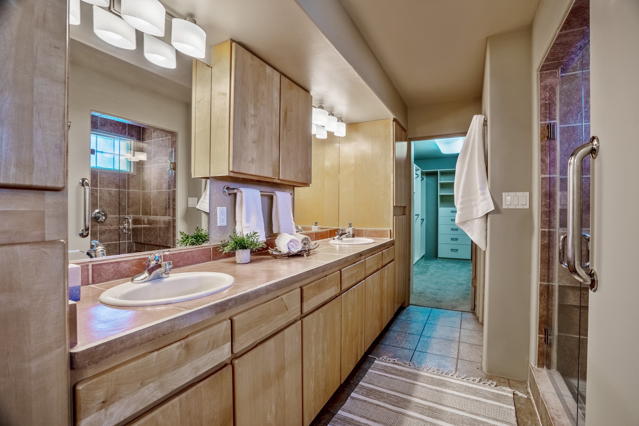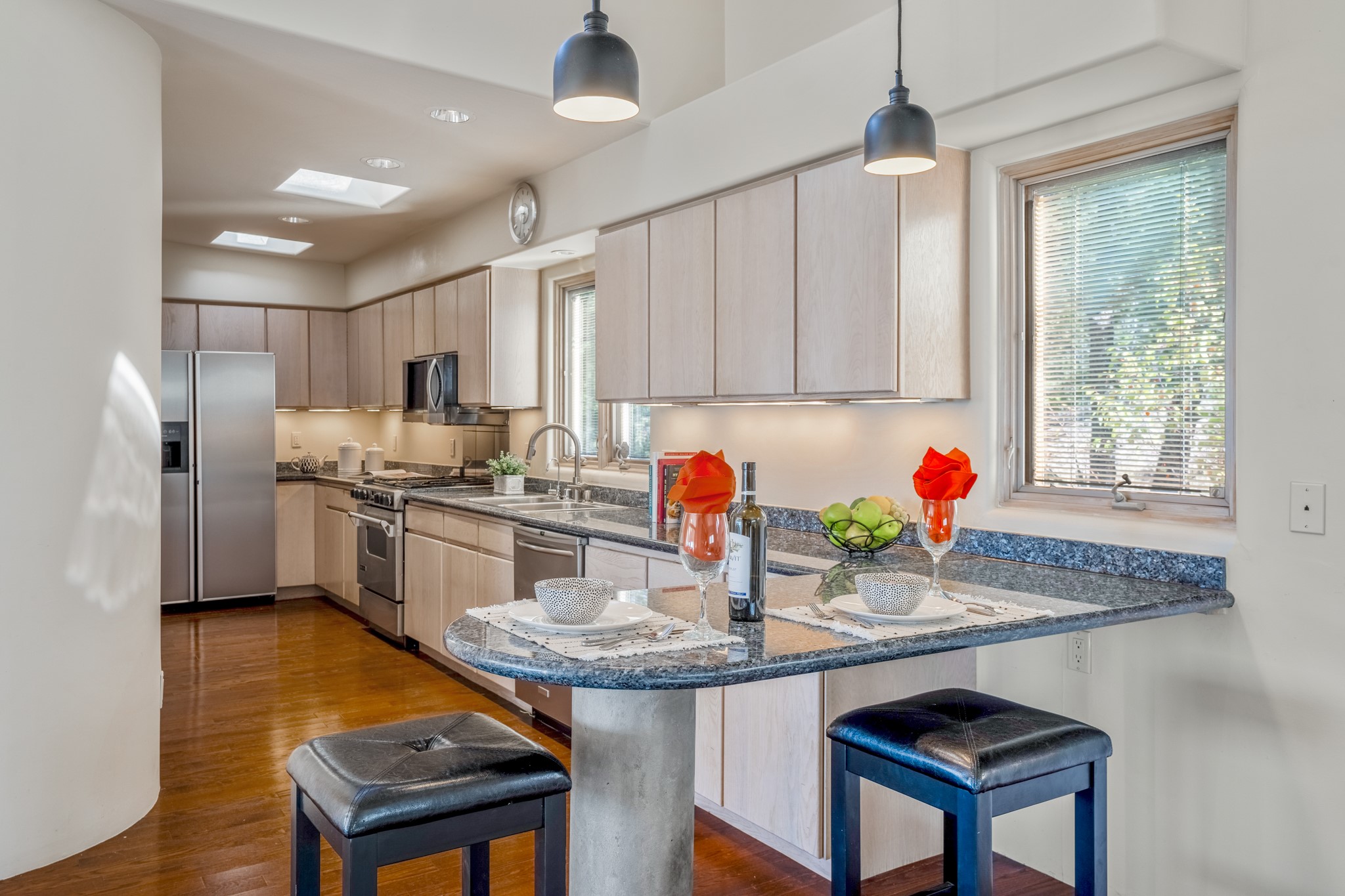 Nestled into the mountainside landscape and sited on approx. 4 acres, this sublimely private residence (home, studio, & guesthouse...PASSIVE INCOME built-in!!!) is a short, 7-minute drive to downtown Santa Fe. Here, contemporary style blends seamlessly with Southwestern elements, allowing light & shadow to play off of plaster walls, high ceilings, and gleaming wood floors.This spacious 2800+/- sqft home offers comfort and quietude with VIEWS. The floor plan thoughtfully utilizes a grand foyer to separate the 2-level home from the attached studio (+/-526sqft) with terrace above a 3-car garage. Tucked into the hillside on the ground level, the owners suite, two additional bedrooms, and a hallway bath are truly serene. An open concept living space fills the upper level with a sleek kitchen, den, dining, and living rooms, all with picture windows that frame fabulous mountain vistas. This enchanting home also includes a separate hillside homesite, entered by a circular driveway, with a mobile home that has been reimagined and enhanced to +/- 630 sqft with tasteful additions. The large wrap-around porch greets guests while the large flagstone patio provides ample room for entertaining in the back. A cozy interior features a full kitchen with dining nook, bedroom suite with an attached bathroom and built-in cabinetry, and a spacious living room with a wood stove. Lots of natural light bathes the spaces and views of tree tops and far off mountains add to the appeal. With room to roam and spaces to captivate, as well as air conditioning, well water, filtration systems, and thorough maintenance records, this unique property awaits your imprint.