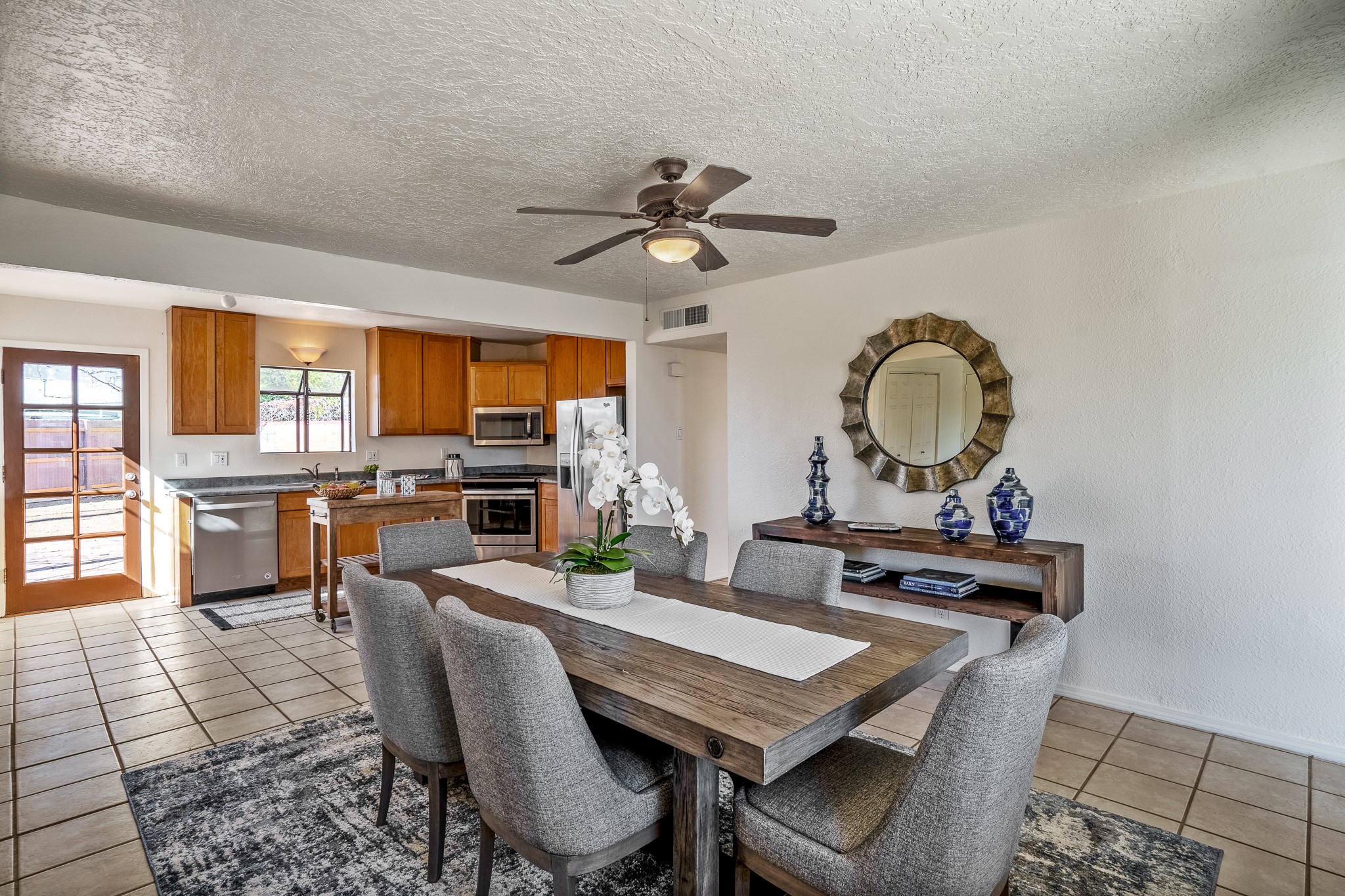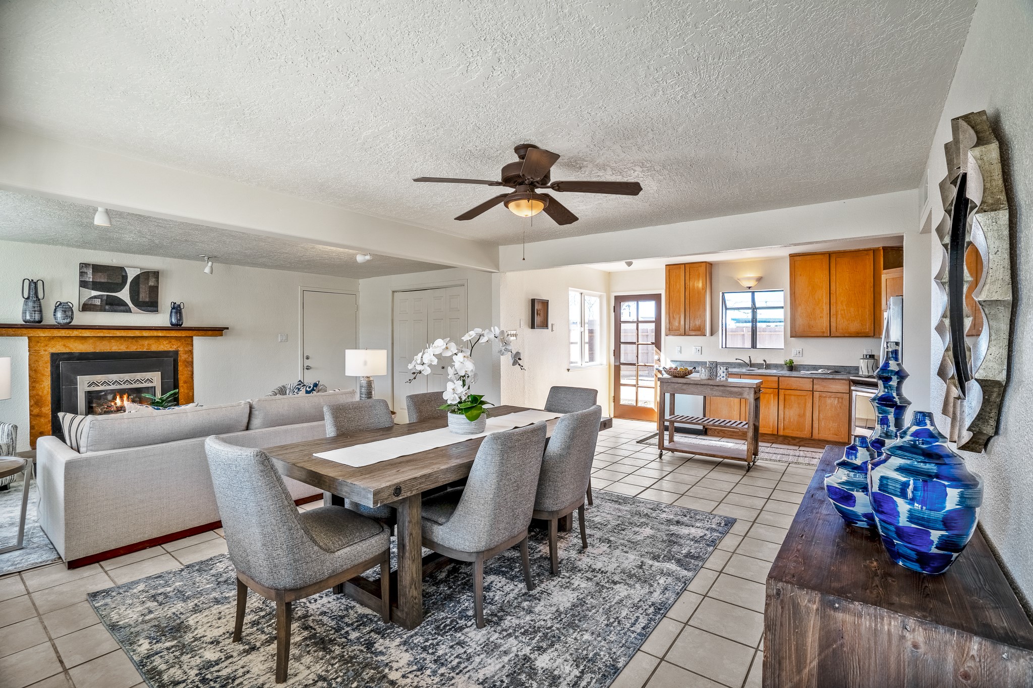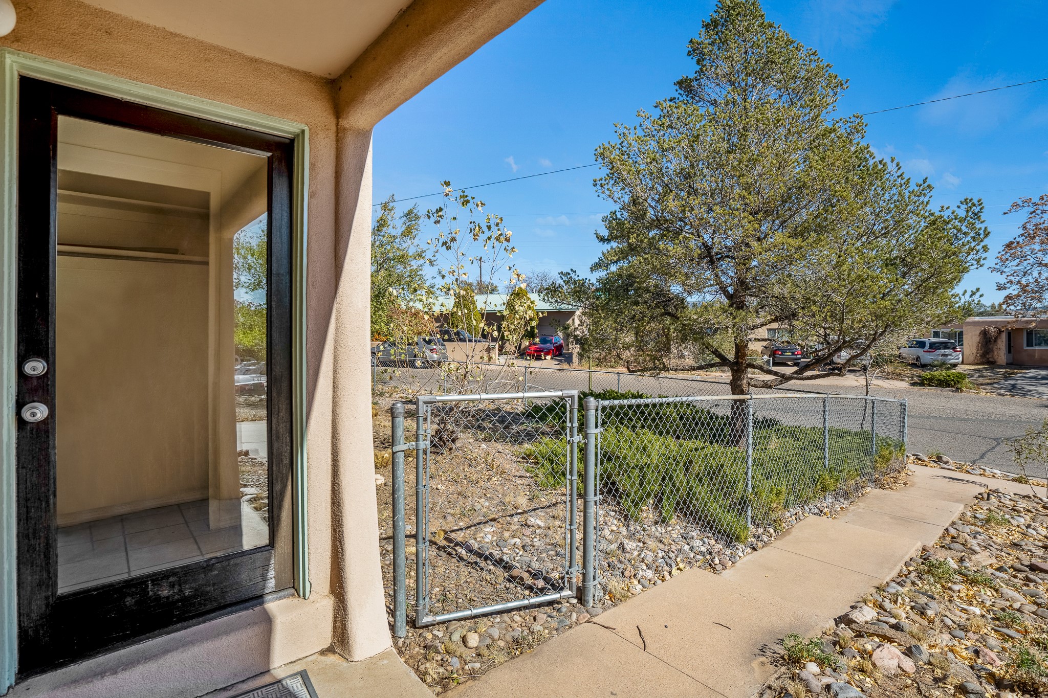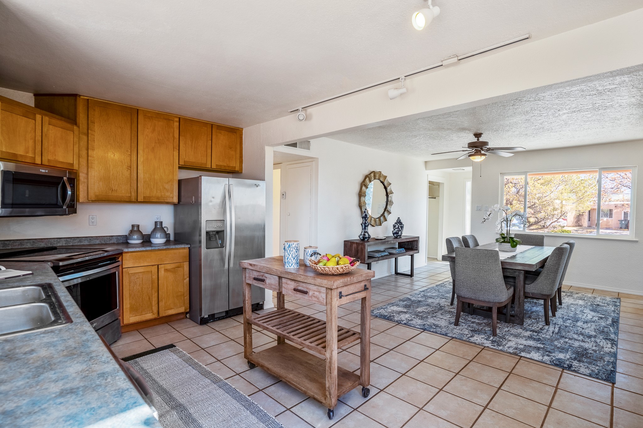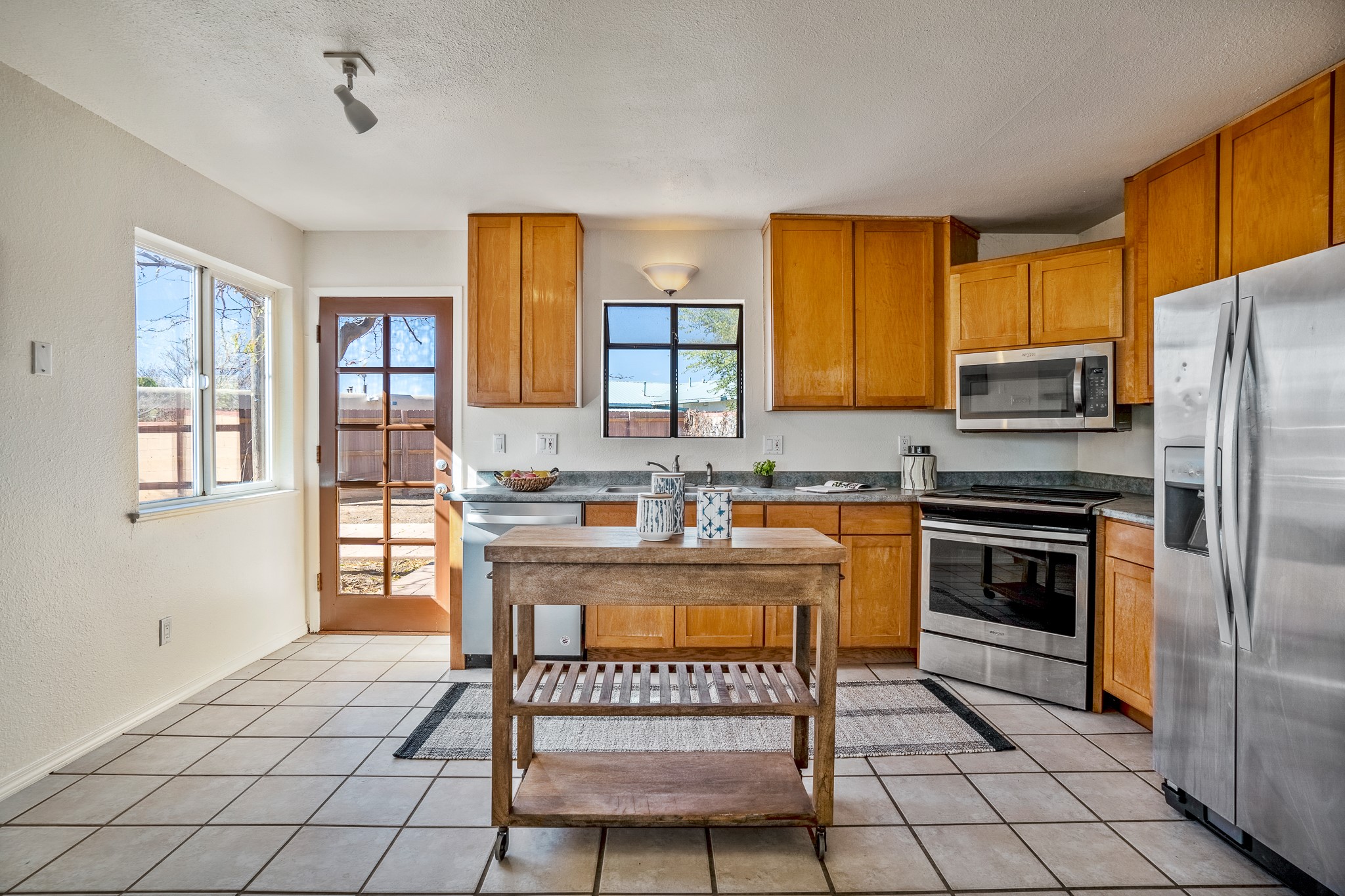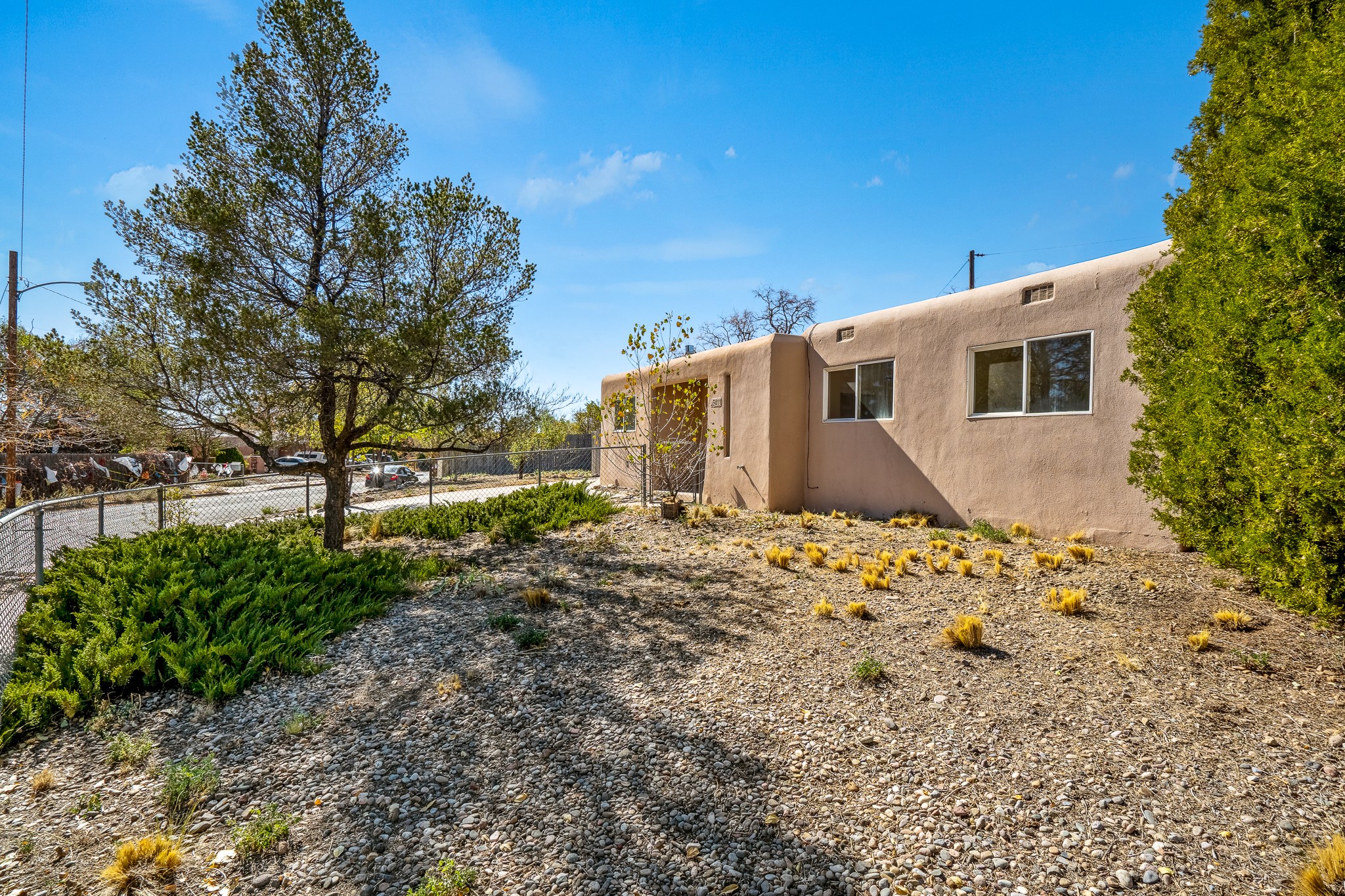 Open concept living/dining/kitchen welcomes you in to this well located 3 bedroom home. Tile floors throughout main areas and into bathroom. Stainless steel appliance package in kitchen is all 5 years old: includes refrigerator, dishwasher, electric oven, microwave, hot water heater- the garbage disposal has also been recently replaced. Lovely manufactured wood flooring has been added in the 3 bedrooms. Kitchen and bathroom have small bay windows above the sink in kitchen and tub in bath, which create extra light and lovely places for plants or decorations. Gas fireplace in living room. Single car attached garage makes for a great place for storage or another potential space if buyer wants to put in heating. The yard is very large - since the lot is on a curve of Siringo Rondo the size is .187 acres, or 8146 sq ft - much larger than the minimum lot size. Ample rear yard has lovely stamped concrete patio area with trees for shade and lots of room to plant. Western side yard is also deep and could easily be area for vegetable garden. When outdoors do not miss the shed that is out to the east side of the home - it is a great place to keep outdoor tools so they stay dry and out of the elements. Front yard has a lovely iris patch and another fenced in area that could work well for dogs . Home warranty provided by seller. Owner is New Mexico real estate broker.