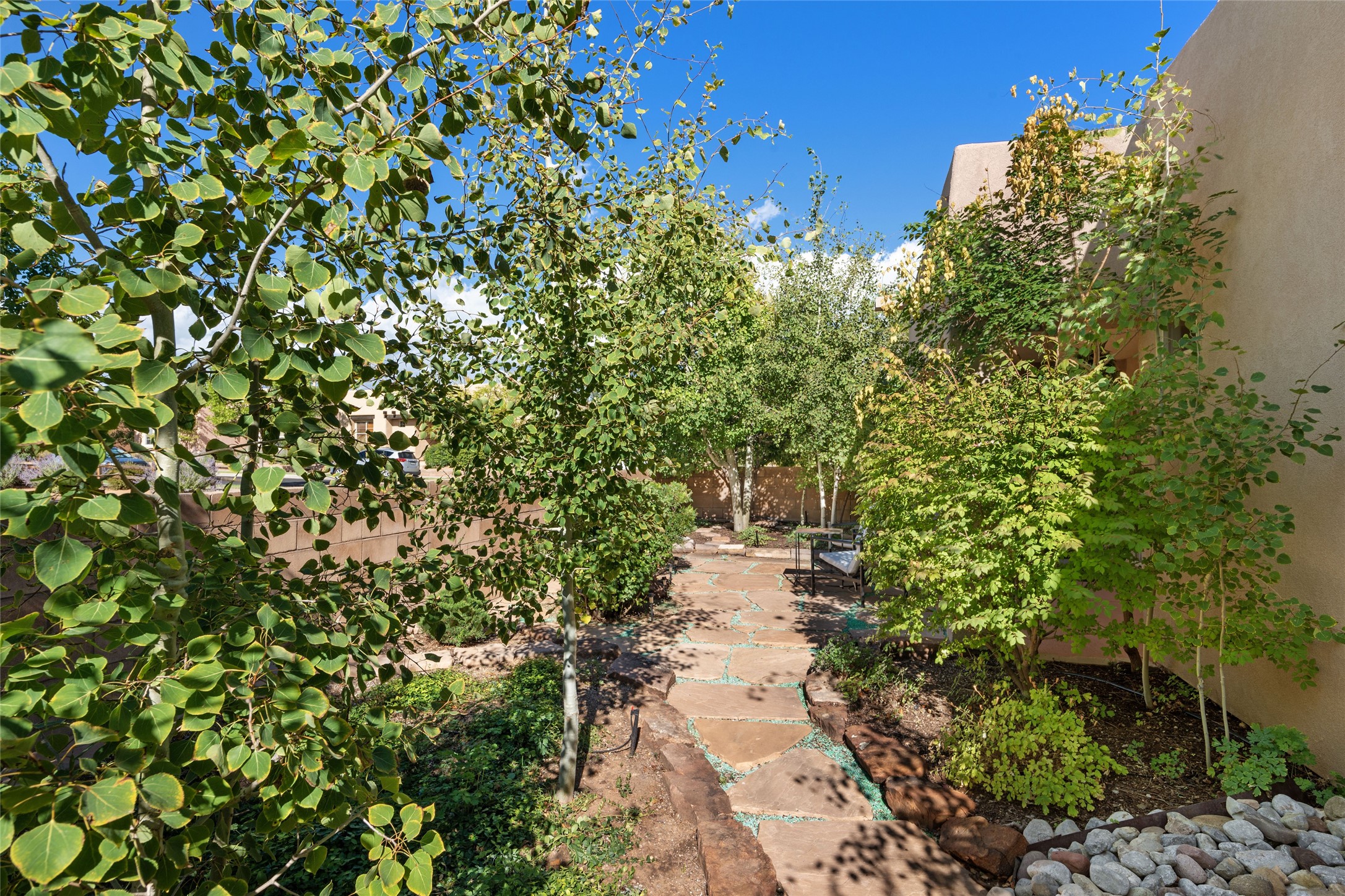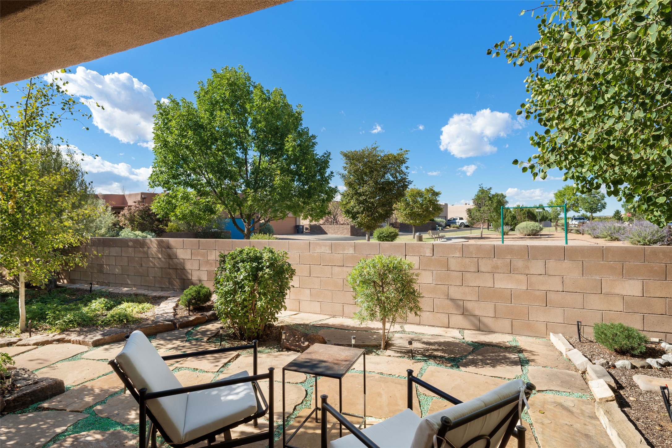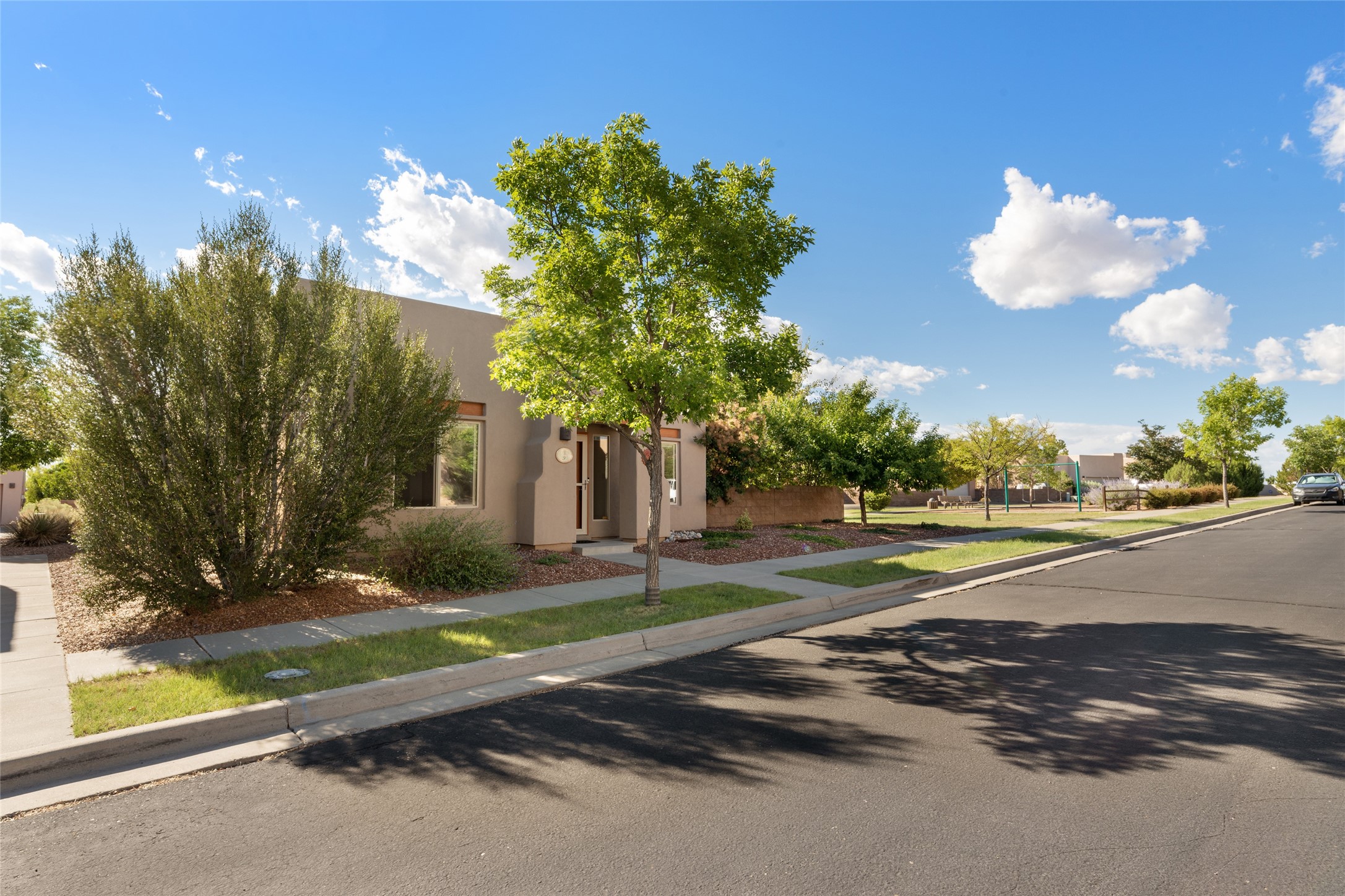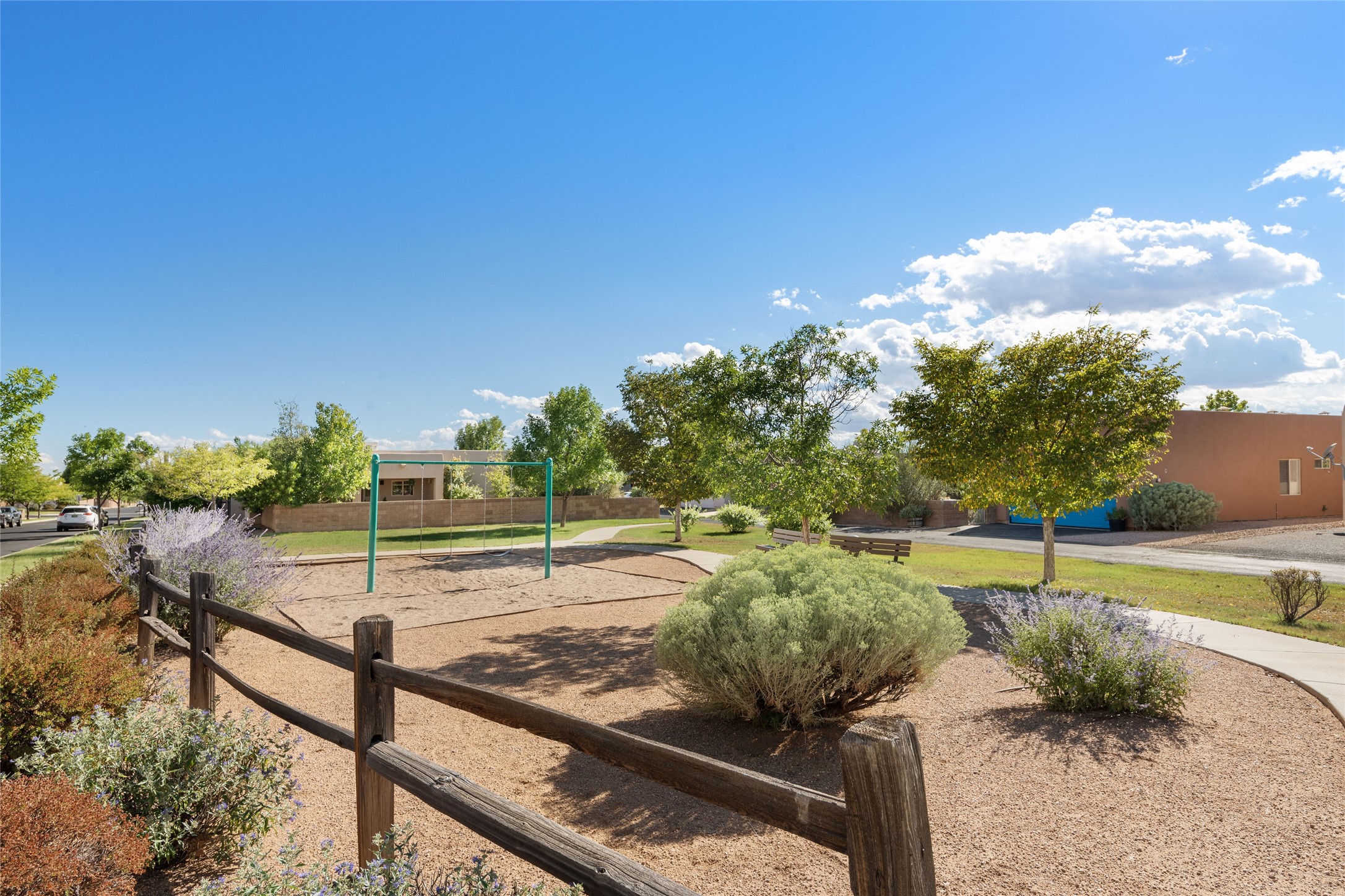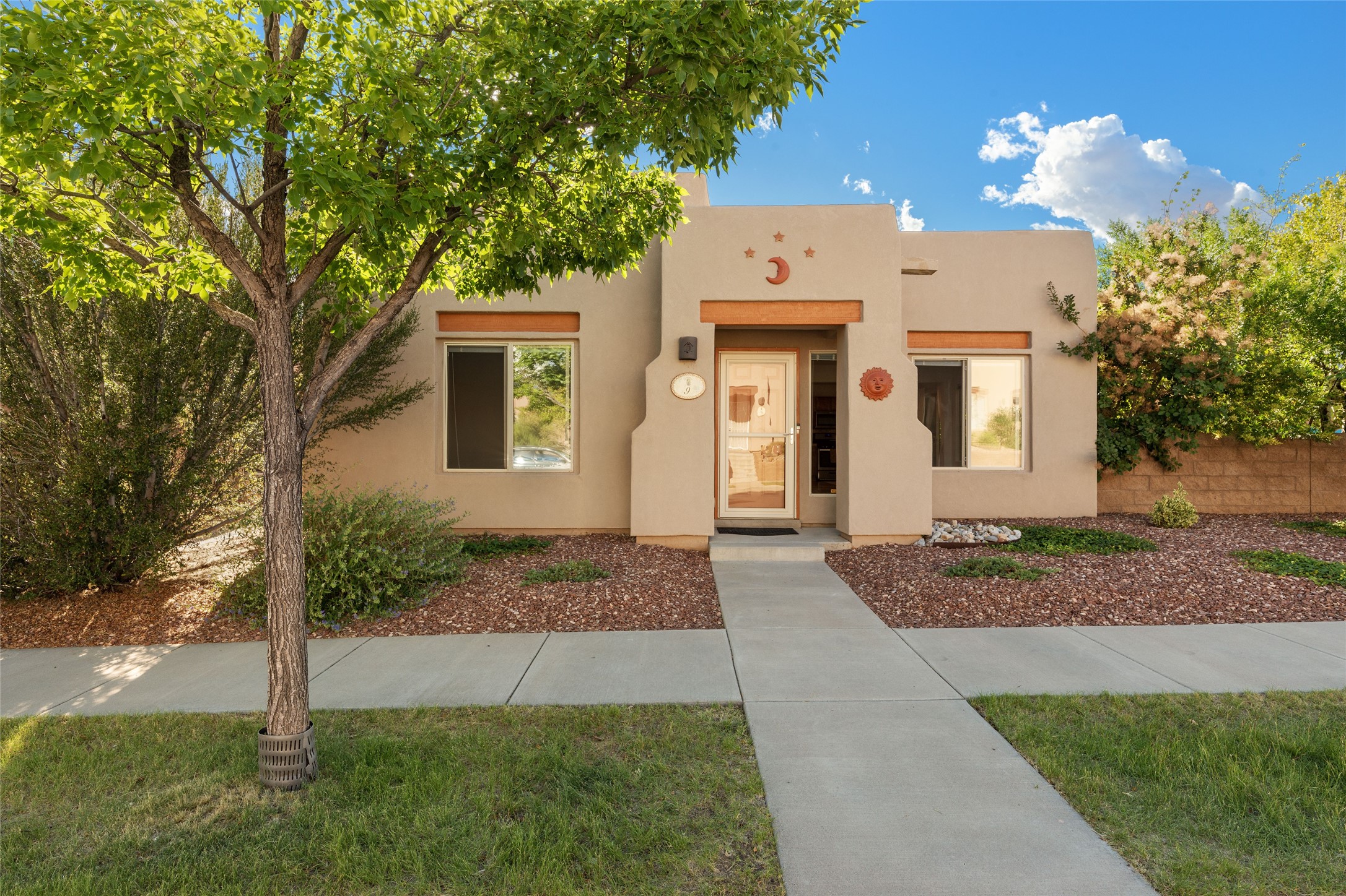 Best of Rancho Vieja! Single-level 3 Bedroom/ 2 Bath Home with Formal Dining or Study, and 2 car garage. This Pecos floor plan home is situated across from a small park which creates green open space! Well designed for quality living with natural light. Great room with a gas fireplace, opens to the Kitchen. Patio doors access from kitchen to the private and spacious north courtyard boasting a covered portal, view of the park, and plenty of area within the landscaped courtyard for gardening or a pet to enjoy. Kitchen has Stainless appliances, a large, double-door pantry, and tile counter tops. At present the fourth Bedroom or office is set up beautifully as a formal dining room. The Primary Bedroom is separate and large enough for a sitting area! A garden style bath that includes a soaking tub with shower, walk-in closet, double sinks & compartmented water closet. The two spacious secondary Bedrooms are both adjacent to a good size full Bath. The Laundry Room is adjacent to the 2-car Garage, which has finished walls. In-floor radiant heat as well as an evaporative cooler. The landscaping and the irrigation system were recently upgraded by the Owner to create a pleasant oasis to relax, and to enjoy. A great property and floor plan to entertain in, both inside or out. Rancho Viejo is a Master-Planned community with miles of trails to venture out on bike or on foot plus there are several parks to enjoy! E-Z access to the Community College, and schools. Presbyterian Hospital, Santa Fe Place Mall and 1-25 are just minutes away. A great place to call home!