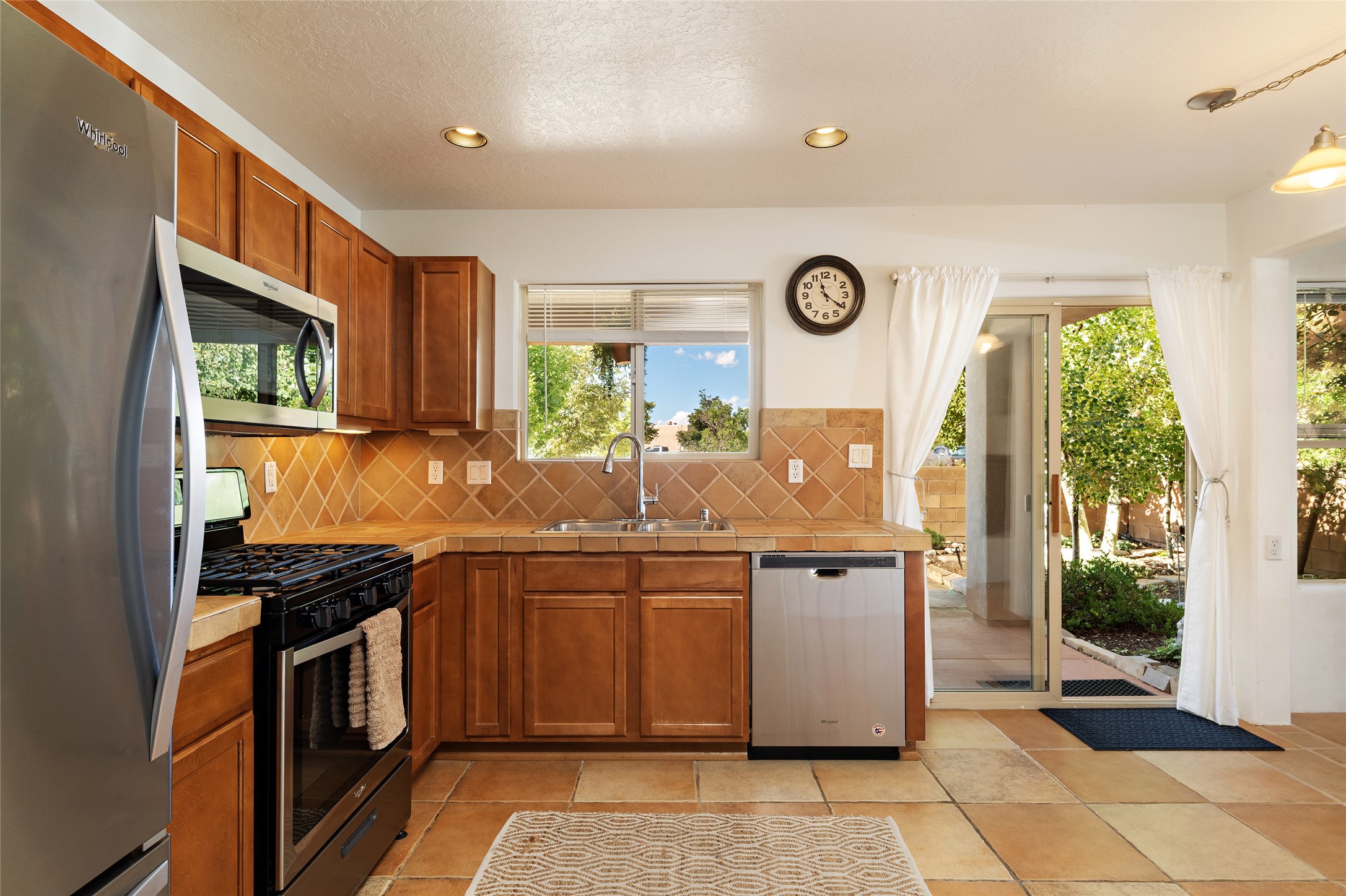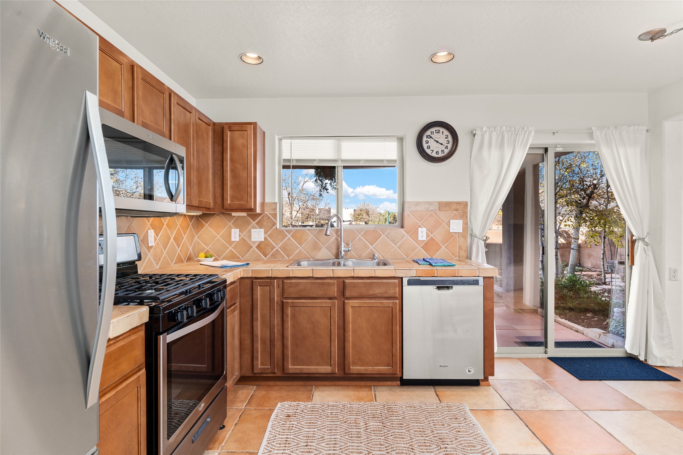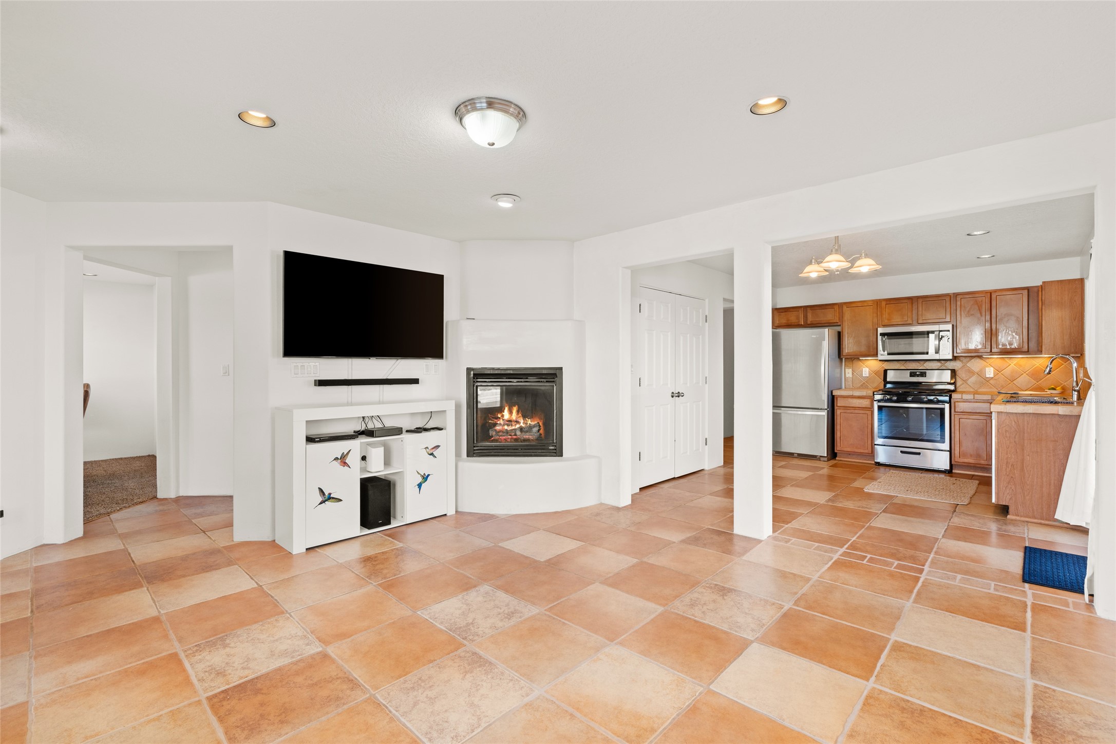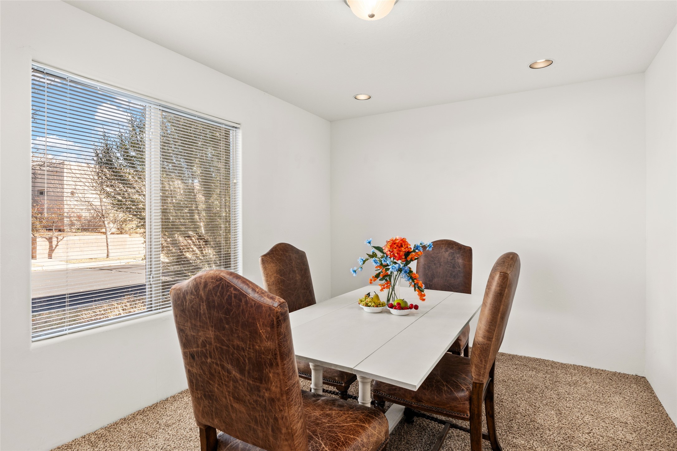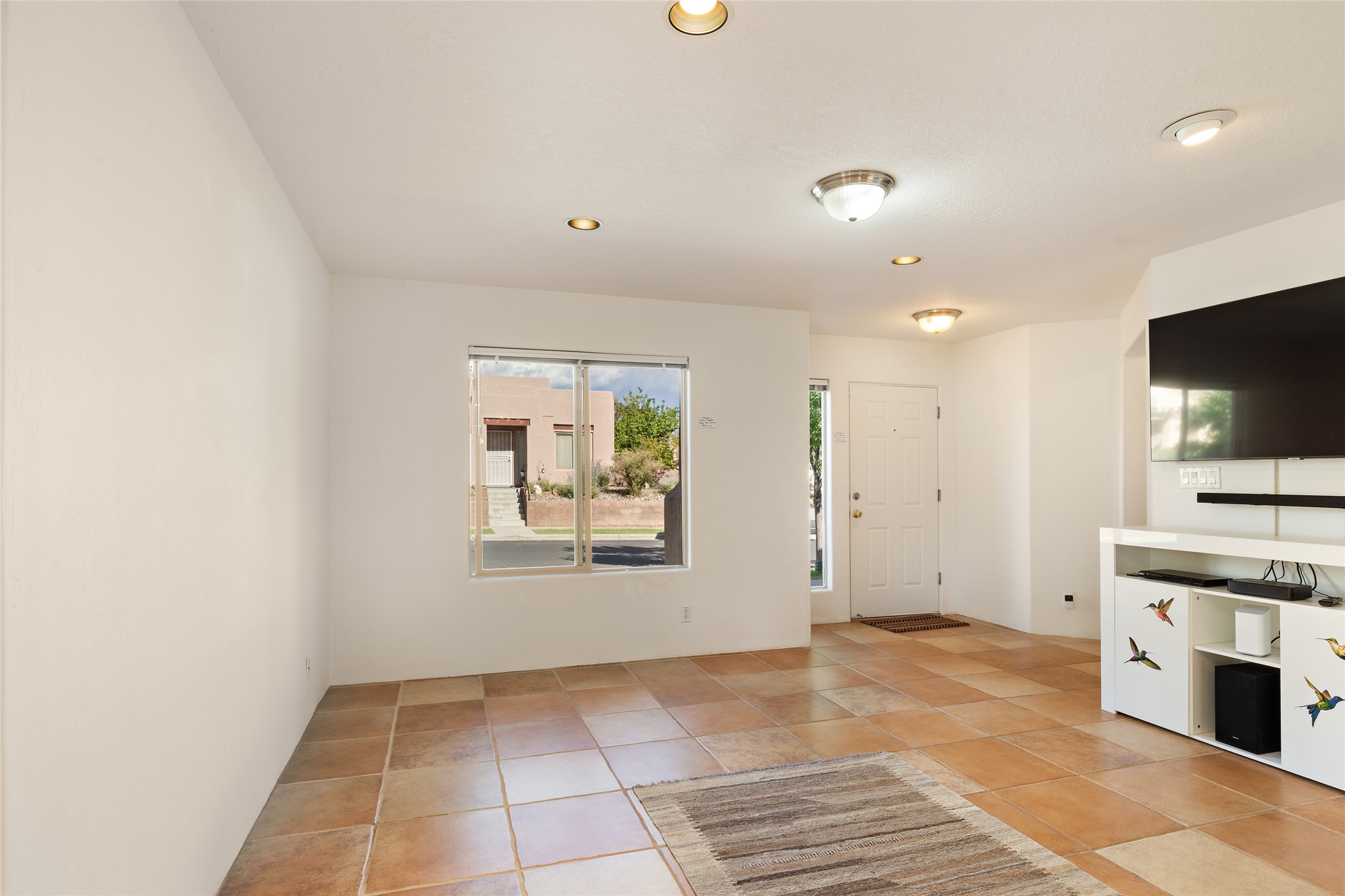 Best of Rancho Vieja! Single-level 3 Bedroom/ 2 Bath Home with Formal Dining or Study, and 2 car garage. This Pecos floor plan home is situated across from a small park which creates green open space! Well designed for quality living with natural light. Great room with a gas fireplace, opens to the Kitchen. Patio doors access from kitchen to the private and spacious north courtyard boasting a covered portal, view of the park, and plenty of area within the landscaped courtyard for gardening or a pet to enjoy. Kitchen has Stainless appliances, a large, double-door pantry, and tile counter tops. At present the fourth Bedroom or office is set up beautifully as a formal dining room. The Primary Bedroom is separate and large enough for a sitting area! A garden style bath that includes a soaking tub with shower, walk-in closet, double sinks & compartmented water closet. The two spacious secondary Bedrooms are both adjacent to a good size full Bath. The Laundry Room is adjacent to the 2-car Garage, which has finished walls. In-floor radiant heat as well as an evaporative cooler. The landscaping and the irrigation system were recently upgraded by the Owner to create a pleasant oasis to relax, and to enjoy. A great property and floor plan to entertain in, both inside or out. Rancho Viejo is a Master-Planned community with miles of trails to venture out on bike or on foot plus there are several parks to enjoy! E-Z access to the Community College, and schools. Presbyterian Hospital, Santa Fe Place Mall and 1-25 are just minutes away. A great place to call home!
