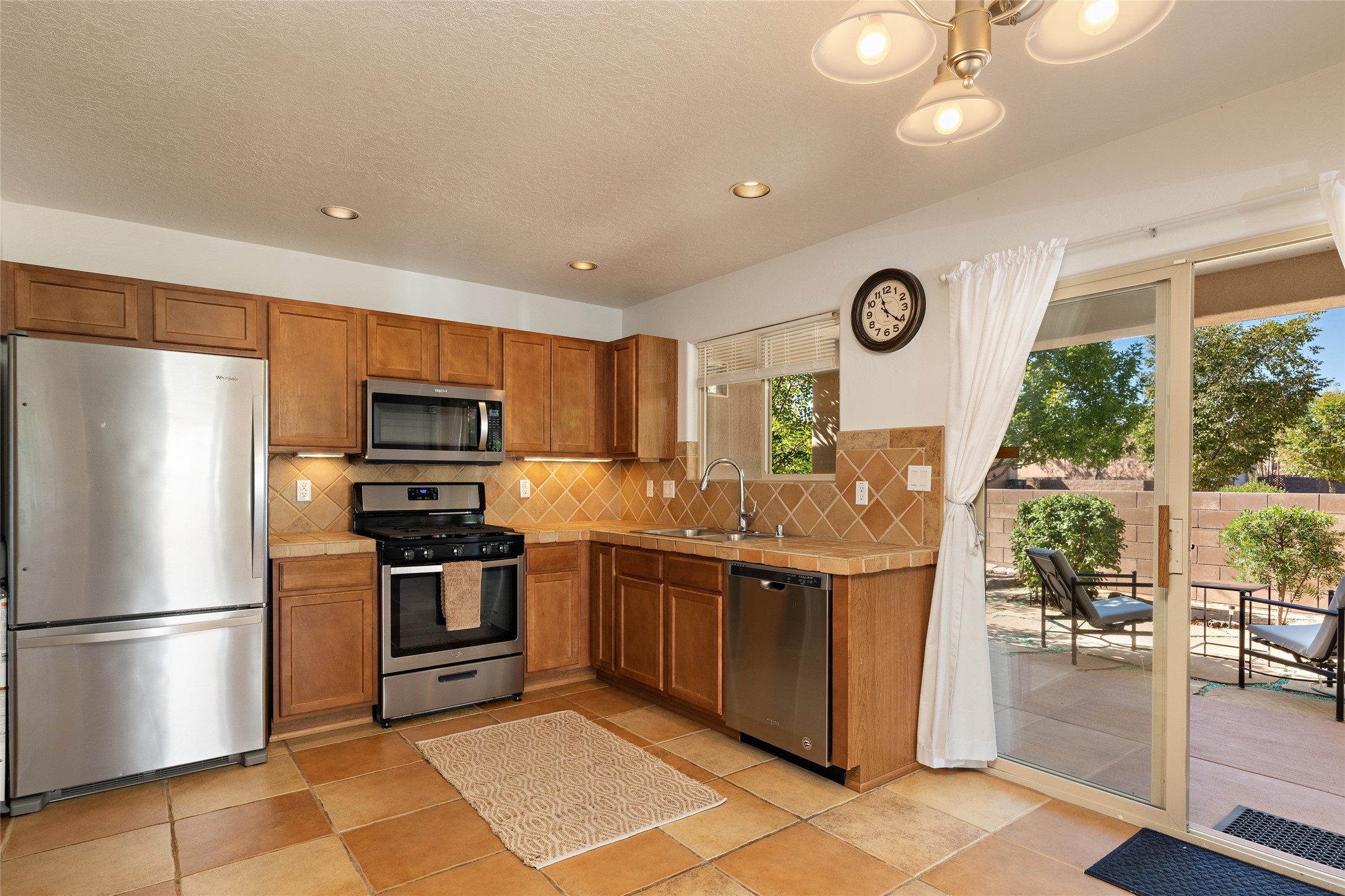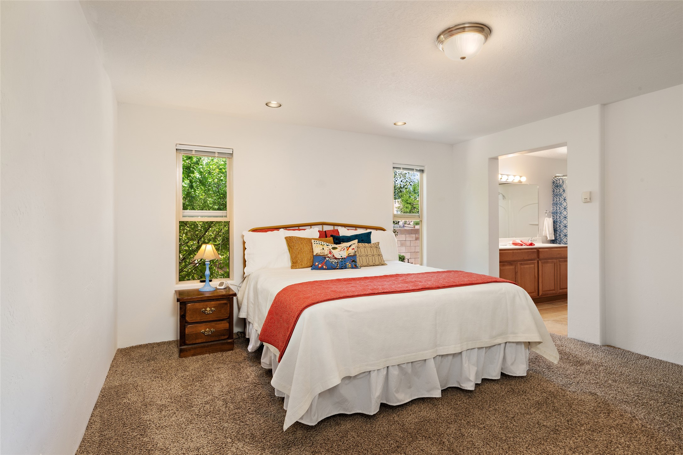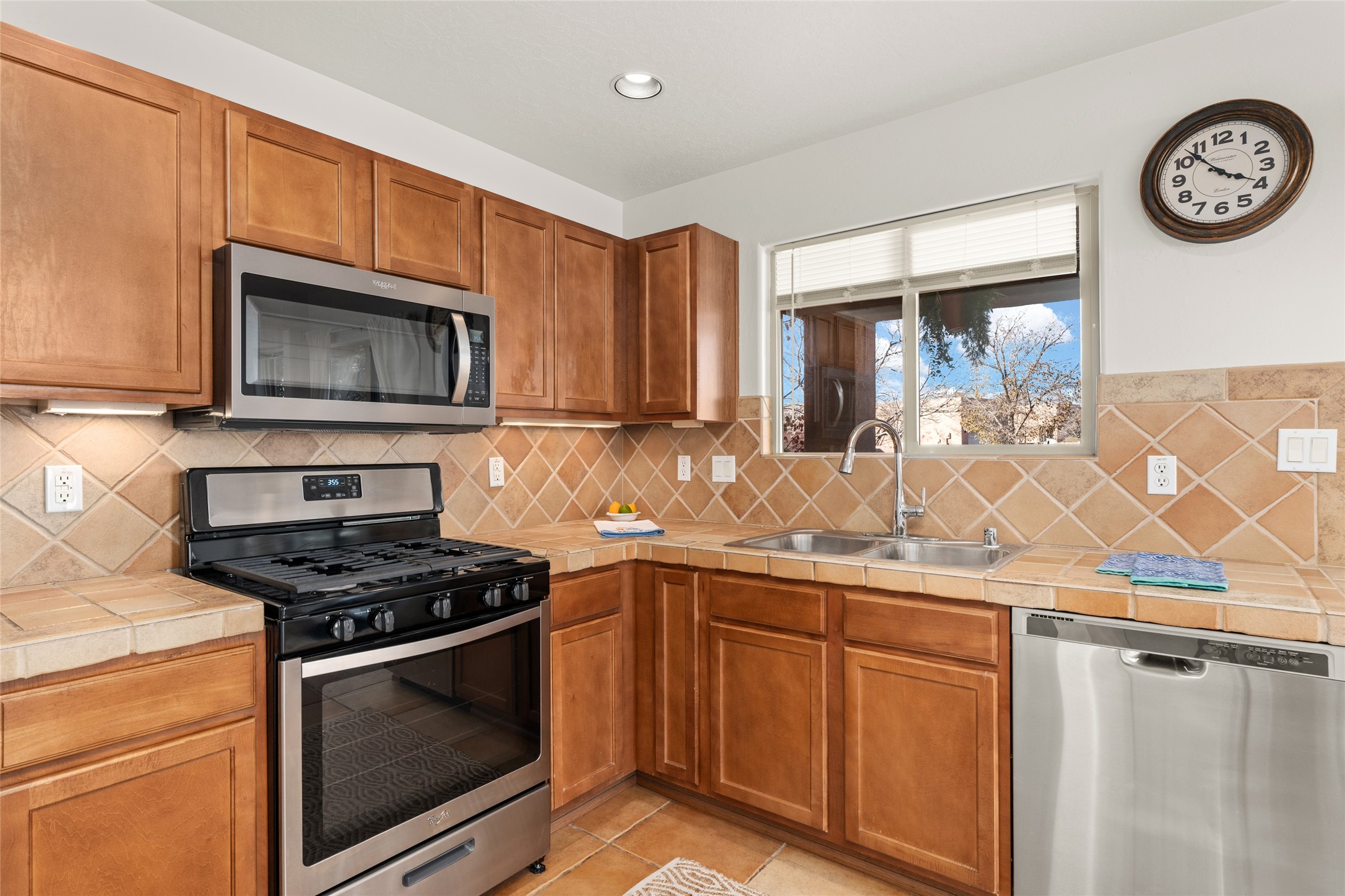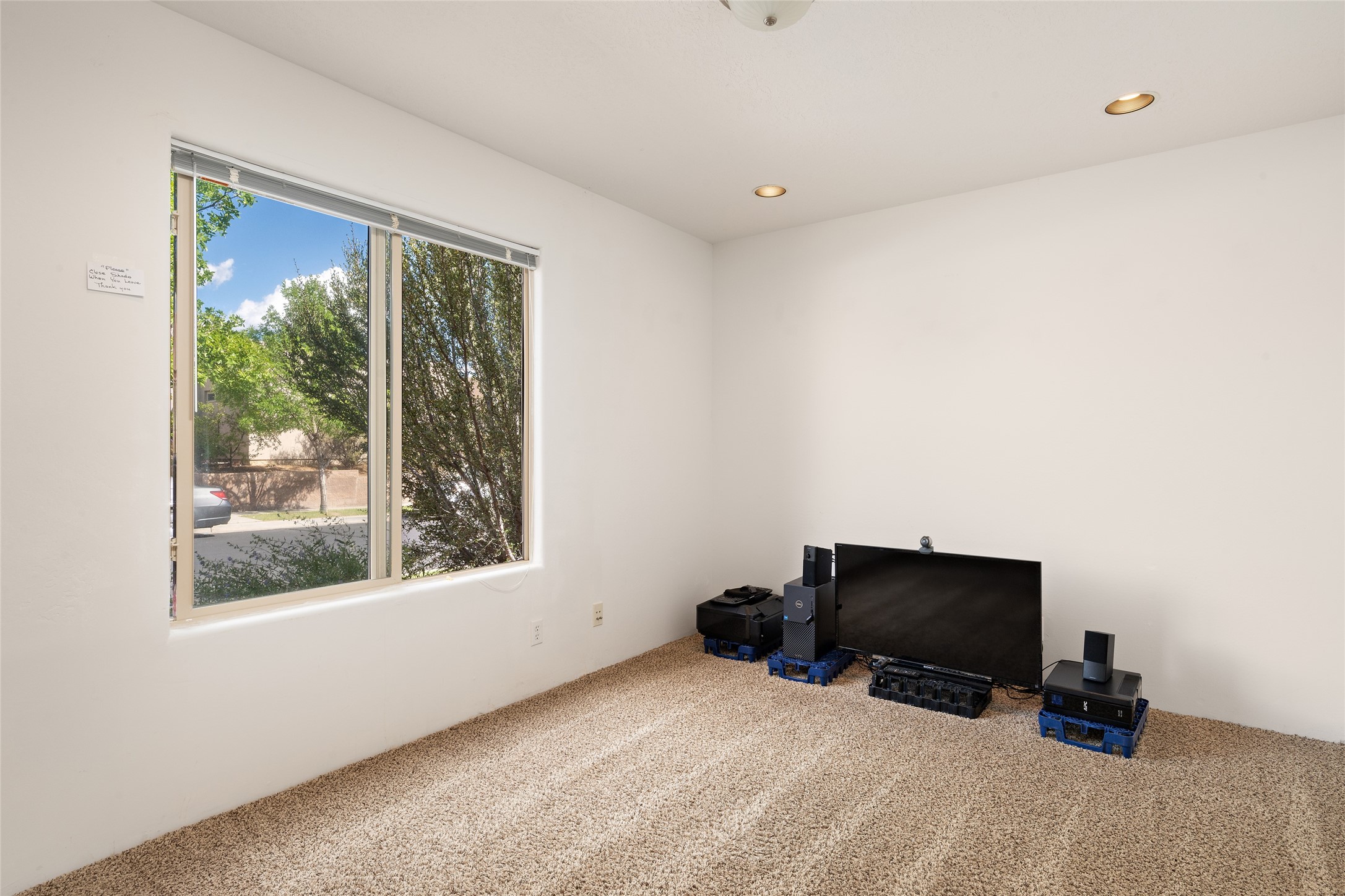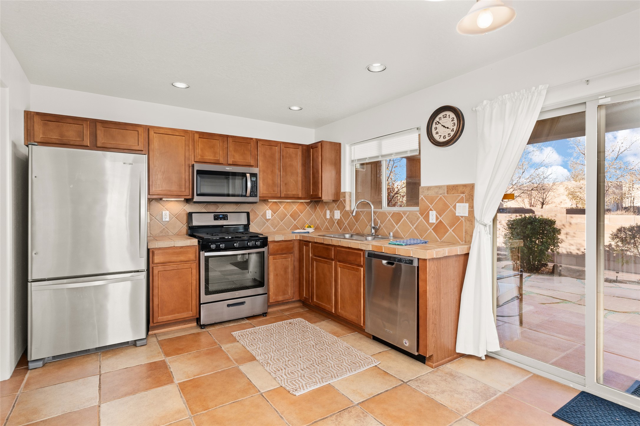 Best of Rancho Vieja! Single-level 3 Bedroom/ 2 Bath Home with Formal Dining or Study, and 2 car garage. This Pecos floor plan home is situated across from a small park which creates green open space! Well designed for quality living with natural light. Great room with a gas fireplace, opens to the Kitchen. Patio doors access from kitchen to the private and spacious north courtyard boasting a covered portal, view of the park, and plenty of area within the landscaped courtyard for gardening or a pet to enjoy. Kitchen has Stainless appliances, a large, double-door pantry, and tile counter tops. At present the fourth Bedroom or office is set up beautifully as a formal dining room. The Primary Bedroom is separate and large enough for a sitting area! A garden style bath that includes a soaking tub with shower, walk-in closet, double sinks & compartmented water closet. The two spacious secondary Bedrooms are both adjacent to a good size full Bath. The Laundry Room is adjacent to the 2-car Garage, which has finished walls. In-floor radiant heat as well as an evaporative cooler. The landscaping and the irrigation system were recently upgraded by the Owner to create a pleasant oasis to relax, and to enjoy. A great property and floor plan to entertain in, both inside or out. Rancho Viejo is a Master-Planned community with miles of trails to venture out on bike or on foot plus there are several parks to enjoy! E-Z access to the Community College, and schools. Presbyterian Hospital, Santa Fe Place Mall and 1-25 are just minutes away. A great place to call home!